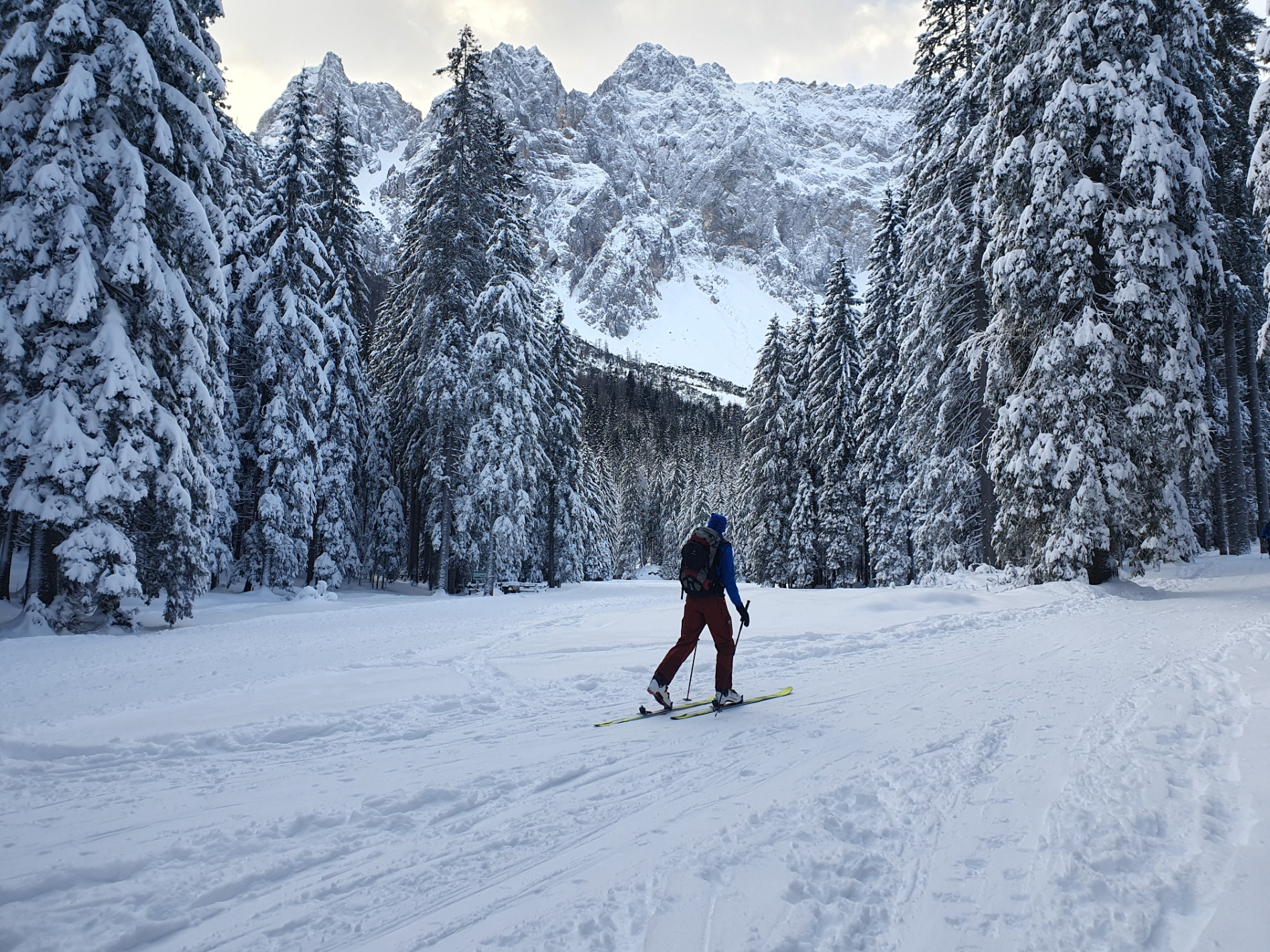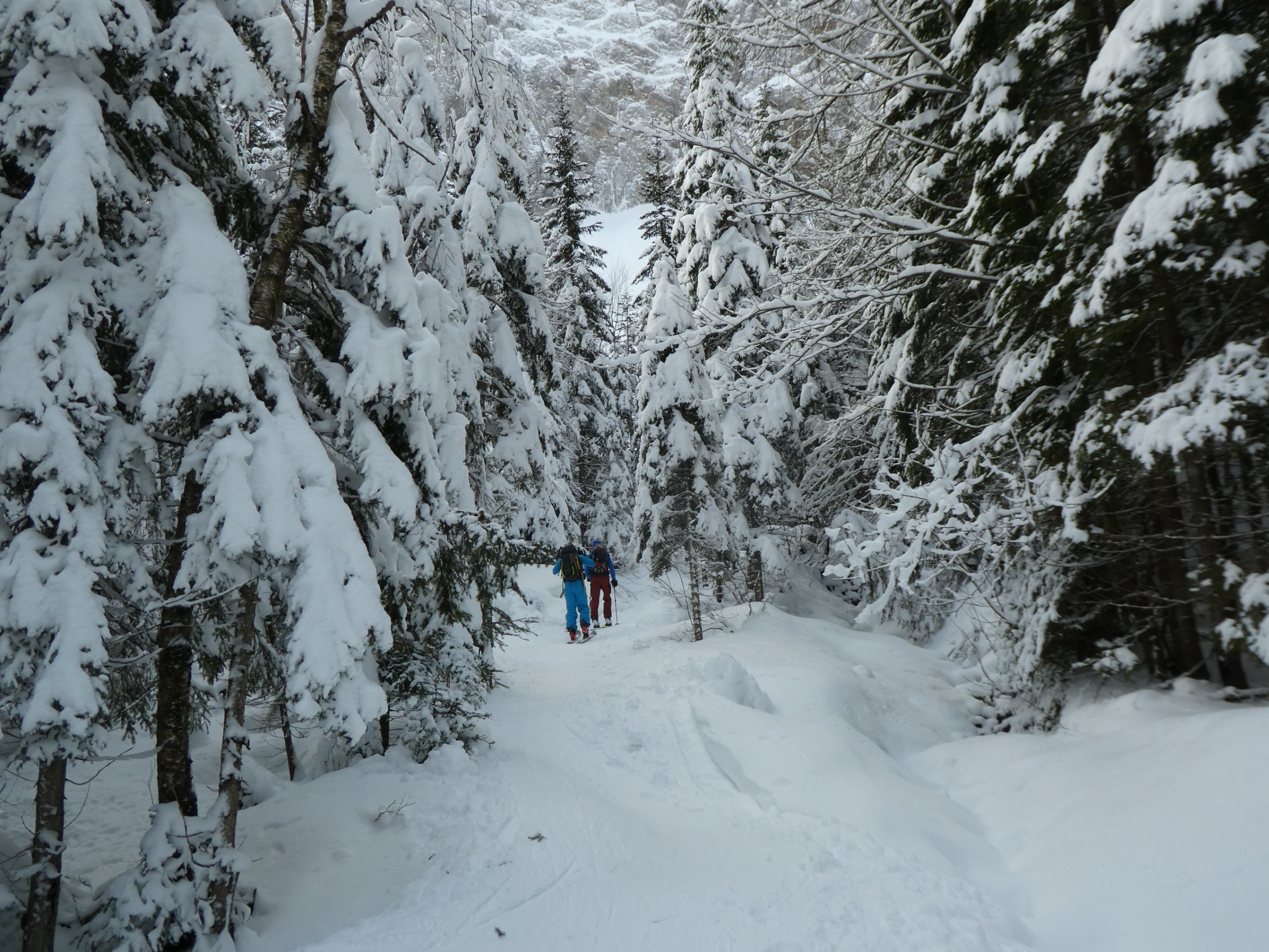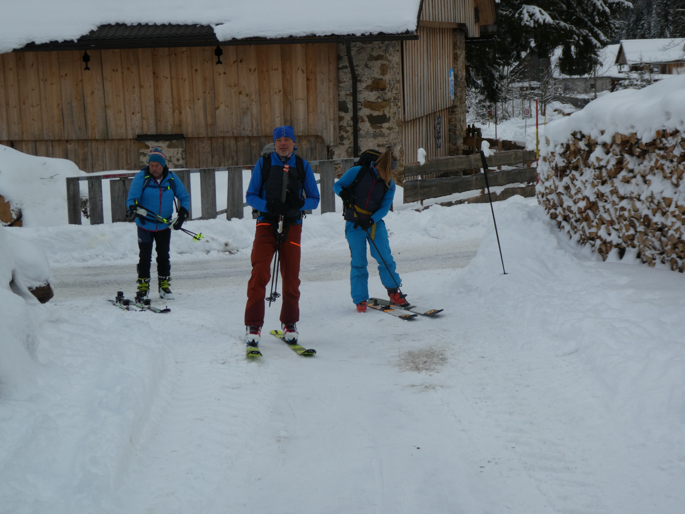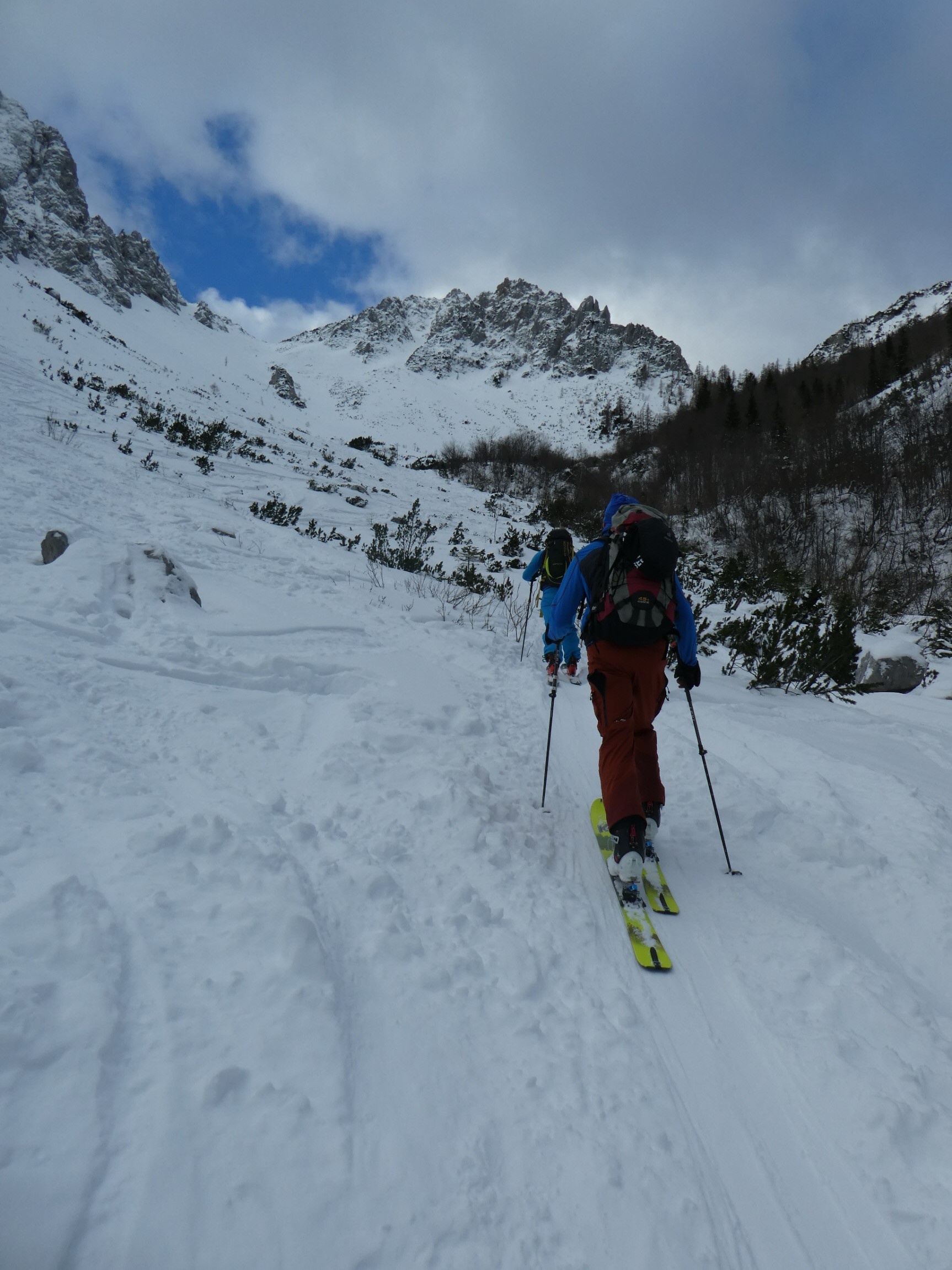Beim Bodenbauer haben wir angeschnallt und unseren Aufstieg entlang der Loipe begonnen, das Tourenziel immer vor Augen. Vorbei an der Märchenwiese ging es weiter aufwärts. Weil im Talschluss heuer noch der sonst dort meterhoch liegende Lawinenschnee fehlt, gestaltete sich der finale Zustieg ins Vertatschakar etwas holzig.