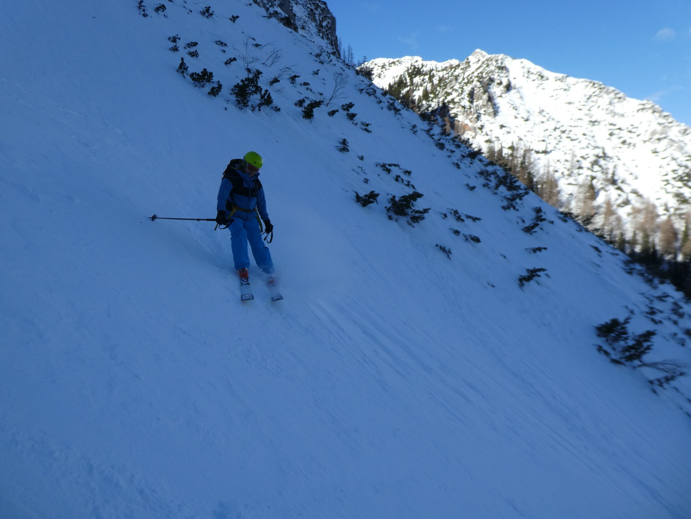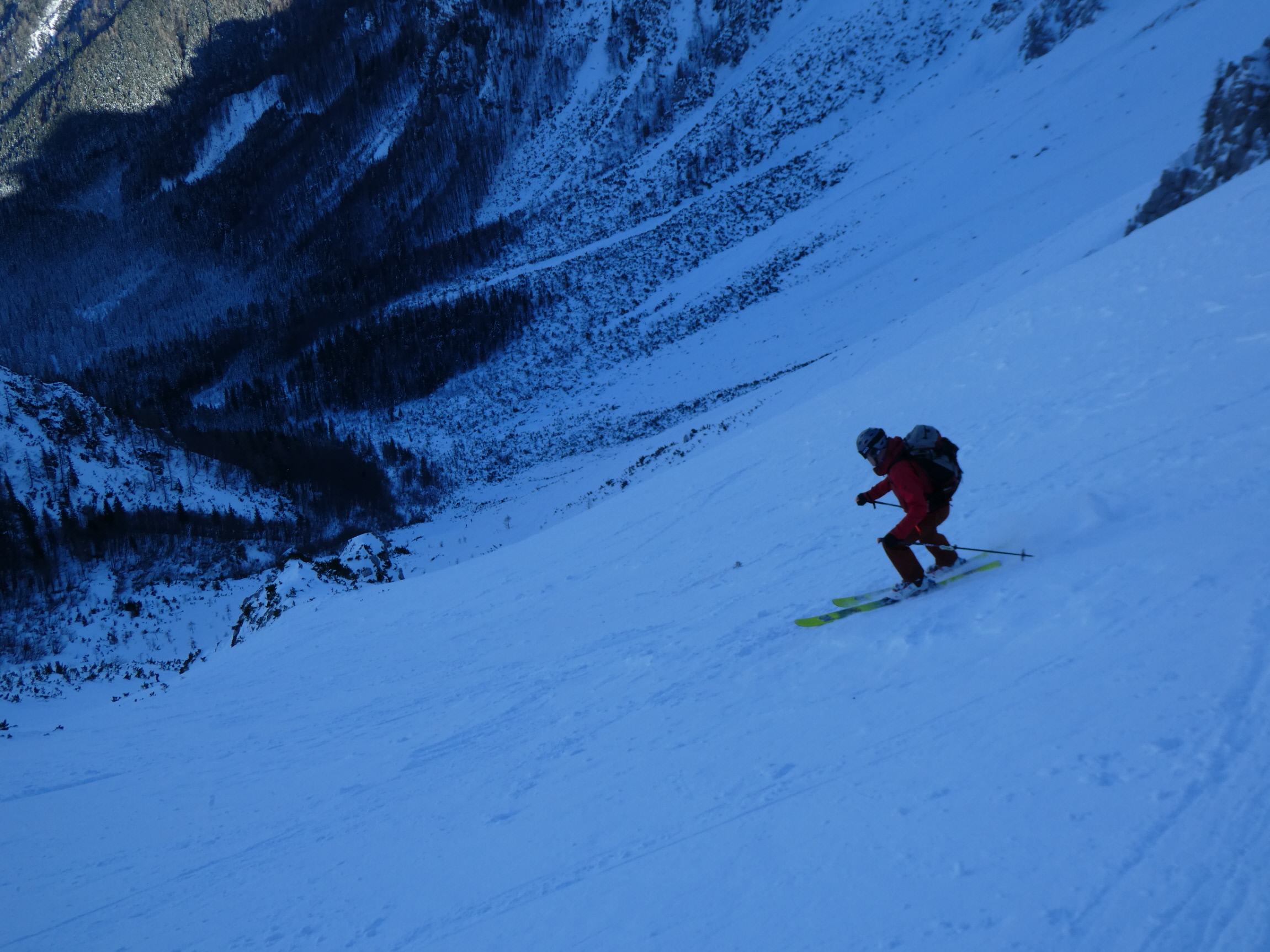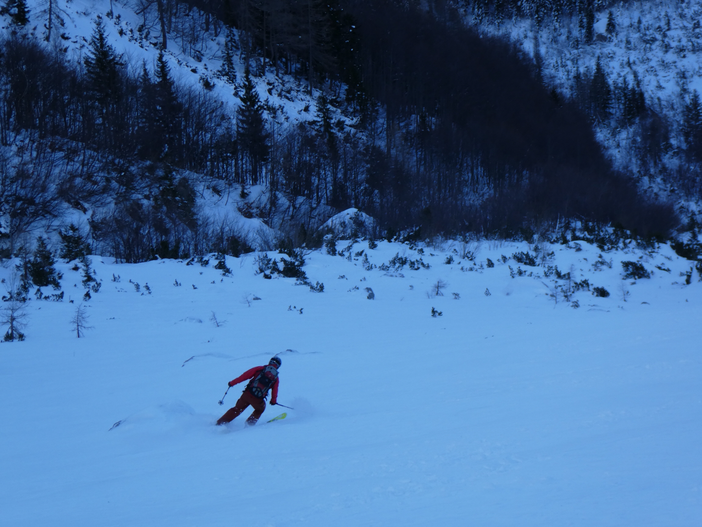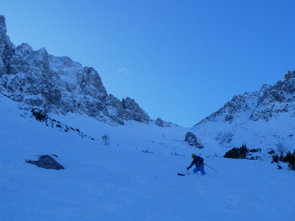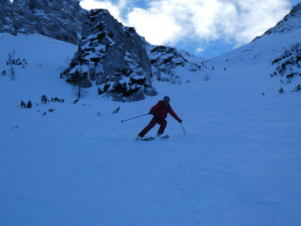 Im Schlussteil des freien Kars waren dann vom Wochenende her einige tiefe Spuren ausgefahren, in denen es sich wieder gut schwingen hat lassen. Lediglich der eine oder andere herauslugende Stein wollte umfahren werden. Besser als im Aufstieg gedacht war dann auch der holzige Teil unterhalb des Kars mit seinen Latschen und dem Erlengebüsch bald einmal erledigt.