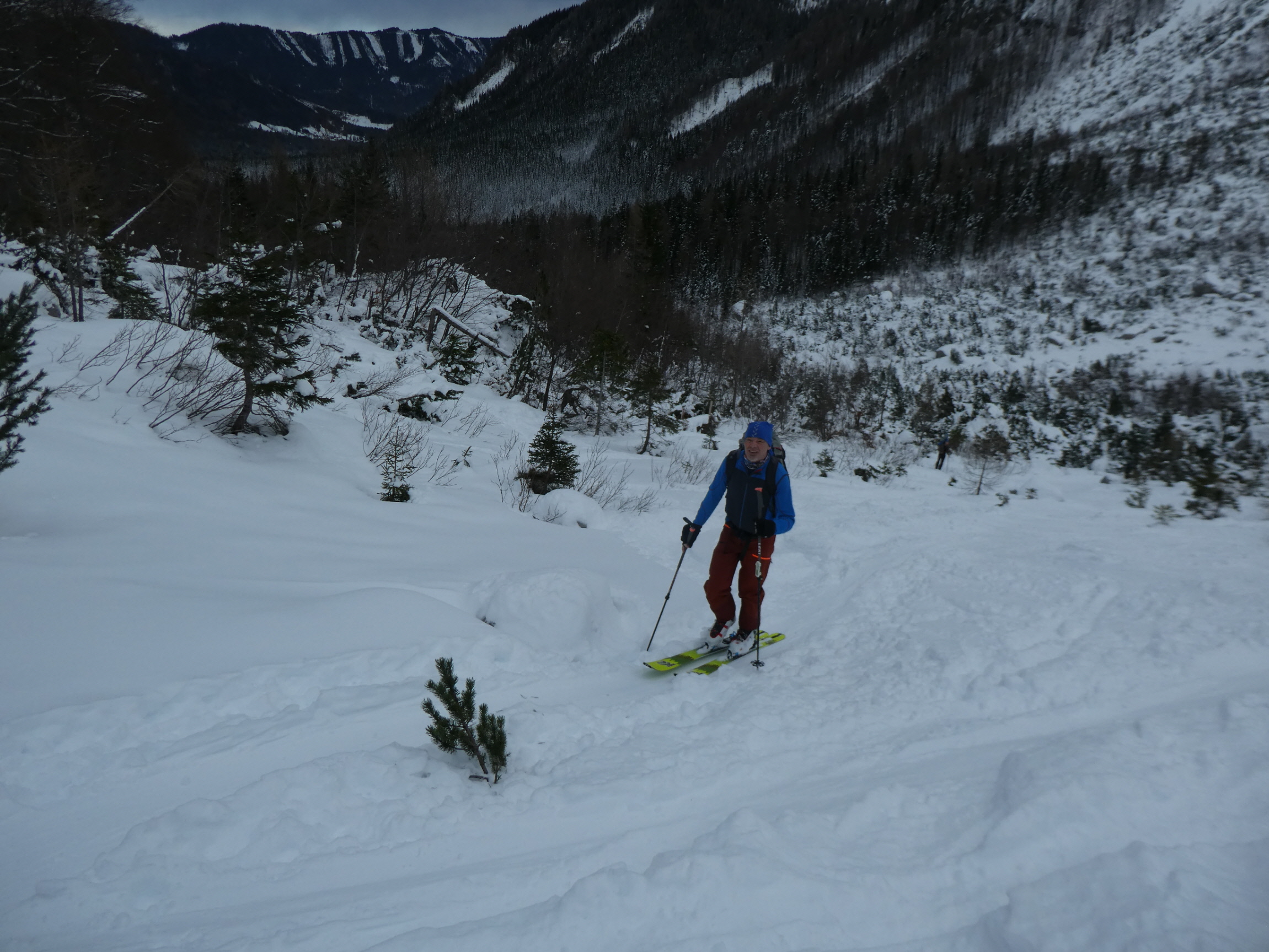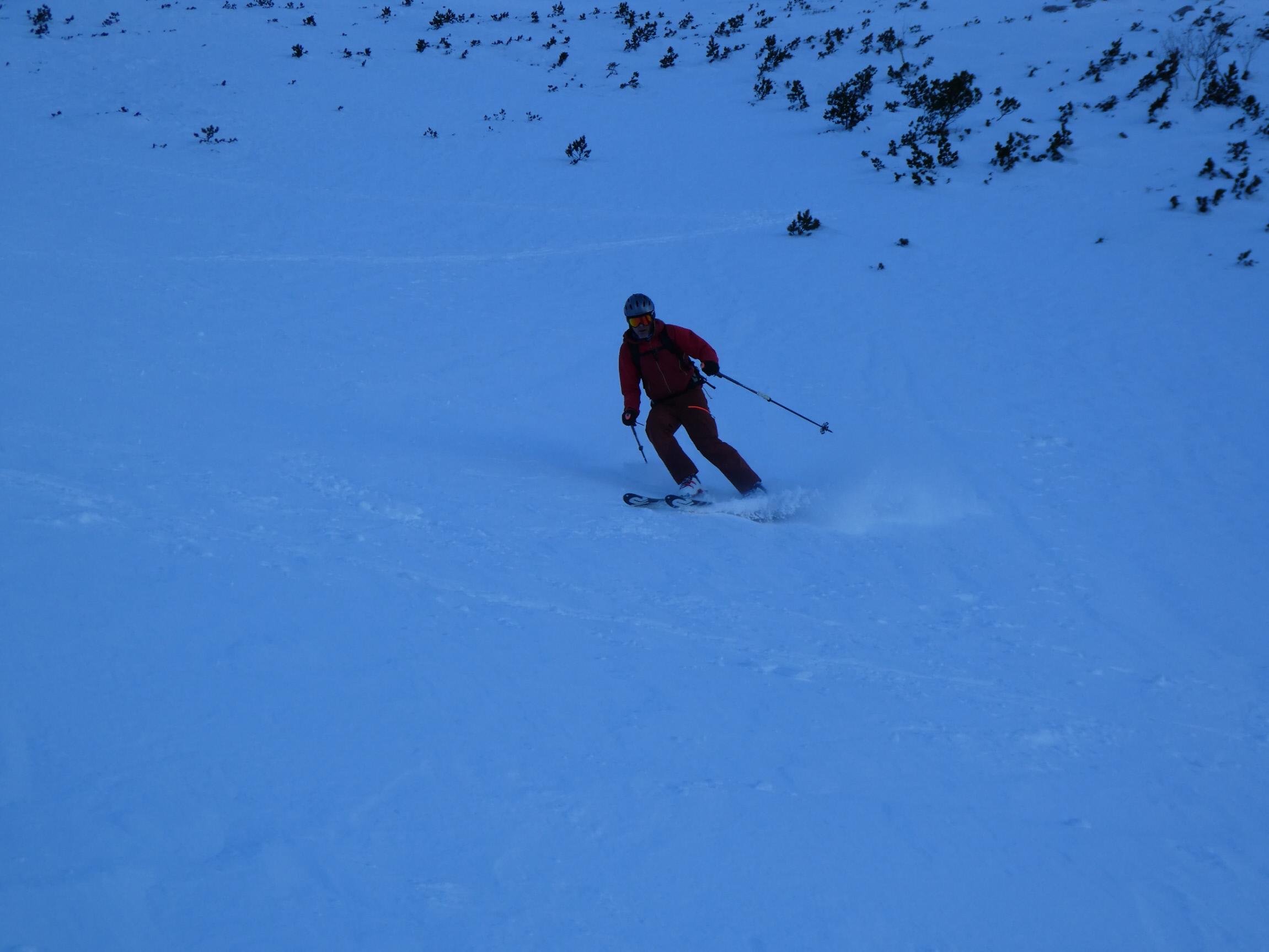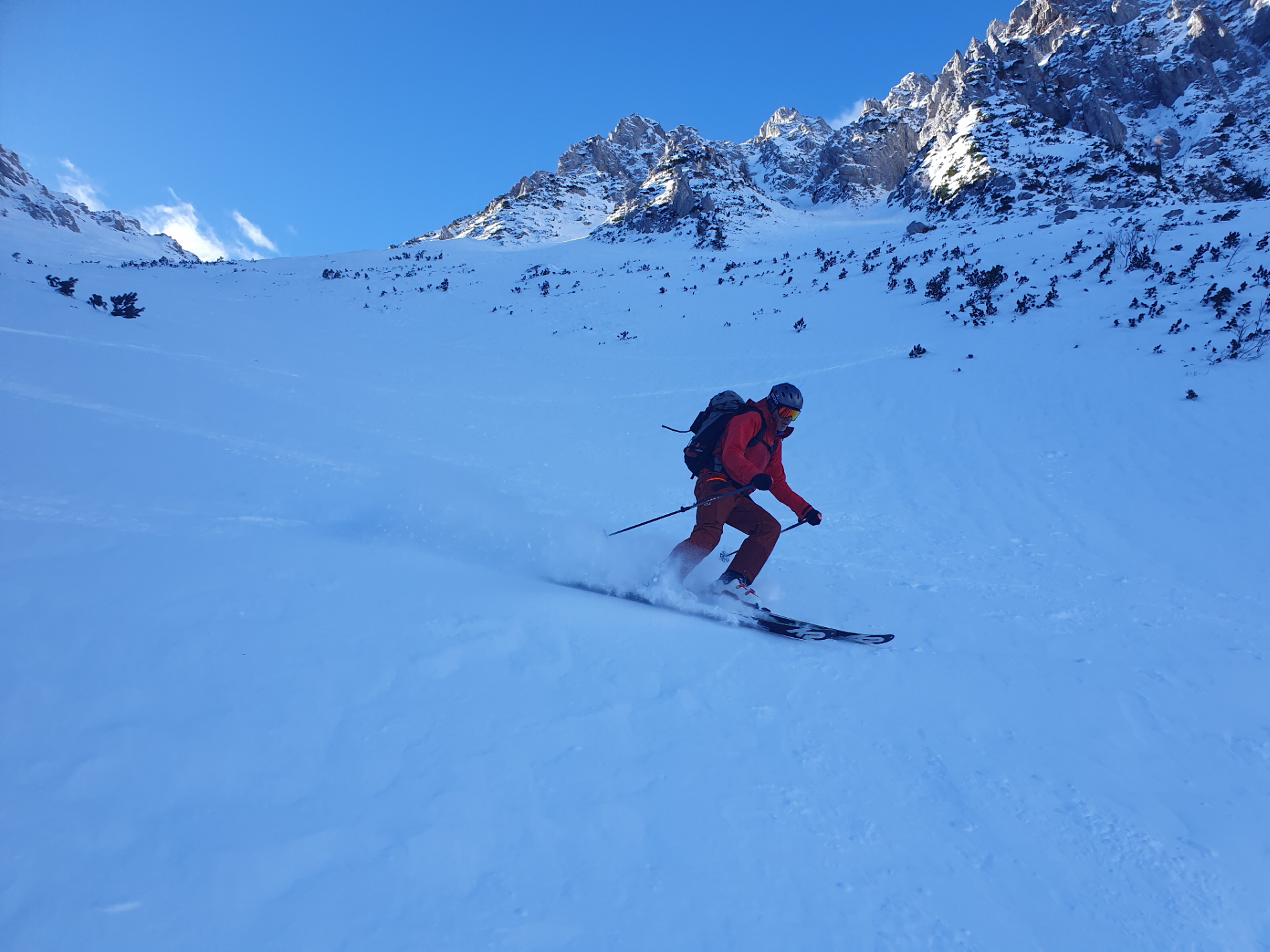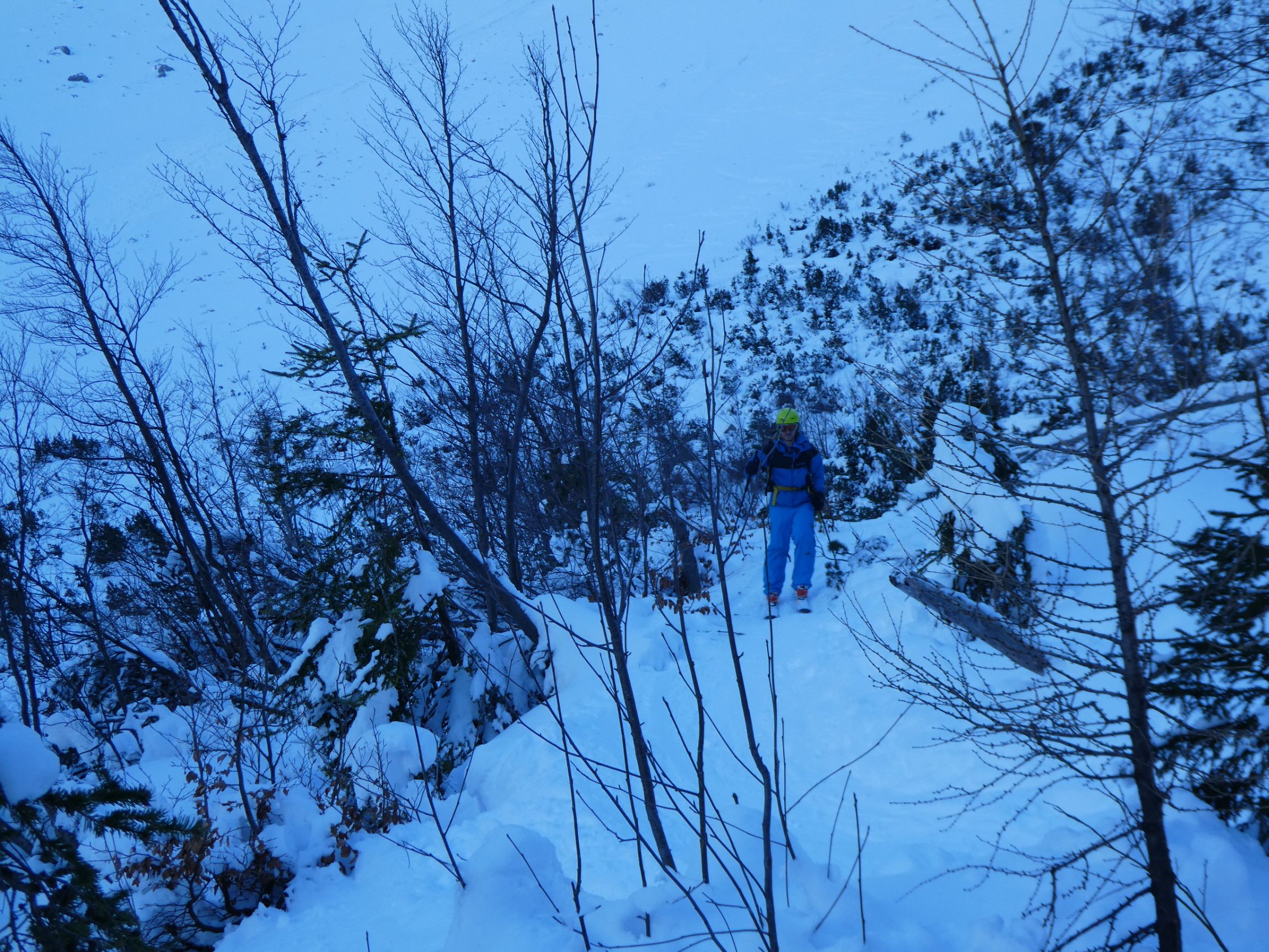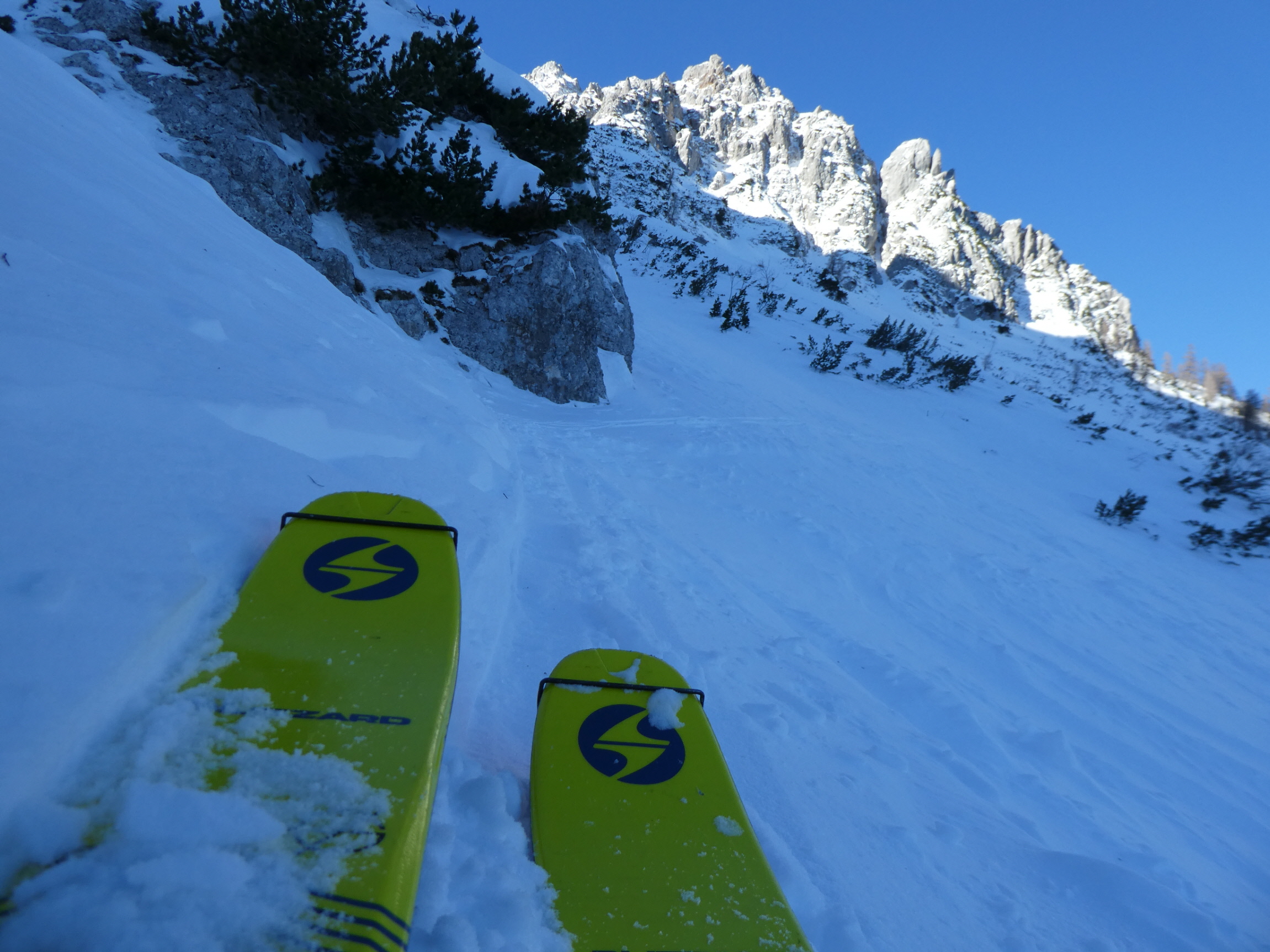 Im Schlussteil des freien Kars waren dann vom Wochenende her einige tiefe Spuren ausgefahren, in denen es sich wieder gut schwingen hat lassen. Lediglich der eine oder andere herauslugende Stein wollte umfahren werden. Besser als im Aufstieg gedacht war dann auch der holzige Teil unterhalb des Kars mit seinen Latschen und dem Erlengebüsch bald einmal erledigt.