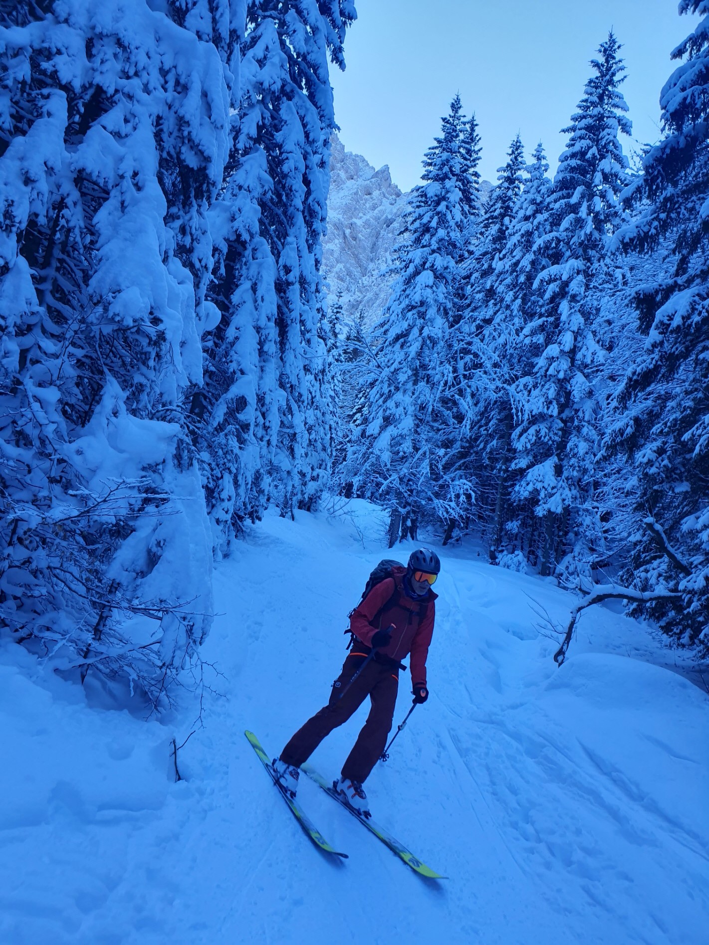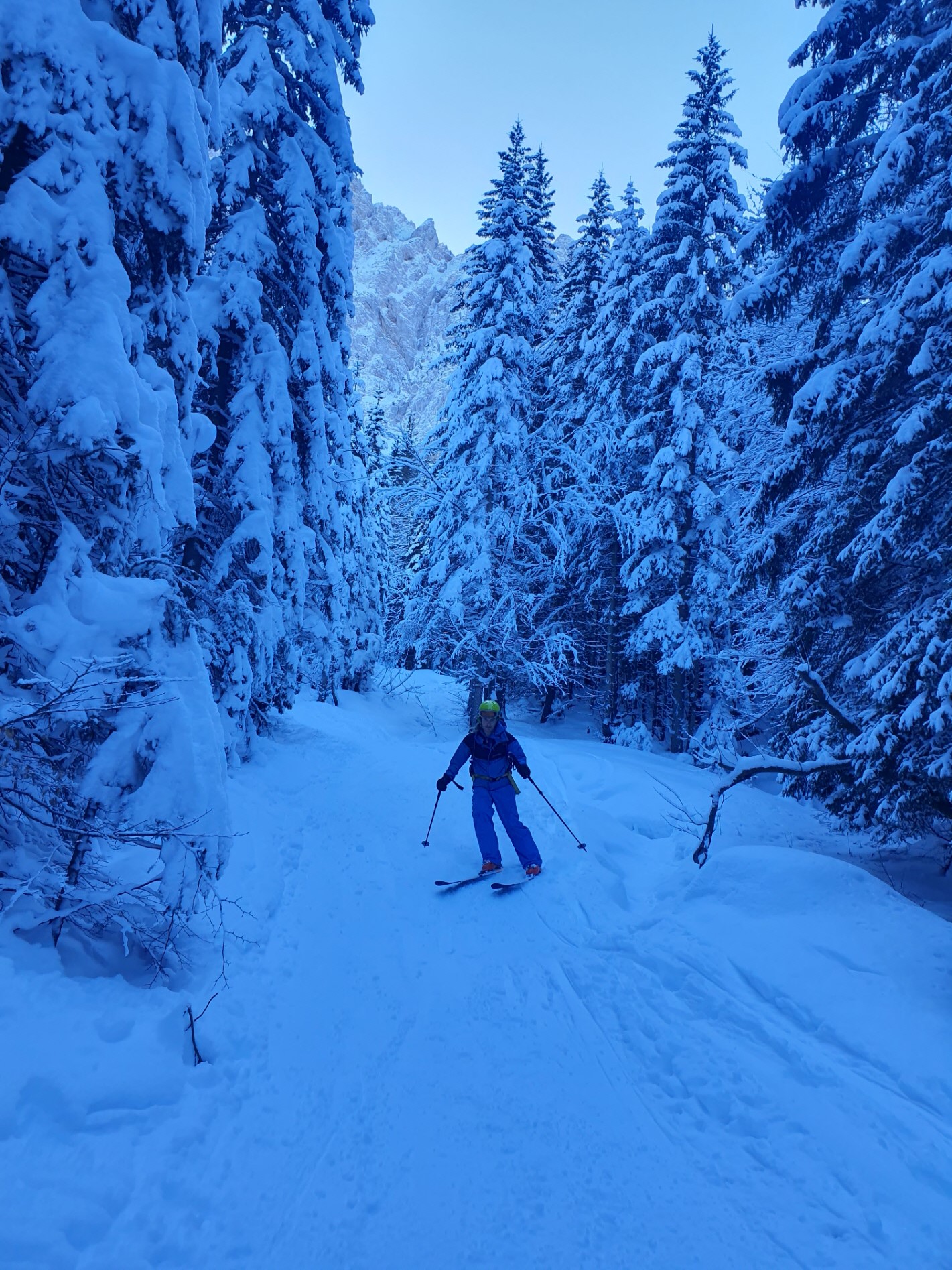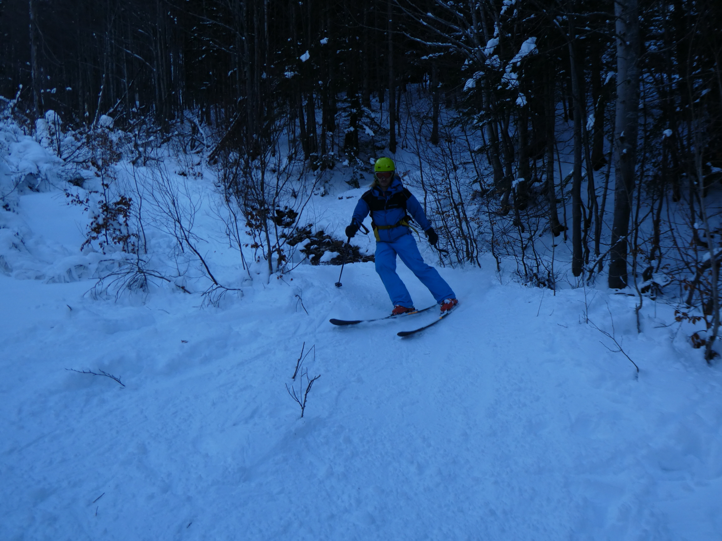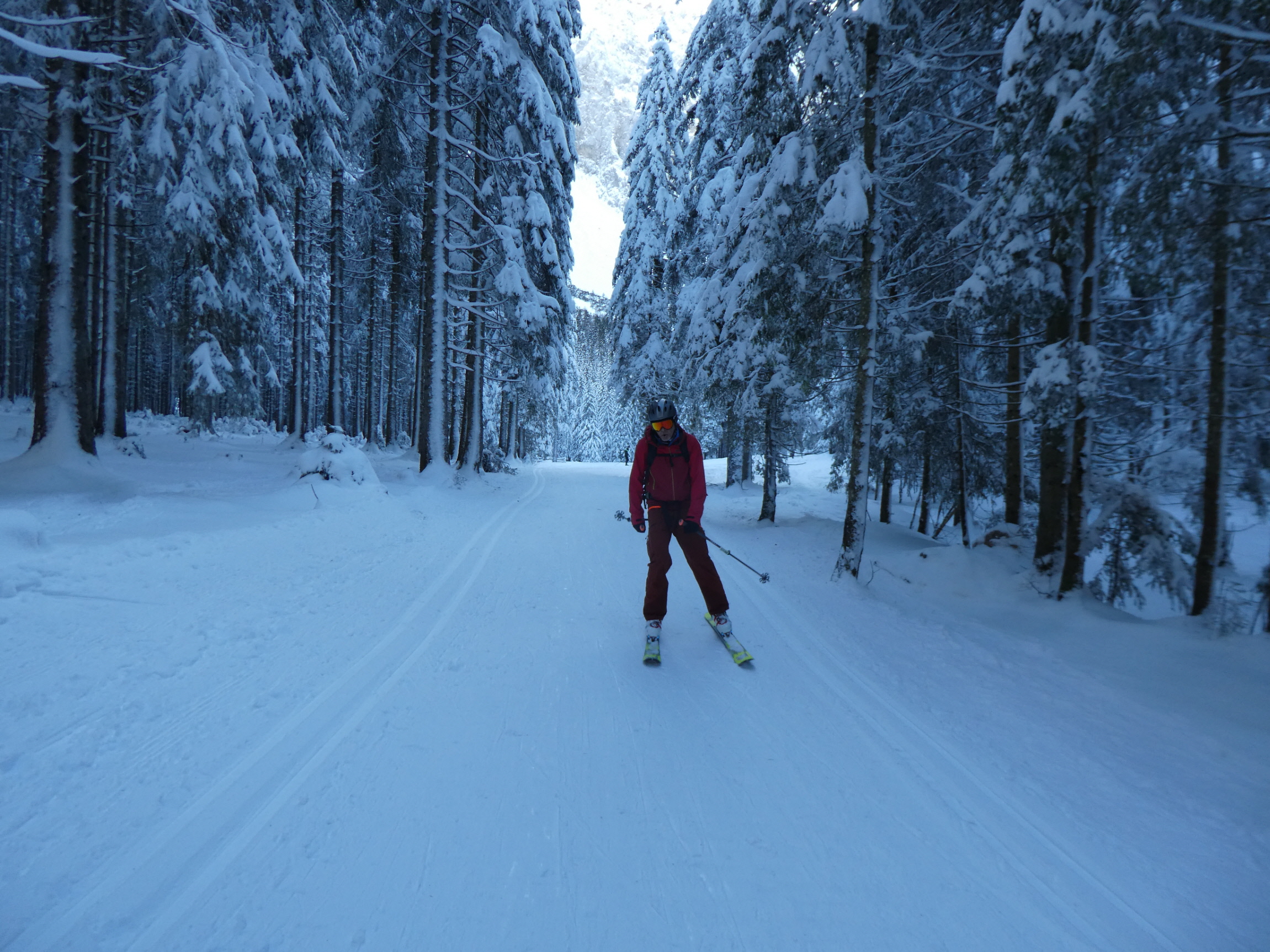 Im Schlussteil des freien Kars waren dann vom Wochenende her einige tiefe Spuren ausgefahren, in denen es sich wieder gut schwingen hat lassen. Lediglich der eine oder andere herauslugende Stein wollte umfahren werden. Besser als im Aufstieg gedacht war dann auch der holzige Teil unterhalb des Kars mit seinen Latschen und dem Erlengebüsch bald einmal erledigt.