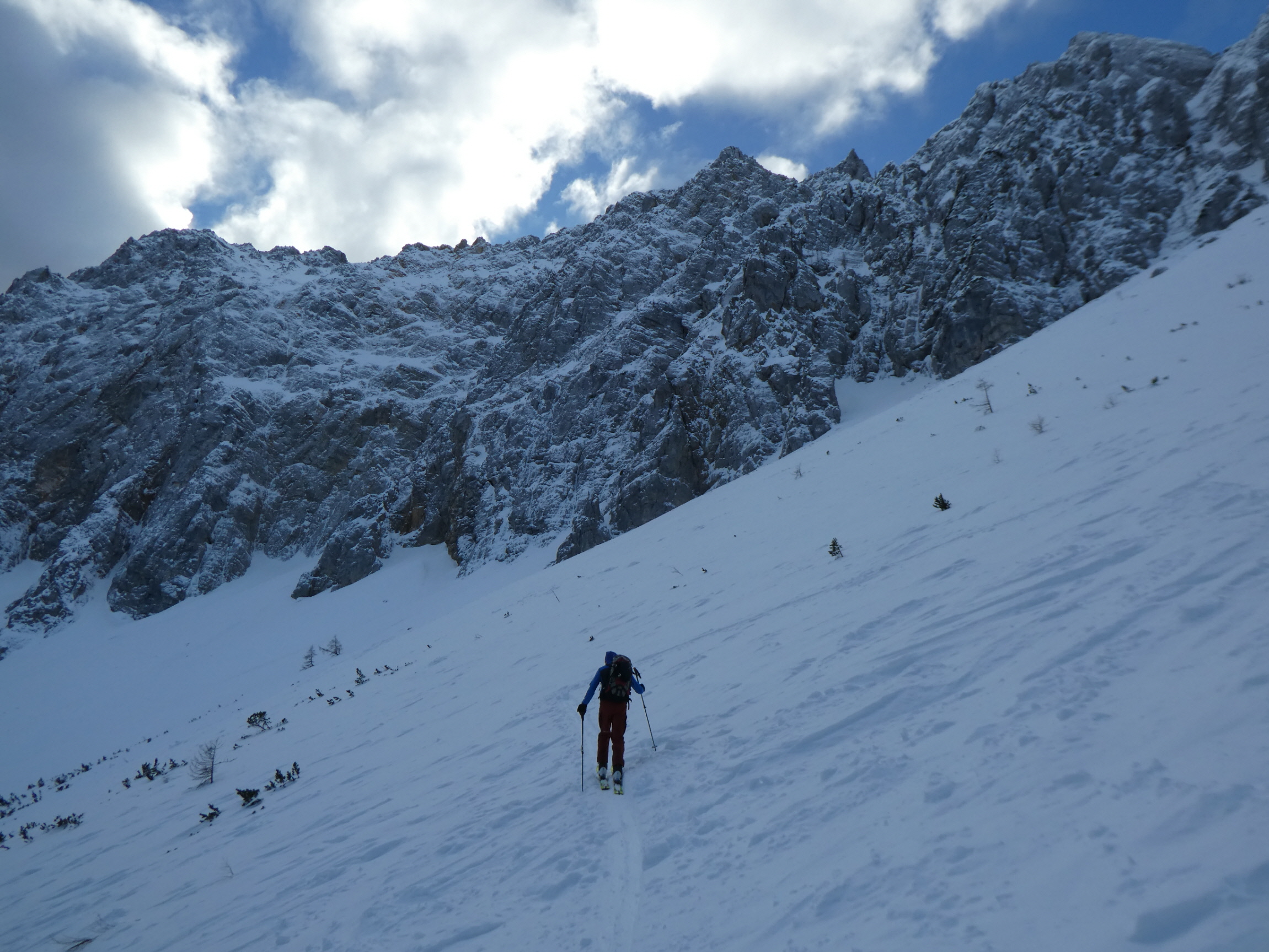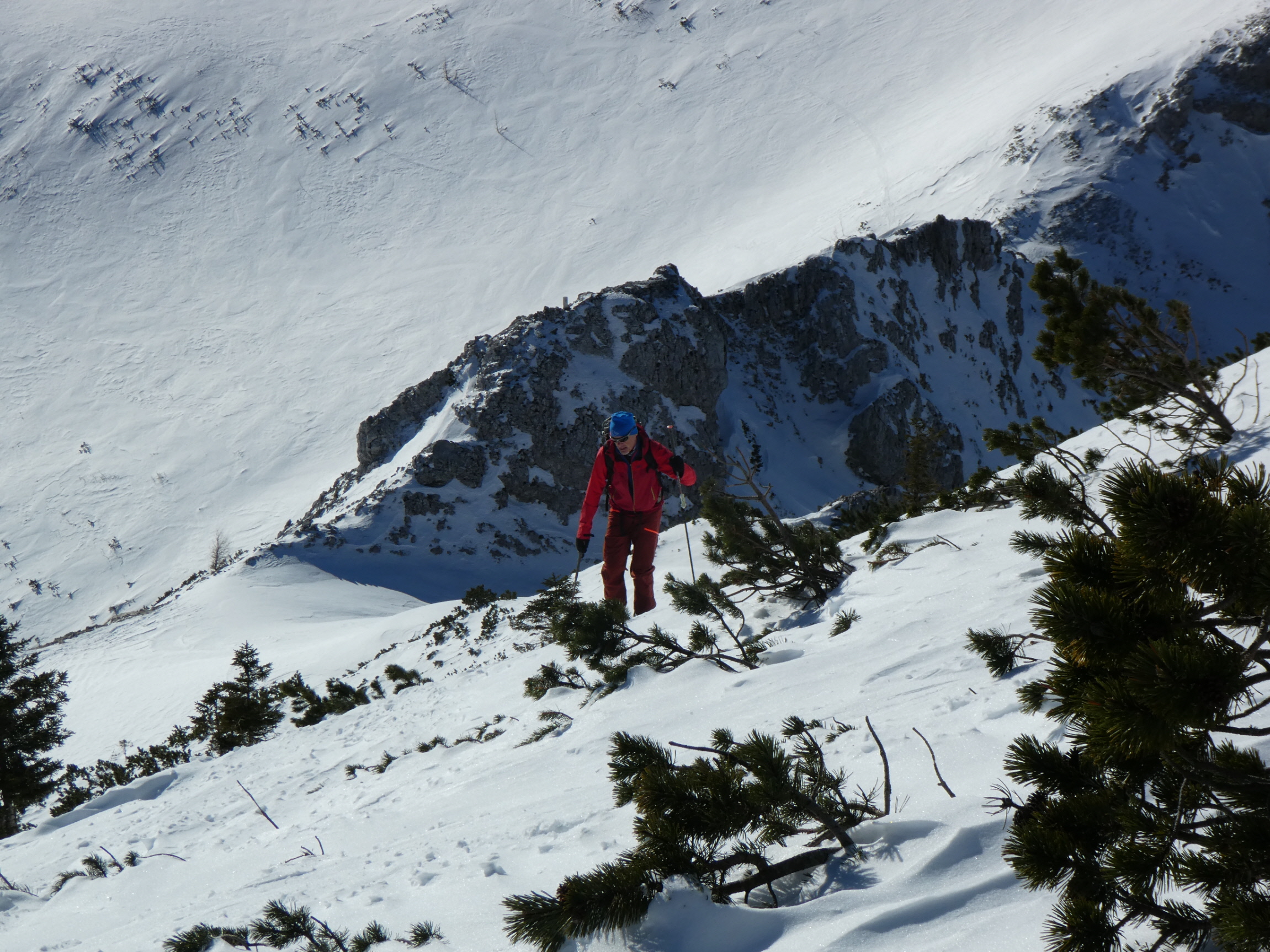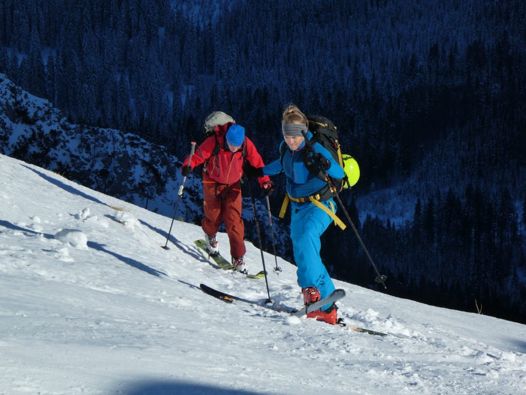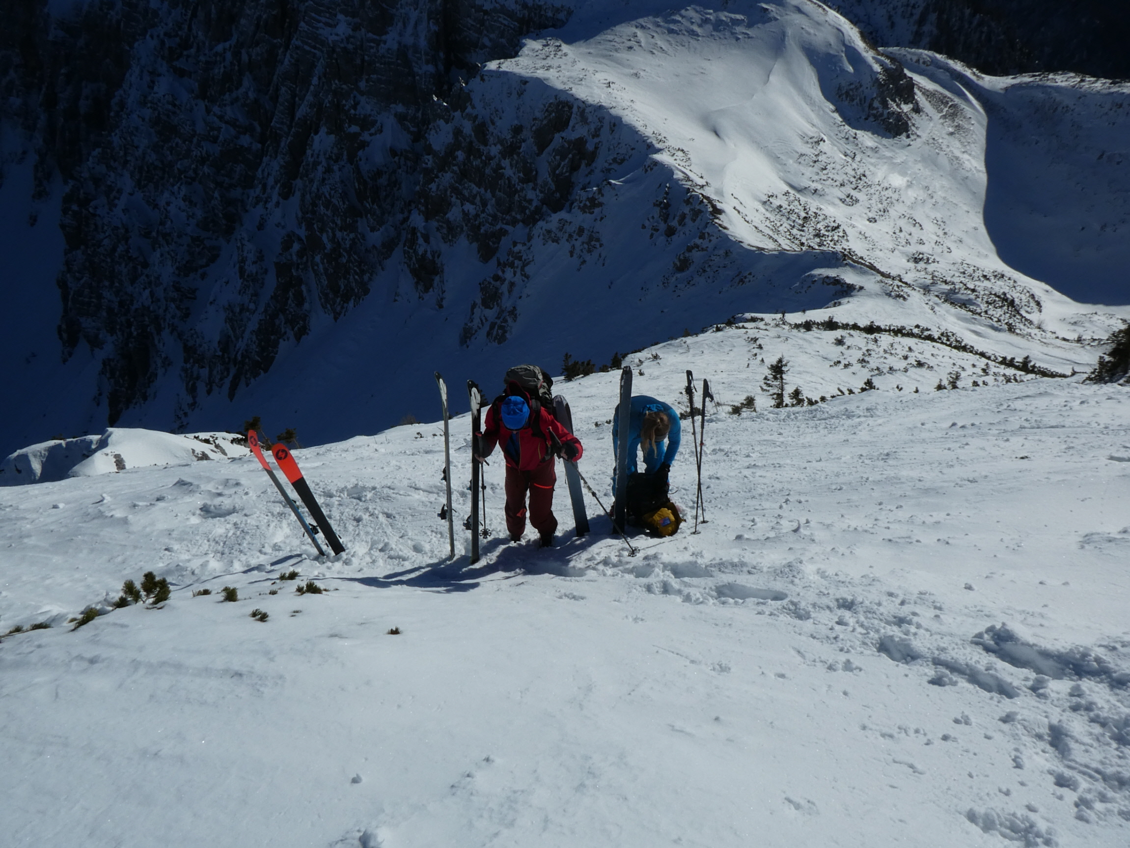 Im Kar haben wir mit vielen Kehren stetig an Höhe gewonnen. Mit dem steiler werdenden Gelände und der veränderten Schneedeckenstruktur hat sich irgendwann die Notwendigkeit der Montage von Harscheisen ergeben. Mit deren Hilfe und neuer Energie aus der Trinkflasche ging es danach weiter aufwärts. Jede Spitzkehre wollte trotz des griffigen Windharschdeckels mit Bedacht gesetzt sein.
