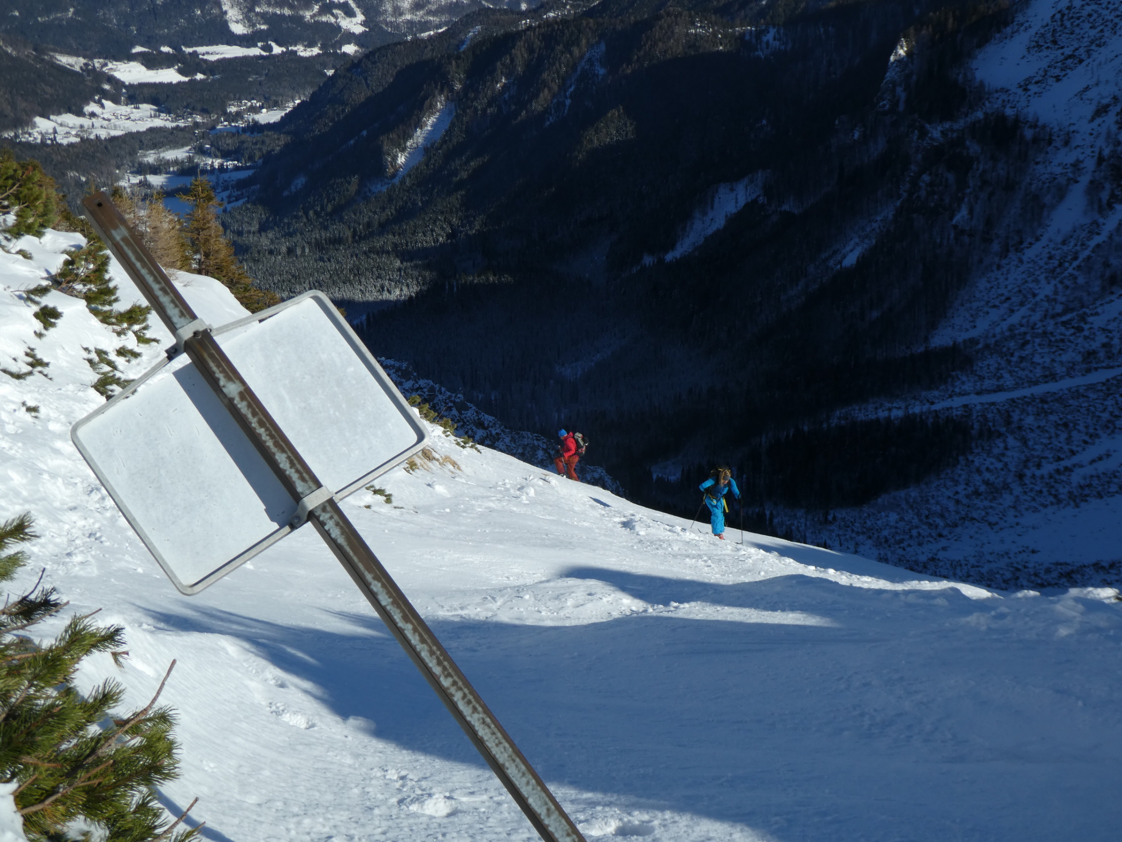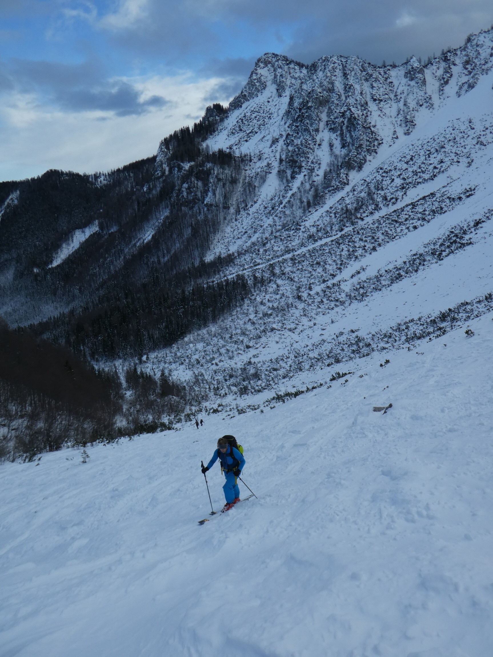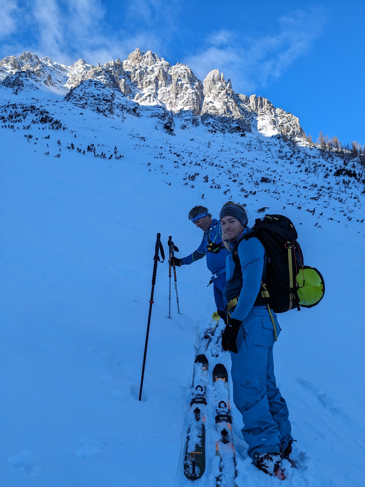 Im Kar haben wir mit vielen Kehren stetig an Höhe gewonnen. Mit dem steiler werdenden Gelände und der veränderten Schneedeckenstruktur hat sich irgendwann die Notwendigkeit der Montage von Harscheisen ergeben. Mit deren Hilfe und neuer Energie aus der Trinkflasche ging es danach weiter aufwärts. Jede Spitzkehre wollte trotz des griffigen Windharschdeckels mit Bedacht gesetzt sein.