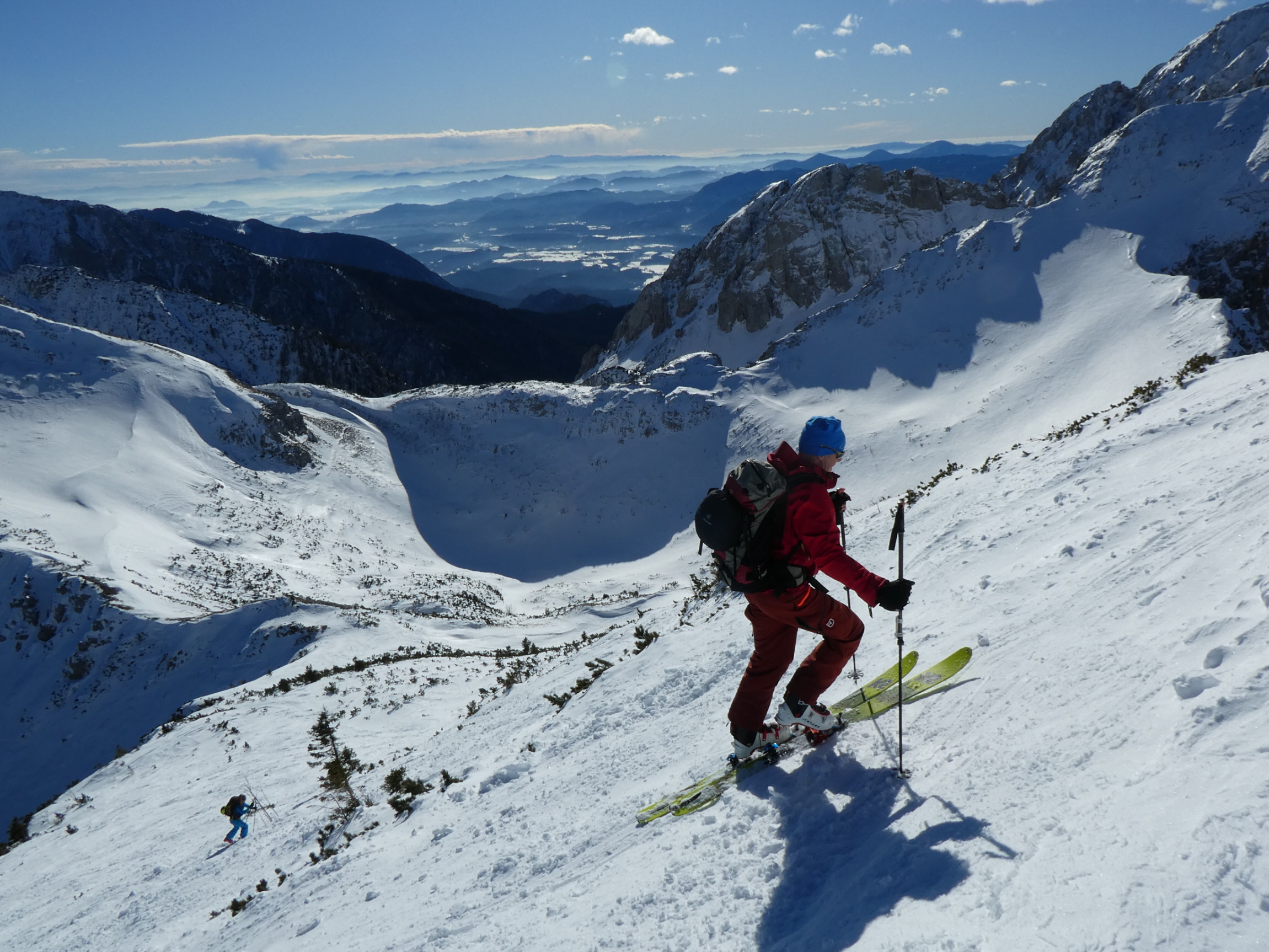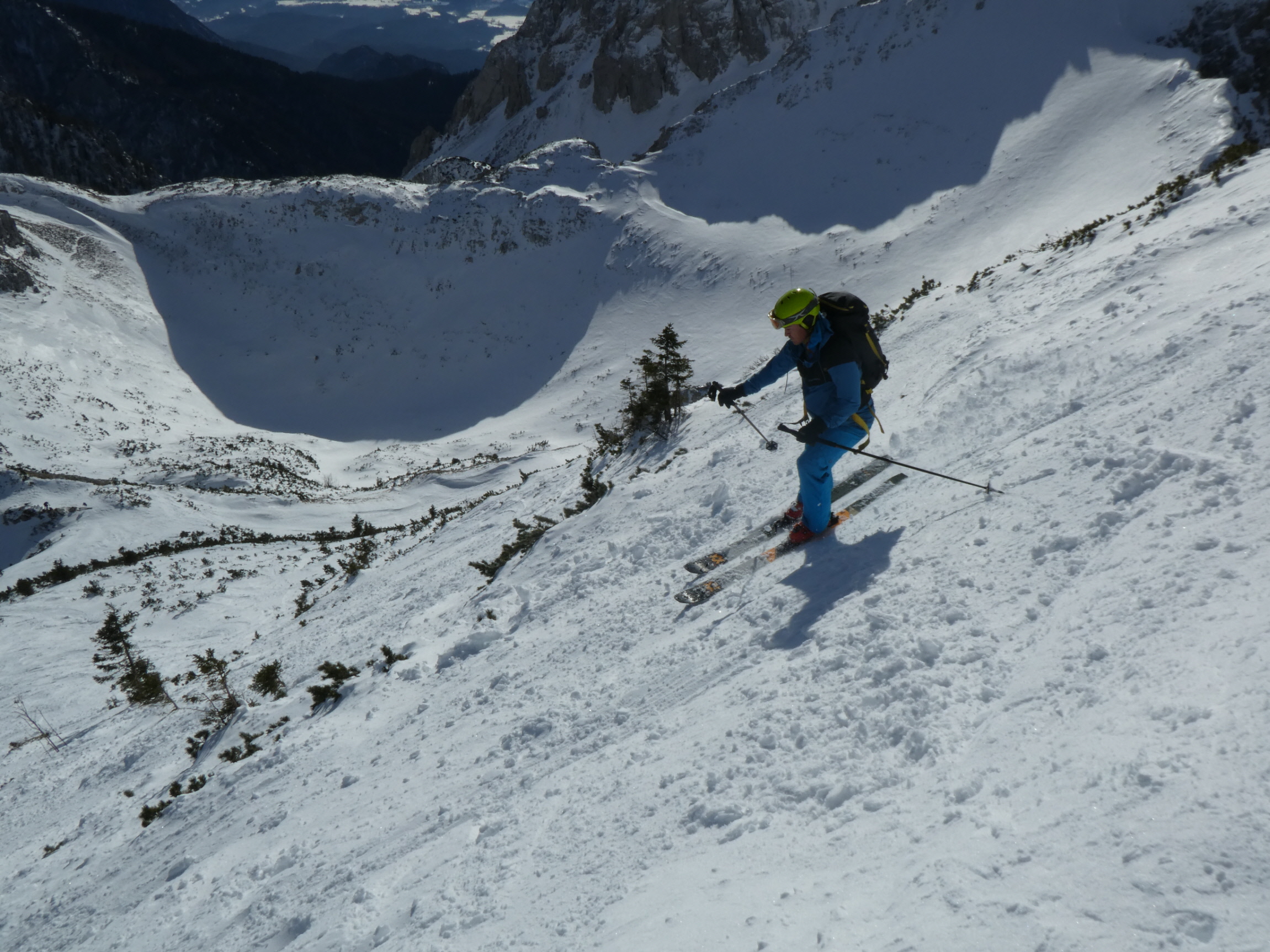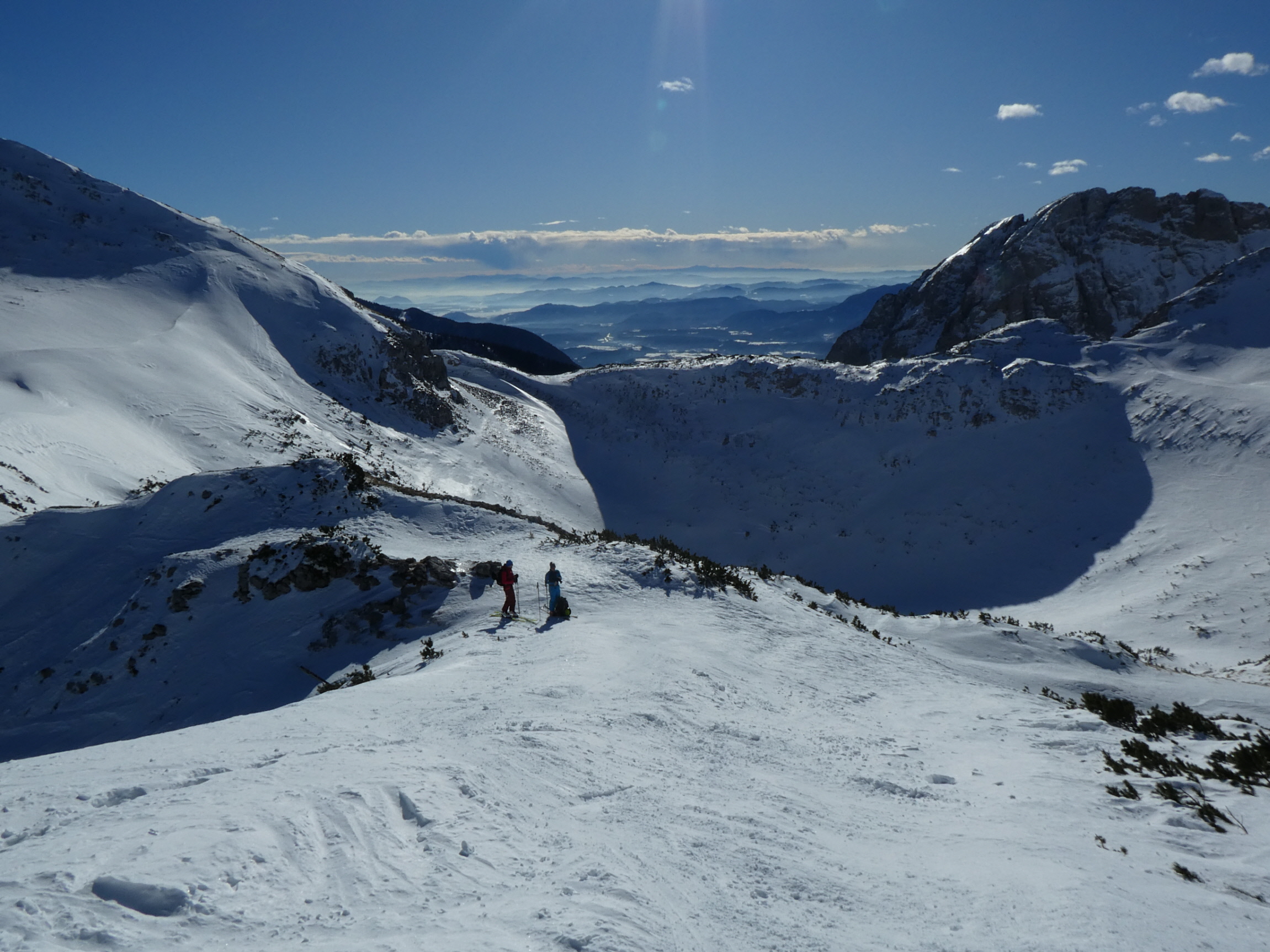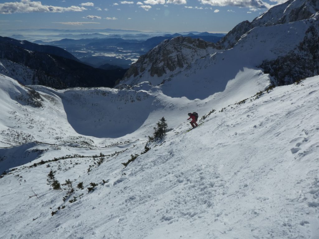 Nach meiner Rückkehr vom Gipfelgang haben wir zusammen mit einem slowenischen Wintersportler beim Skidepot gejausnet und für die Abfahrt umgerüstet. Dann sind wir entlang der Staatsgrenze zuerst an den Rand der großen Doline ab- und von da wieder ins Vertatschakar eingefahren. Auf den ersten 100 Höhenmetern hat es darin ordentlich unter unseren Skiern geraspelt. Der stellweise sehr harte bis eisige Harschdeckel hat uns gefordert.