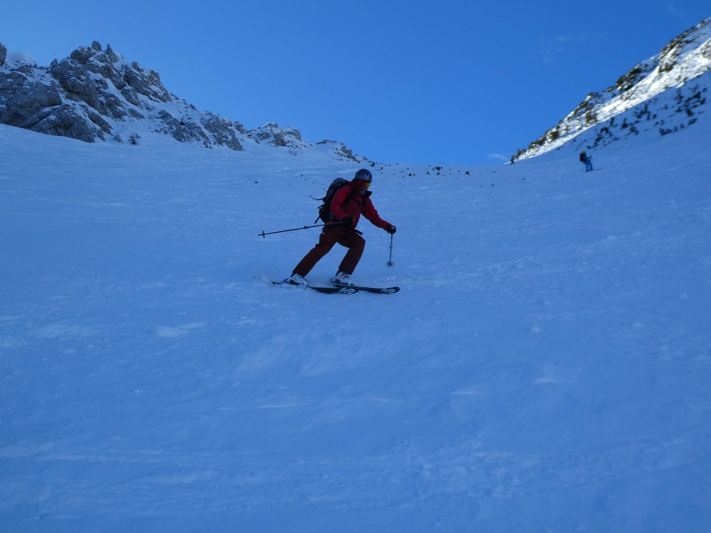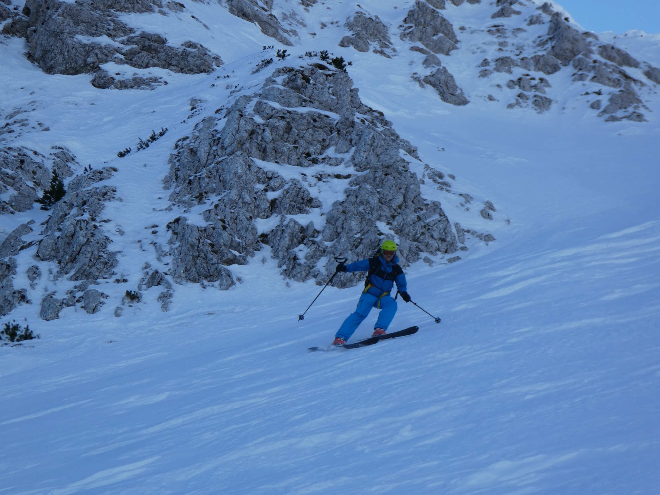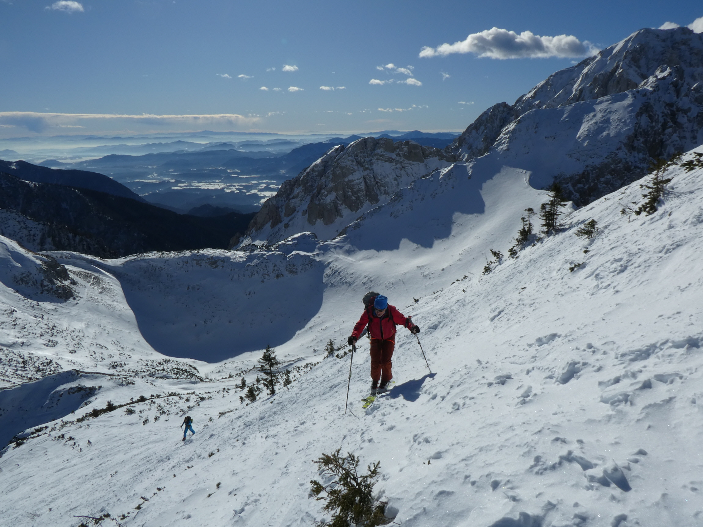 Nach meiner Rückkehr vom Gipfelgang haben wir zusammen mit einem slowenischen Wintersportler beim Skidepot gejausnet und für die Abfahrt umgerüstet. Dann sind wir entlang der Staatsgrenze zuerst an den Rand der großen Doline ab- und von da wieder ins Vertatschakar eingefahren. Auf den ersten 100 Höhenmetern hat es darin ordentlich unter unseren Skiern geraspelt. Der stellweise sehr harte bis eisige Harschdeckel hat uns gefordert.