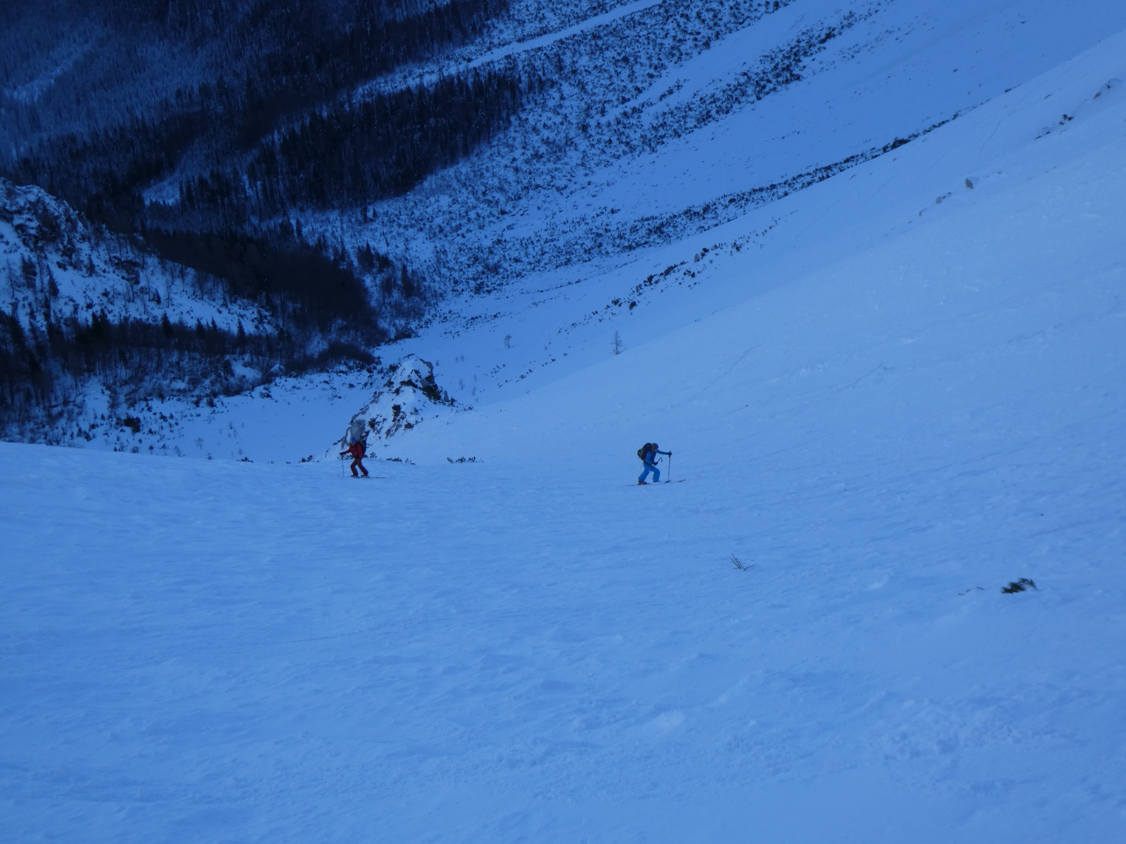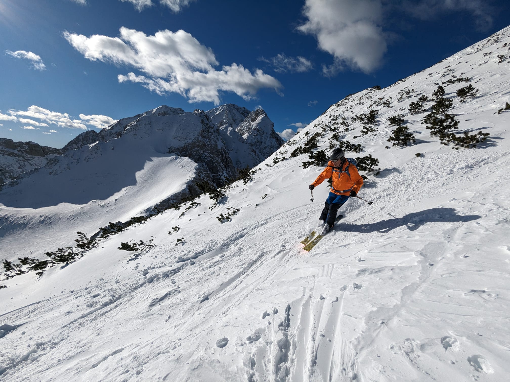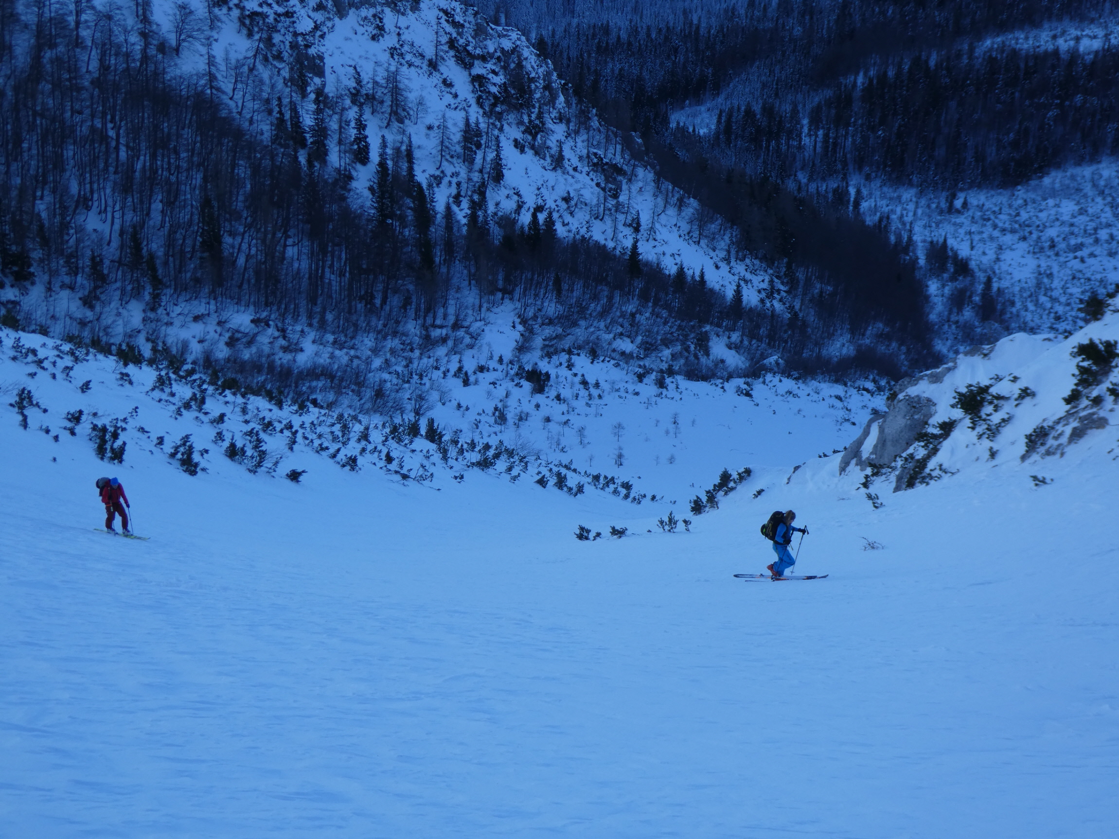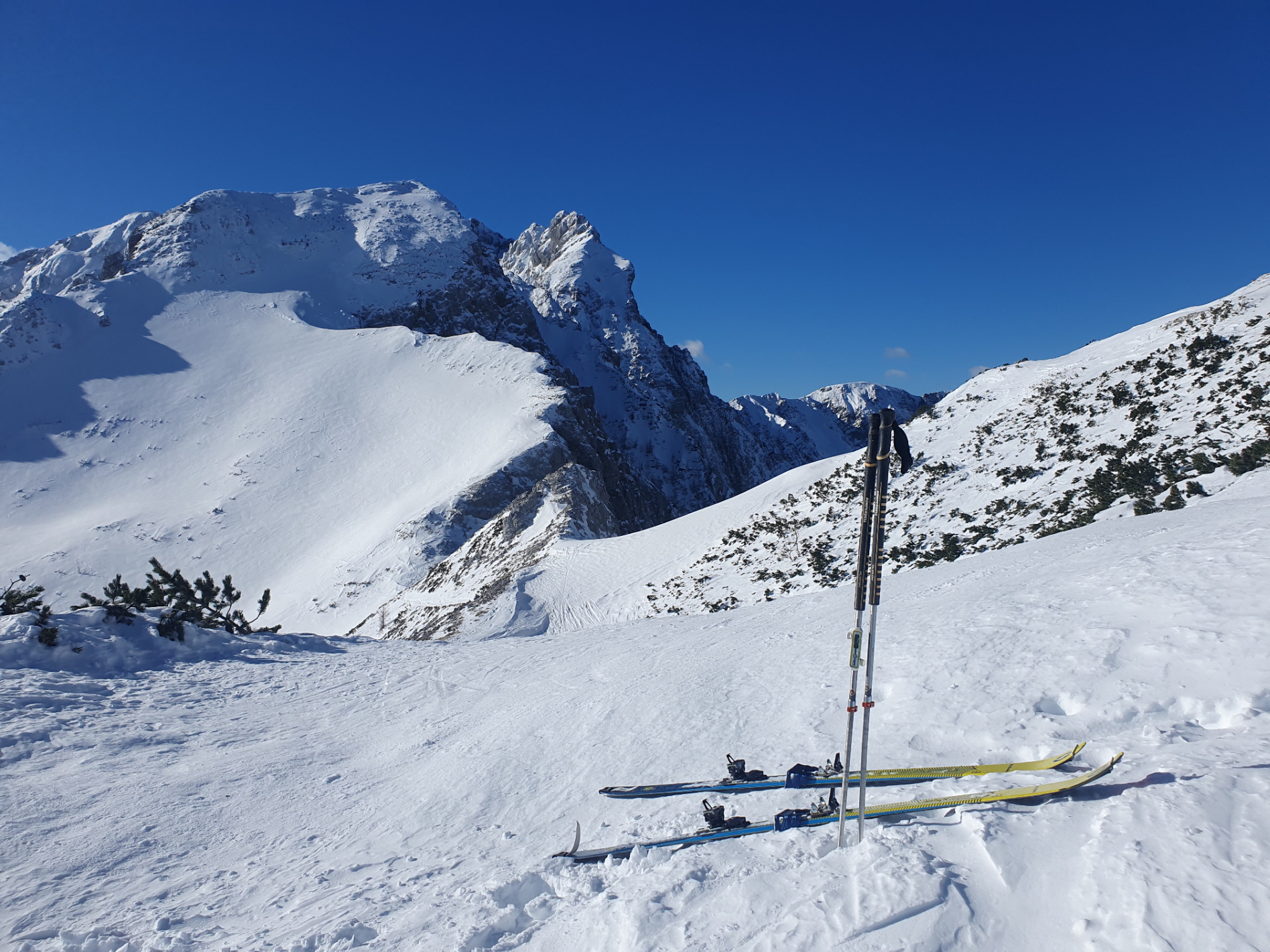 Nach meiner Rückkehr vom Gipfelgang haben wir zusammen mit einem slowenischen Wintersportler beim Skidepot gejausnet und für die Abfahrt umgerüstet. Dann sind wir entlang der Staatsgrenze zuerst an den Rand der großen Doline ab- und von da wieder ins Vertatschakar eingefahren. Auf den ersten 100 Höhenmetern hat es darin ordentlich unter unseren Skiern geraspelt. Der stellweise sehr harte bis eisige Harschdeckel hat uns gefordert.