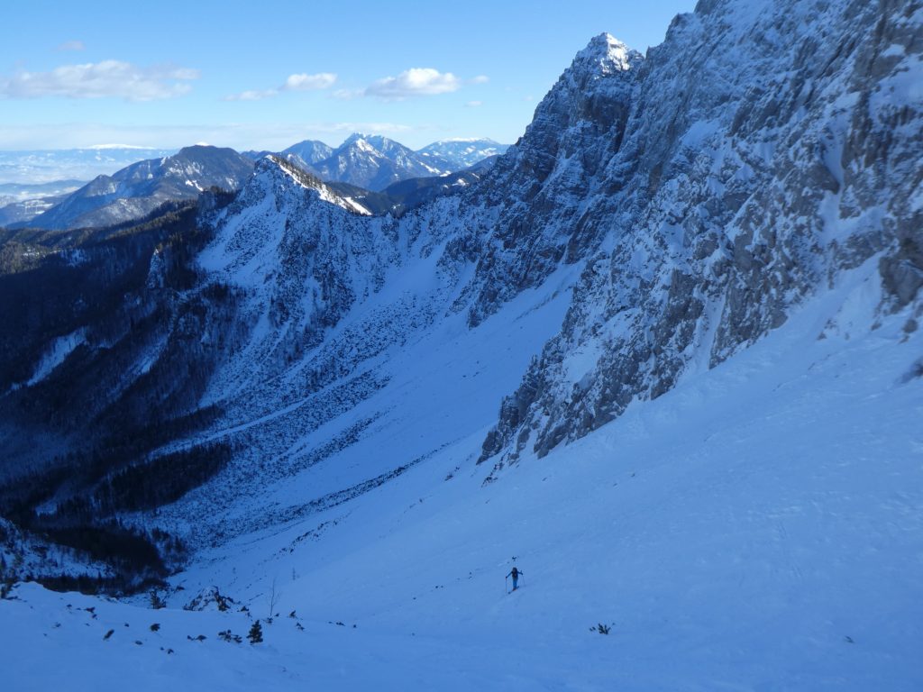 Im Schlussteil des Kars wird zwar die Hangneigung wieder etwas geringer, mit der dort – zumindest stundenweise – einstrahlenden Sonne hatte sich an den Vortagen ein glasiger Schmelzharschdeckel gebildet. Diesem in das steilere und – nur vermeintlich – weniger harte Gelände am rechten Rand des Kars auszuweichen, war jedenfalls die falsche Entscheidung. An der steilsten Stelle ist mir beim Hineinhacken der Kanten in die pickelharte Oberfläche eine Bindung aufgegangen, gleich darauf auch noch die Zweite.