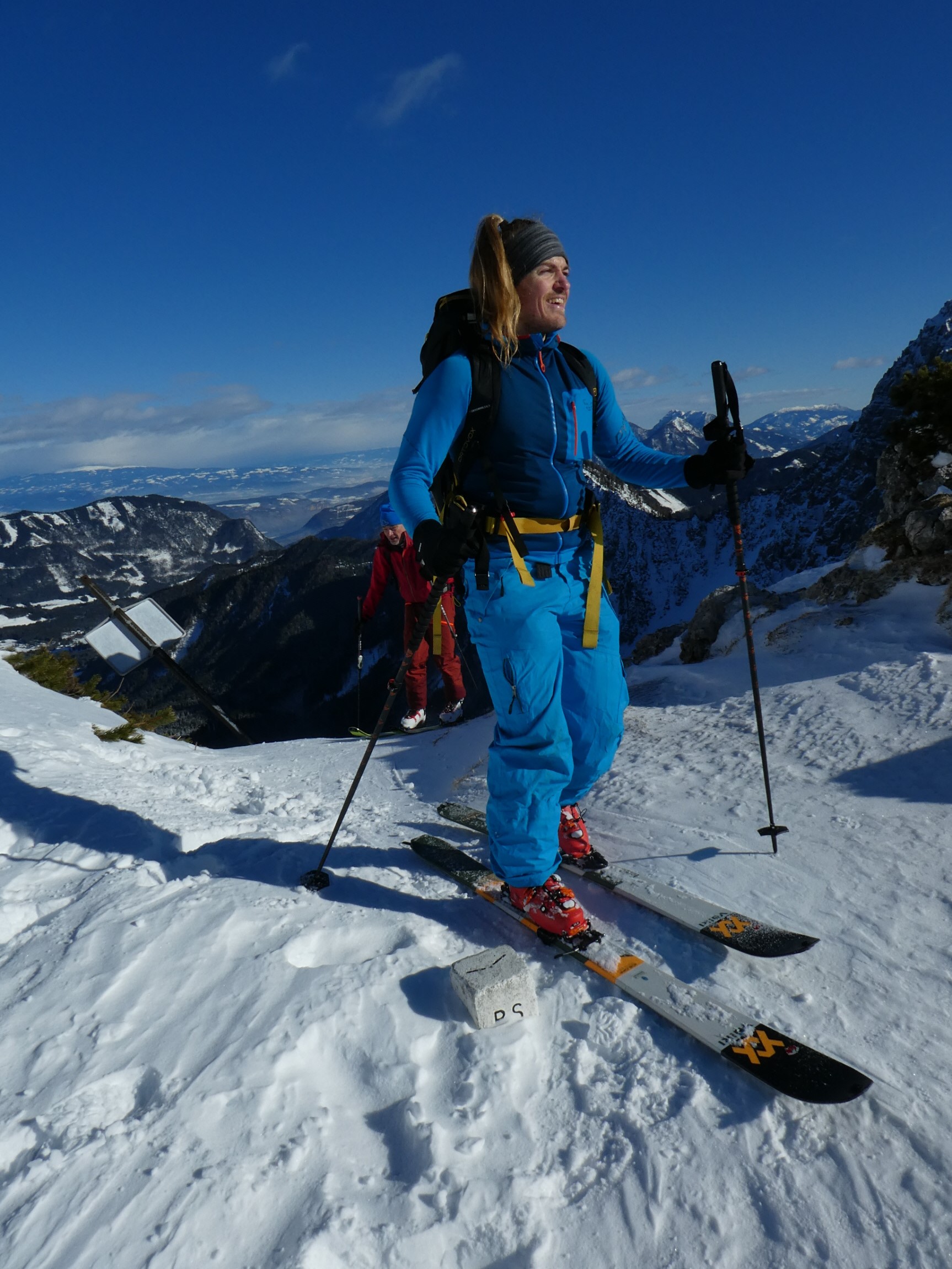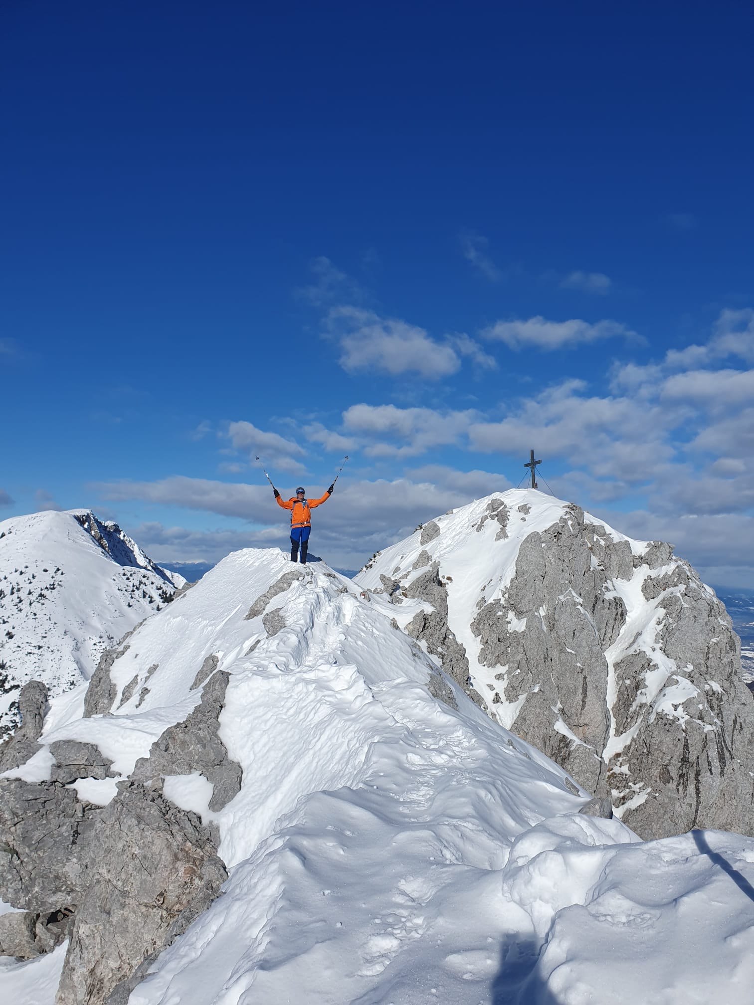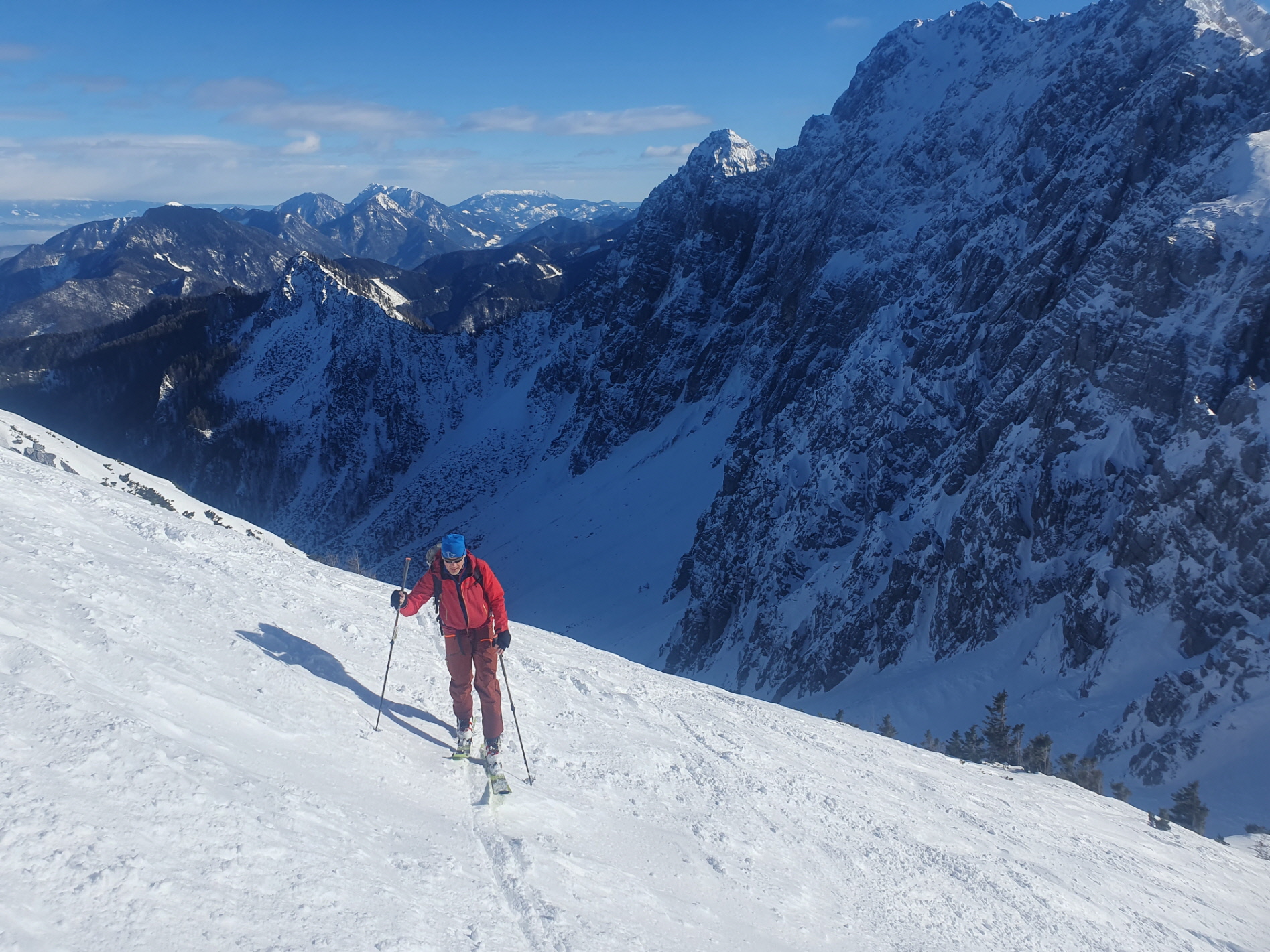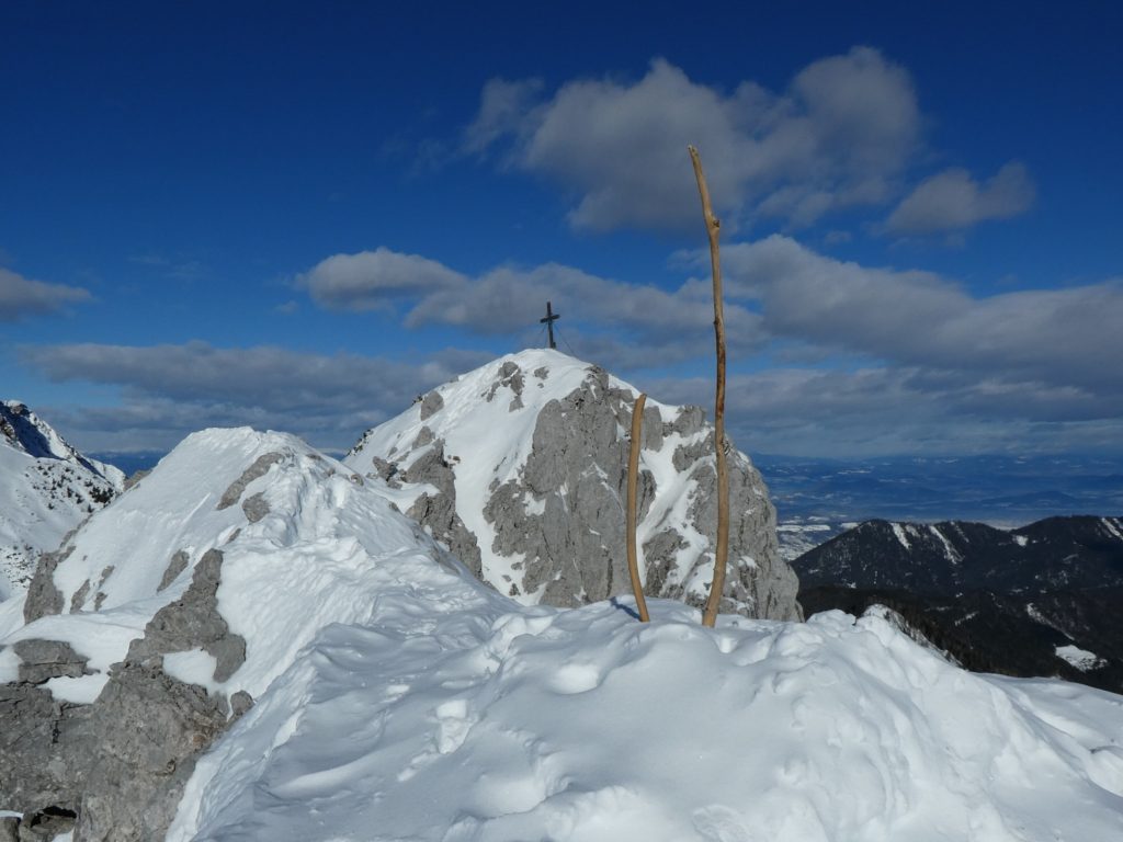Der südseitige weitere Anstieg bis hinauf zum Skidepot knapp unterhalb vom Vorgipfel war dann im viel weicheren sonnenbeschienen Hang kein Problem mehr. Den Übergang entlang des etwas ausgesetzten Grats hinüber zum Gipfelkreuz haben sich Gerhard und Adrian geschenkt und vom Vorgipfel aus den (Tief)blick zur Klagenfurter Hütte und zum Kosiak darüber im Nordwesten, zum Ausgangspunkt im Bodental im Osten, zur Vertatscha im SO sowie ins slowenische Krain im Süden genossen.