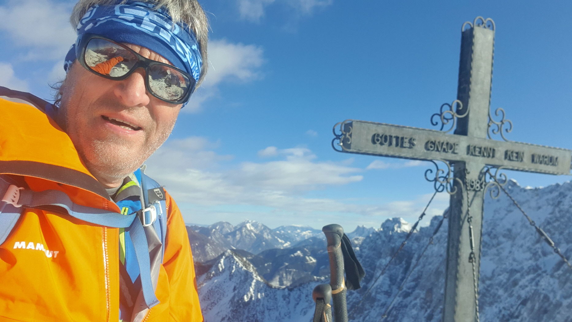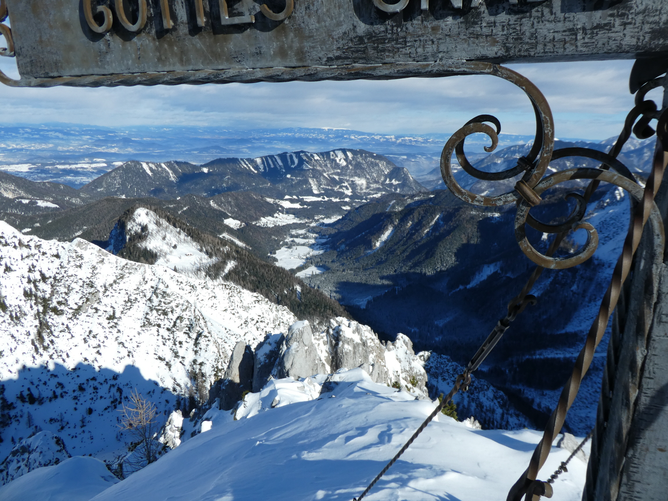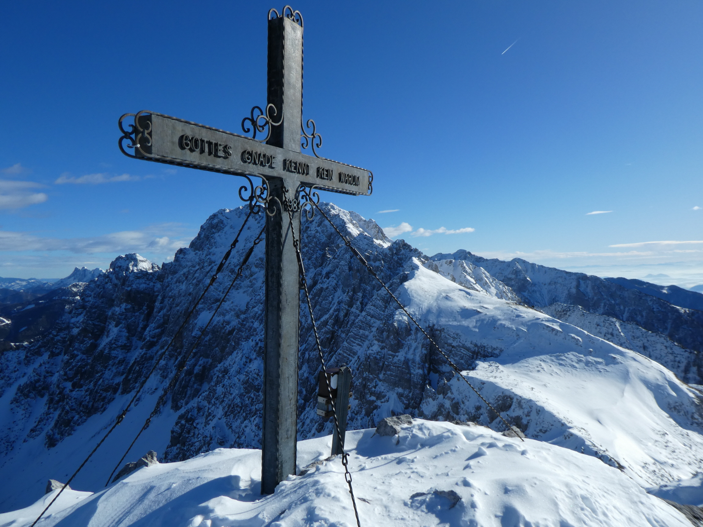 Der südseitige weitere Anstieg bis hinauf zum Skidepot knapp unterhalb vom Vorgipfel war dann im viel weicheren sonnenbeschienen Hang kein Problem mehr. Den Übergang entlang des etwas ausgesetzten Grats hinüber zum Gipfelkreuz haben sich Gerhard und Adrian geschenkt und vom Vorgipfel aus den (Tief)blick zur Klagenfurter Hütte und zum Kosiak darüber im Nordwesten, zum Ausgangspunkt im Bodental im Osten, zur Vertatscha im SO sowie ins slowenische Krain im Süden genossen.