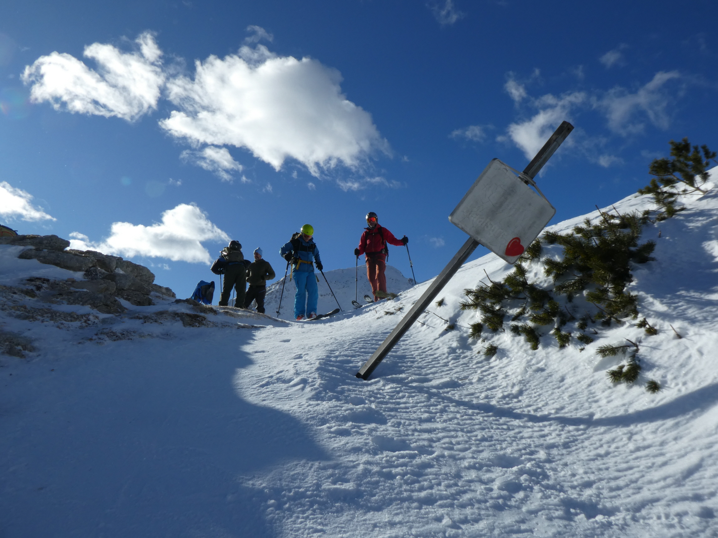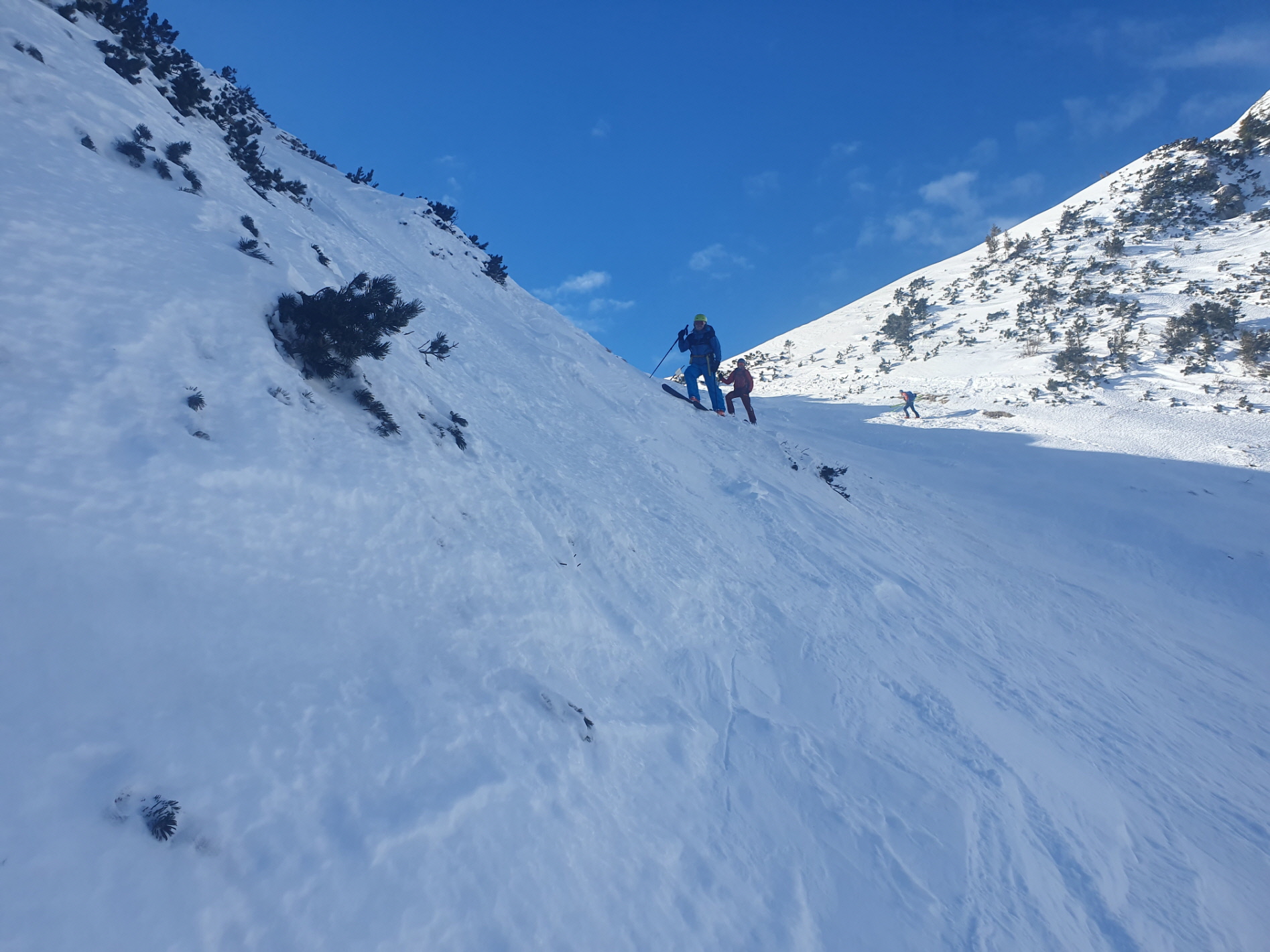 Die Skier konnte ich zum Glück festhalten und mich mit Hilfe einiger vorhandener Trittstufen bis hinauf zur Staatsgrenze am Vertatschasattel retten. Gerhard und Adrian habe ich daher empfohlen in der Mitte des Kars zu bleiben. Schon vorgeschult vom morgendlichen Gang über vereiste Gehsteige hin zum Auto haben sie mit einigen fordernden Kehren zu mir aufgeschlossen.