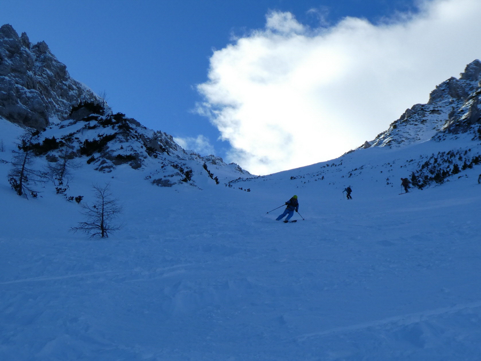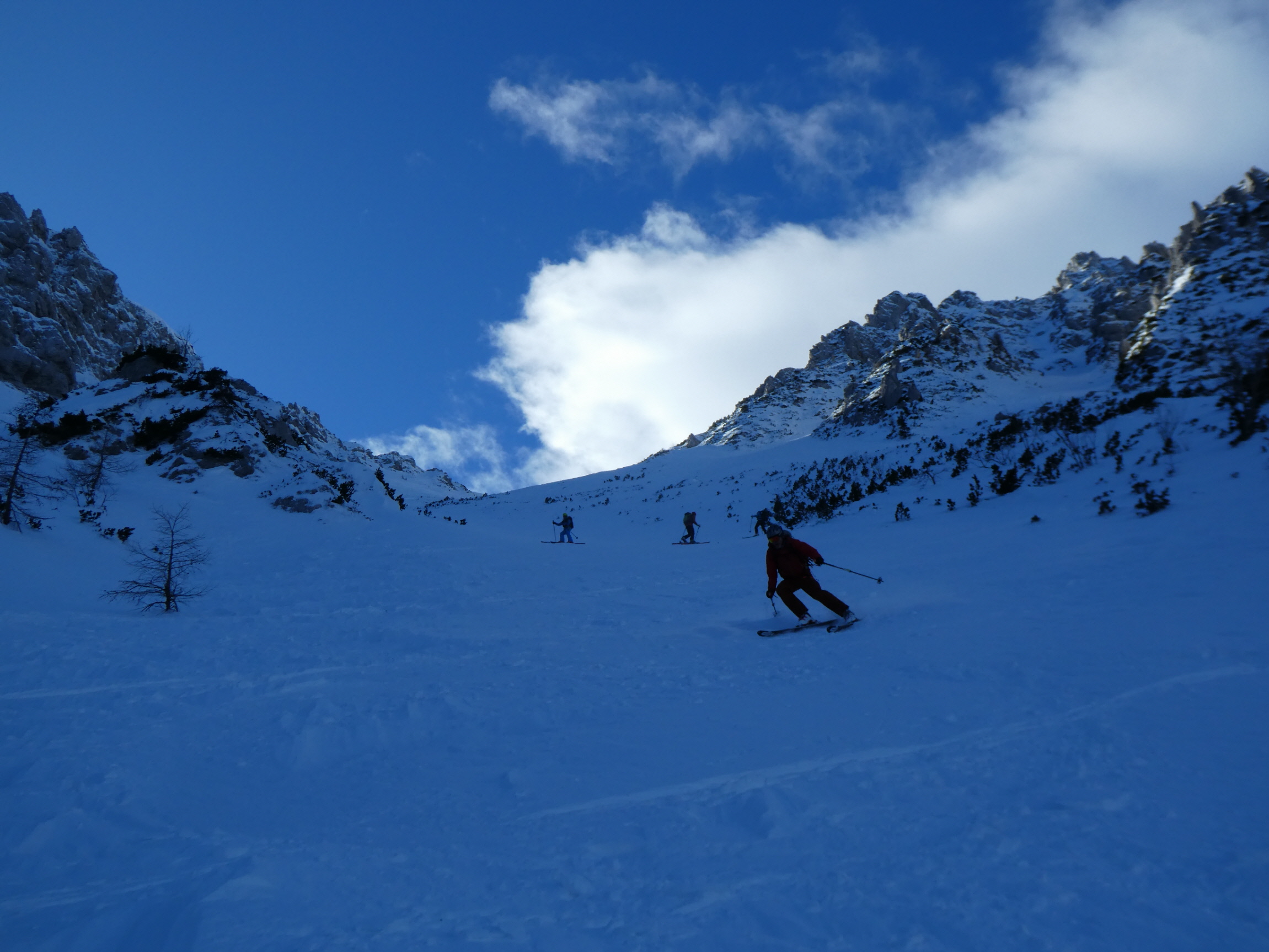 Der griffige Windharsch danach war hingegen trotz steiler werdendem Gelände sehr gut fahrbar. Ab der Karmitte ist dies aber leider nicht mehr der Fall gewesen. Der Harschdeckel ist immer wieder einmal gebrochen. Daher sind wir in diesem Bereich sehr schaumgebremst weiter abgefahren.