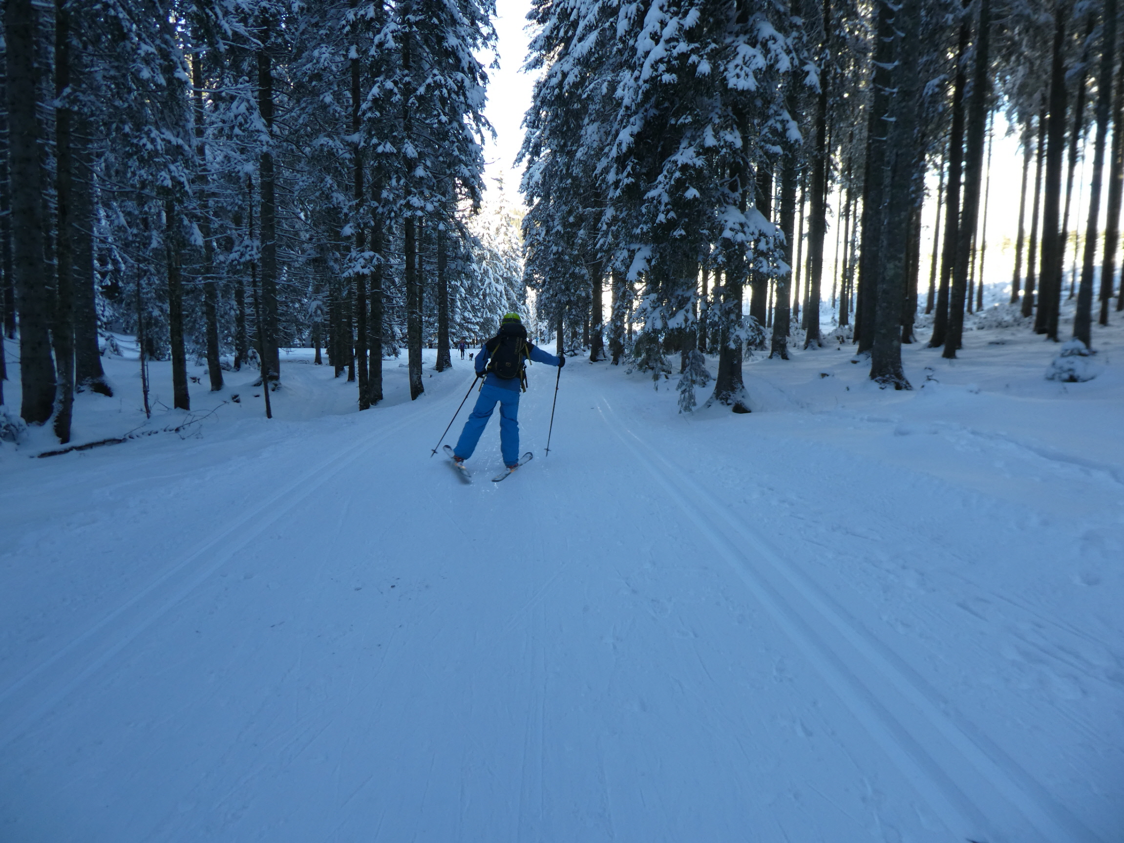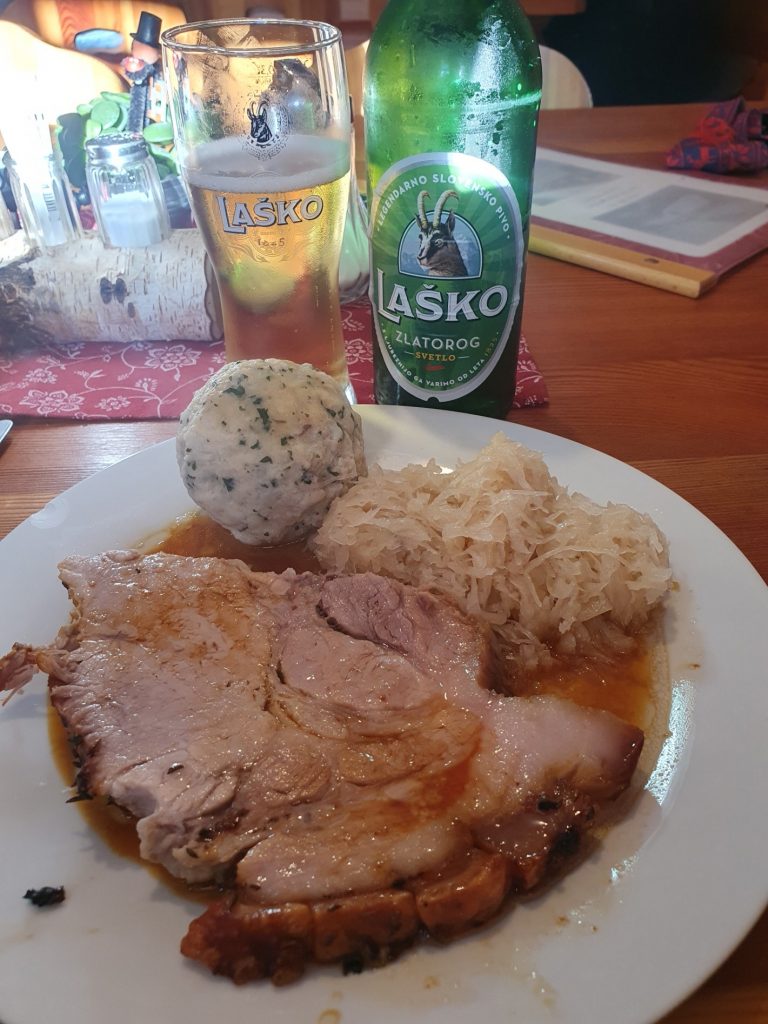 Danach haben wir am ausgefahrenen Weg Fahrt aufgenommen und sind ab der Märchenwiese entlang der Loipe zurück zum Ausgangspunkt der Tour beim Bodenbauer flott abgefahren. Nach dem Umziehen und Verstauen der Ausrüstung sind wir dort auch eingekehrt. Die Speisekarte ist nicht unbedingt umfangreich, aber jedes einzelne Gericht wird vom Podnar als Spezialität des Hauses angepriesen. Der von Adrian und mir gewählte Schweinsbraten mit Kraut und Knödel verdient diese Bezeichnung jedenfalls. Ob der Heinrich dem von Gerhard georderten Ritschert den Vorzug eingeräumt hätte, wage ich zu bezweifeln.