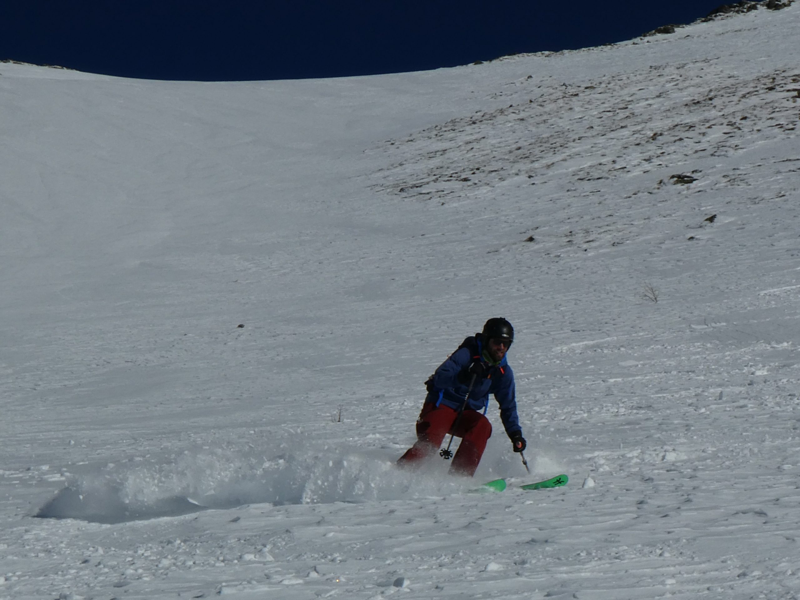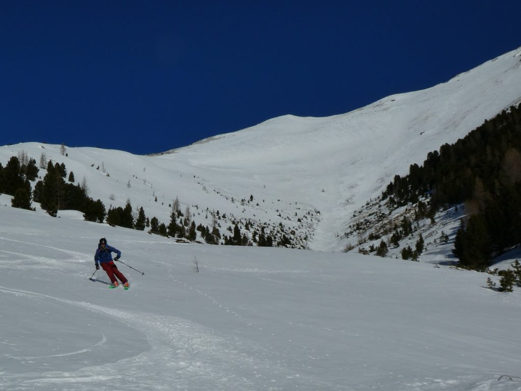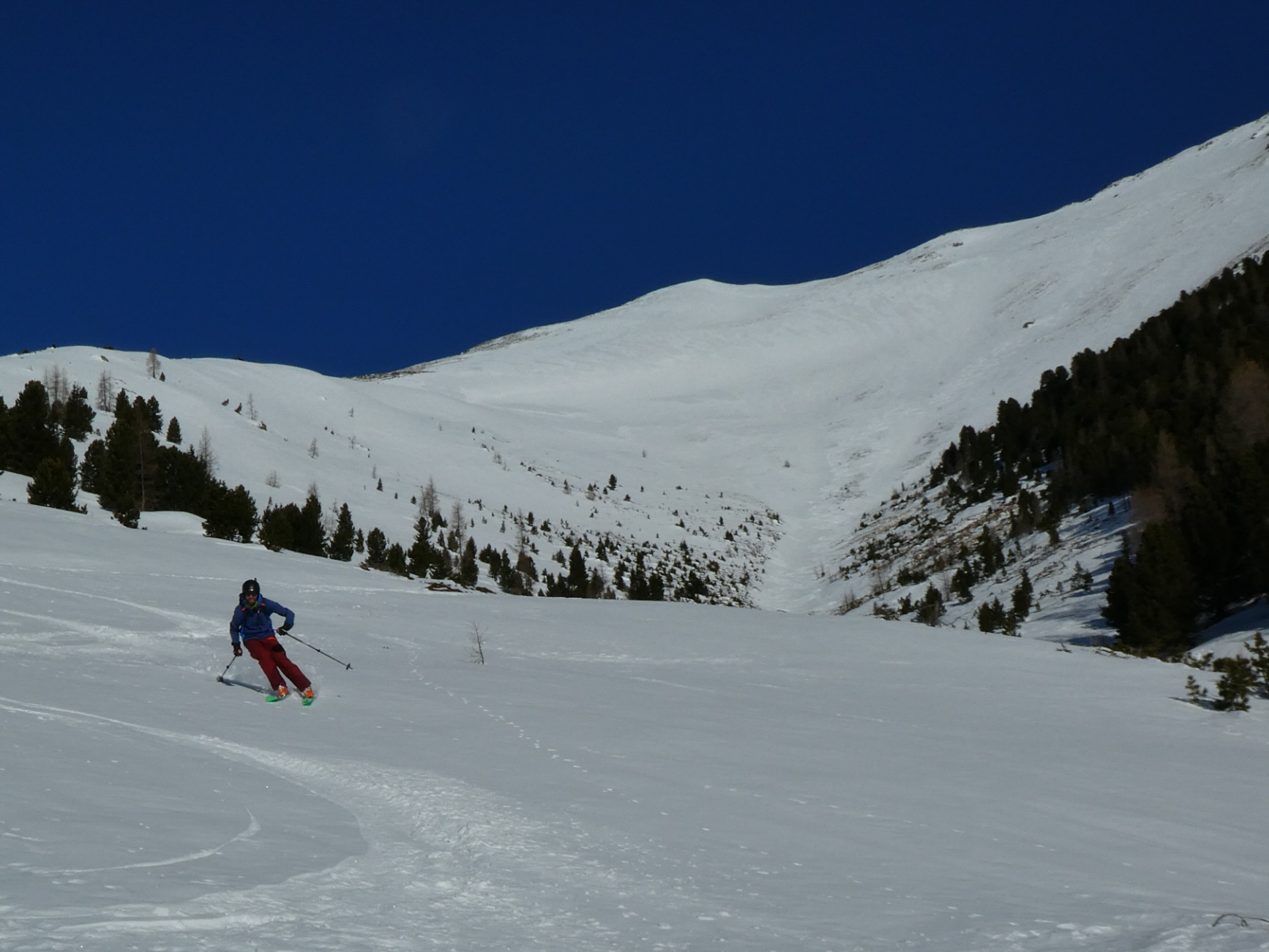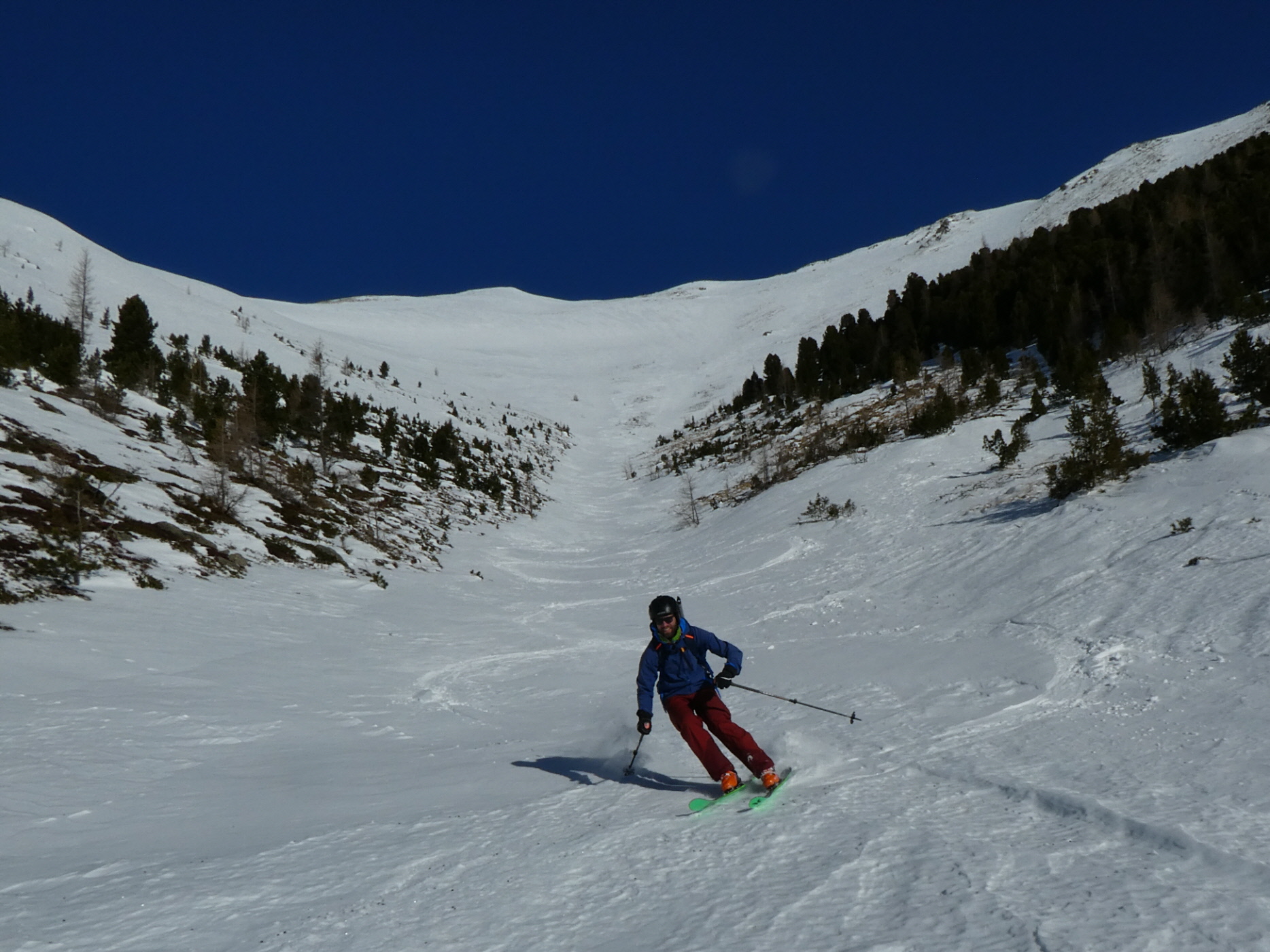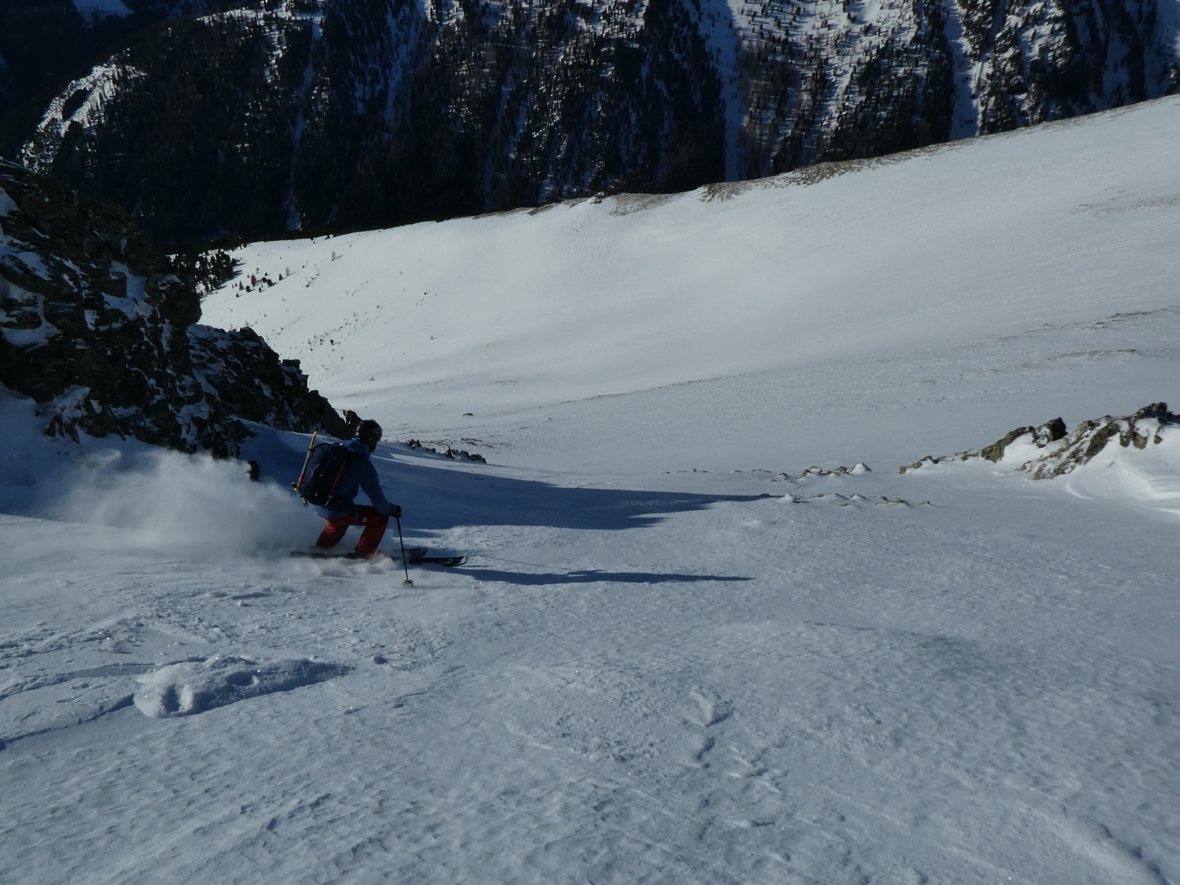 Anfangs auf einem griffigen Harschdeckel, danach meist in leicht plattigem, aber auch sehr gut fahrbarem Pulver sind wir talwärts gecarvt. Jeder der schlussendlich 550 Höhenmeter, die wir in der Falllinie und zuletzt am Rinnenboden fahrend abgebaut haben, war ein Genuss.