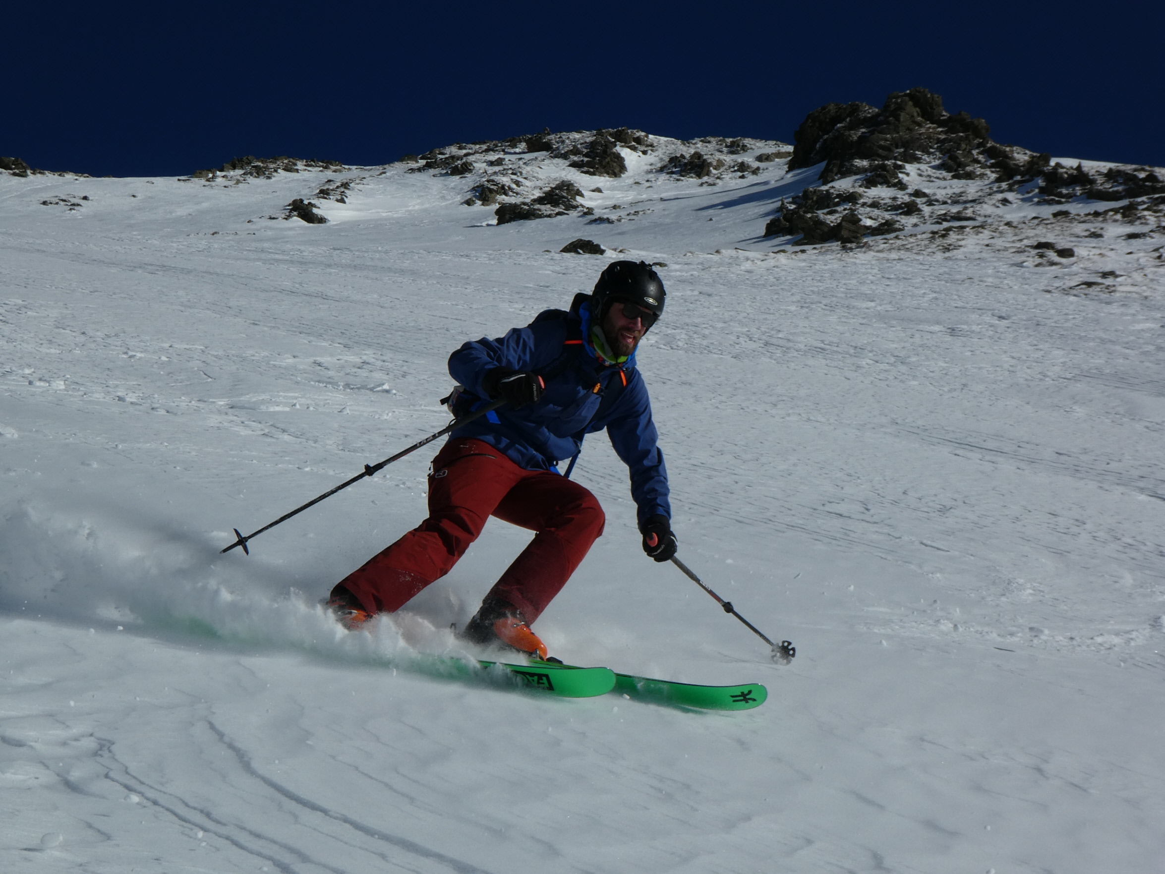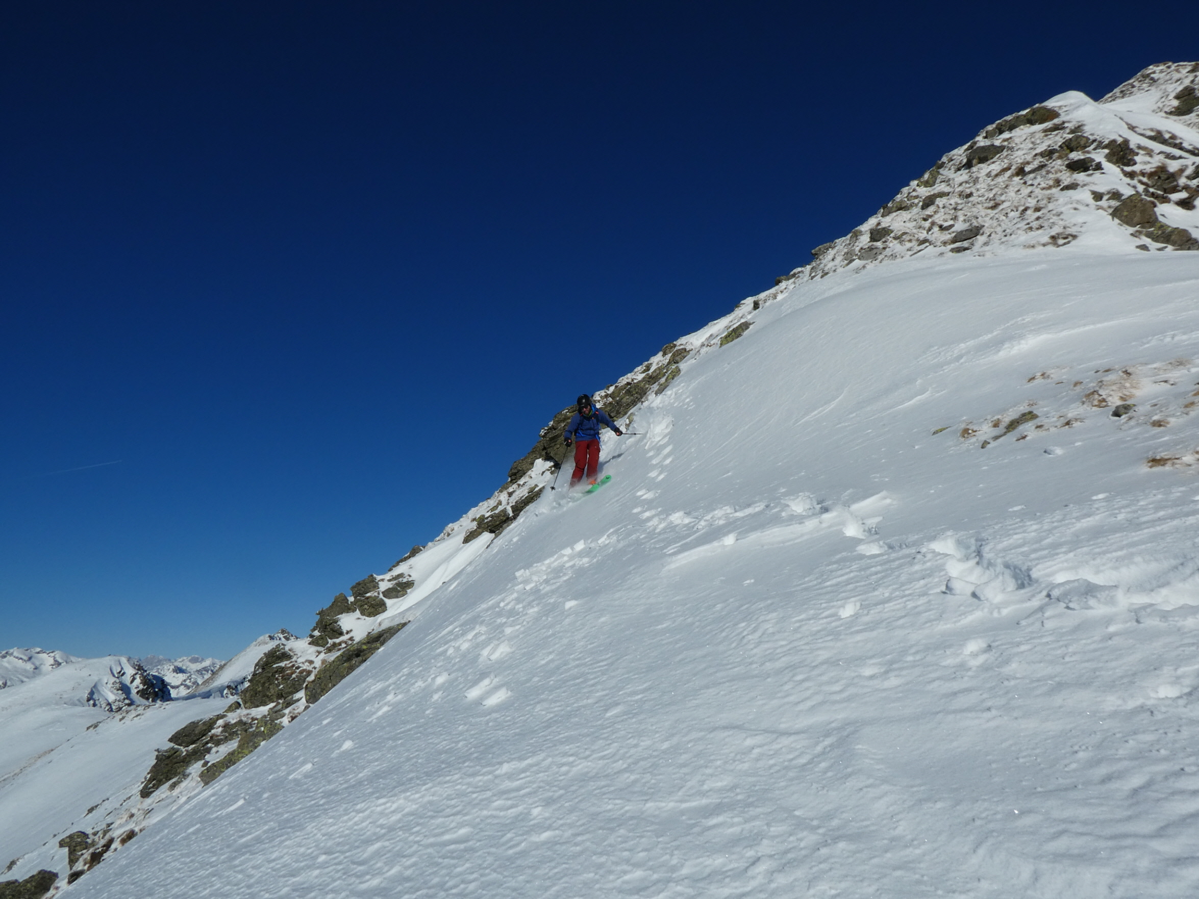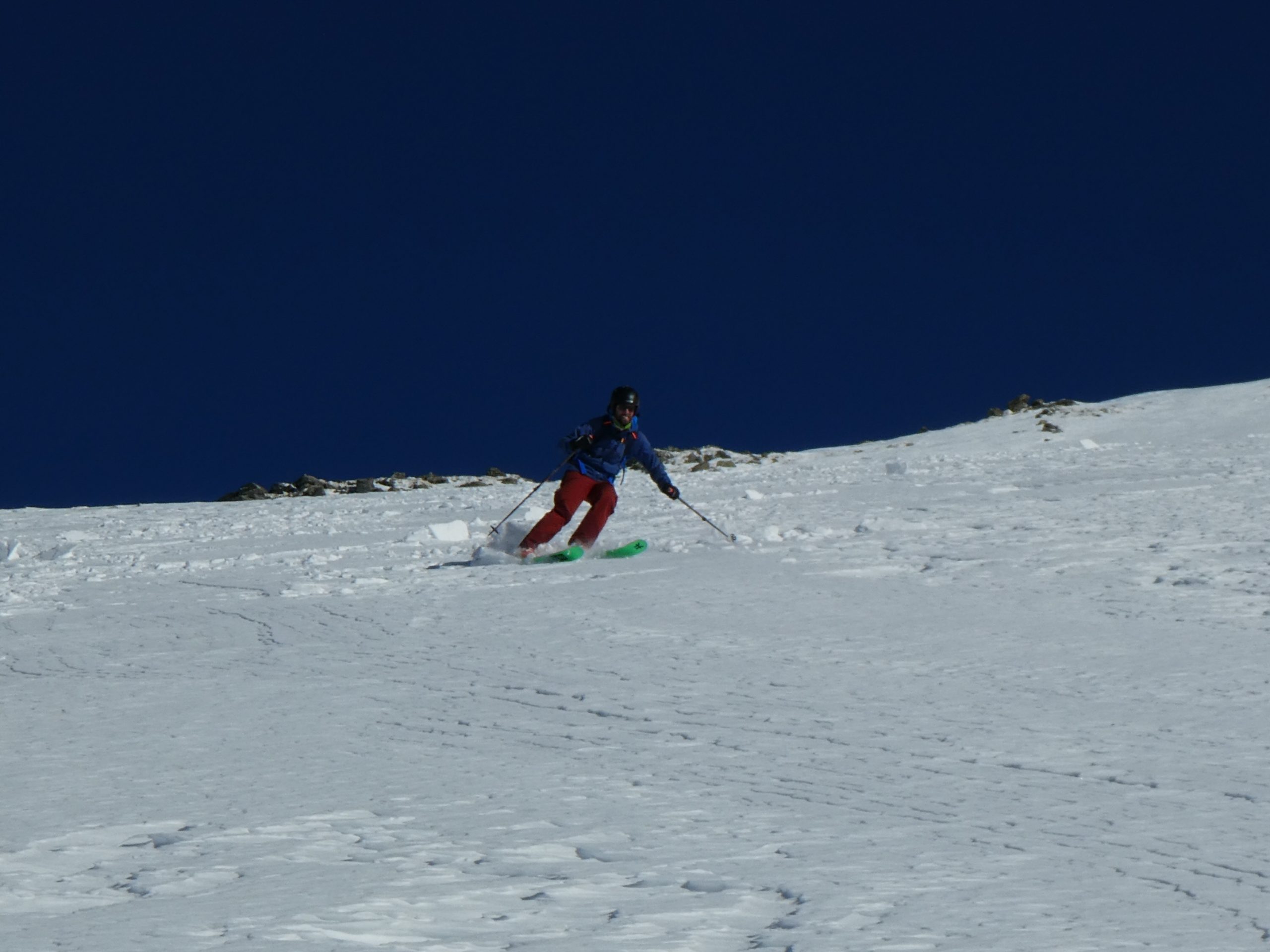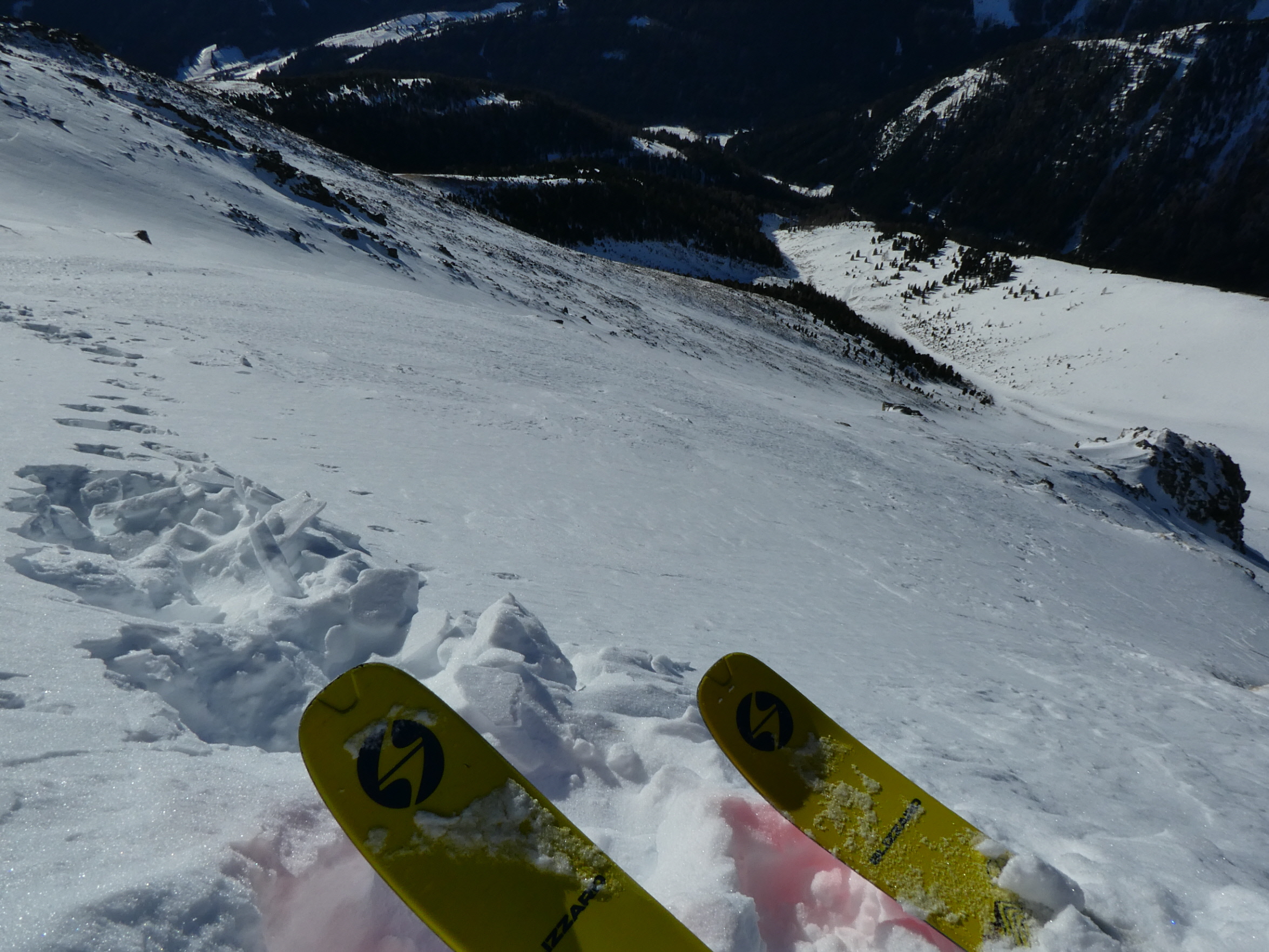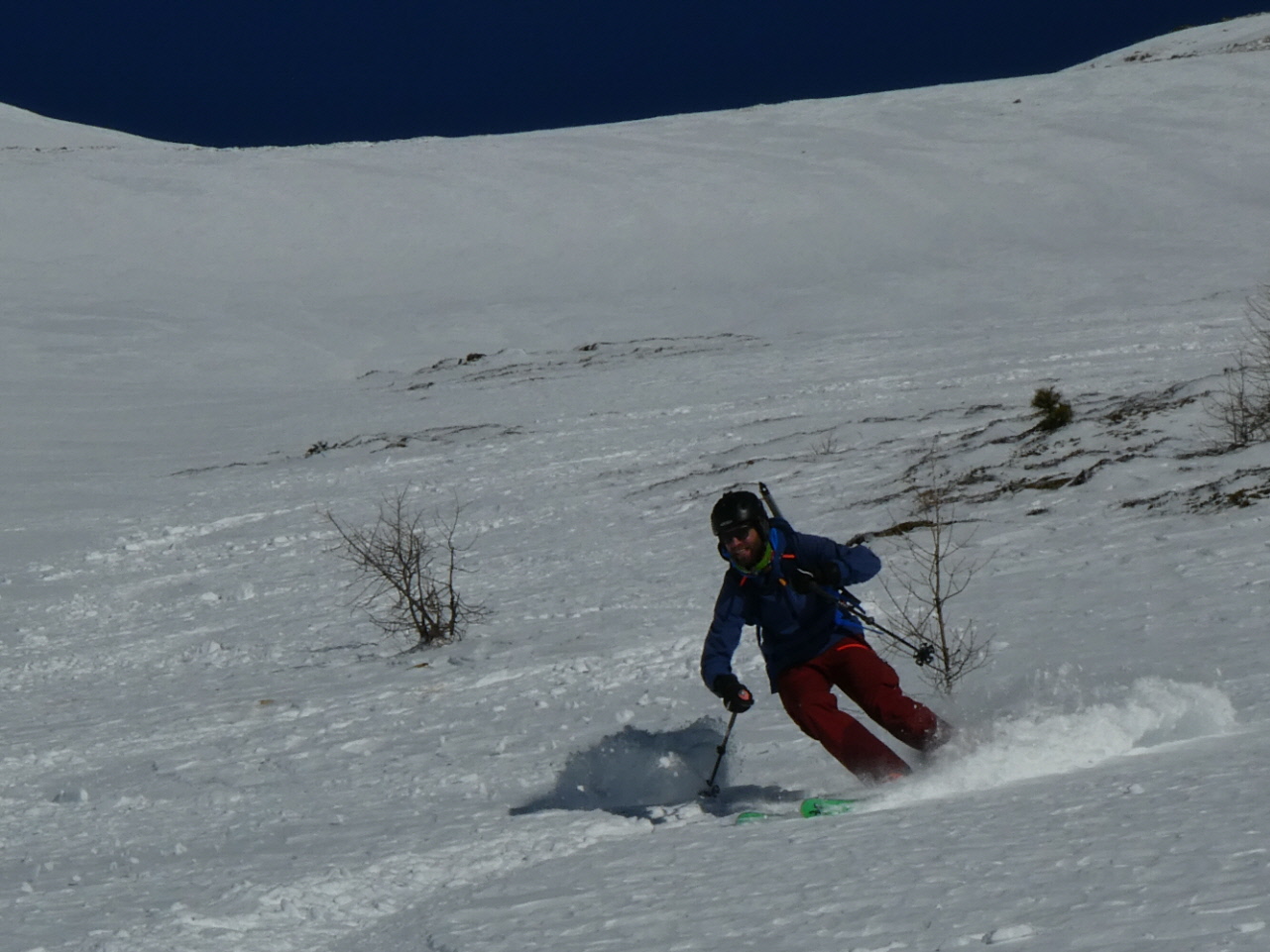 Anfangs auf einem griffigen Harschdeckel, danach meist in leicht plattigem, aber auch sehr gut fahrbarem Pulver sind wir talwärts gecarvt. Jeder der schlussendlich 550 Höhenmeter, die wir in der Falllinie und zuletzt am Rinnenboden fahrend abgebaut haben, war ein Genuss.