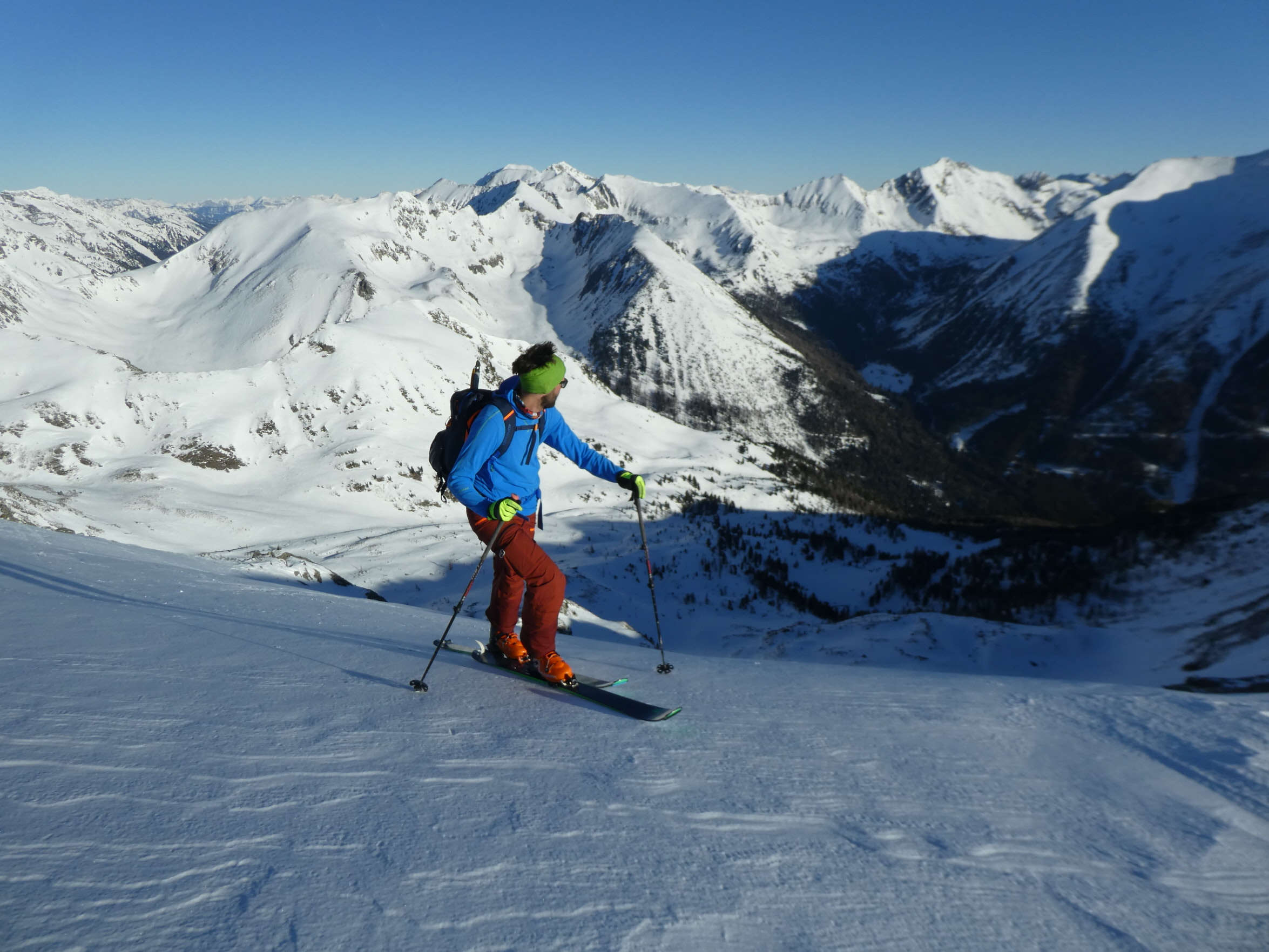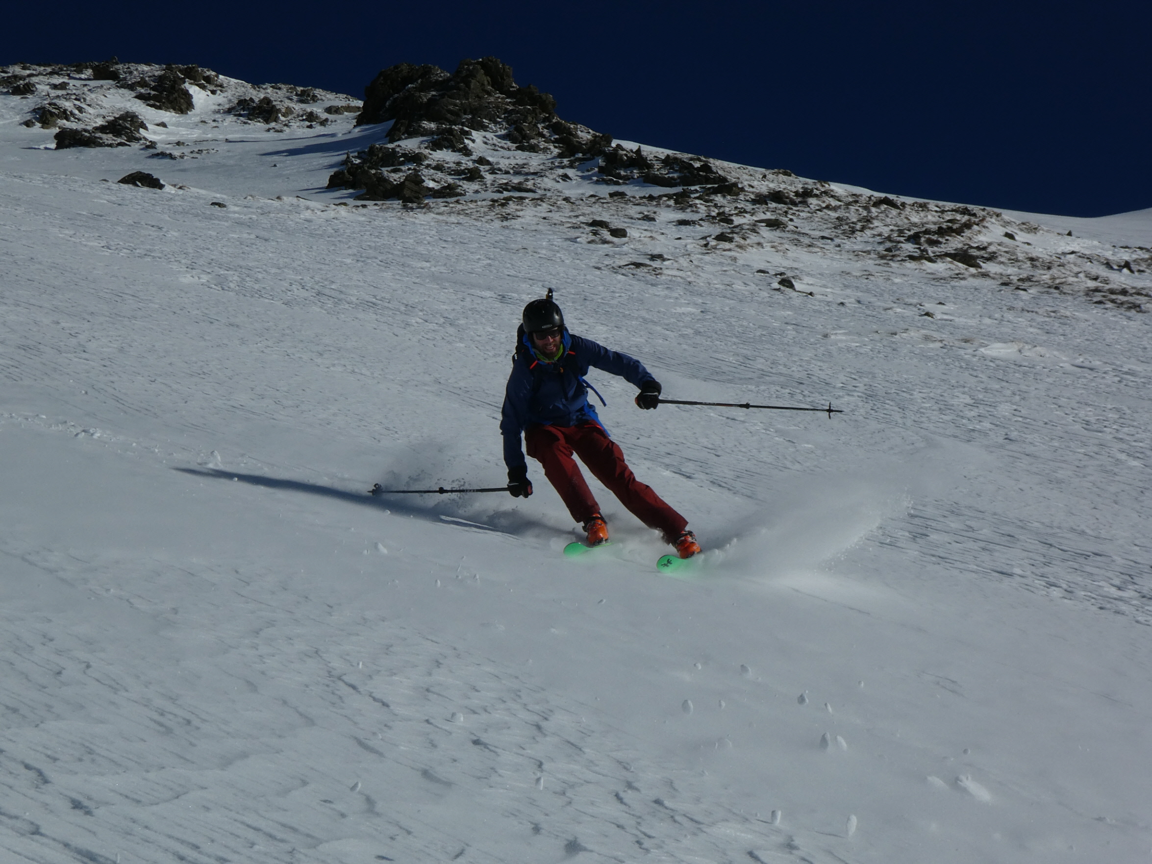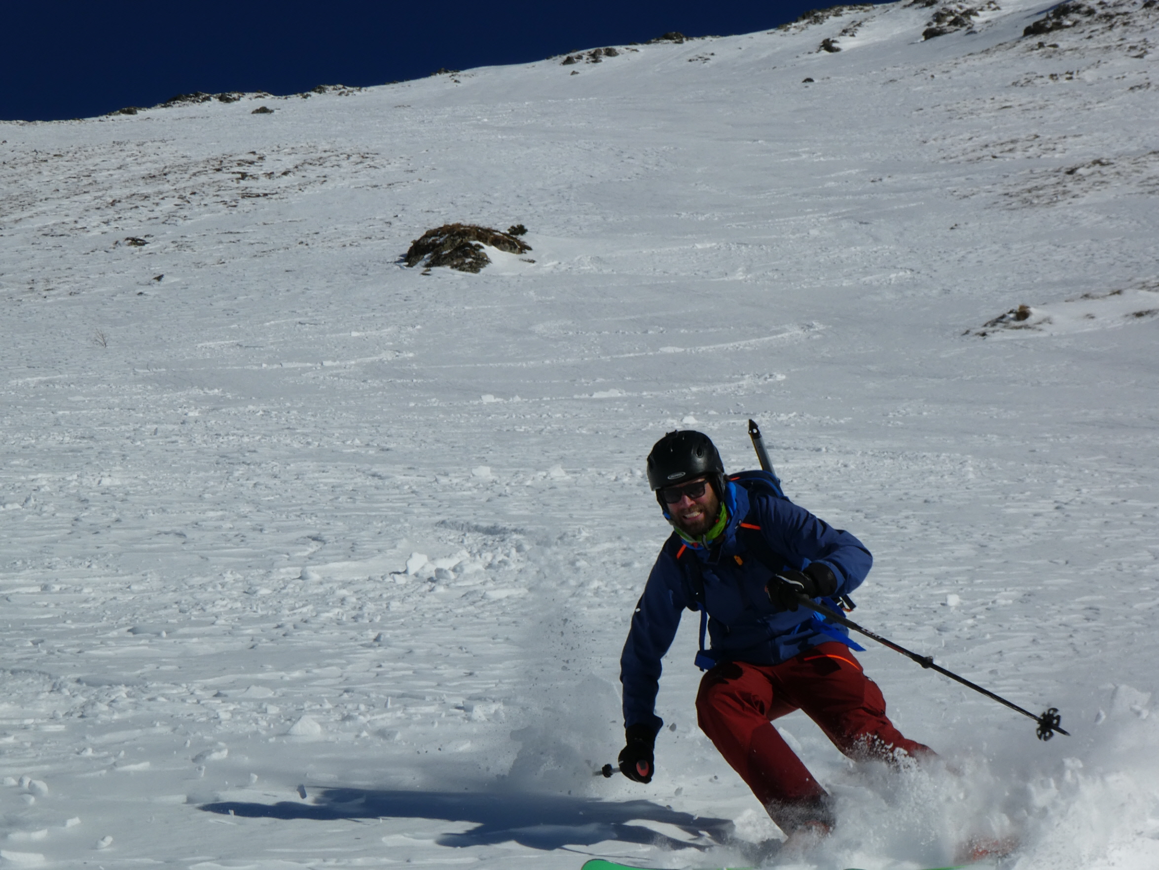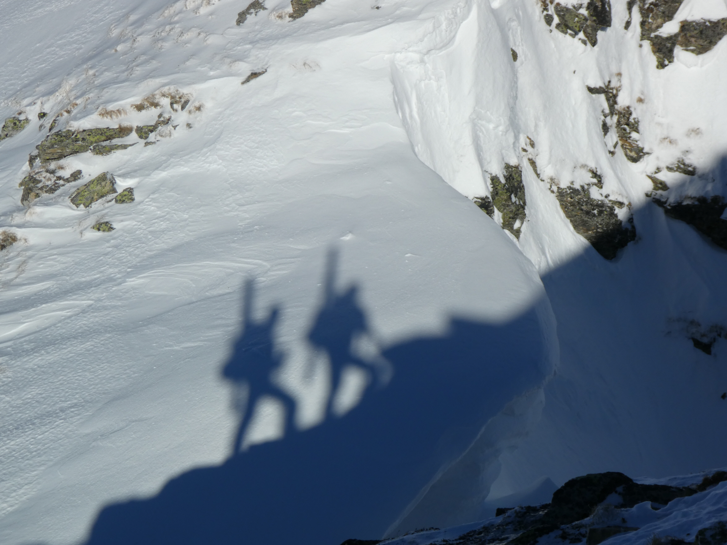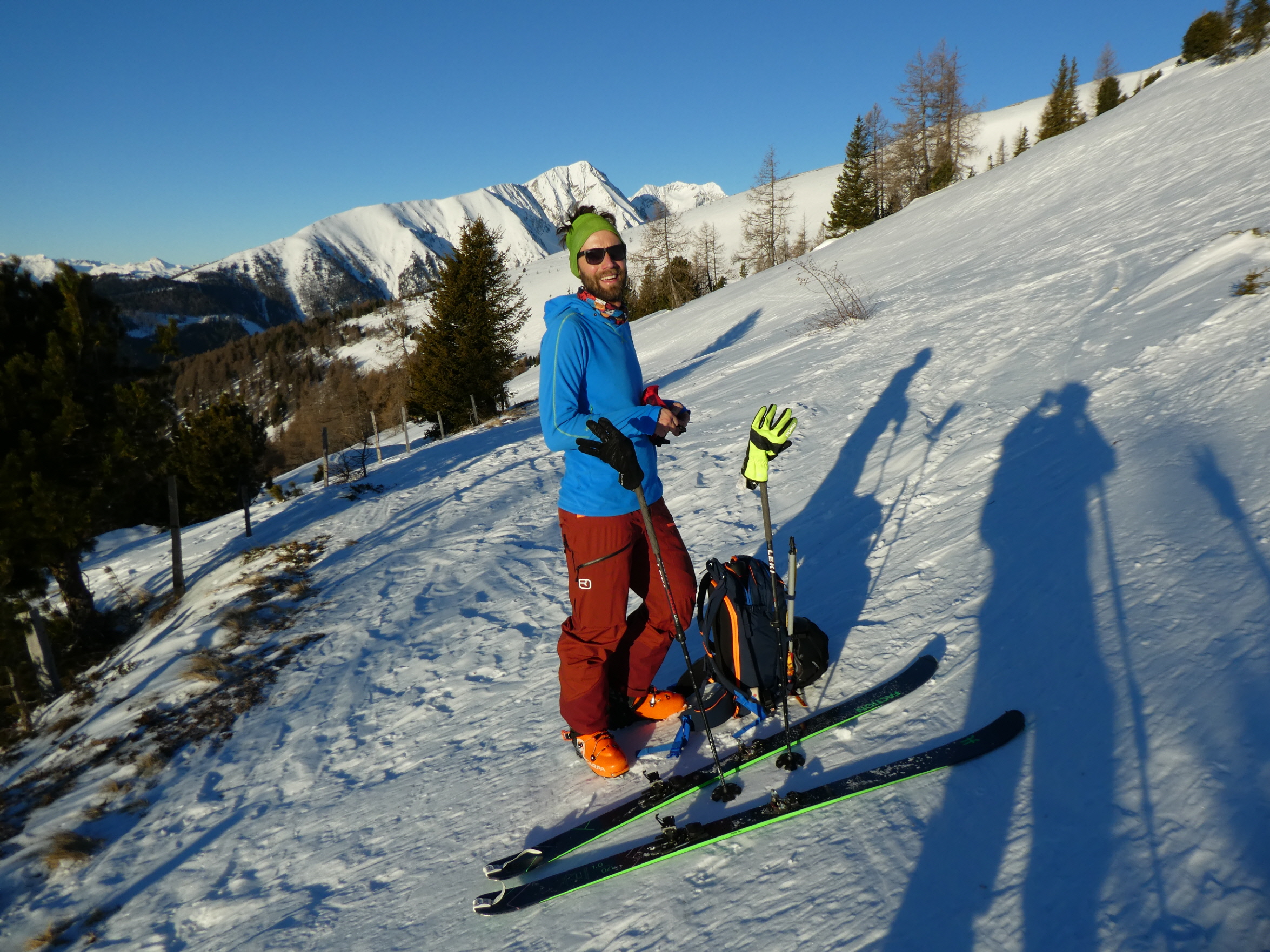 Anfangs auf einem griffigen Harschdeckel, danach meist in leicht plattigem, aber auch sehr gut fahrbarem Pulver sind wir talwärts gecarvt. Jeder der schlussendlich 550 Höhenmeter, die wir in der Falllinie und zuletzt am Rinnenboden fahrend abgebaut haben, war ein Genuss.