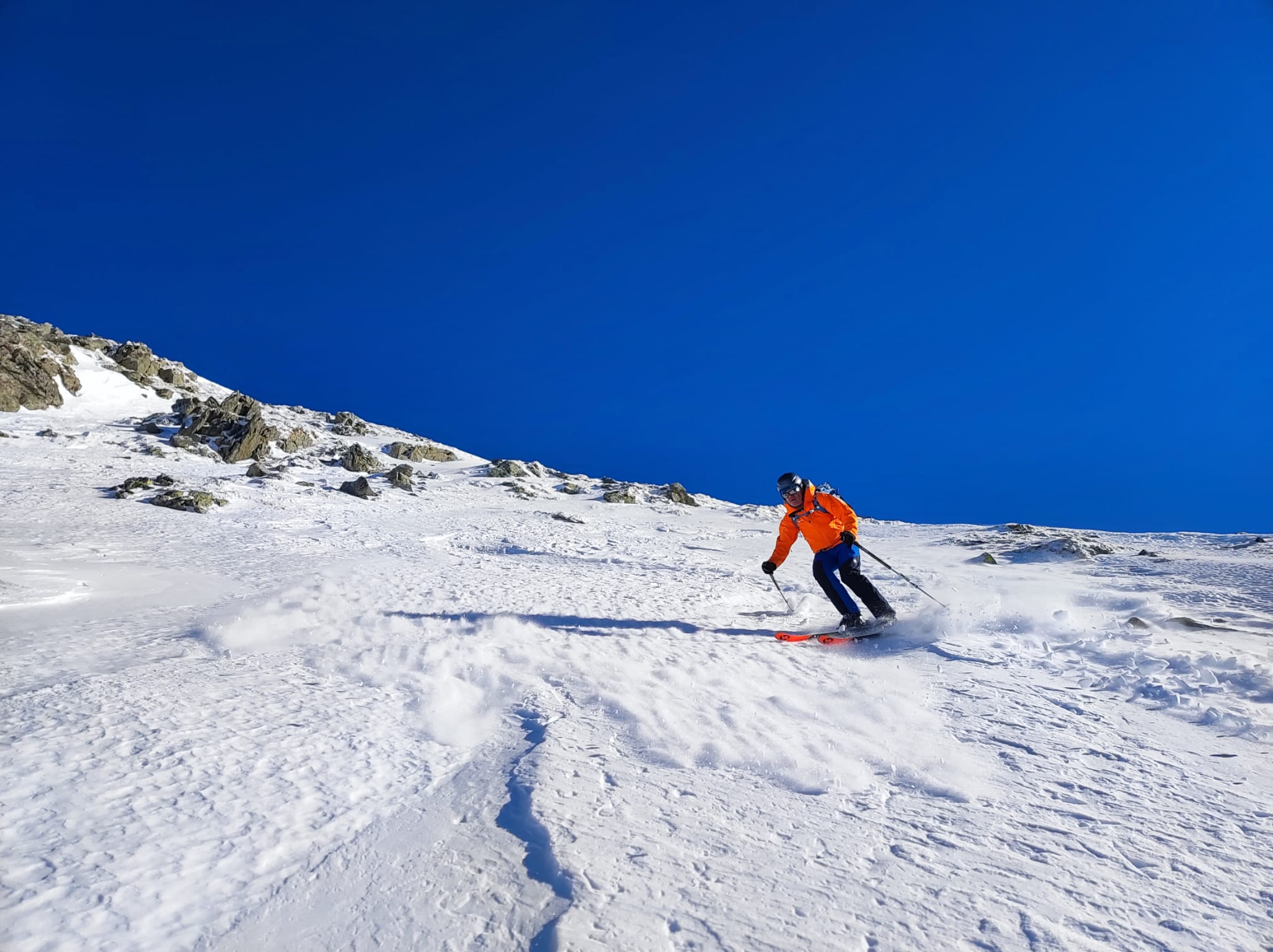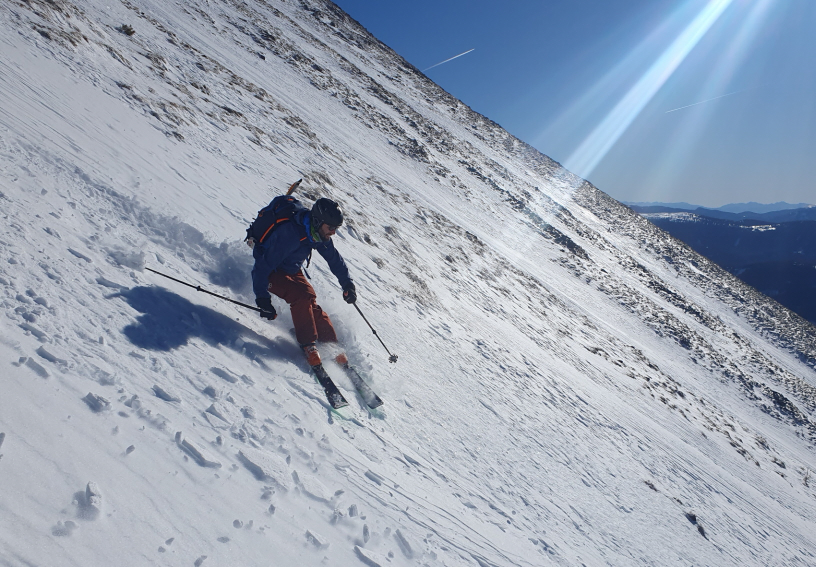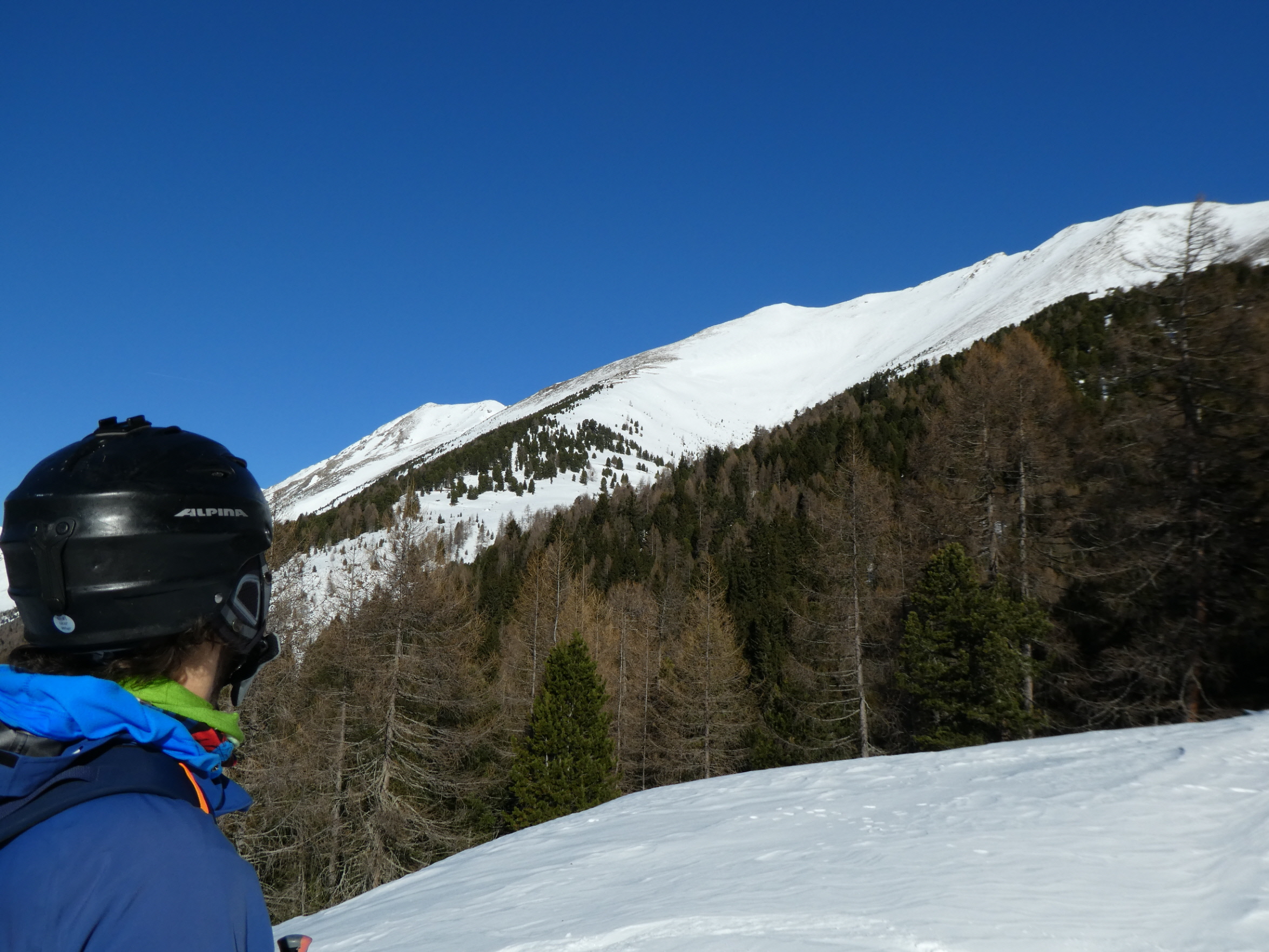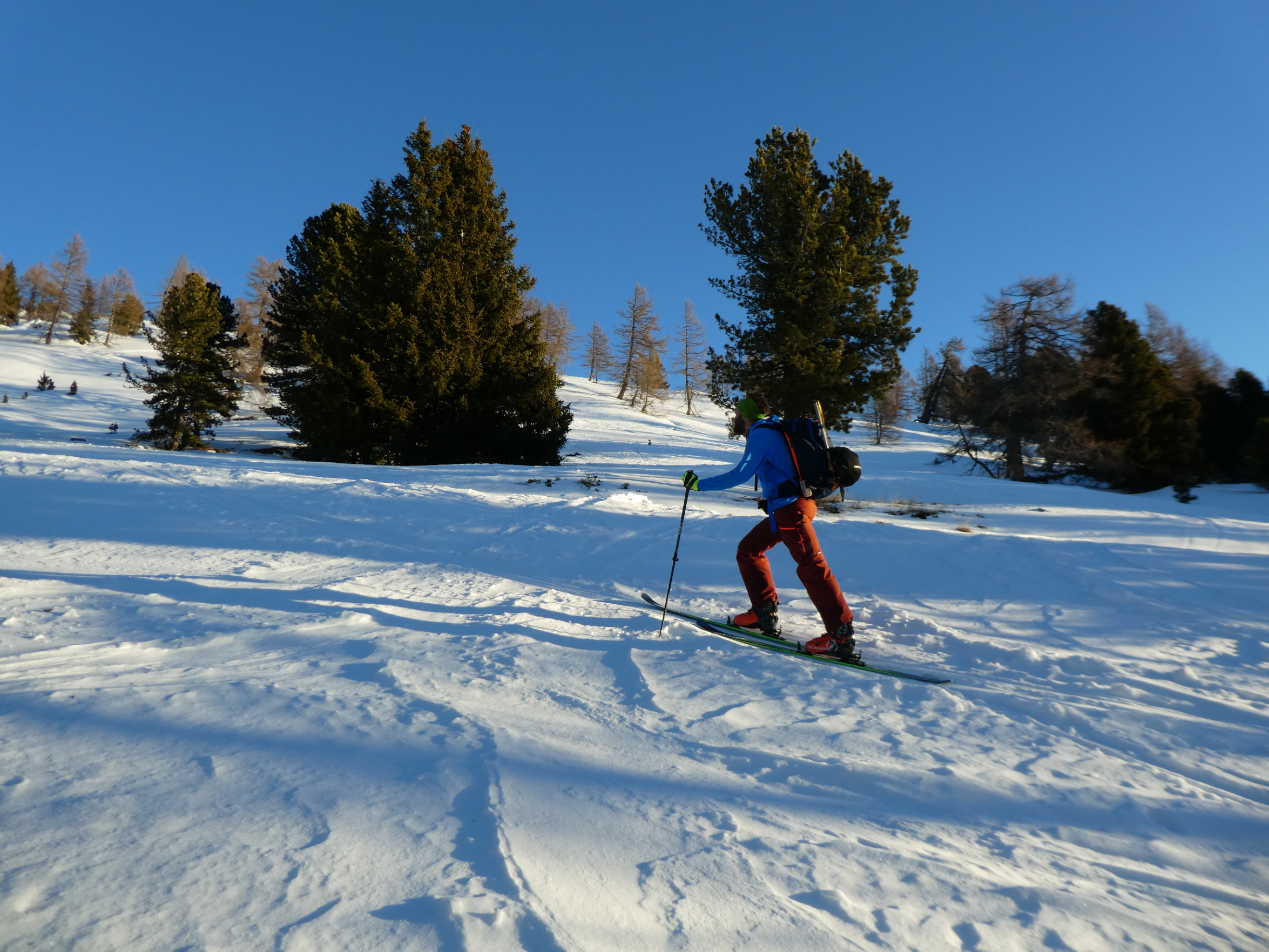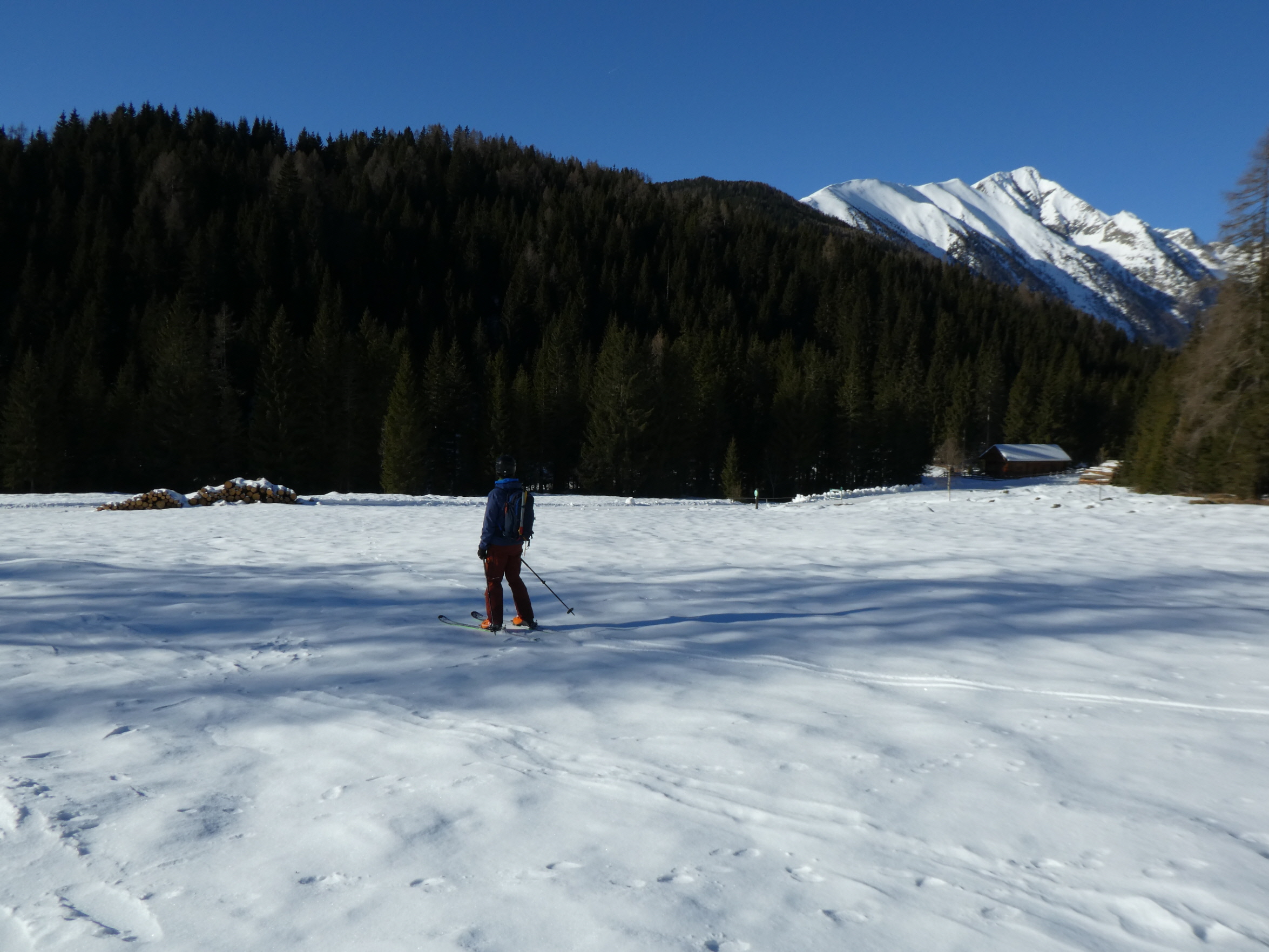 Anfangs auf einem griffigen Harschdeckel, danach meist in leicht plattigem, aber auch sehr gut fahrbarem Pulver sind wir talwärts gecarvt. Jeder der schlussendlich 550 Höhenmeter, die wir in der Falllinie und zuletzt am Rinnenboden fahrend abgebaut haben, war ein Genuss.