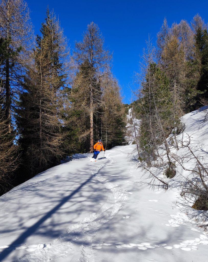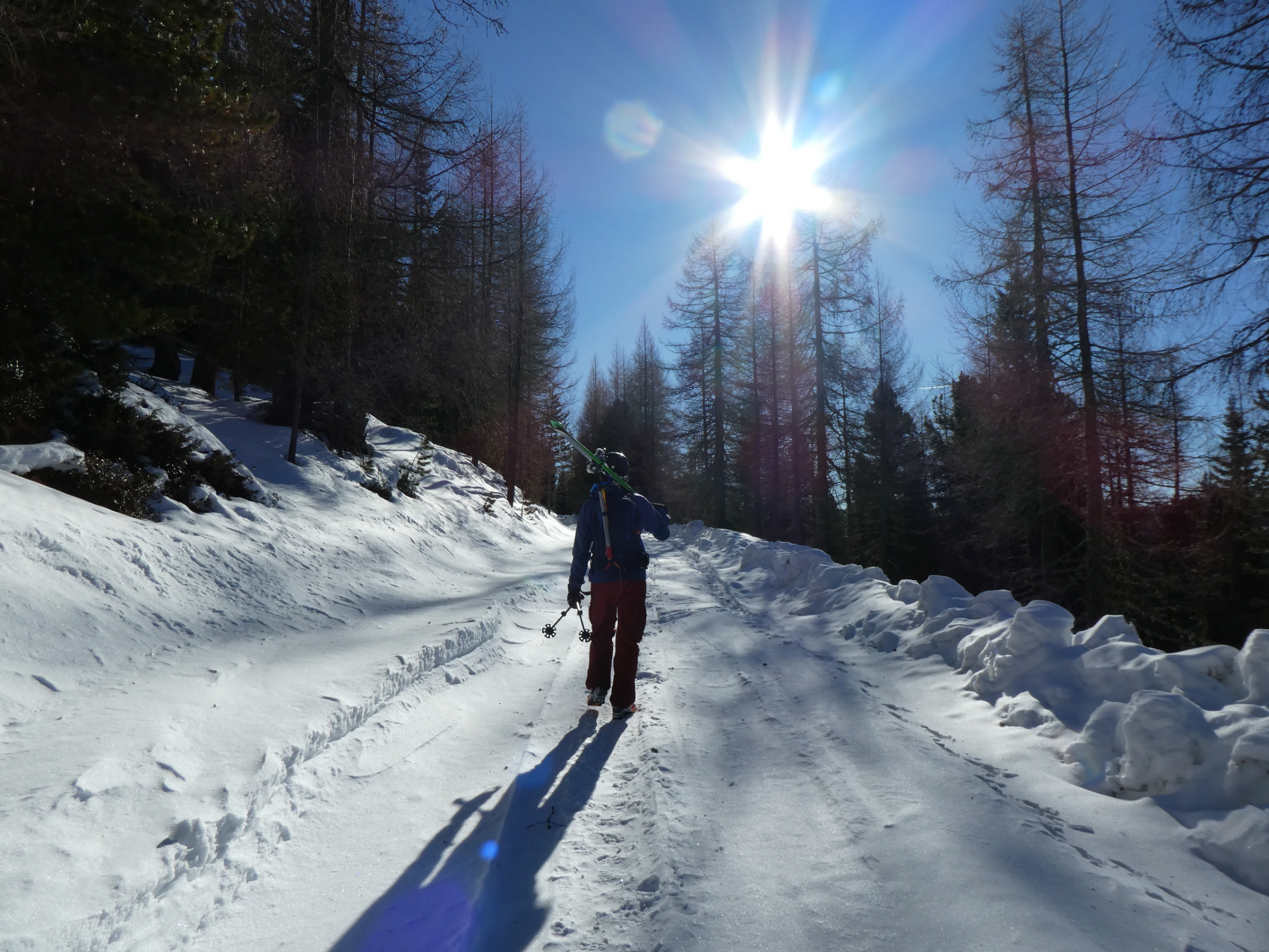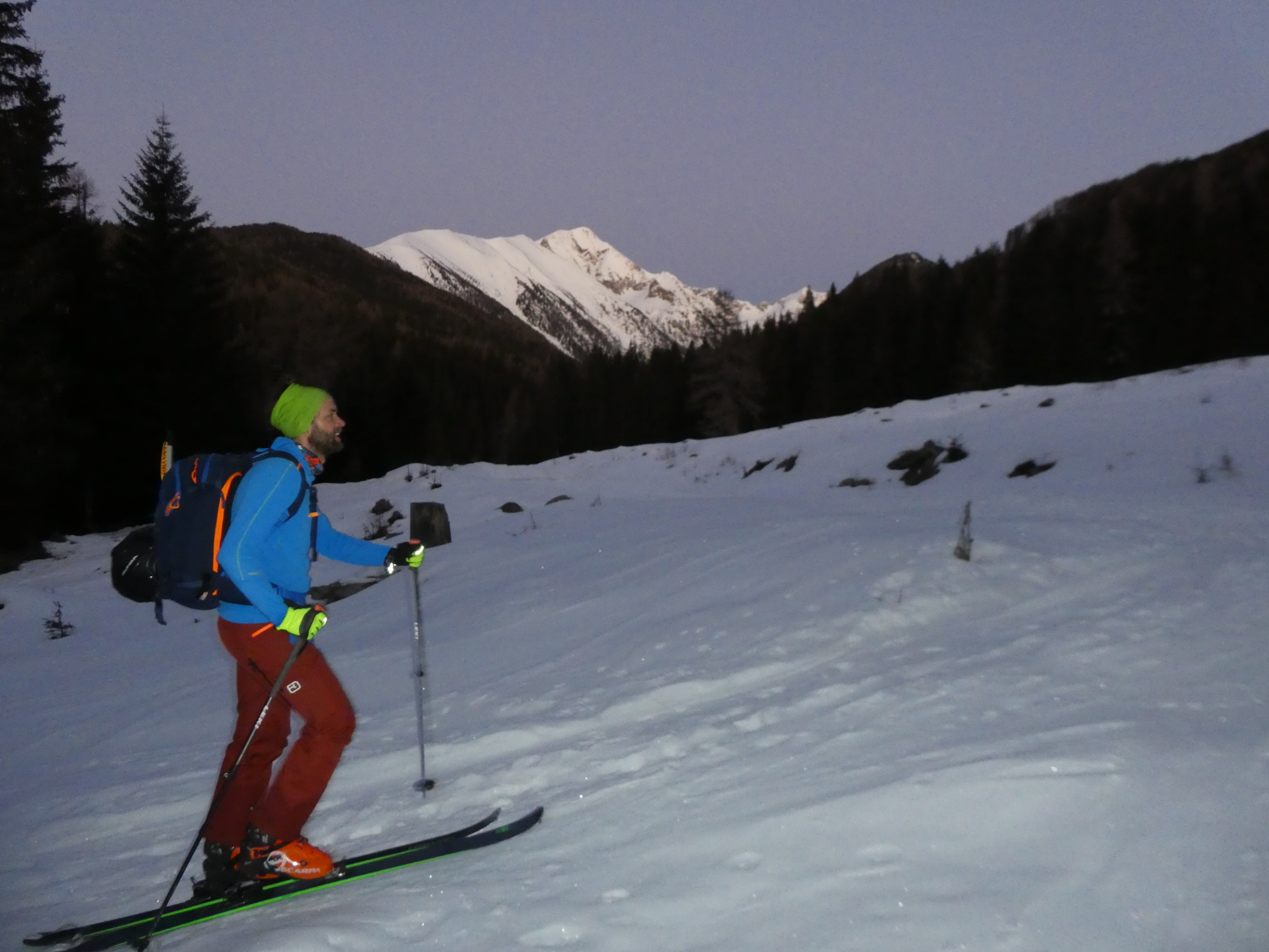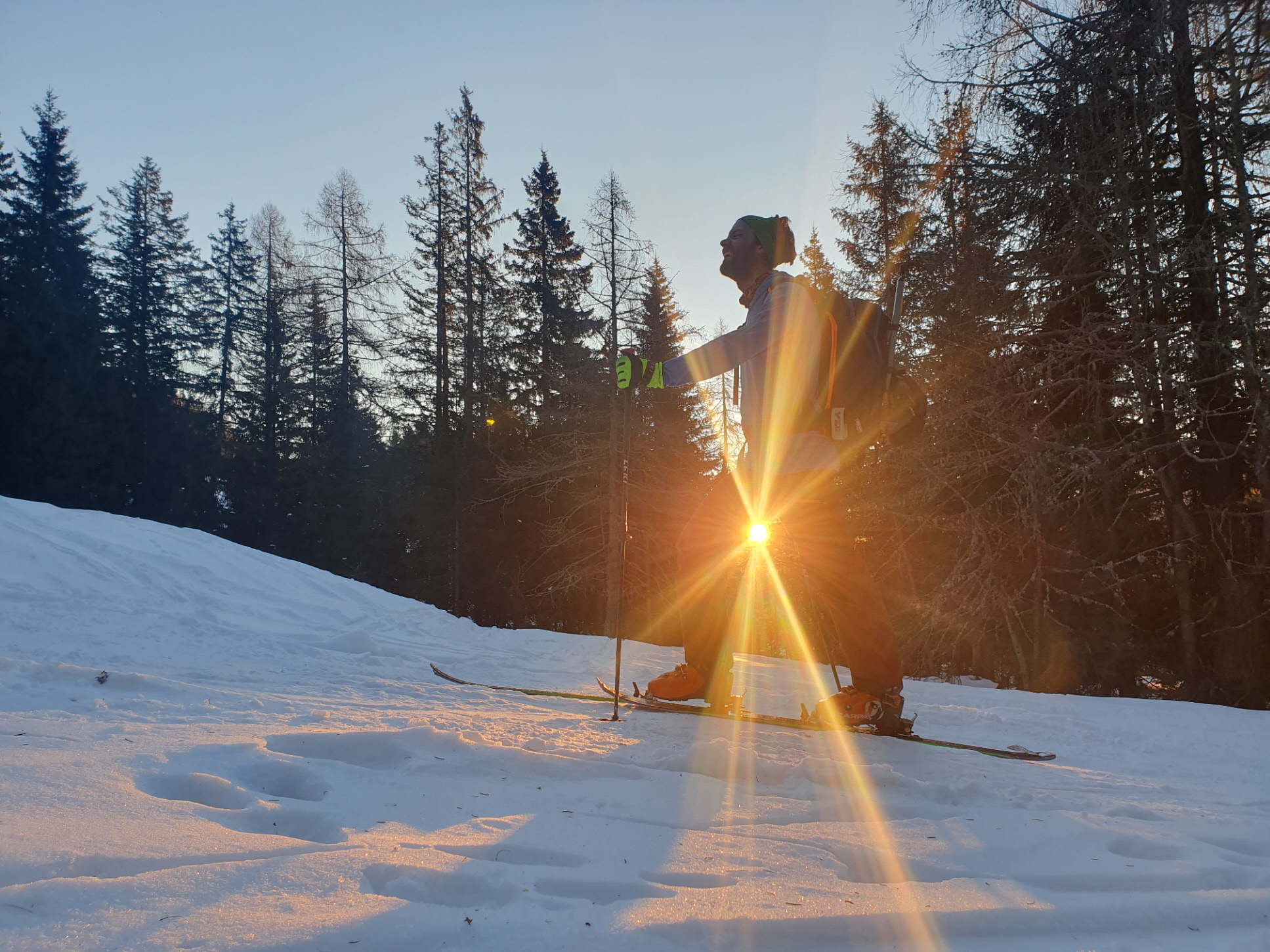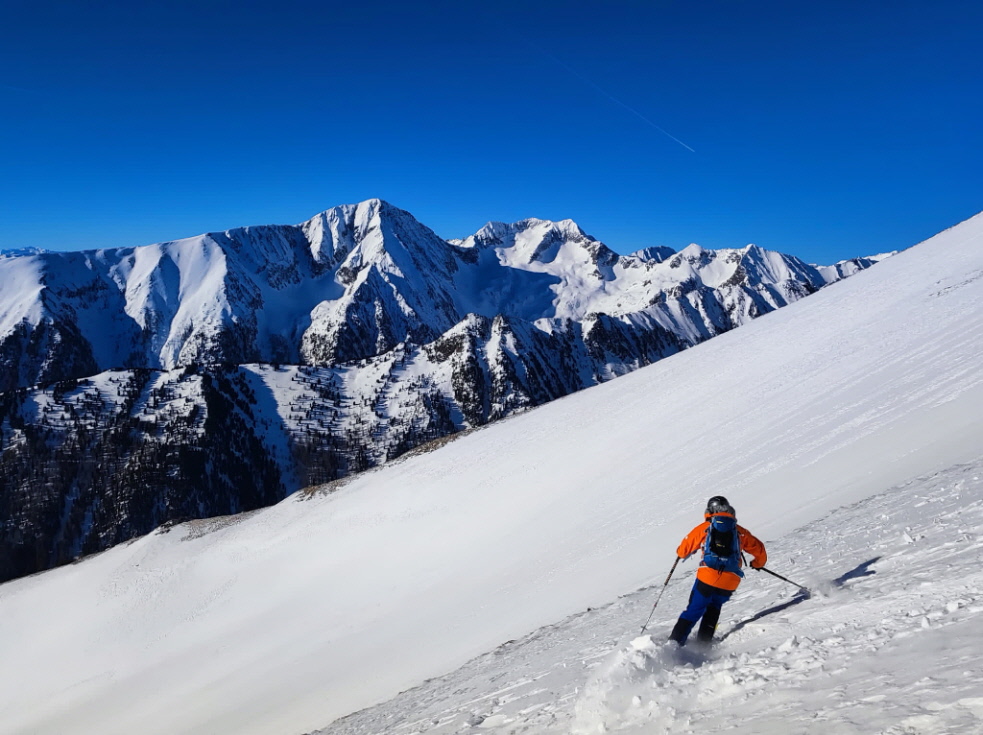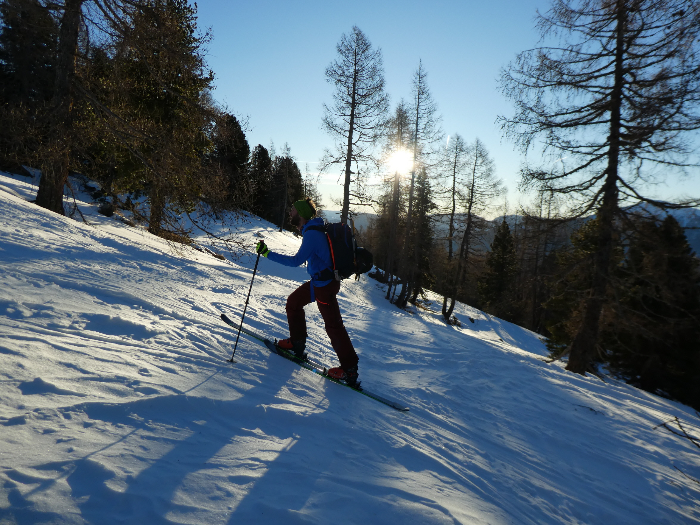 Anfangs auf einem griffigen Harschdeckel, danach meist in leicht plattigem, aber auch sehr gut fahrbarem Pulver sind wir talwärts gecarvt. Jeder der schlussendlich 550 Höhenmeter, die wir in der Falllinie und zuletzt am Rinnenboden fahrend abgebaut haben, war ein Genuss.