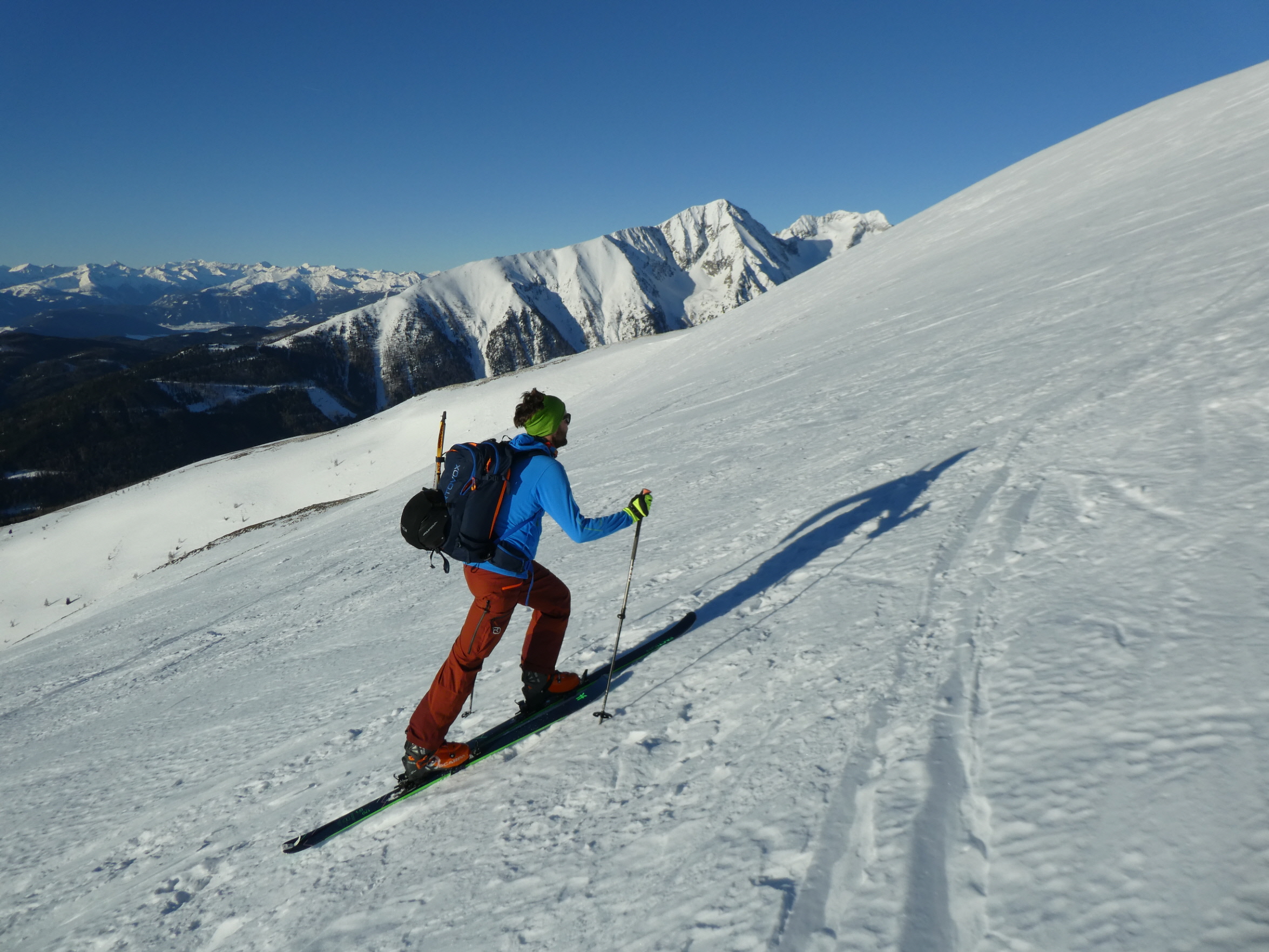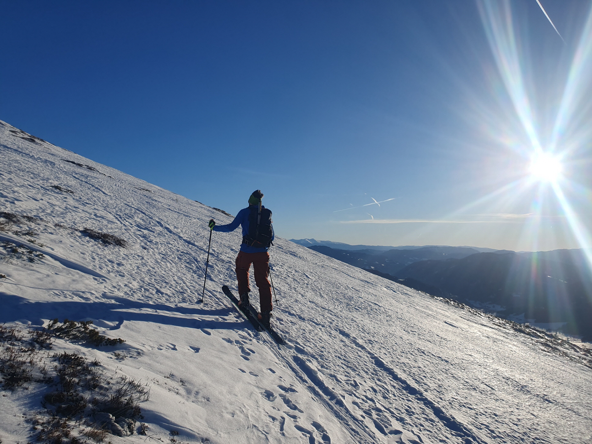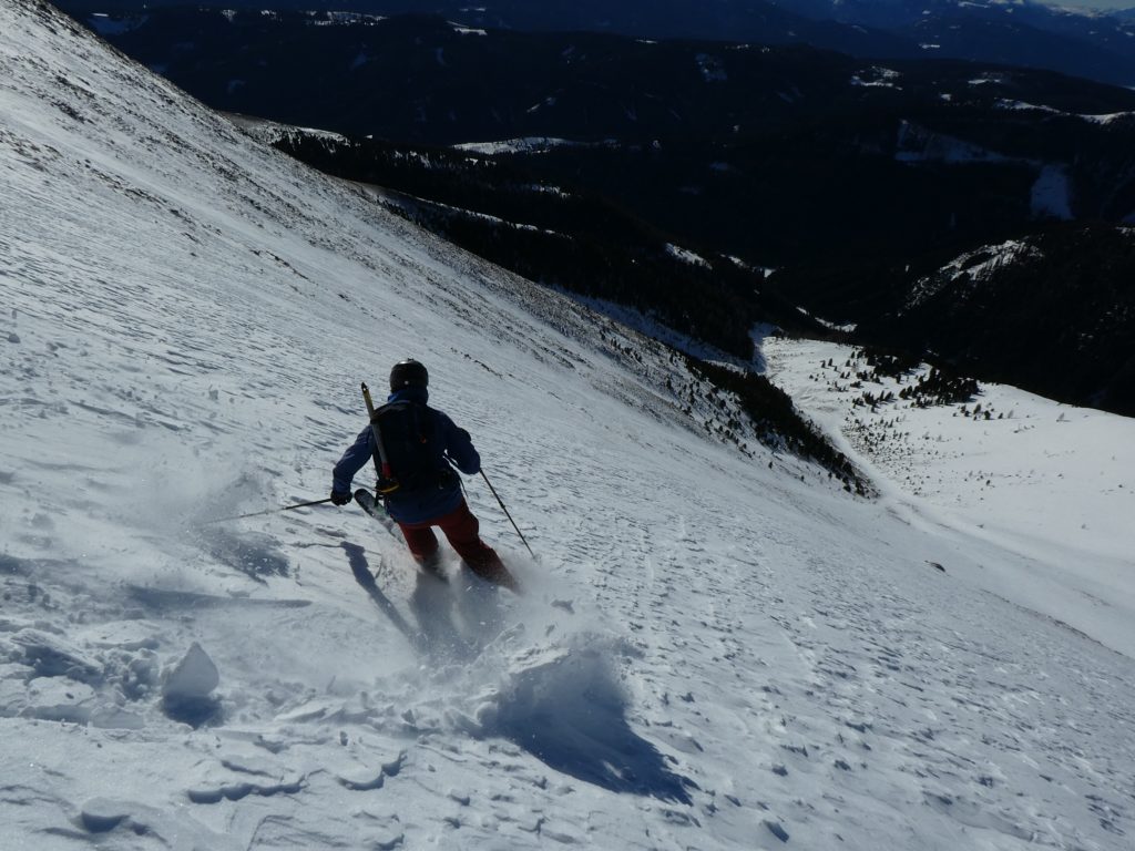 Am Weg gab es dann eine dicke Pulverschneeschicht, in der wir lustvoll unsere Spuren hinterlassen haben. Bei der Höflhütte haben wir noch einmal kurz gestoppt und an diesem herrlichen Aussichtspunkt sowohl zurück in Richtung Gipfel als auch auf den gegenüber stehenden Preber geschaut.
