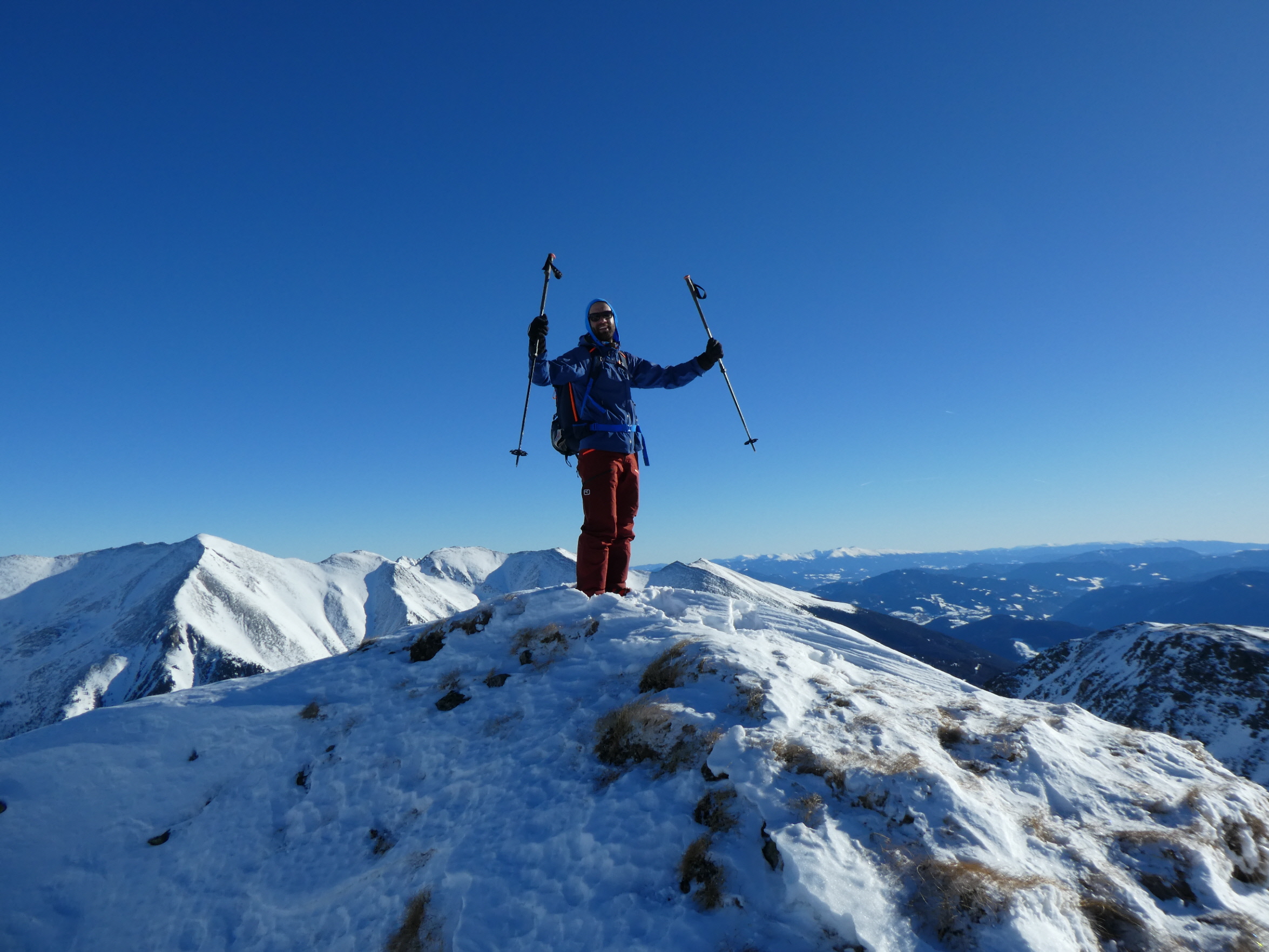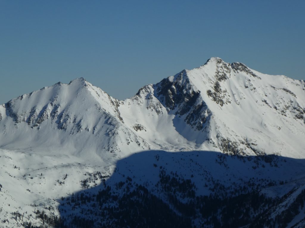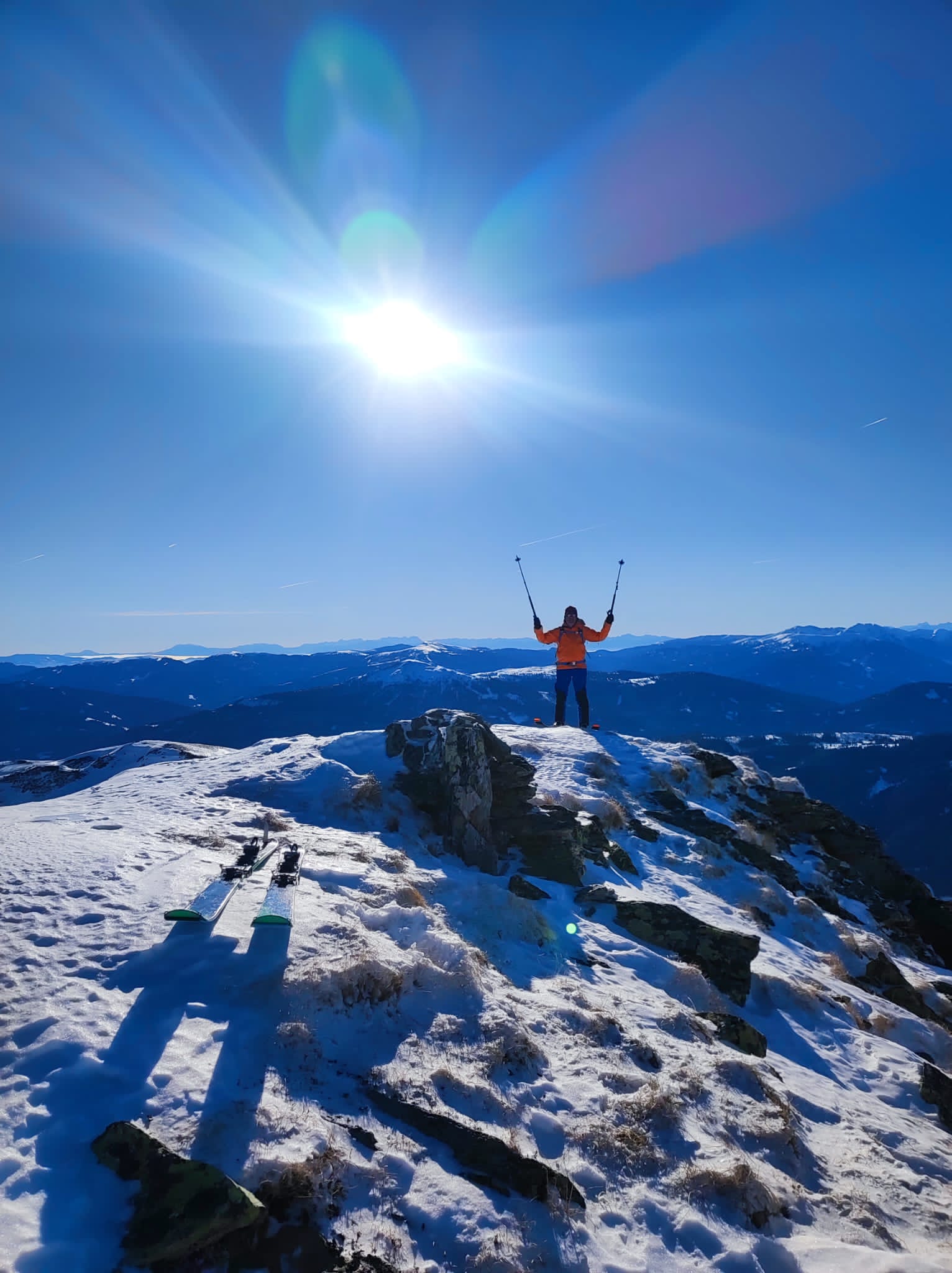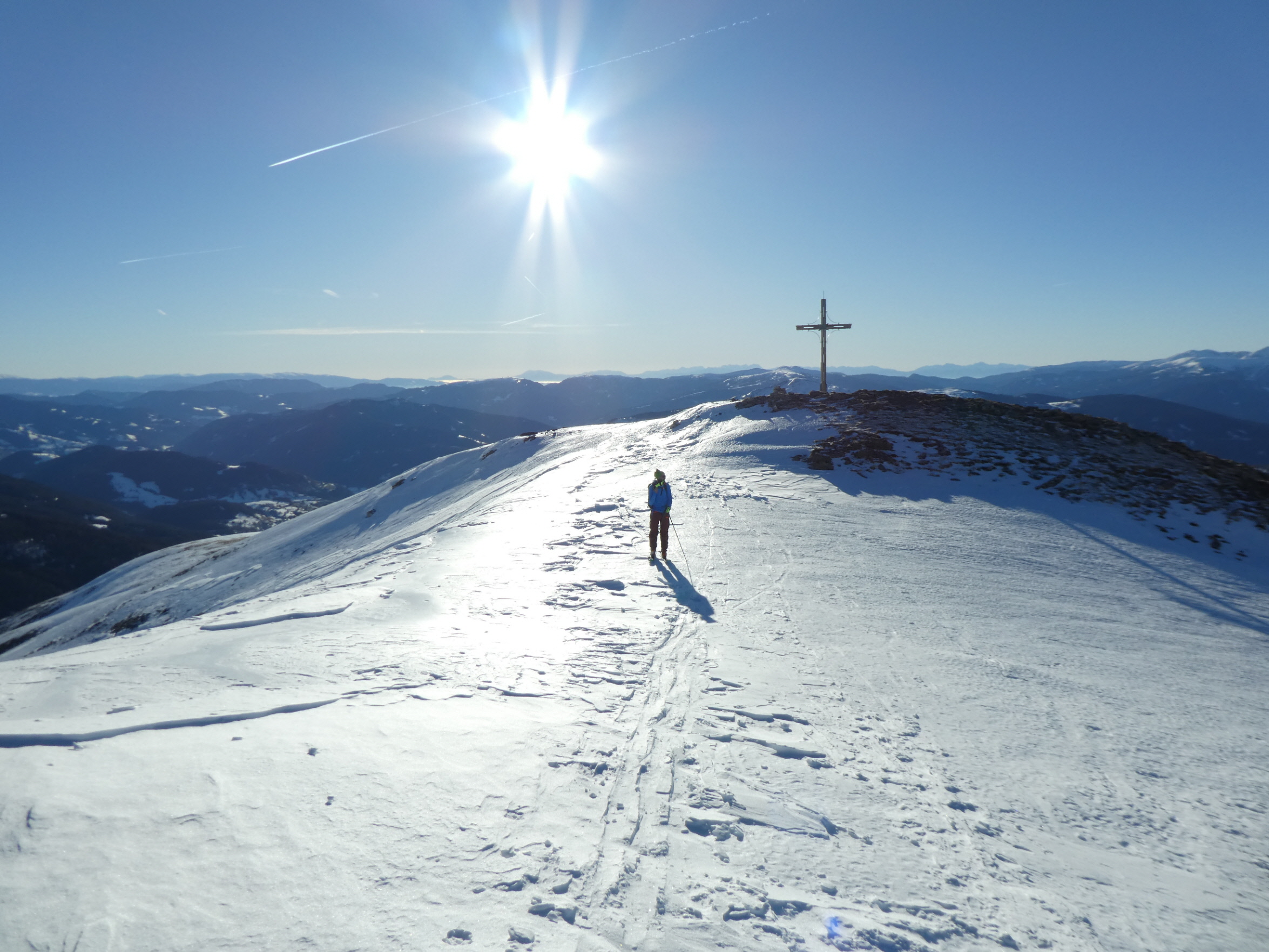Am Weg gab es dann eine dicke Pulverschneeschicht, in der wir lustvoll unsere Spuren hinterlassen haben. Bei der Höflhütte haben wir noch einmal kurz gestoppt und an diesem herrlichen Aussichtspunkt sowohl zurück in Richtung Gipfel als auch auf den gegenüber stehenden Preber geschaut.