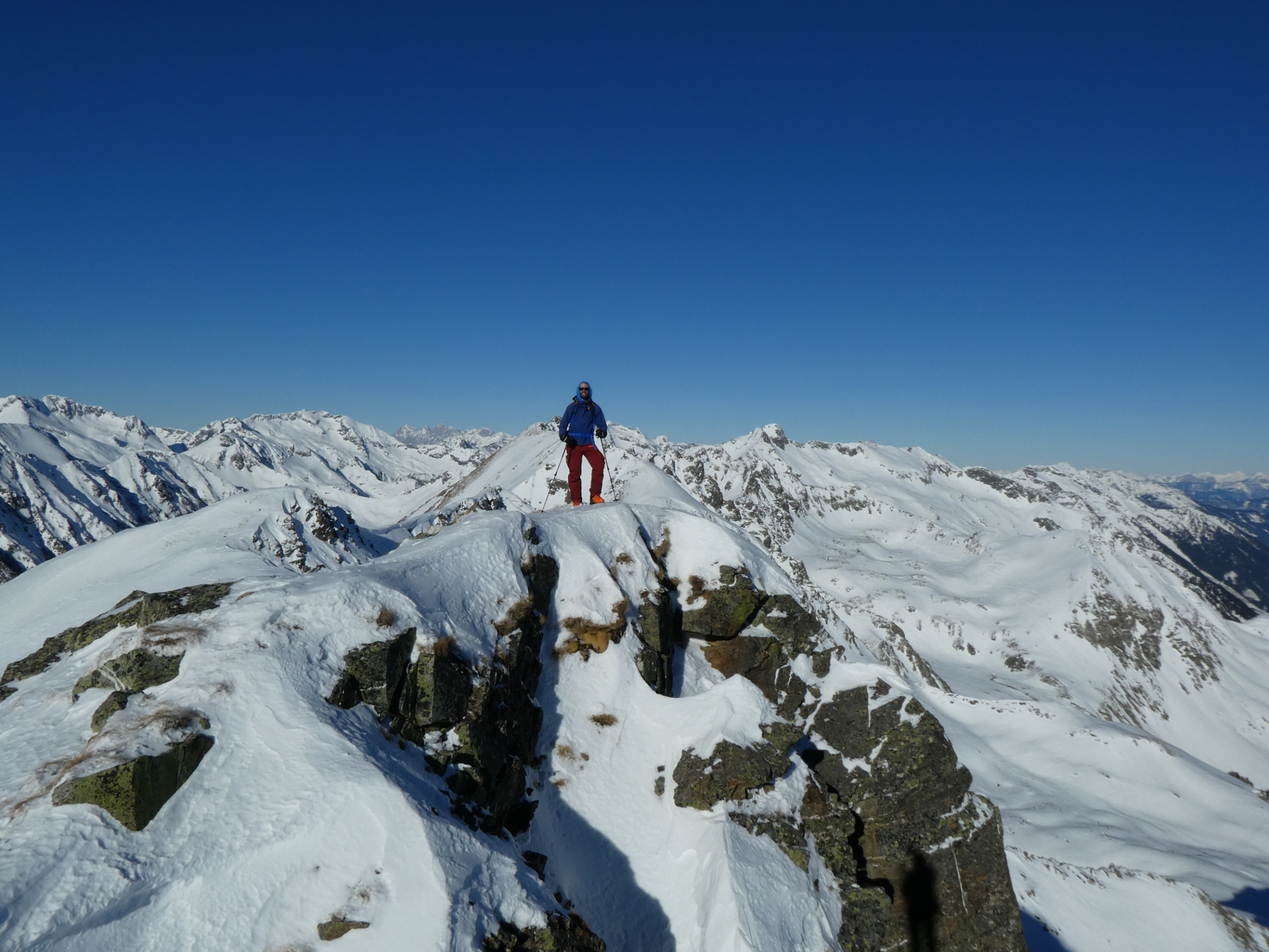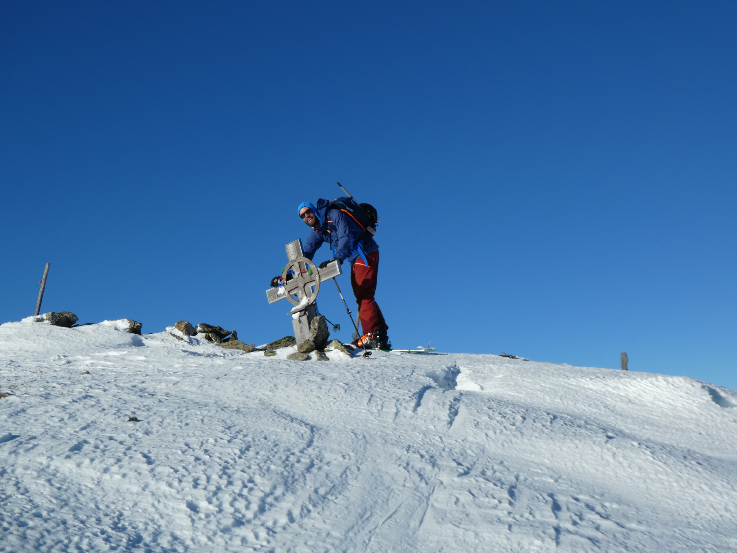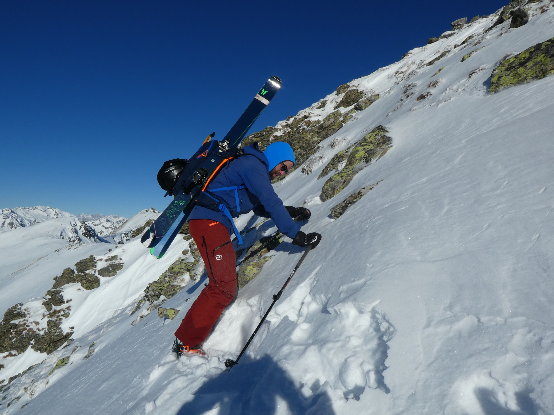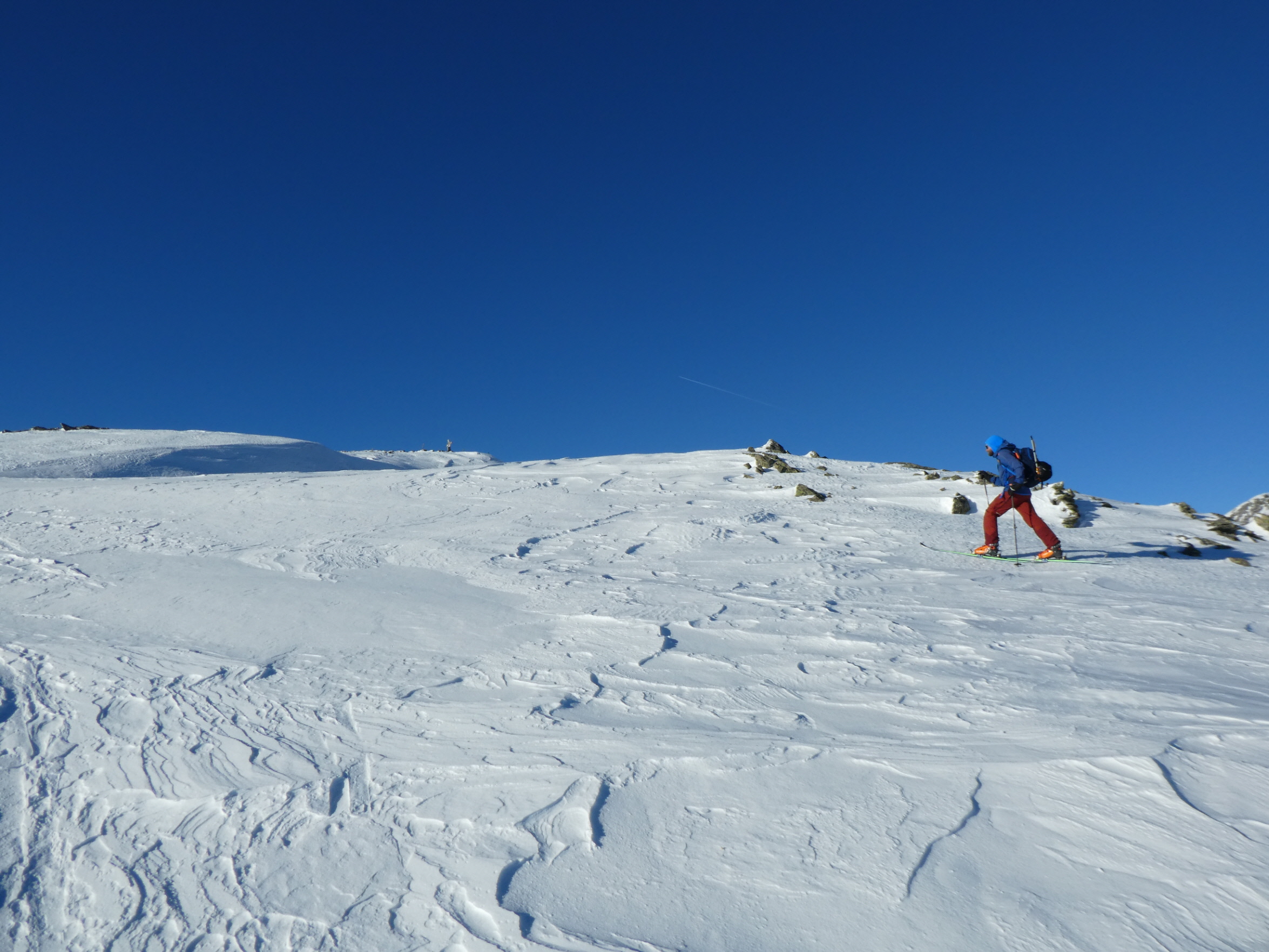 Die hat sich bei der derzeitigen Schneelage nicht aufgetan. Daher sind wir weiter zur Karlhöhe angestiegen. Auf Skiern ging es bis zum Gipfel. Für den nordseitigen Abstieg hinunter in die Scharte zwischen Karlhöhe und Hemmerfeldeck haben wir sie danach auf die Rucksäcke gepackt. Dort sind sie für das kurze Stück weiter hinauf zum letzten und höchsten Tagesziel auch geblieben.