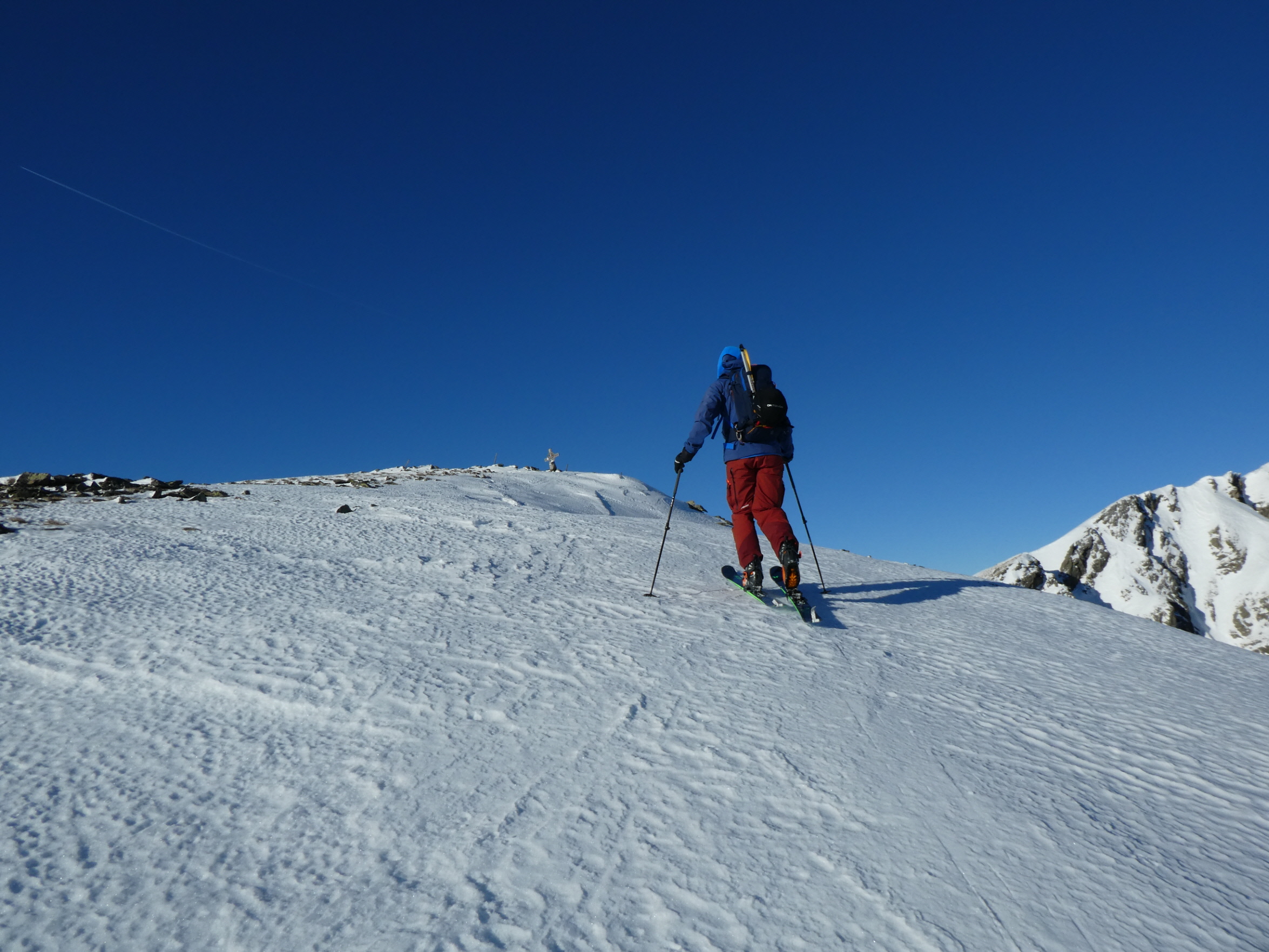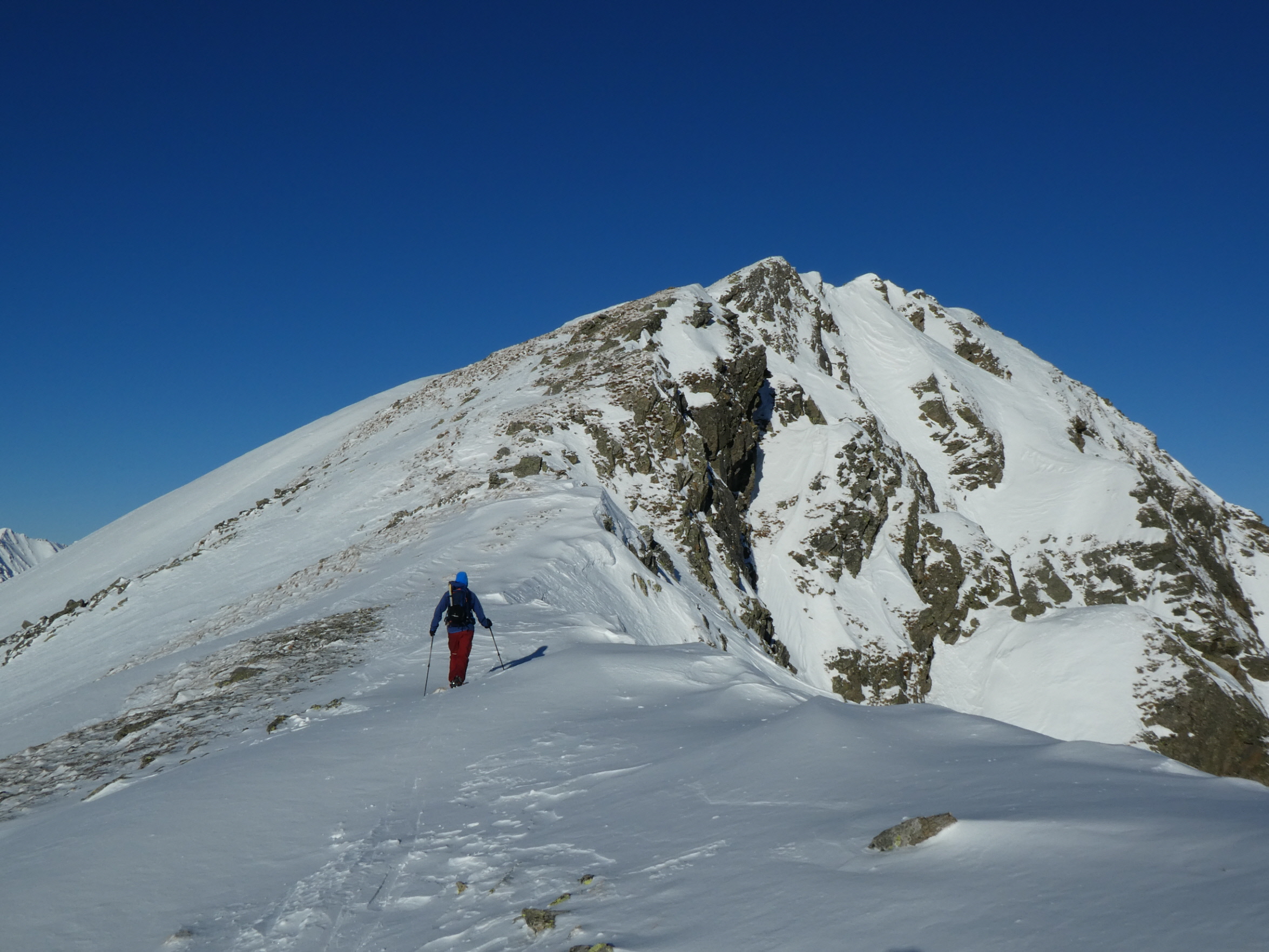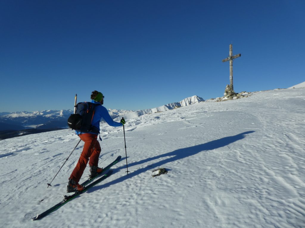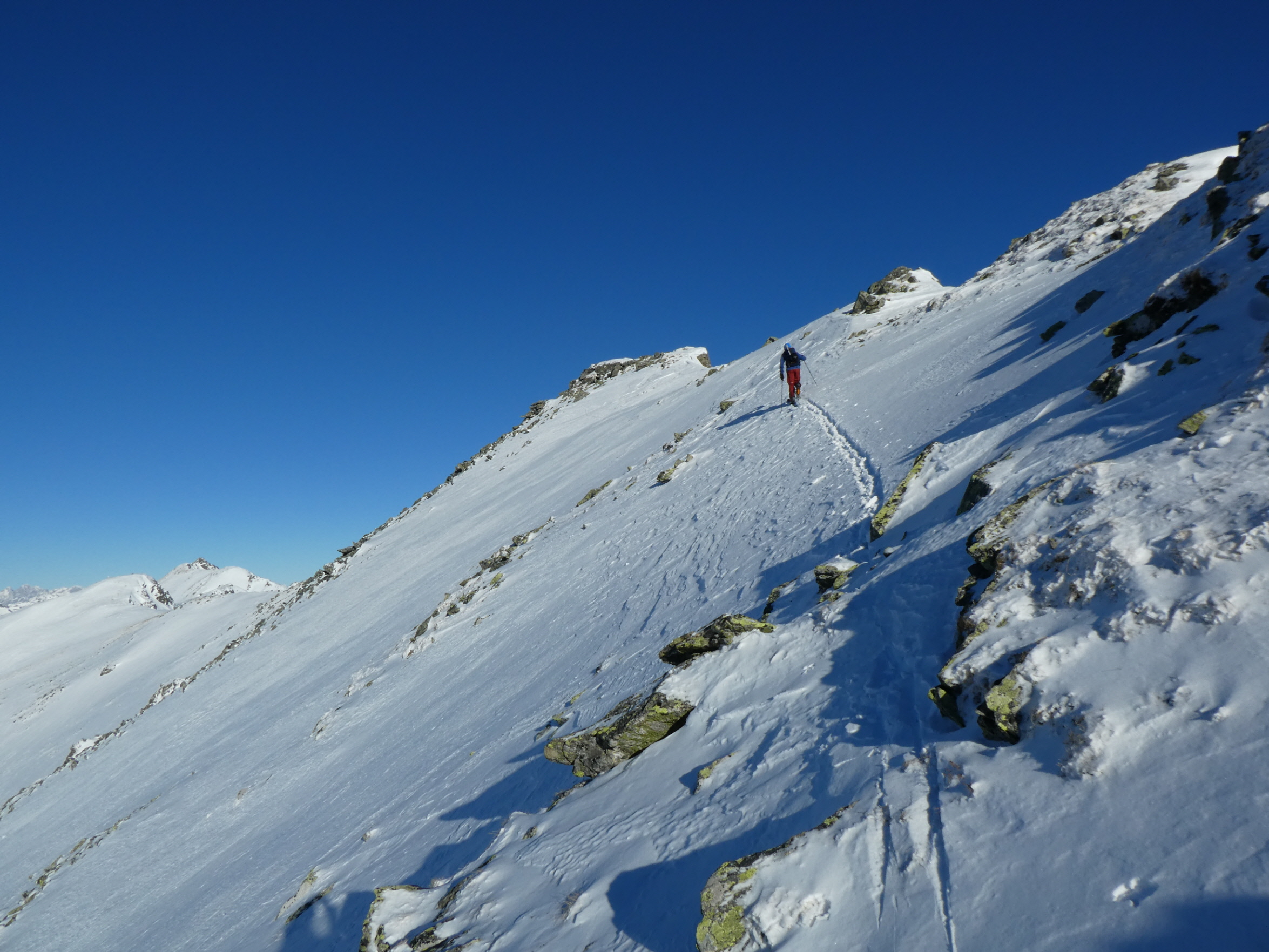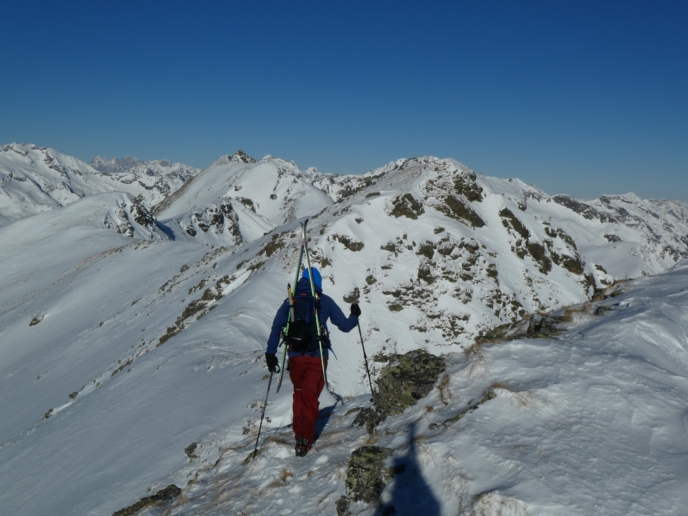 Die hat sich bei der derzeitigen Schneelage nicht aufgetan. Daher sind wir weiter zur Karlhöhe angestiegen. Auf Skiern ging es bis zum Gipfel. Für den nordseitigen Abstieg hinunter in die Scharte zwischen Karlhöhe und Hemmerfeldeck haben wir sie danach auf die Rucksäcke gepackt. Dort sind sie für das kurze Stück weiter hinauf zum letzten und höchsten Tagesziel auch geblieben.