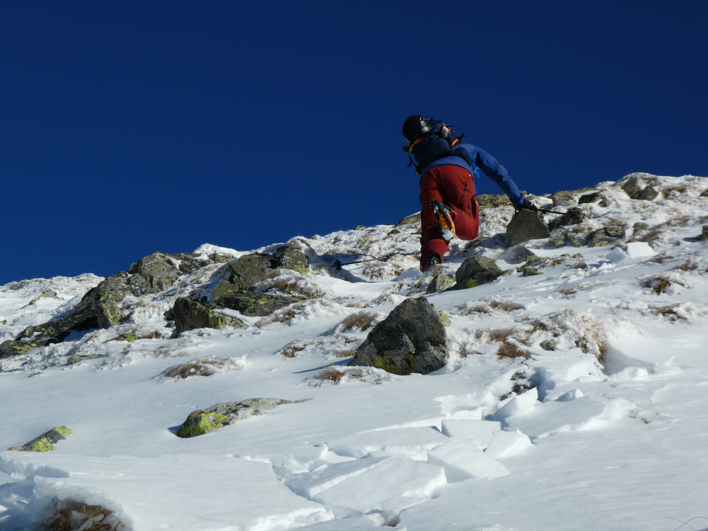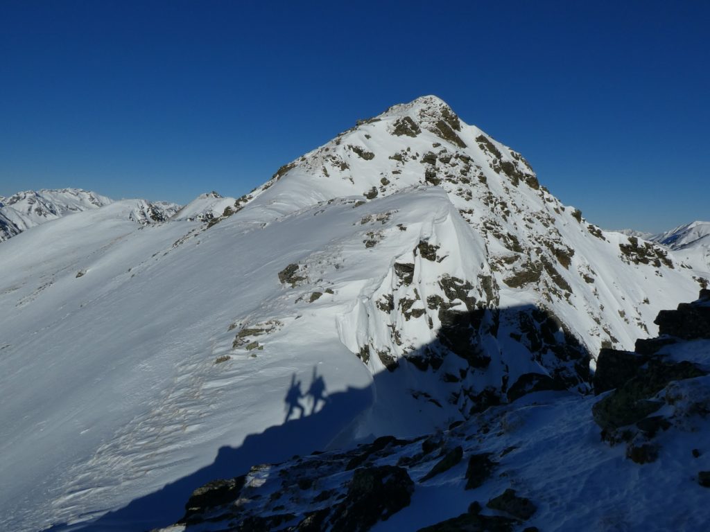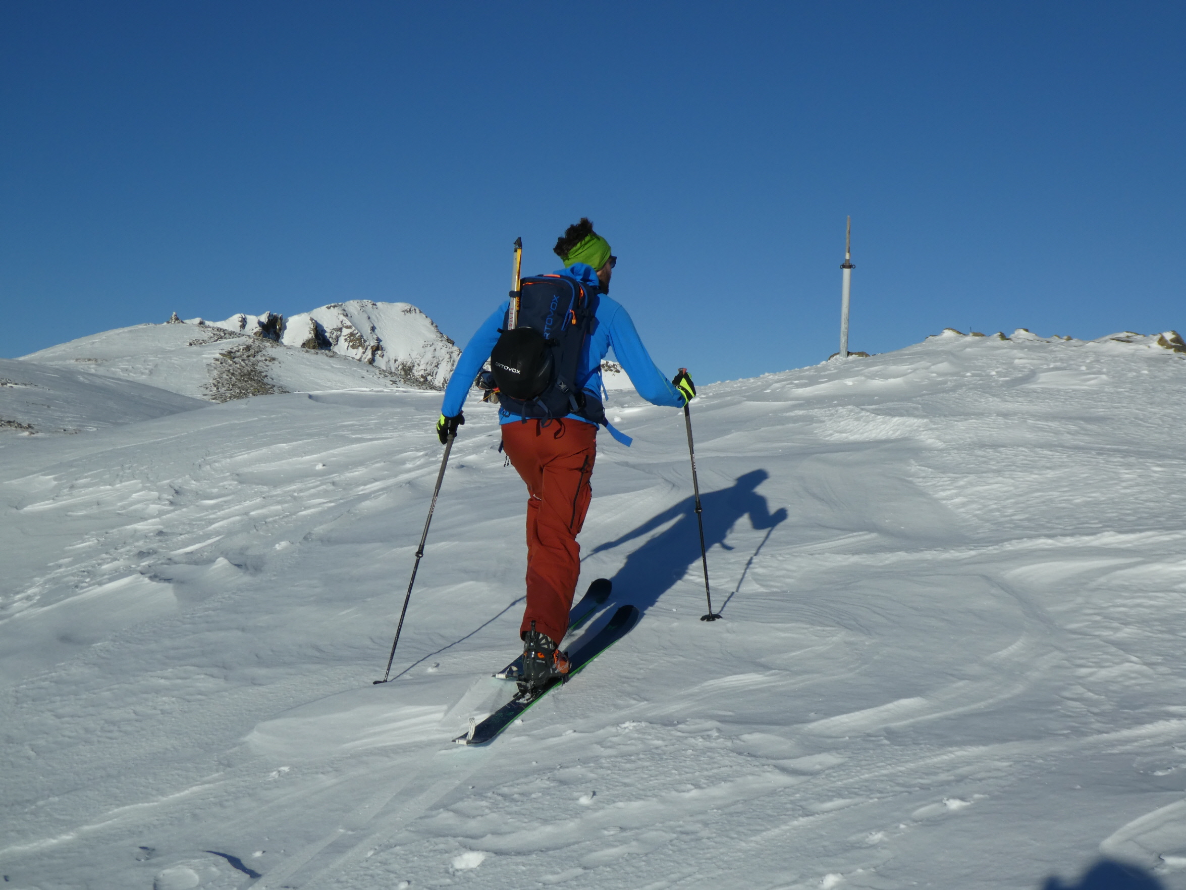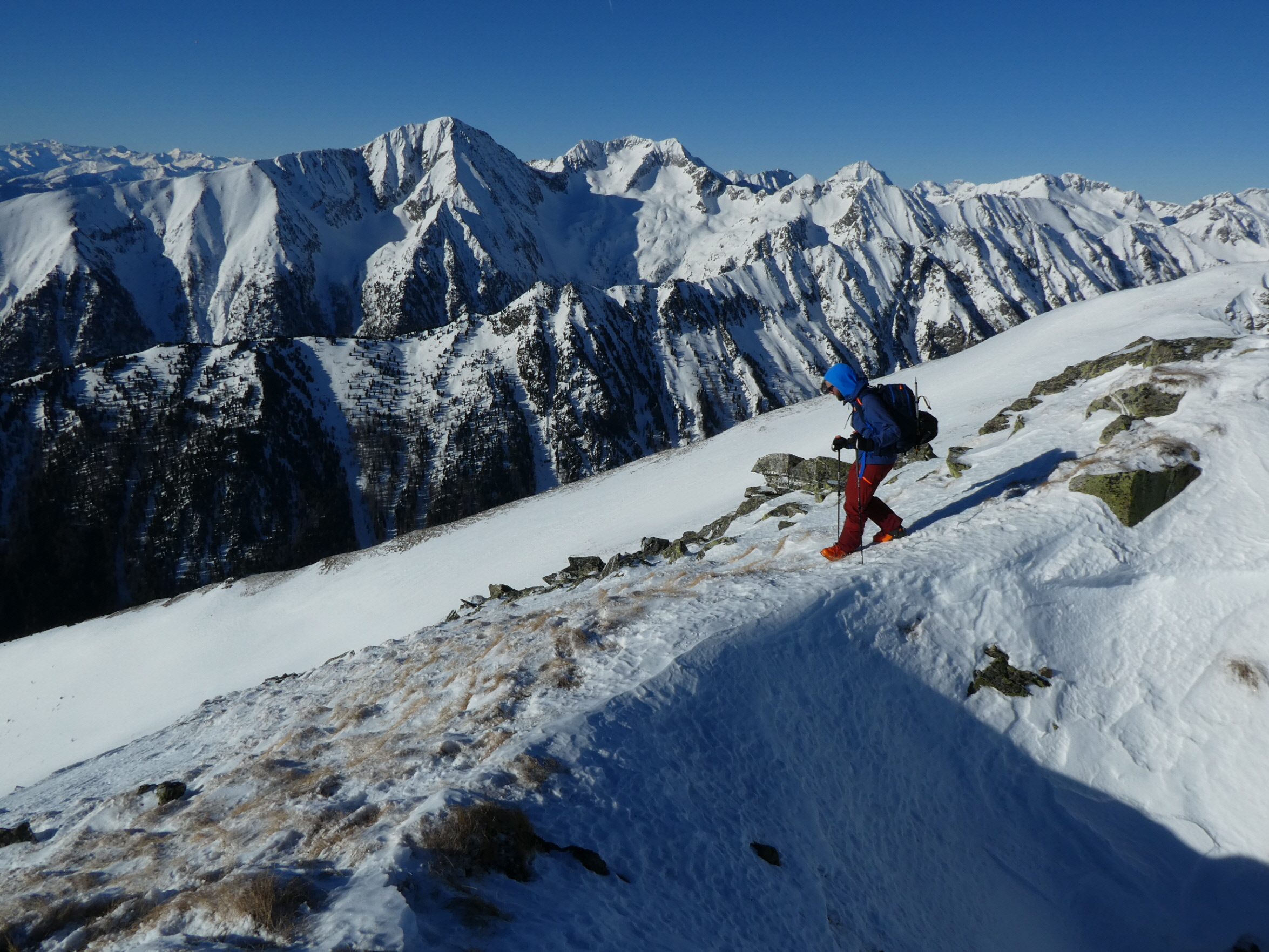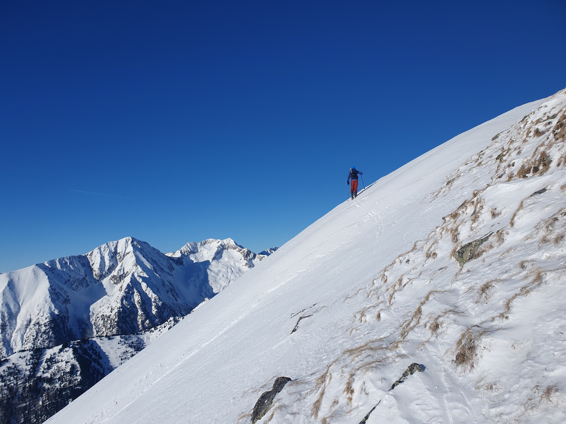 Die hat sich bei der derzeitigen Schneelage nicht aufgetan. Daher sind wir weiter zur Karlhöhe angestiegen. Auf Skiern ging es bis zum Gipfel. Für den nordseitigen Abstieg hinunter in die Scharte zwischen Karlhöhe und Hemmerfeldeck haben wir sie danach auf die Rucksäcke gepackt. Dort sind sie für das kurze Stück weiter hinauf zum letzten und höchsten Tagesziel auch geblieben.