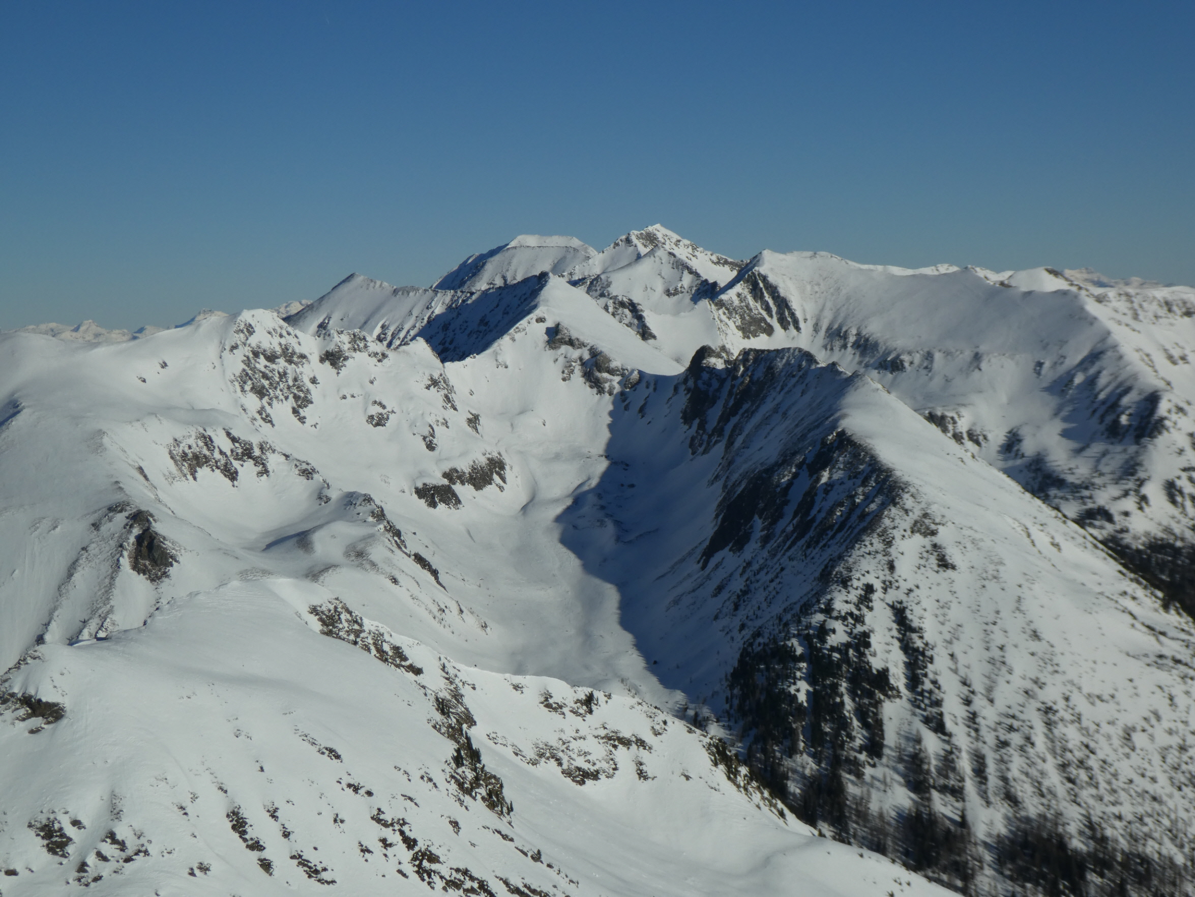 Sehr wohl haben wir uns beim Blick nach Nordosten aber an den vielen dort am Ende des Etrachgrabens stehenden, bereits auch mehrfach bestiegenen Skitourenbergen delektiert. Edelfeld, Flederweißspitz, Krautgartenscharte, Bauleiteck, Schimpelspitz, Süßleiteck und rechts daneben noch das Rupprechtseck, da sind viele Erinnerungen an grandiose Touren aufgekommen.