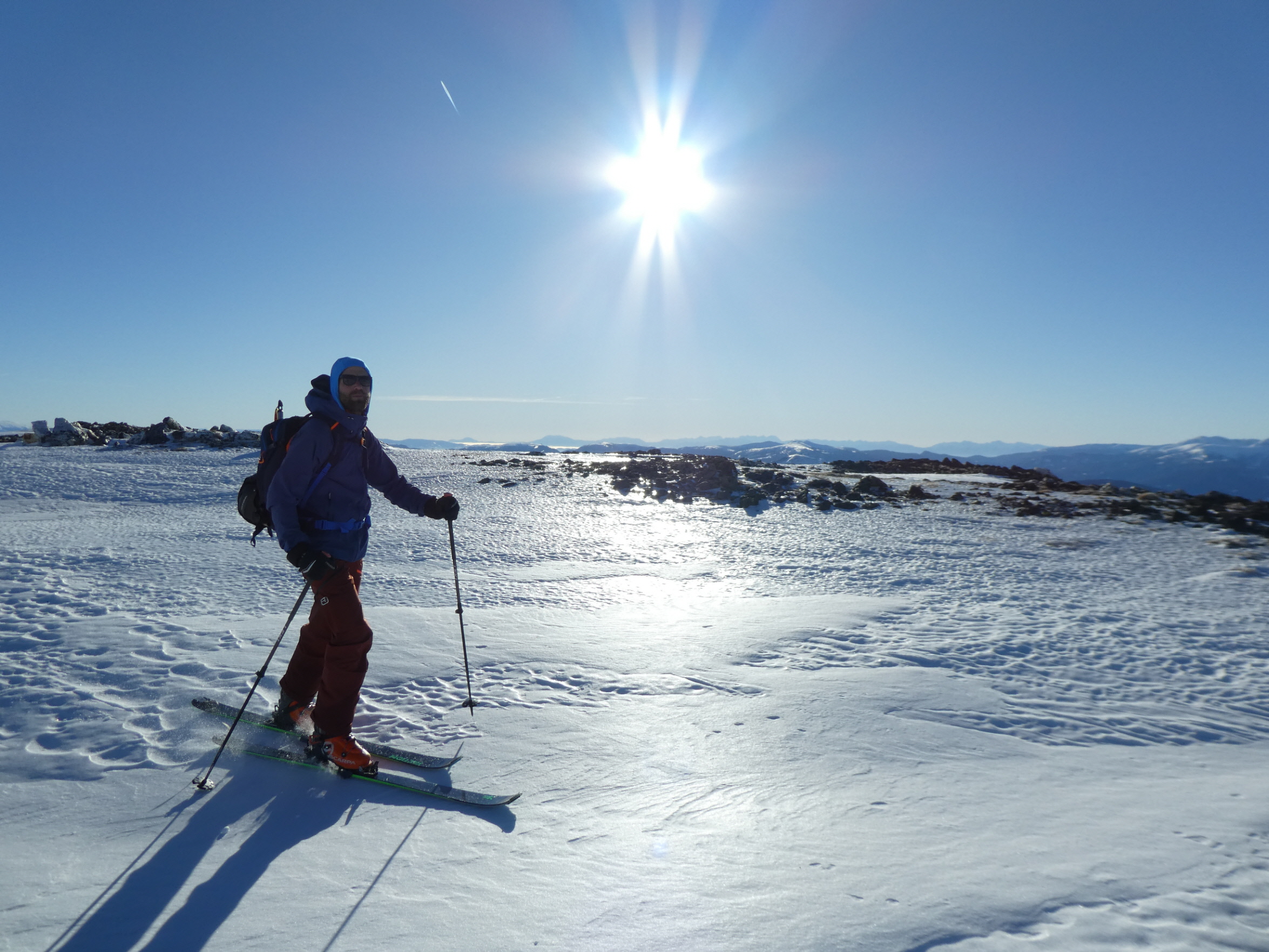 Knapp unter dem Gipfel haben wir ein Skidepot errichtet und sind die letzten Meter zum höchsten Punkt hinaufgestiegen. Eigentlich sind es ja derer zwei. Und weil im Zweifel nicht exakt auszumachen ist, welcher der beiden Doppelgipfel der um wenige Zentimeter niedrigere oder höhere ist, mussten natürlich beide bestiegen werden.