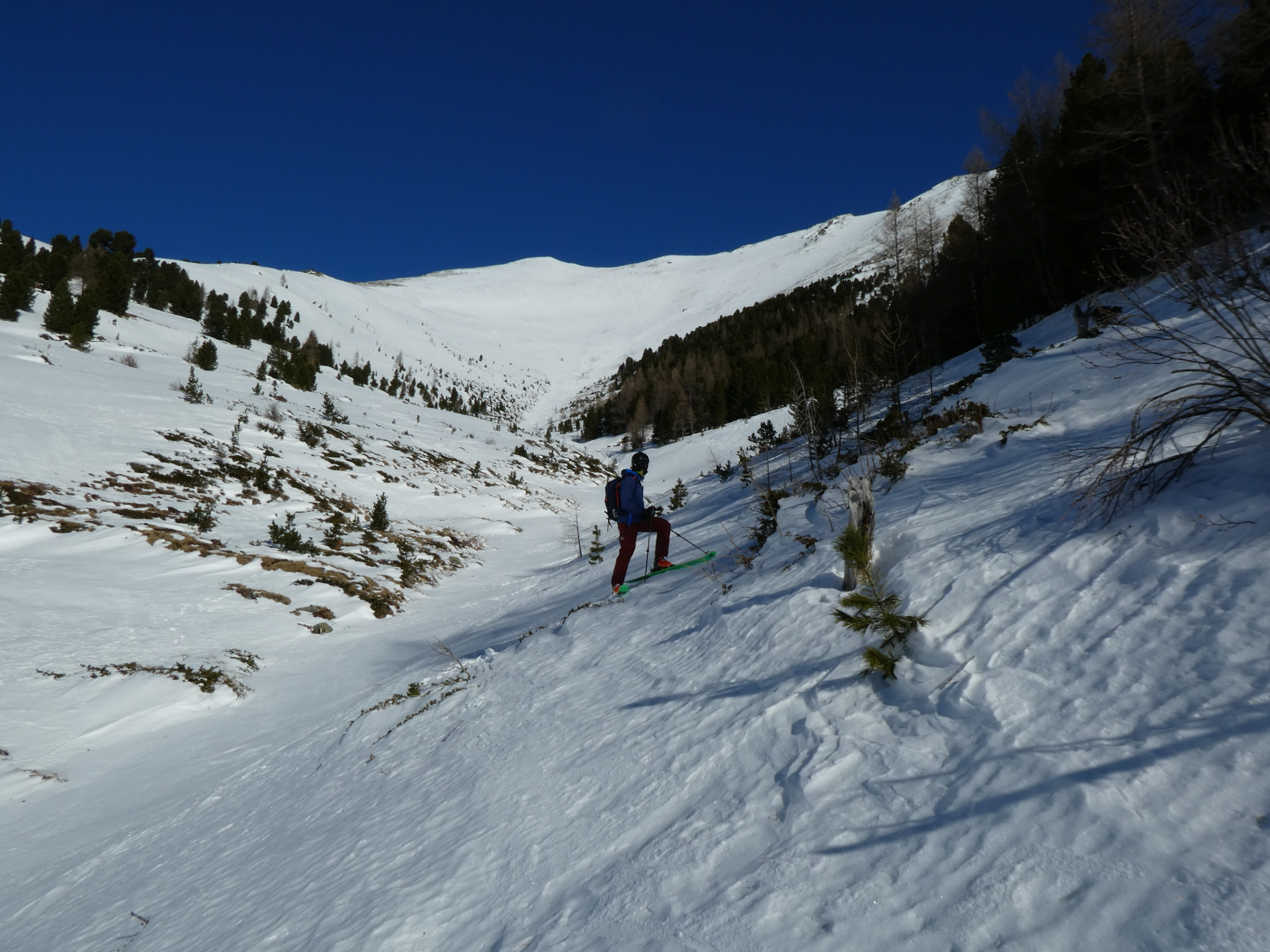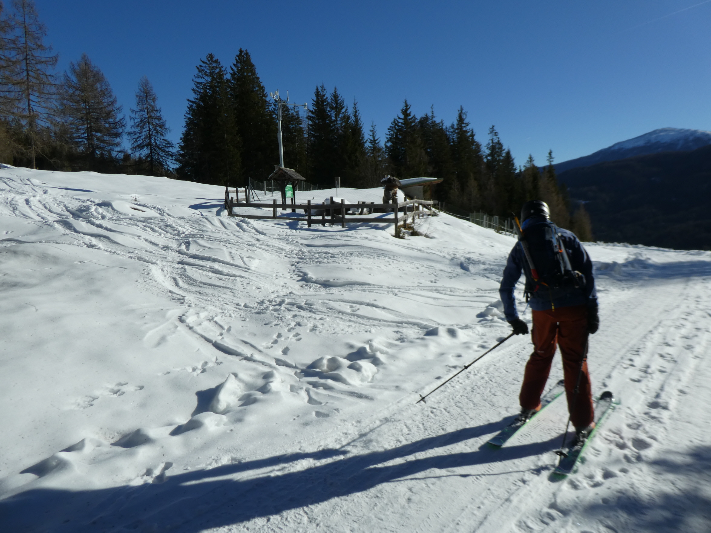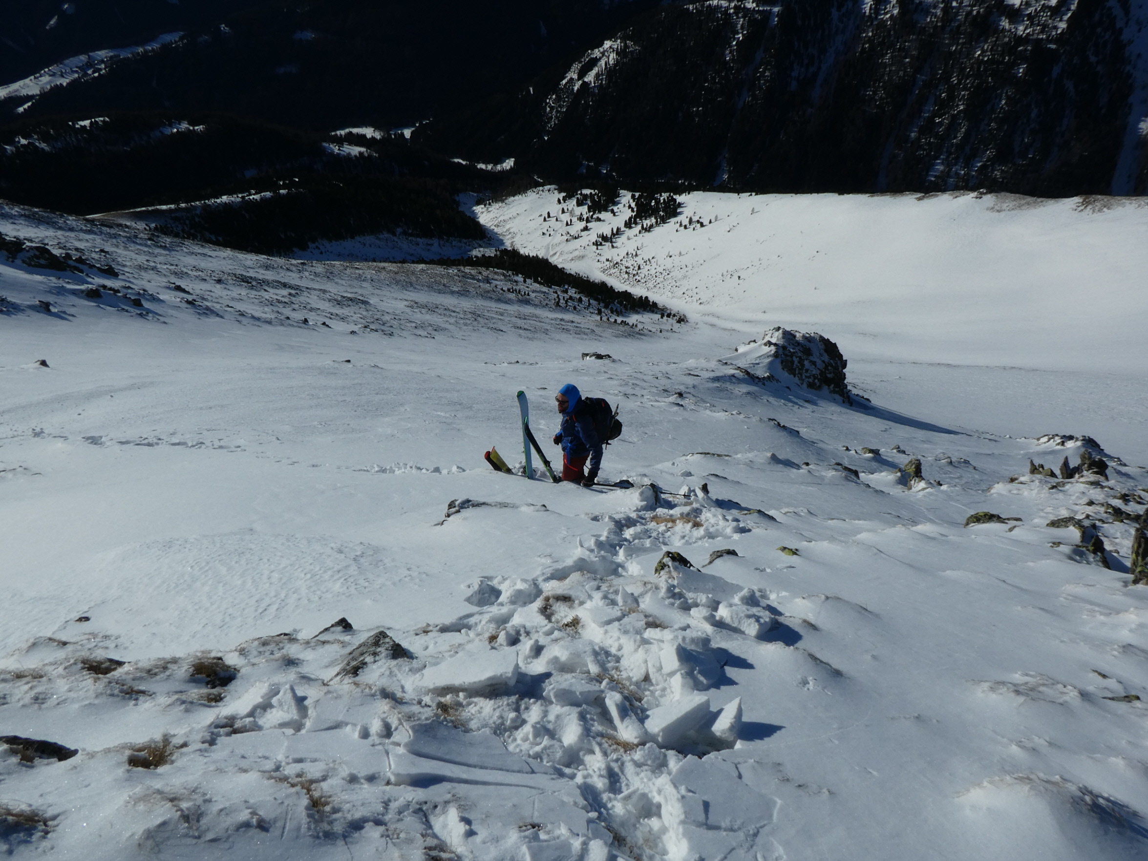 Wegen eines frischen Lüfterls aus Nordwest haben wir uns die Jacken übergezogen. Dann sind wir weiter nach Westen, zuletzt leicht ansteigend zum Lazi Kreuz weitergewandert. Von dort ging es anschließend leicht bergab, immer wieder die Augen nach rechts in die steile Flanke gerichtet, auf der Suche nach einer durchgehend fahrbaren Linie hinunter zur Gartleralm.