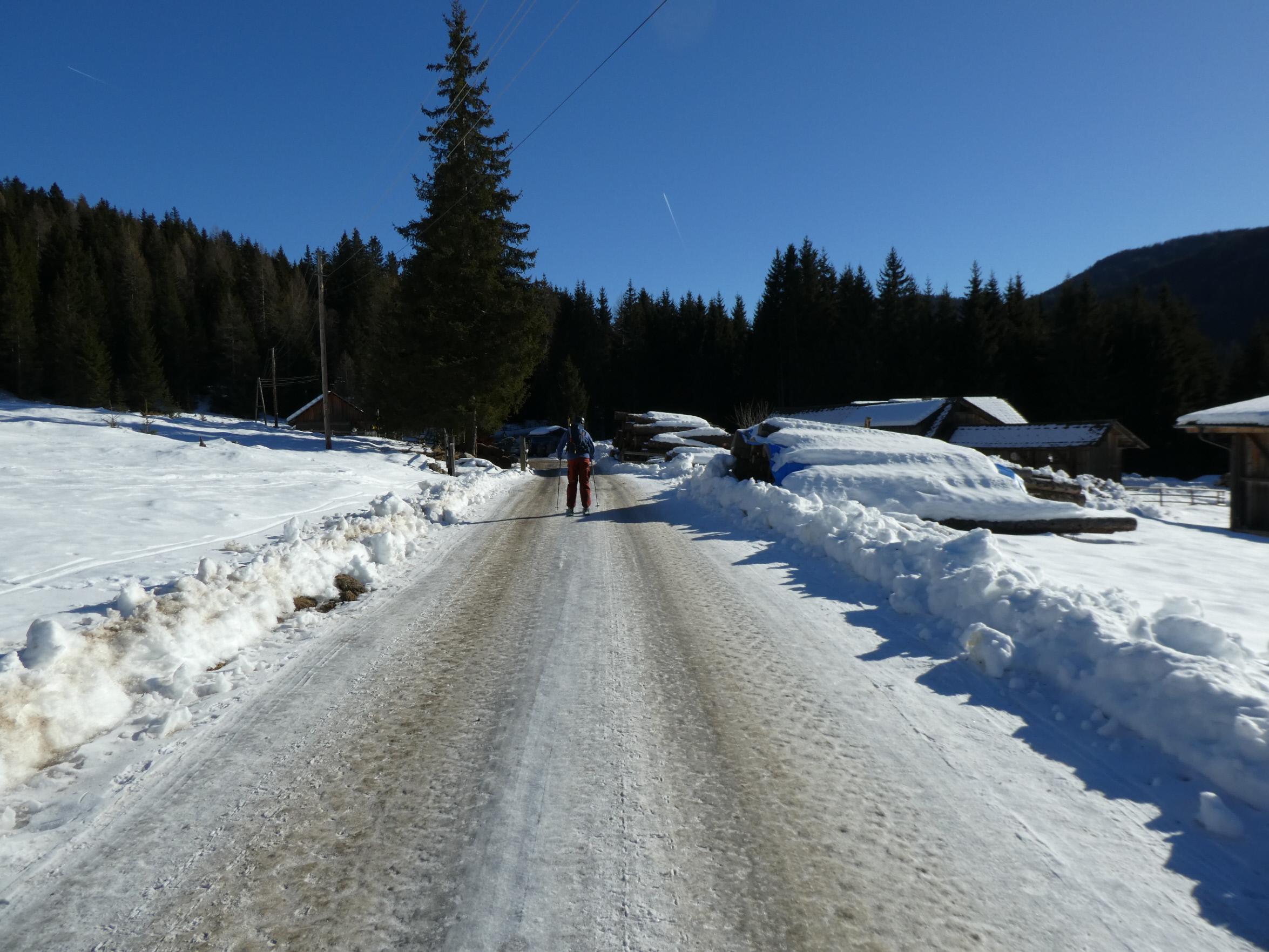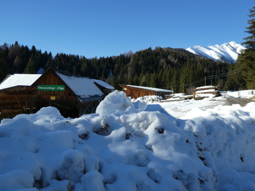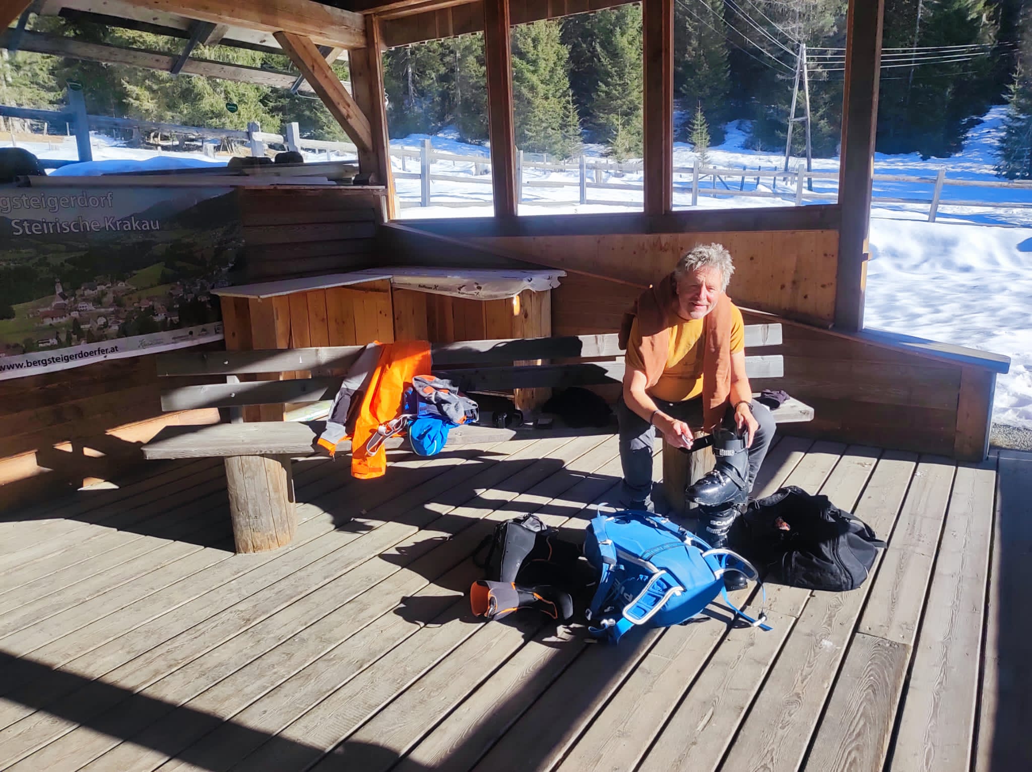 Wir sind jetzt aber am Forstweg geblieben und diesem weiter hinunter bis auf die Jagertratte gefolgt. Von da ging es dann mit wenigen Stockschüben zurück zum Ausgangspunkt der Tour bei der Klausnerberg-Säge. Die überdachte Terrasse des Veranstaltungsgebäudes des örtlichen Tourismusverbandes hat uns als luxuriöse Umkleidekabine gedient.