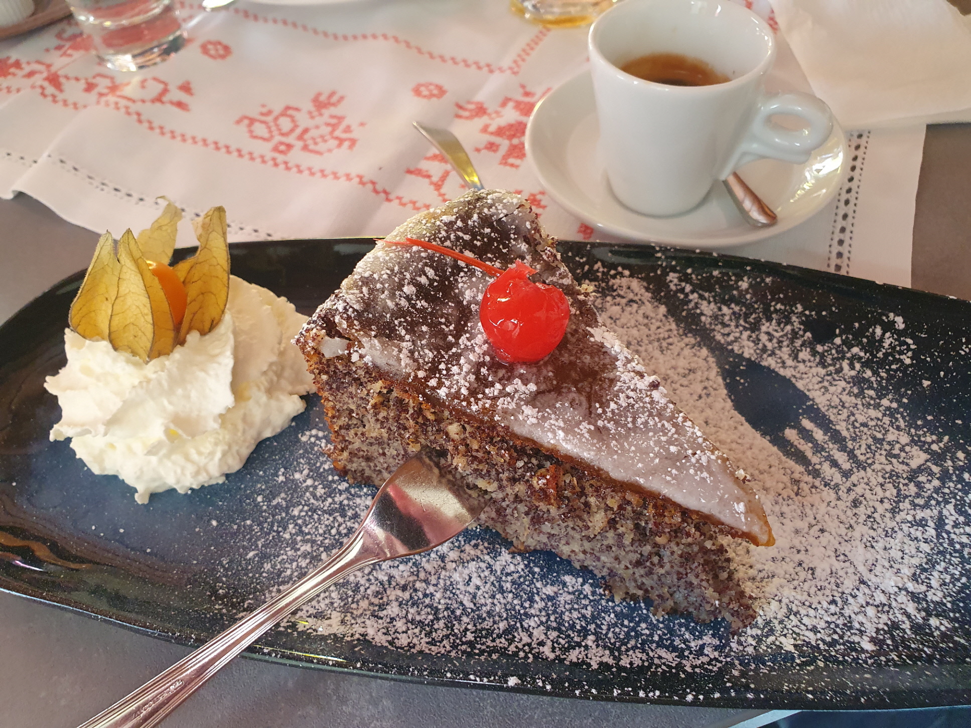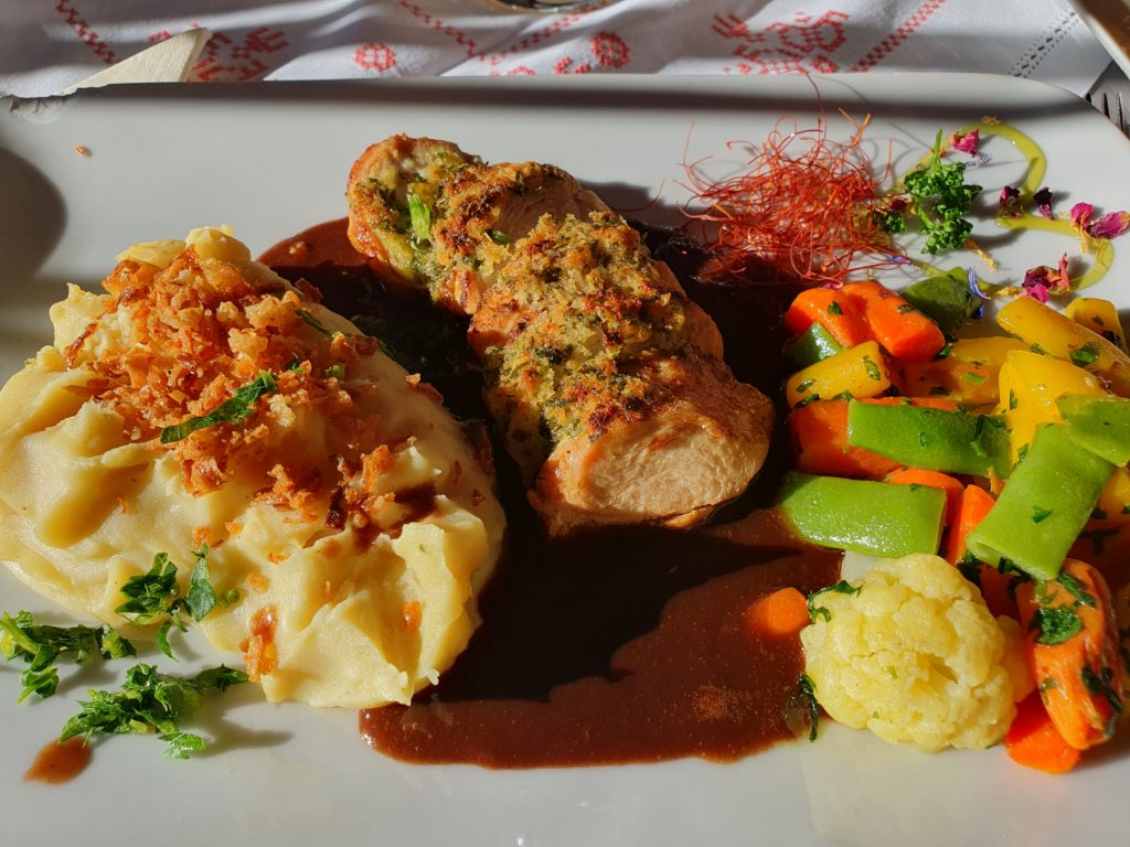 Neu gewandet haben wir uns anschließend mit Brigitte, Lisi und den Mädchen zum Familienessen beim Stiegenwirth getroffen. Chris hat sich für das Duo vom Hirsch entschieden. Da hat auch jeder von uns eine Kostgabel davon abbekommen. Deshalb ist für den Heinrich davon leider nichts mehr übrig – nicht einmal ein Foto davon. Er darf sich daher virtuell von meinem ebenso delikaten gebratenen Hühnerfilet in der Kräuterkruste mit Erdäpfel-Kren-Püree, Chillisauce und feinem Gemüse ein großes Stück abschneiden. Mahlzeit! Und weil ich weiß, dass er auch einer guten Nachspeise etwas abgewinnen kann, habe ich die Mohntorte mit einer zweiten Gabel geordert 😉.