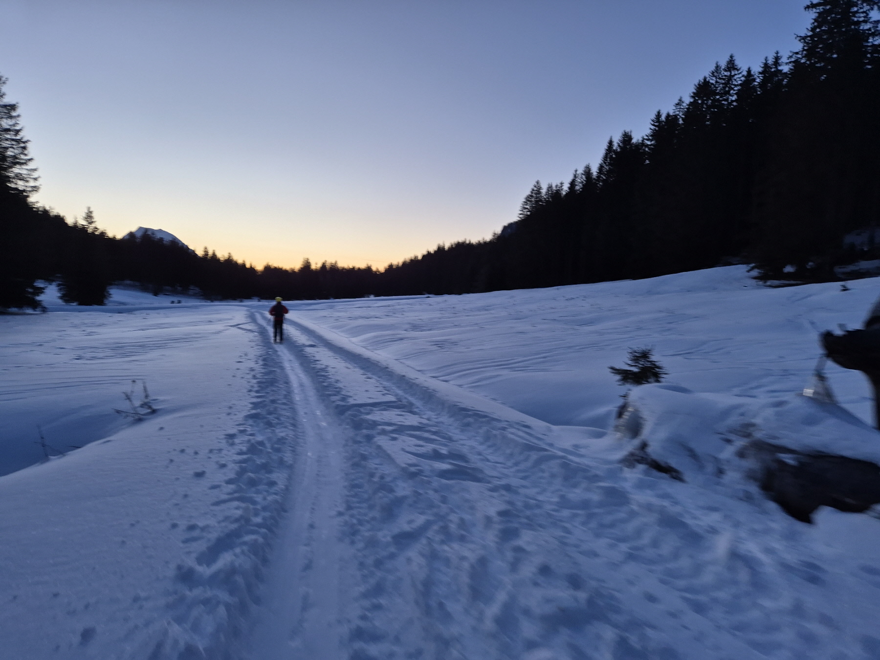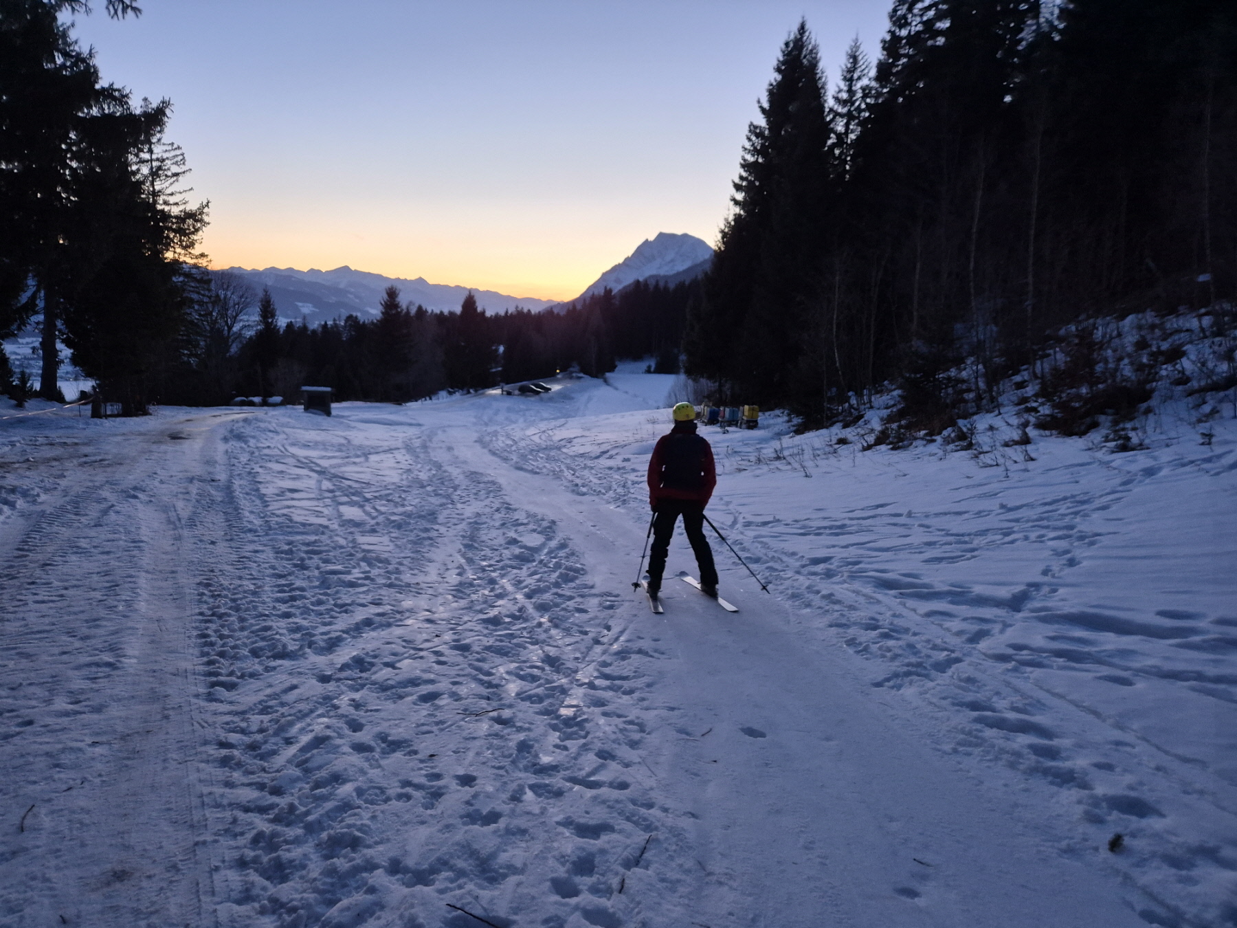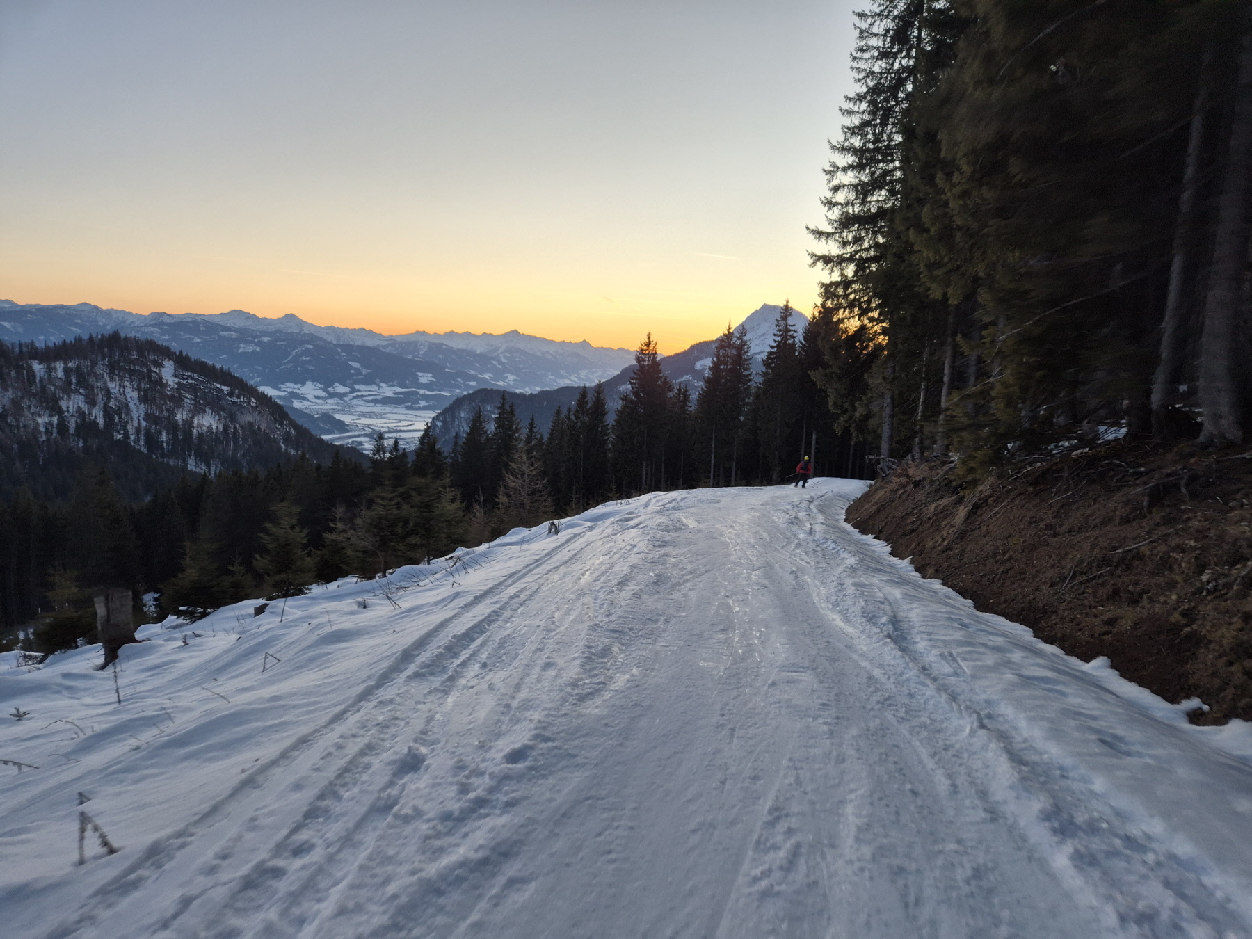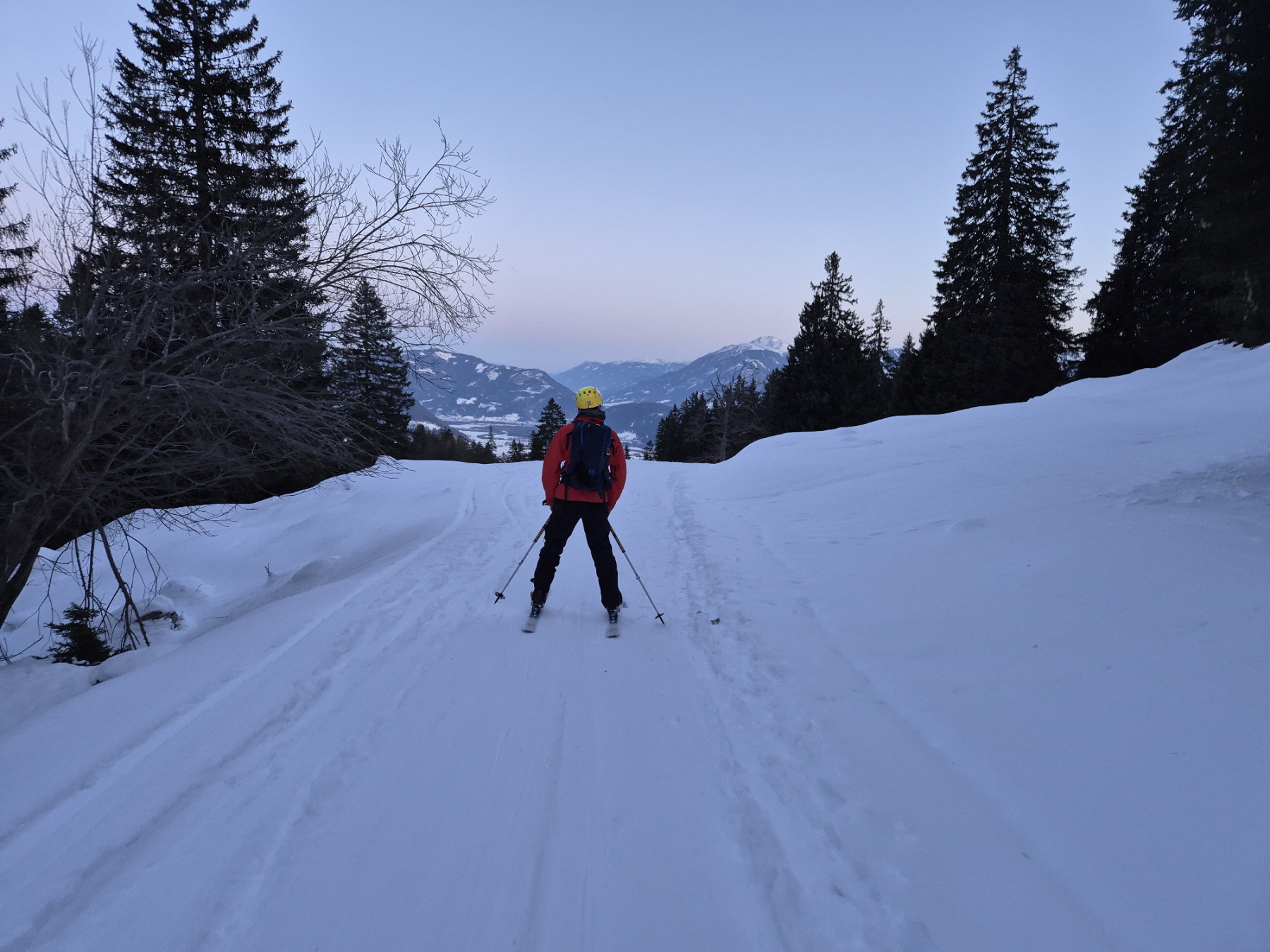 Froh waren wir, als wir uns auf der Langpodenalm endlich in den Forstweg hineinstellen konnten. In flotter Fahrt ging es talwärts. Immer dunkler ist es geworden. Das Abnehmen und Verstauen der Sonnenbrillen haben zwar kurzzeitig eine Aufhellung gebracht, aber die Dämmerung ist flott hereingebrochen. Auch die Kehren oberhalb vom Schönmoos sind wir jetzt ausgefahren. Nach einigen finalen Stockschüben in der letzten etwas ansteigenden Passage vor dem Schlusshang hinunter zum Parkplatz haben wir diesen wirklich im letzten Tageslicht erreicht und uns so das Aufsetzen der Stirnlampen erspart.