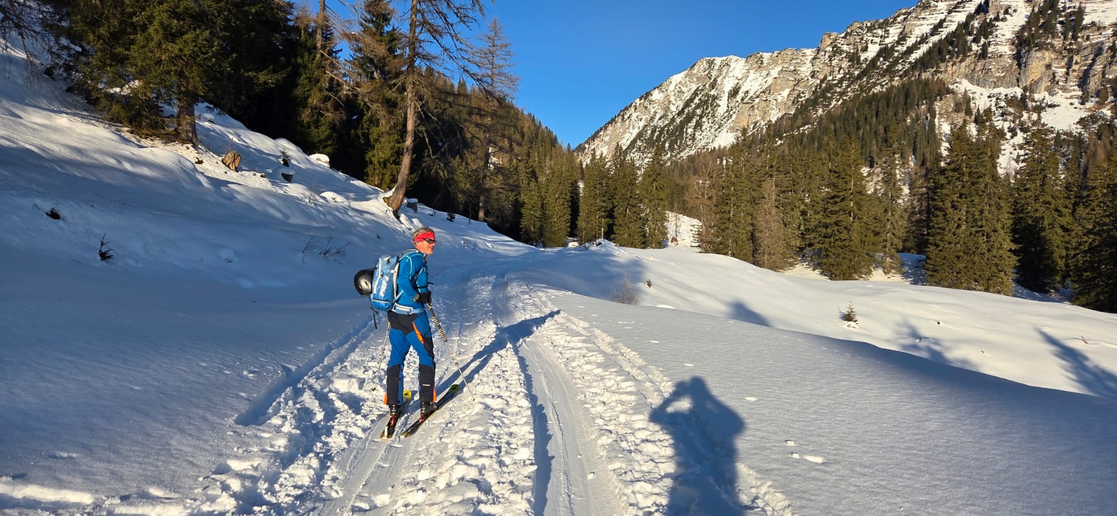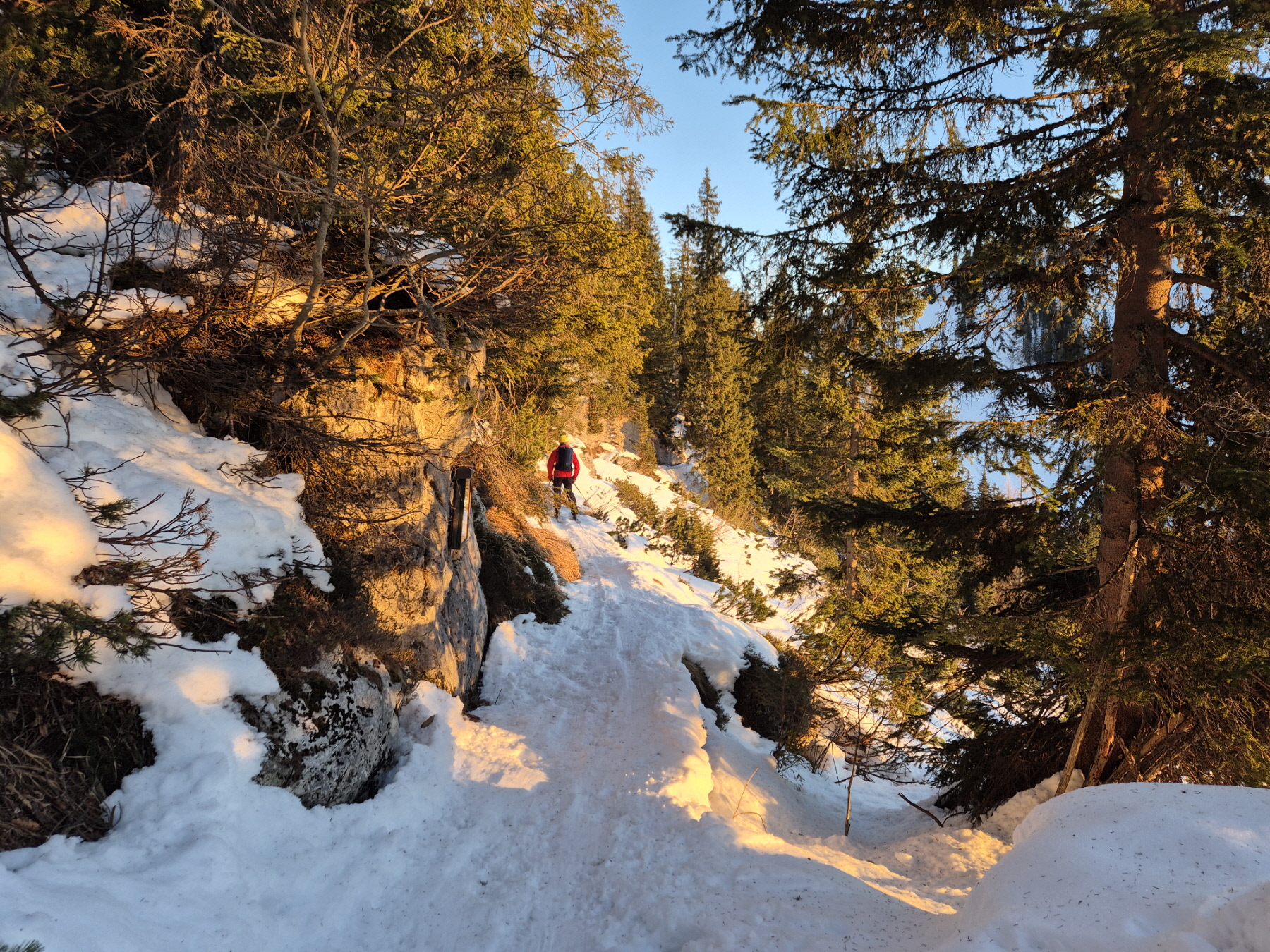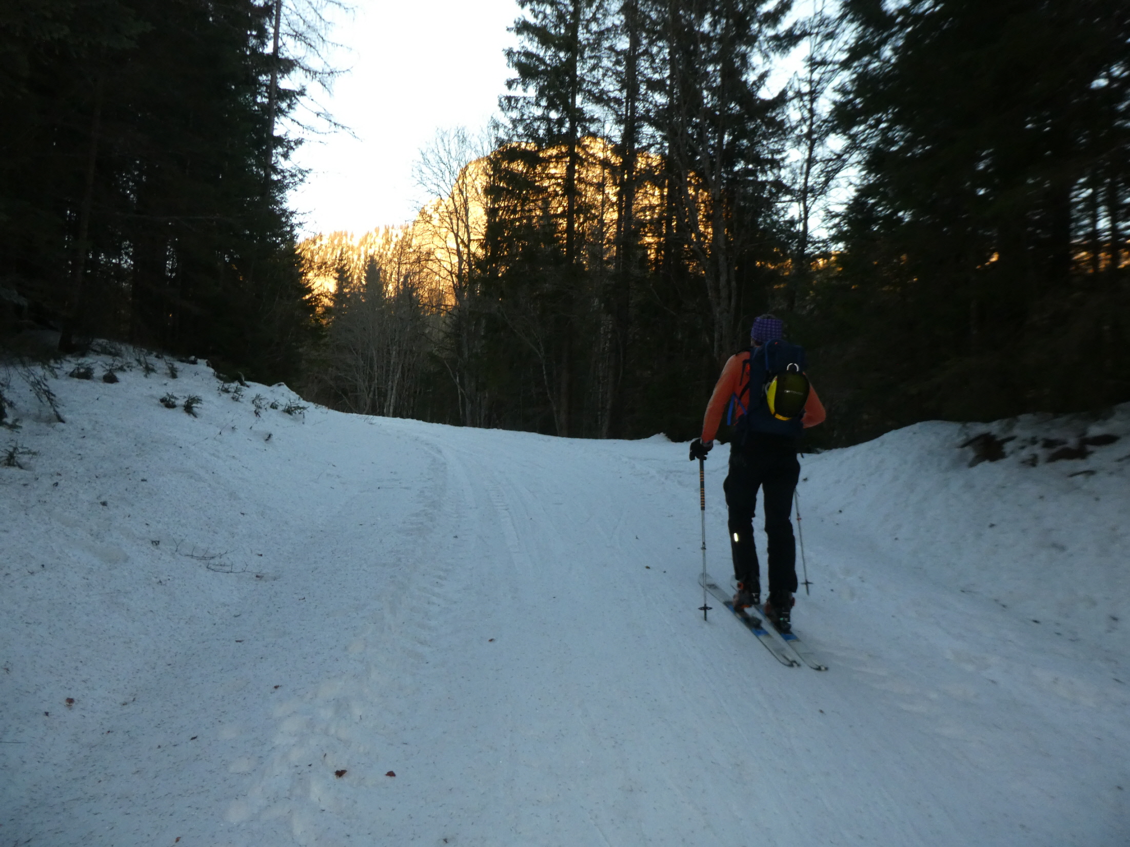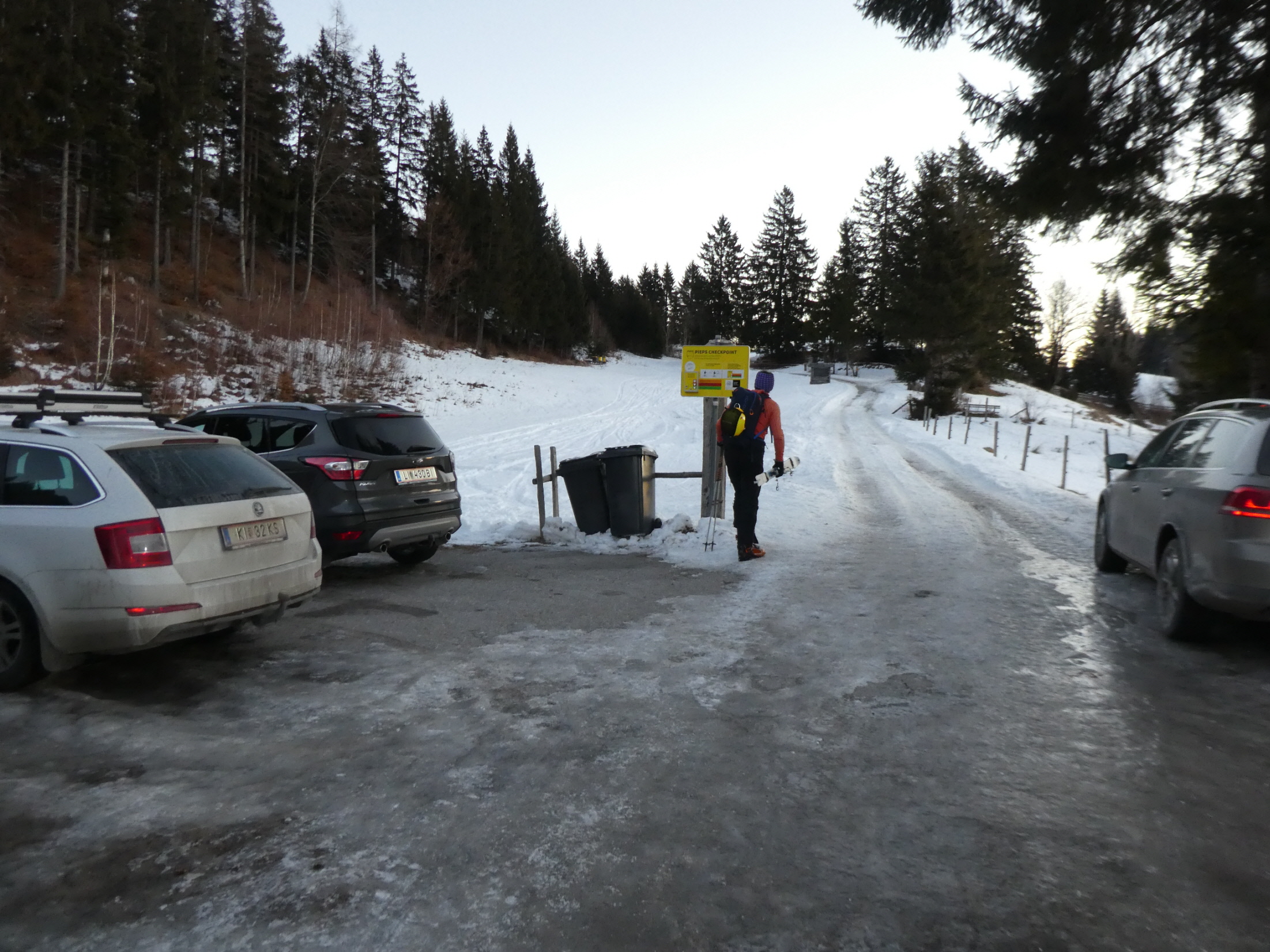 Froh waren wir, als wir uns auf der Langpodenalm endlich in den Forstweg hineinstellen konnten. In flotter Fahrt ging es talwärts. Immer dunkler ist es geworden. Das Abnehmen und Verstauen der Sonnenbrillen haben zwar kurzzeitig eine Aufhellung gebracht, aber die Dämmerung ist flott hereingebrochen. Auch die Kehren oberhalb vom Schönmoos sind wir jetzt ausgefahren. Nach einigen finalen Stockschüben in der letzten etwas ansteigenden Passage vor dem Schlusshang hinunter zum Parkplatz haben wir diesen wirklich im letzten Tageslicht erreicht und uns so das Aufsetzen der Stirnlampen erspart.