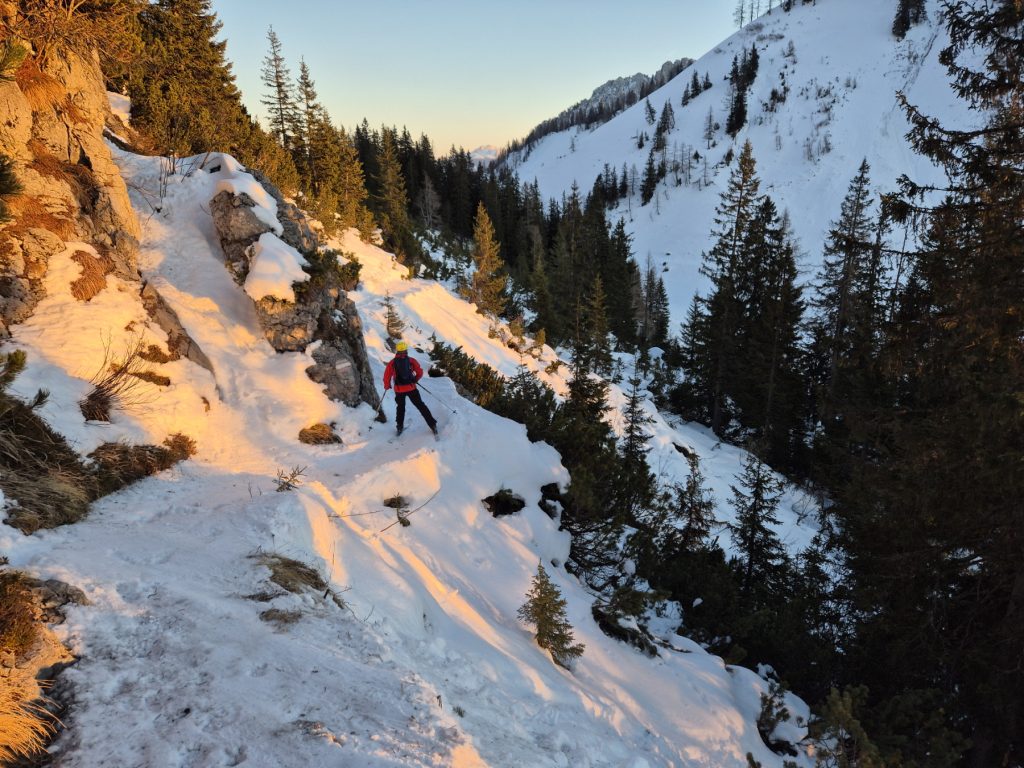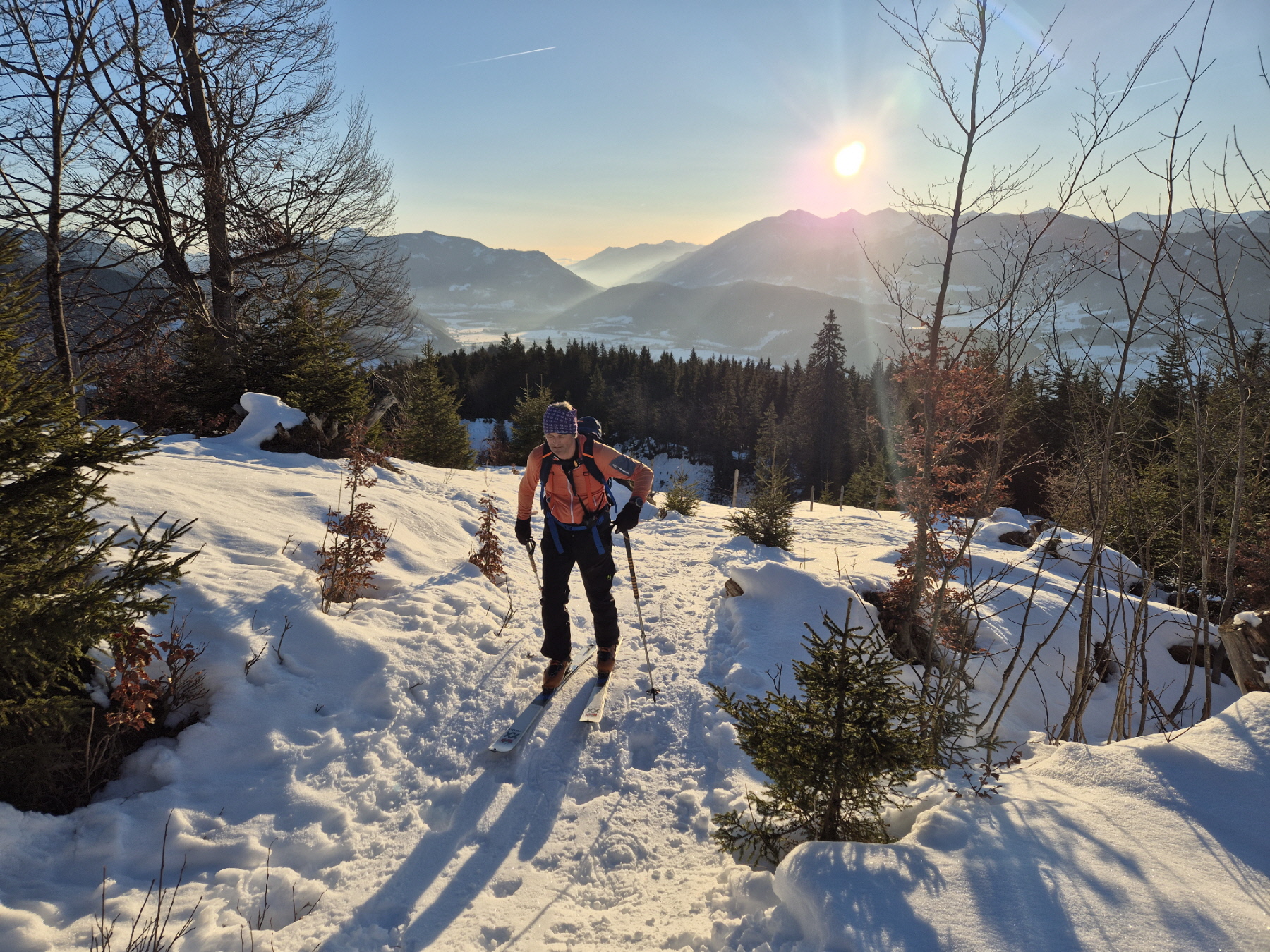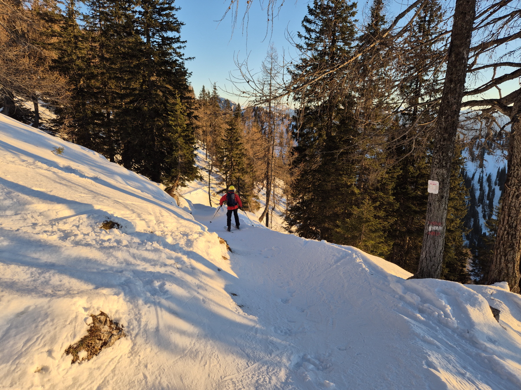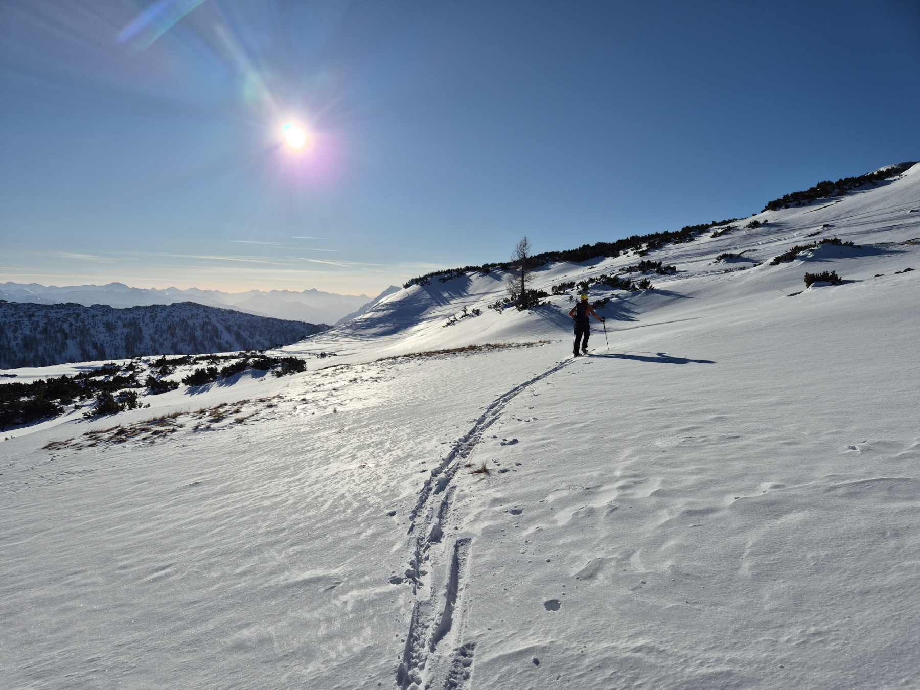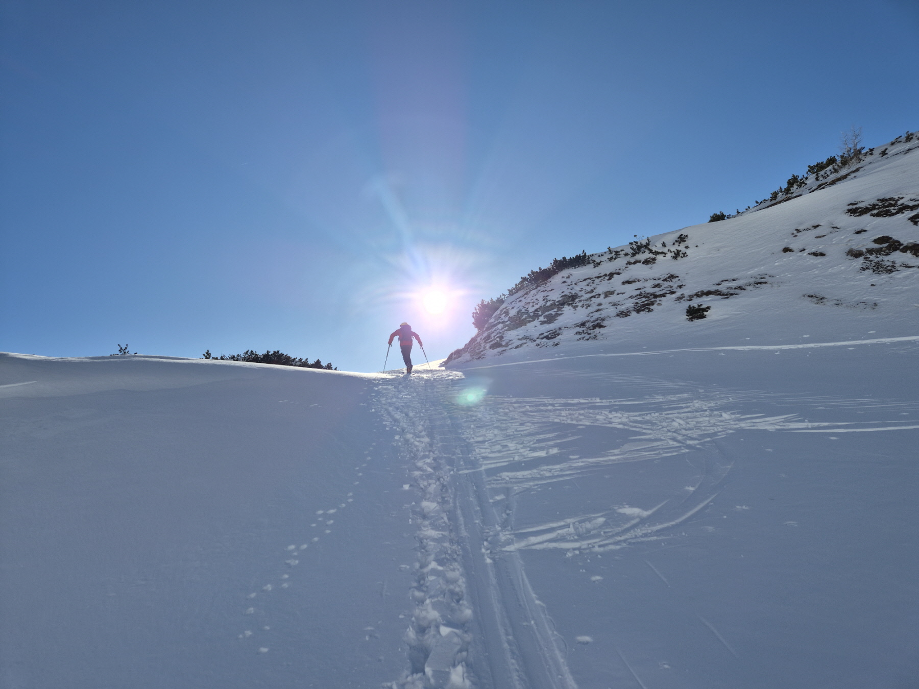 Nach der Einkehr aus der warmen Stube wieder in die Kälte hinaus zu müssen, ist nicht lustig. Aber im folgenden Anstieg hinauf auf den Westrücken des Raidling ist uns schon wieder warm geworden, zumal wir auf das Aufziehen der Felle verzichtet haben und daher ordentlich anschieben mussten. Oben angekommen ist die Abendsonne jetzt wirklich schon sehr sehr tief gestanden.