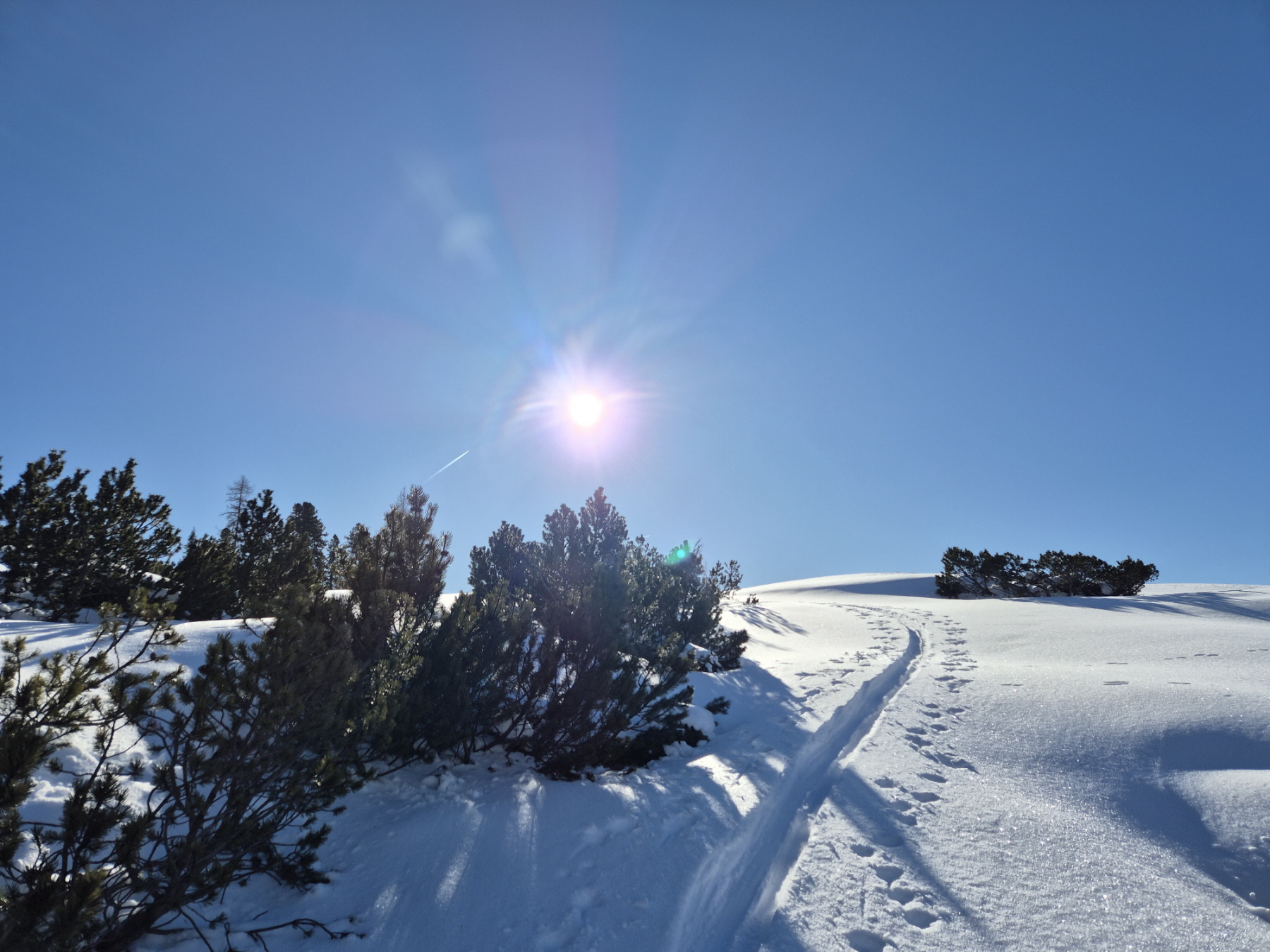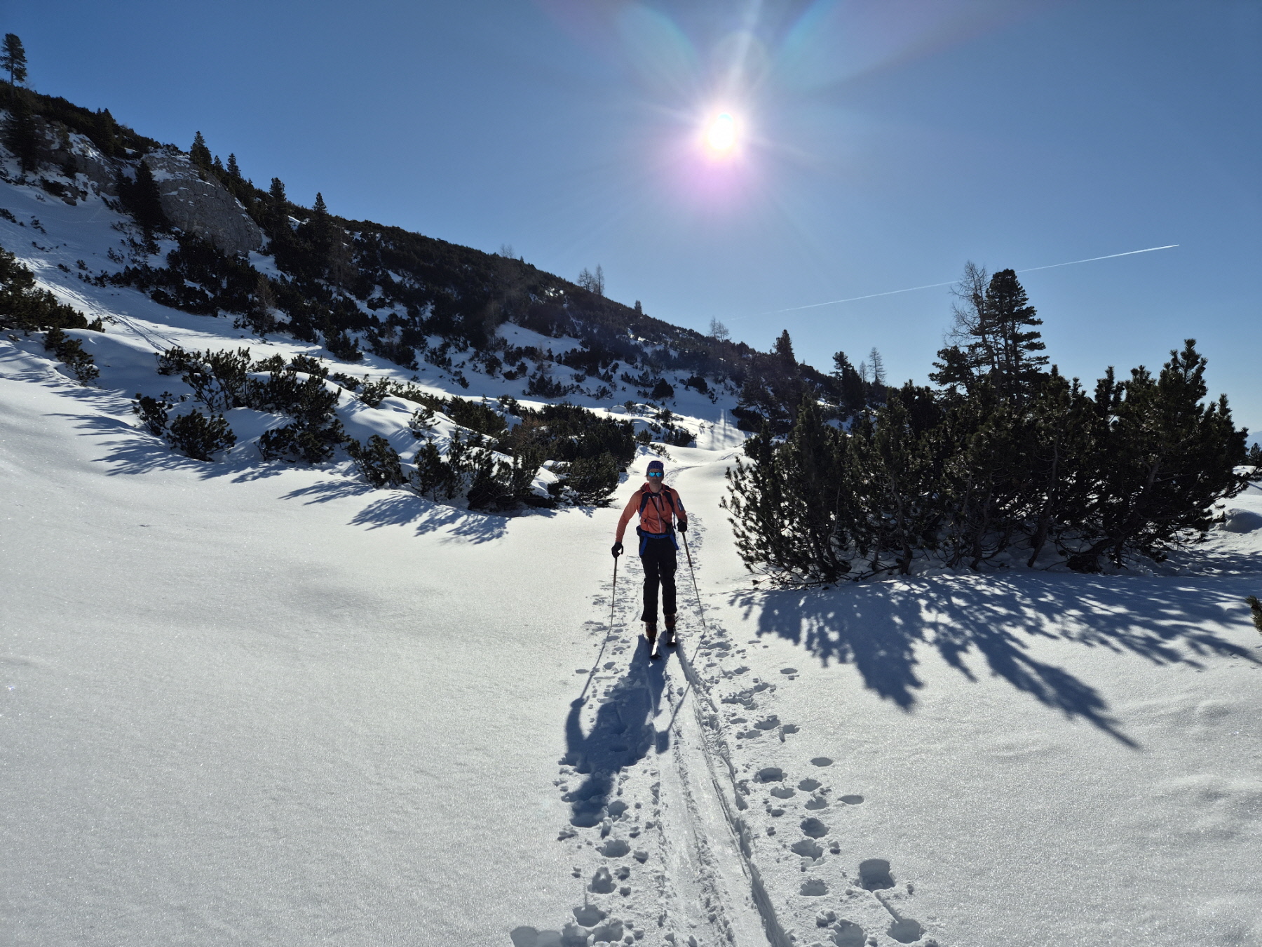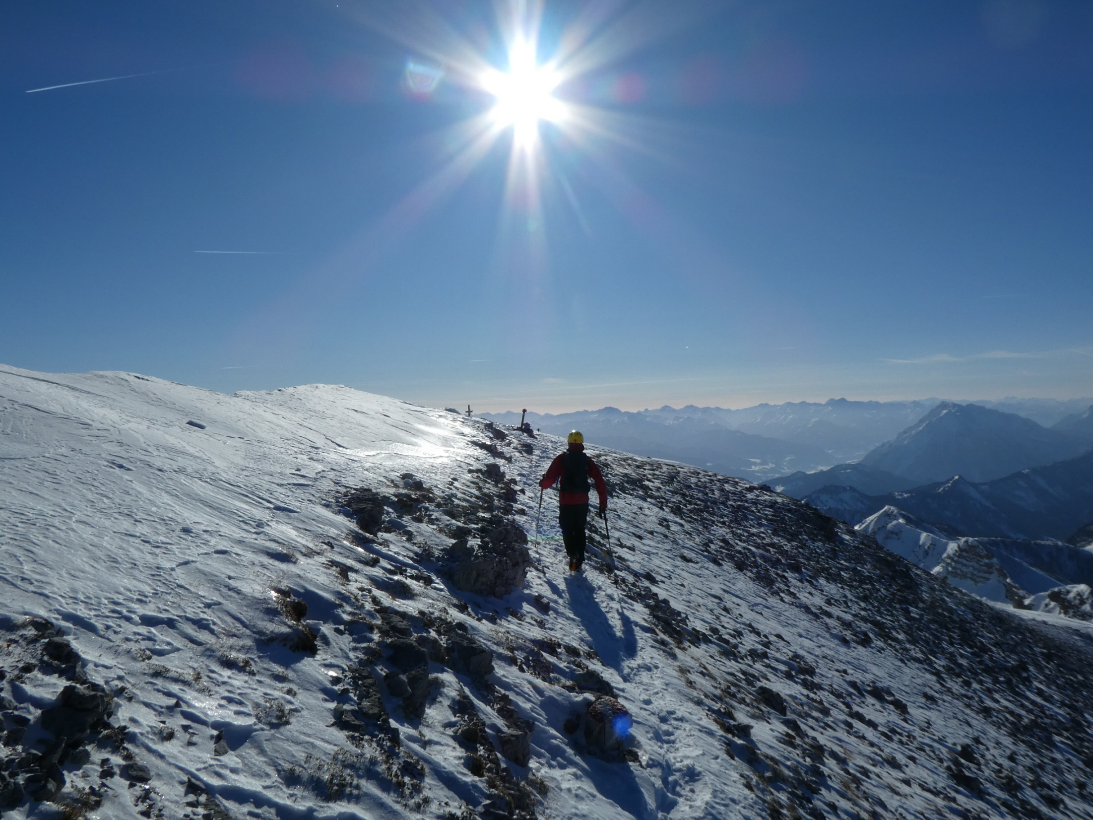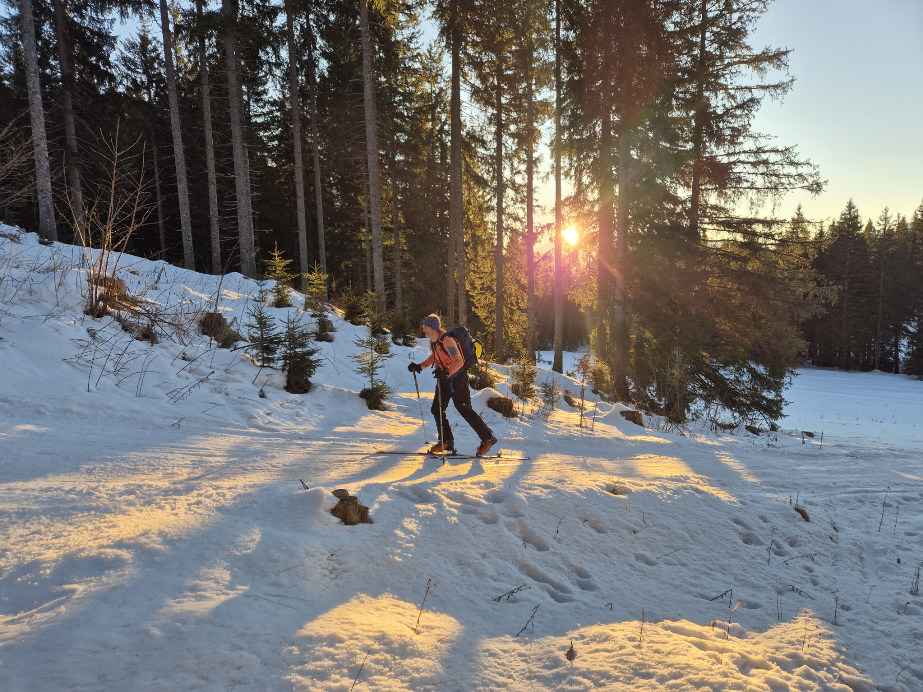Nach der Einkehr aus der warmen Stube wieder in die Kälte hinaus zu müssen, ist nicht lustig. Aber im folgenden Anstieg hinauf auf den Westrücken des Raidling ist uns schon wieder warm geworden, zumal wir auf das Aufziehen der Felle verzichtet haben und daher ordentlich anschieben mussten. Oben angekommen ist die Abendsonne jetzt wirklich schon sehr sehr tief gestanden.