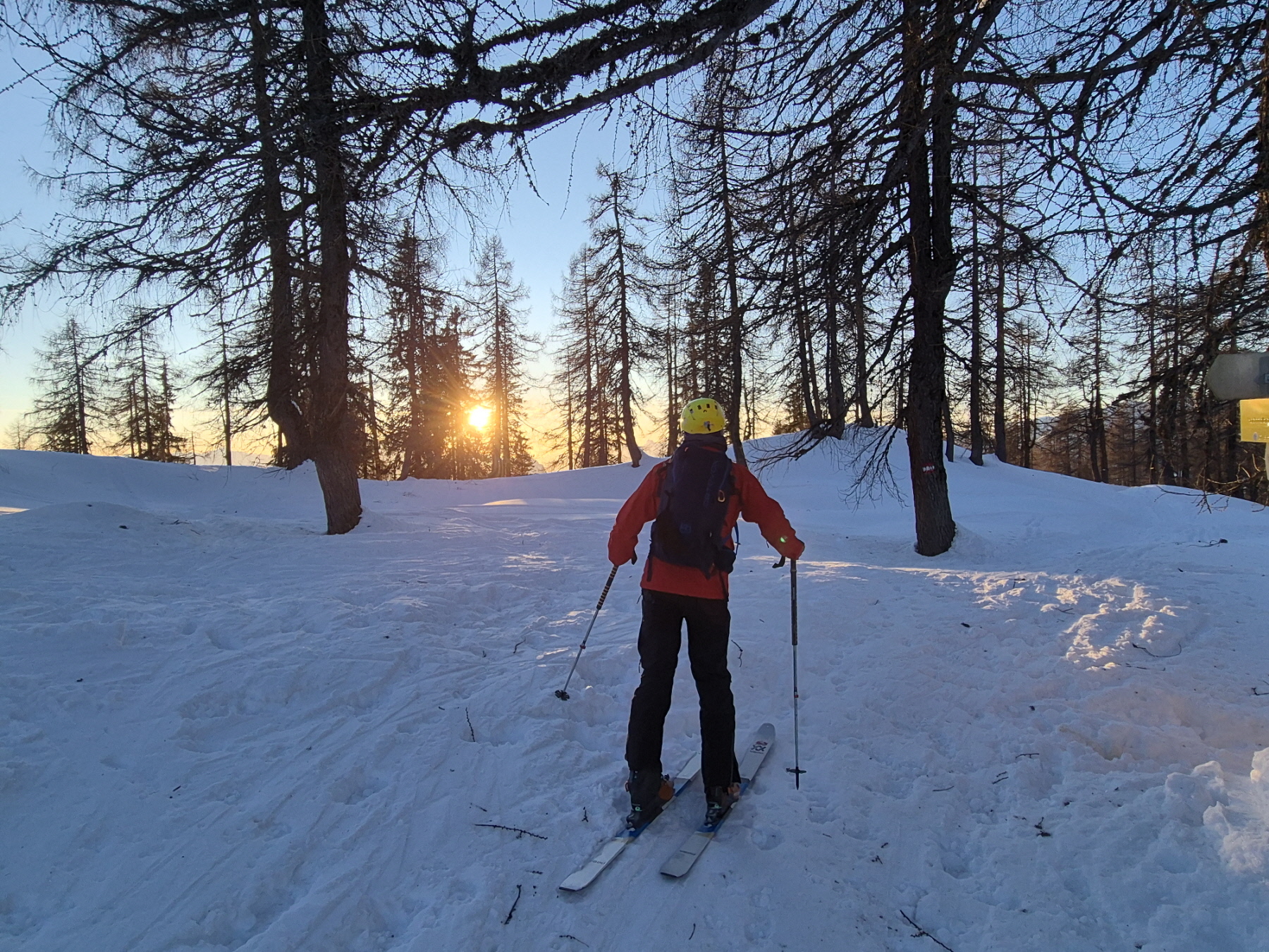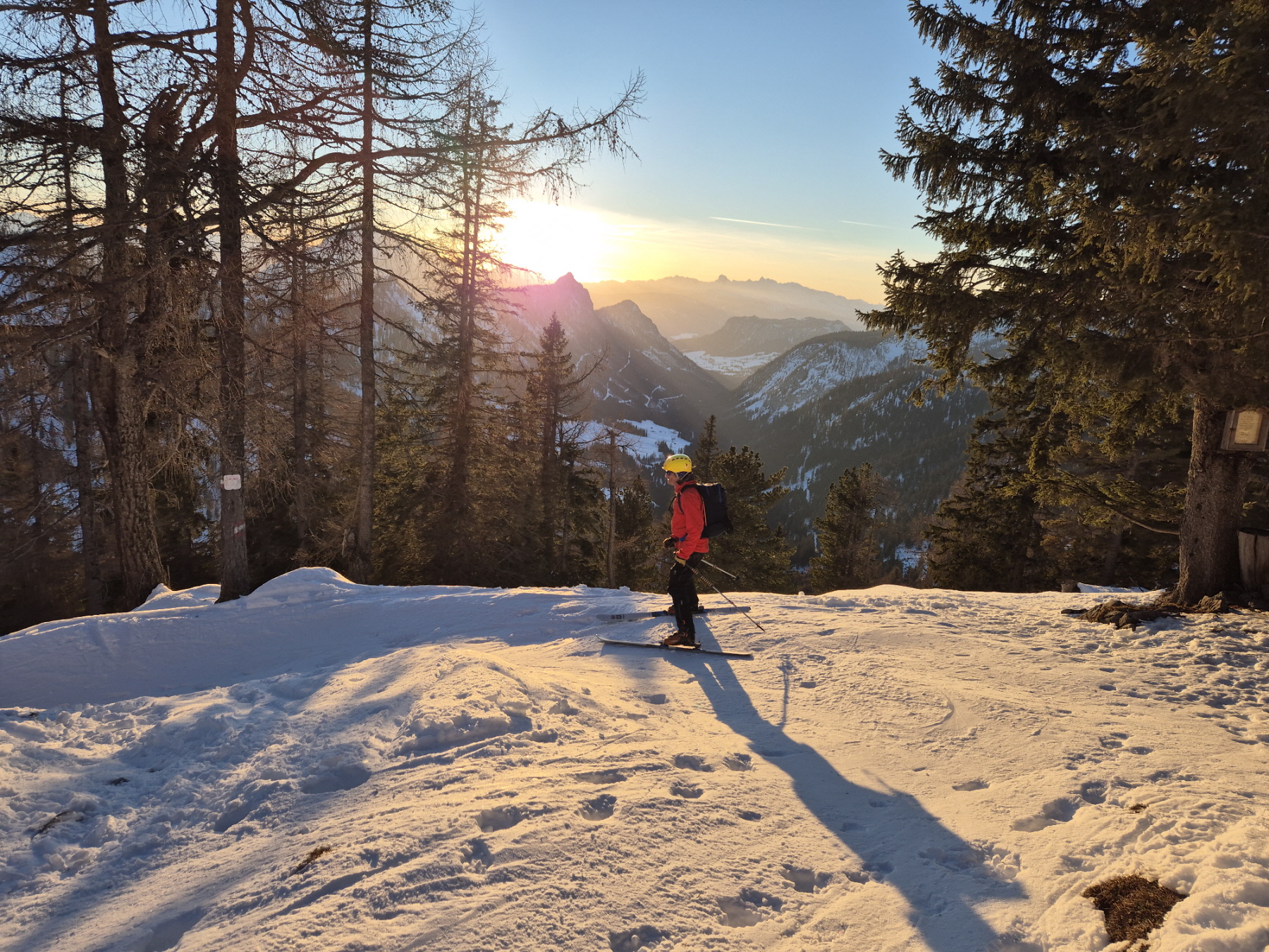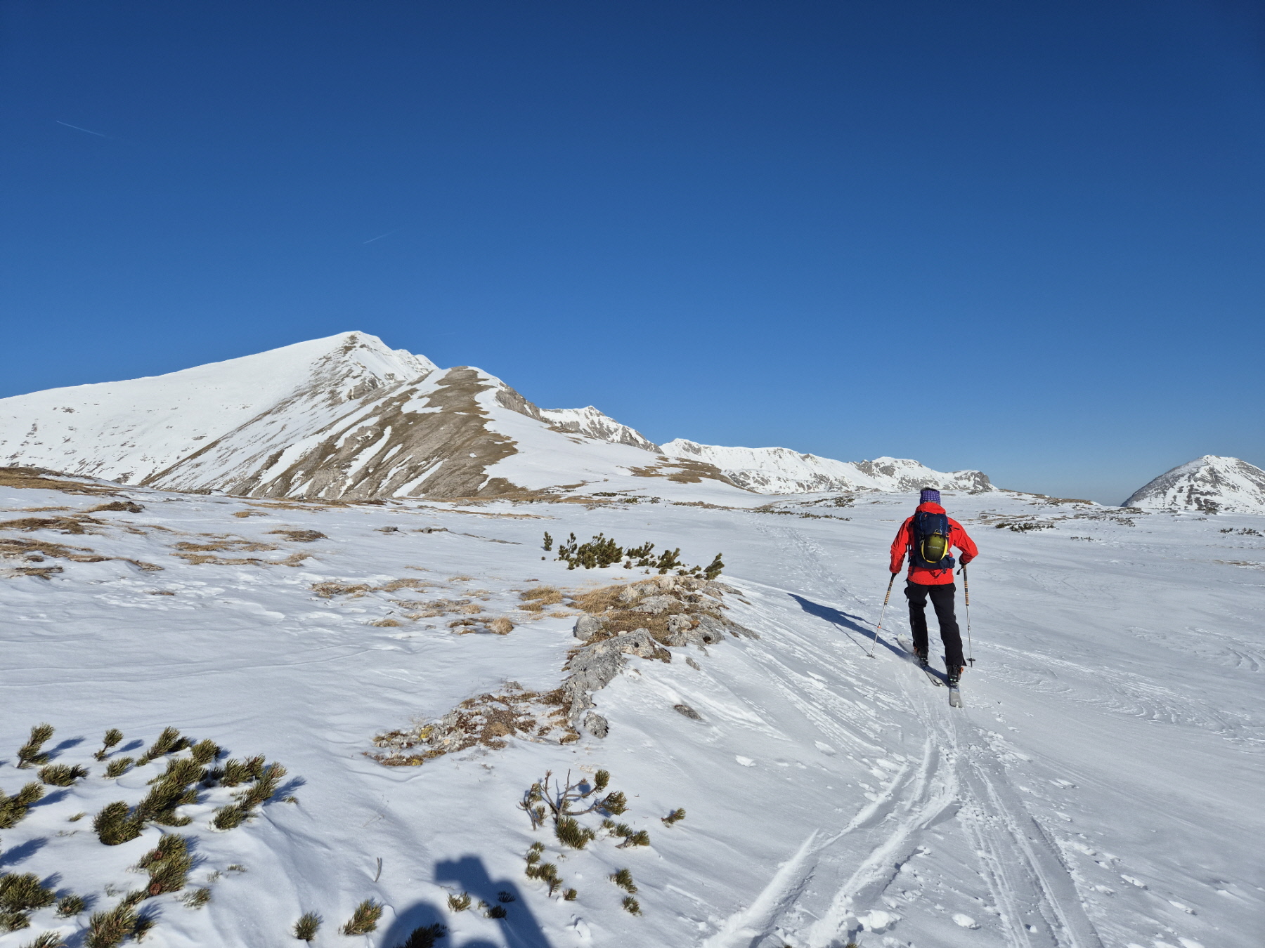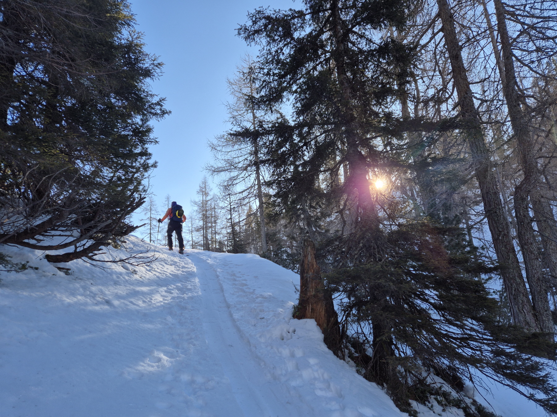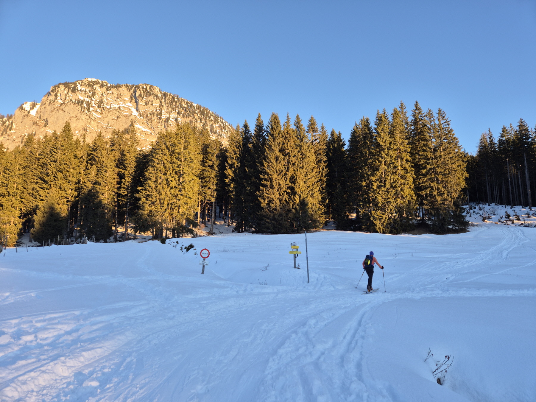 Nach der Einkehr aus der warmen Stube wieder in die Kälte hinaus zu müssen, ist nicht lustig. Aber im folgenden Anstieg hinauf auf den Westrücken des Raidling ist uns schon wieder warm geworden, zumal wir auf das Aufziehen der Felle verzichtet haben und daher ordentlich anschieben mussten. Oben angekommen ist die Abendsonne jetzt wirklich schon sehr sehr tief gestanden.