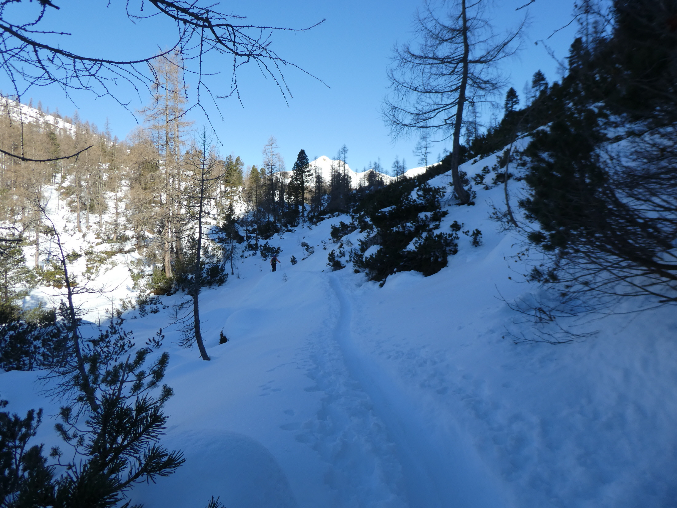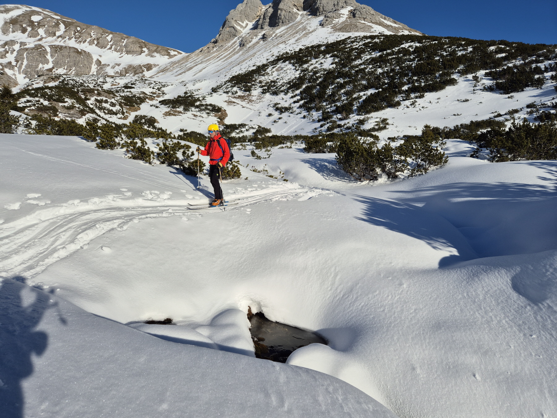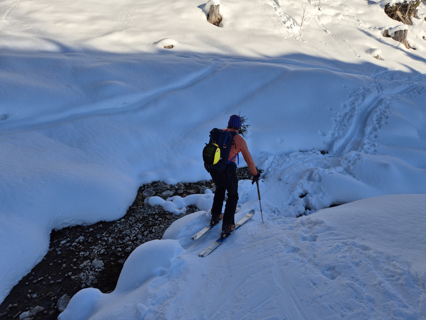 Am Rand des zugeschneiten kleinen Sees haben wir die Felle wieder aufgezogen und sind über den nächsten Rücken angestiegen. Gleich danach ging es genauso weit wieder hinunter. Das haben wir gleich auf Fellen erledigt. Anschließend sind wir ca. 10 Minuten lang immer dem Bachlauf gefolgt bis wir auf die schon beim Anstieg auf den Querlstein ausgemachte Spur hinauf in Richtung Kleinmölbing gestoßen sind.