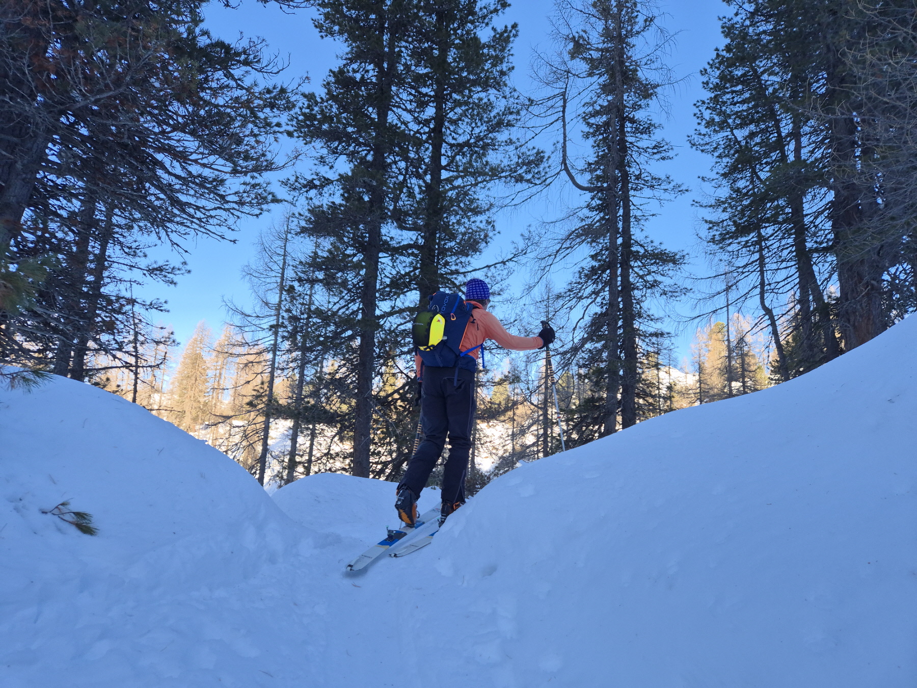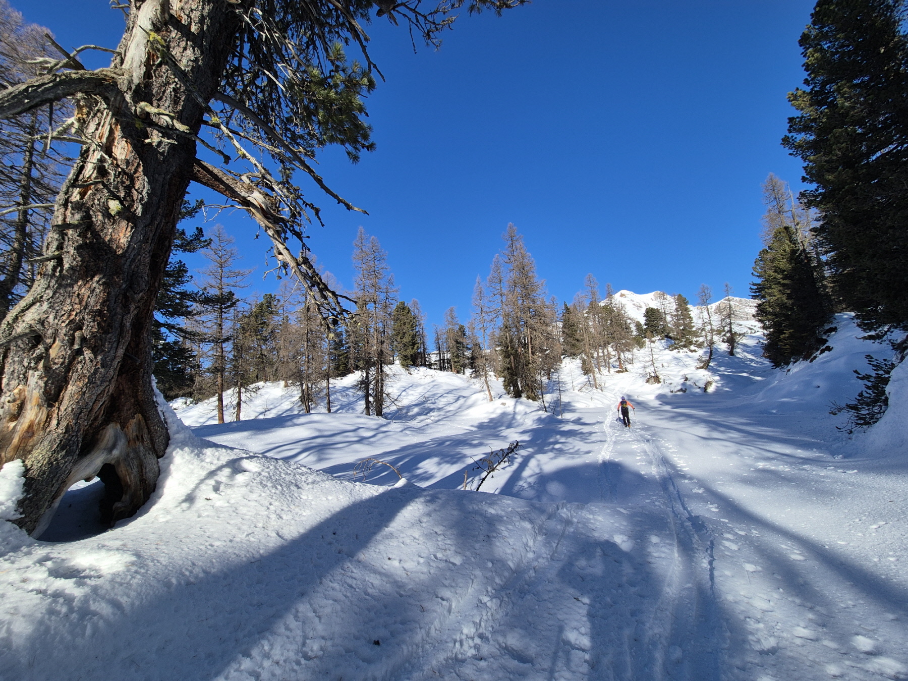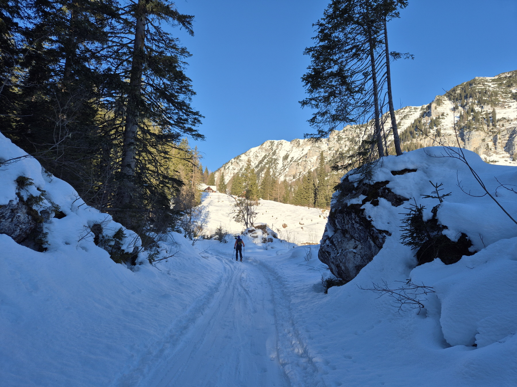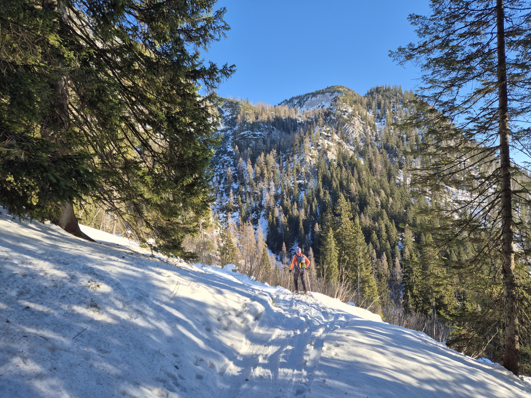 Am Rand des zugeschneiten kleinen Sees haben wir die Felle wieder aufgezogen und sind über den nächsten Rücken angestiegen. Gleich danach ging es genauso weit wieder hinunter. Das haben wir gleich auf Fellen erledigt. Anschließend sind wir ca. 10 Minuten lang immer dem Bachlauf gefolgt bis wir auf die schon beim Anstieg auf den Querlstein ausgemachte Spur hinauf in Richtung Kleinmölbing gestoßen sind.