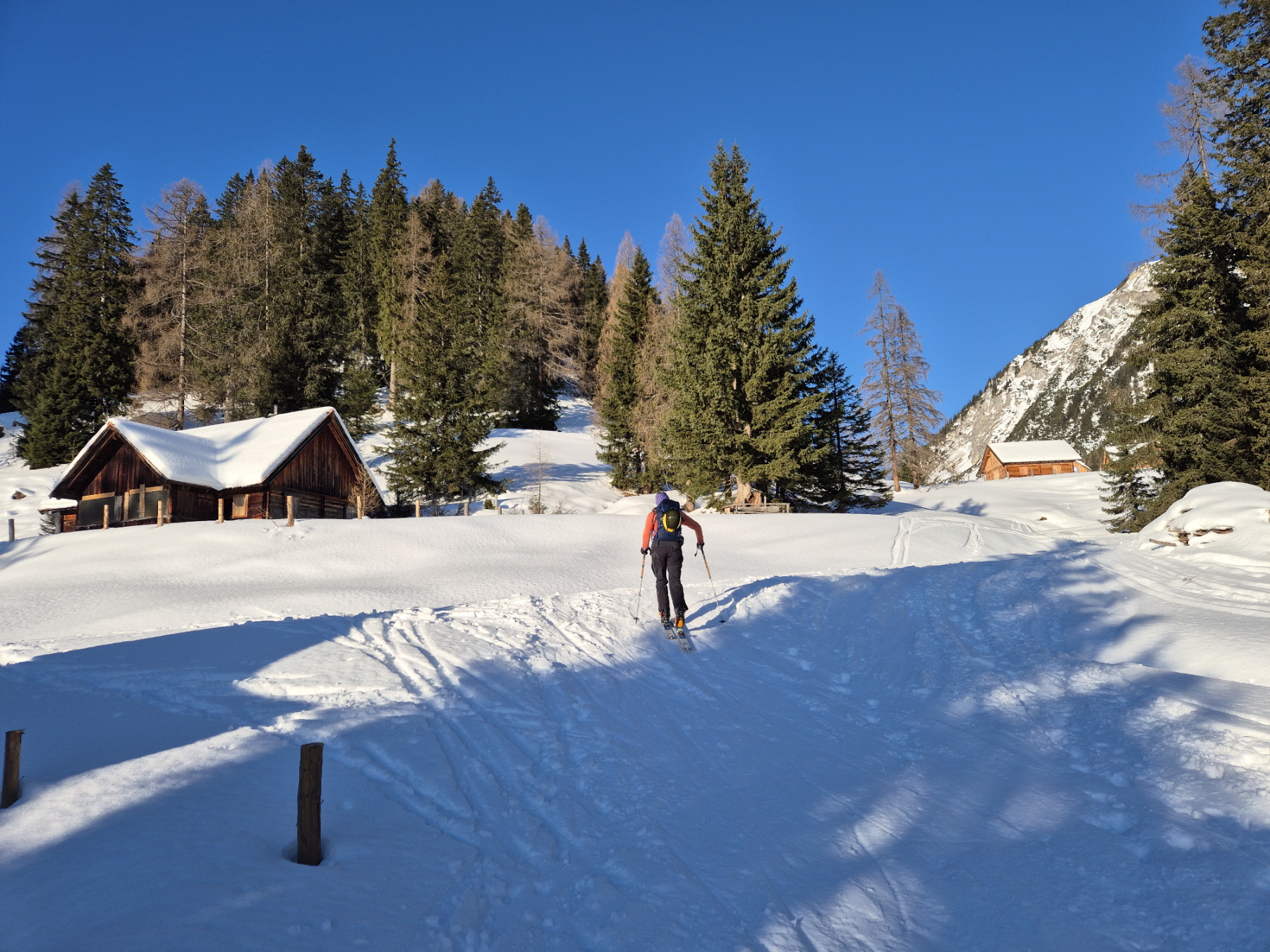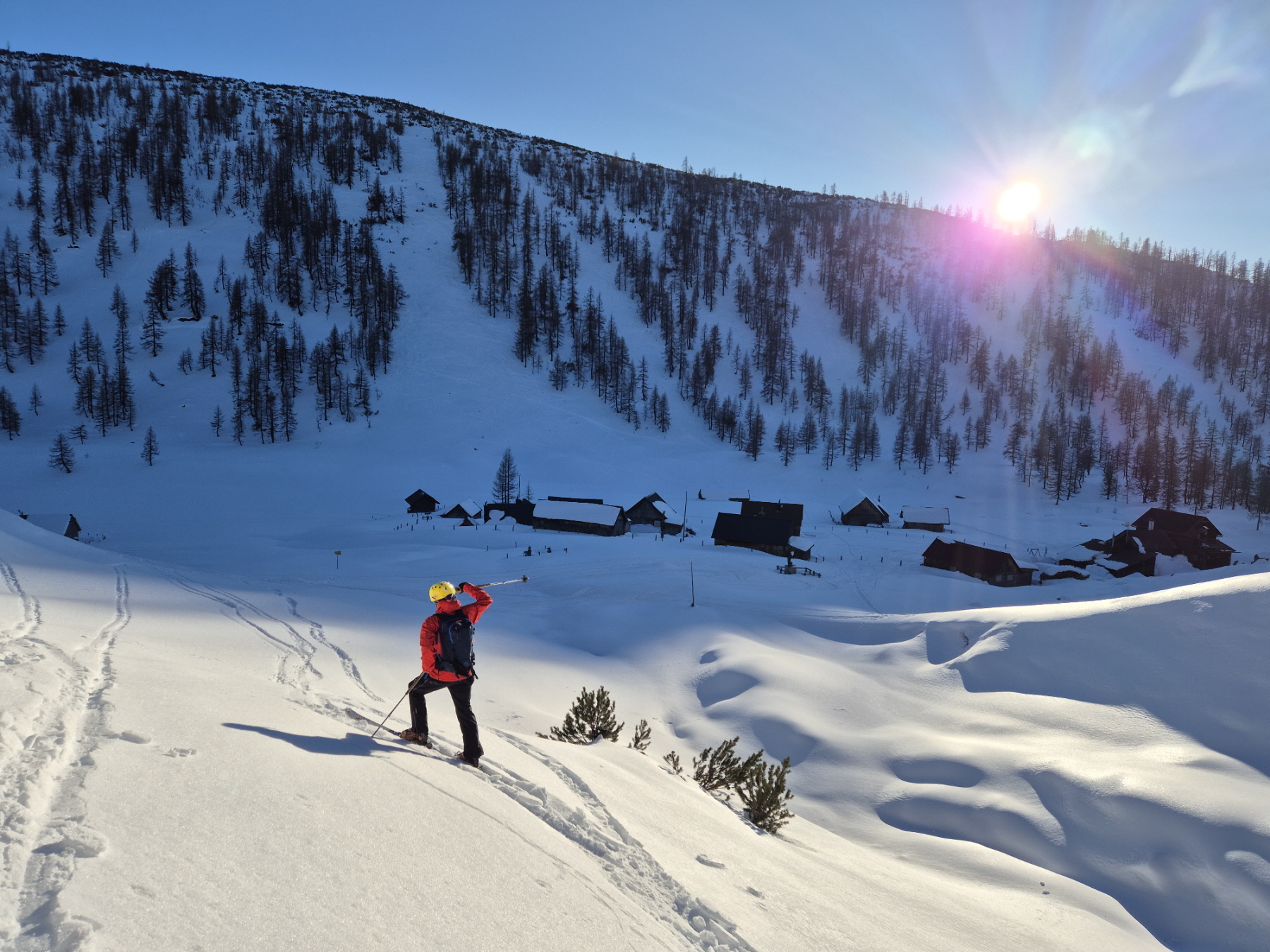 Dieser sind wir jetzt anfangs in nordwestlicher Richtung, danach in Richtung Südwesten so lange gefolgt, bis wir auf die Aufstiegsroute von der Hochmölbinghütte gestoßen sind. Jetzt durften die Felle wieder in den Rucksack und wir sind den vorhanden Abfahrtspuren gegen die schon sehr tief stehende Sonne gefolgt. Entlang des nördlicheren Weges am Kirchfeld sind wir durch stellenweise brüchigen Harsch rasch abgefahren. Schließlich ging es hinunter in die Schlucht und durch diese nach Süden drehend zum Hüttendorf auf der Niederhüttenalm mit der Hochmölbinghütte an dessen westlichem Rand.