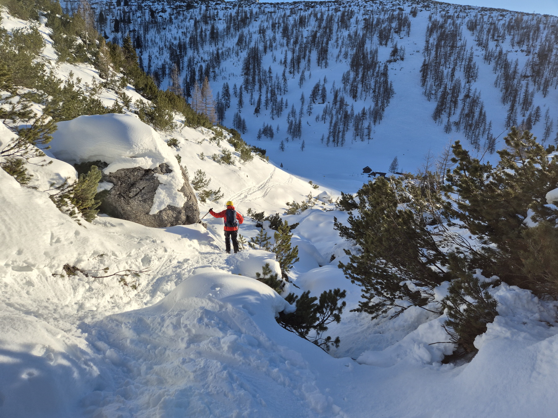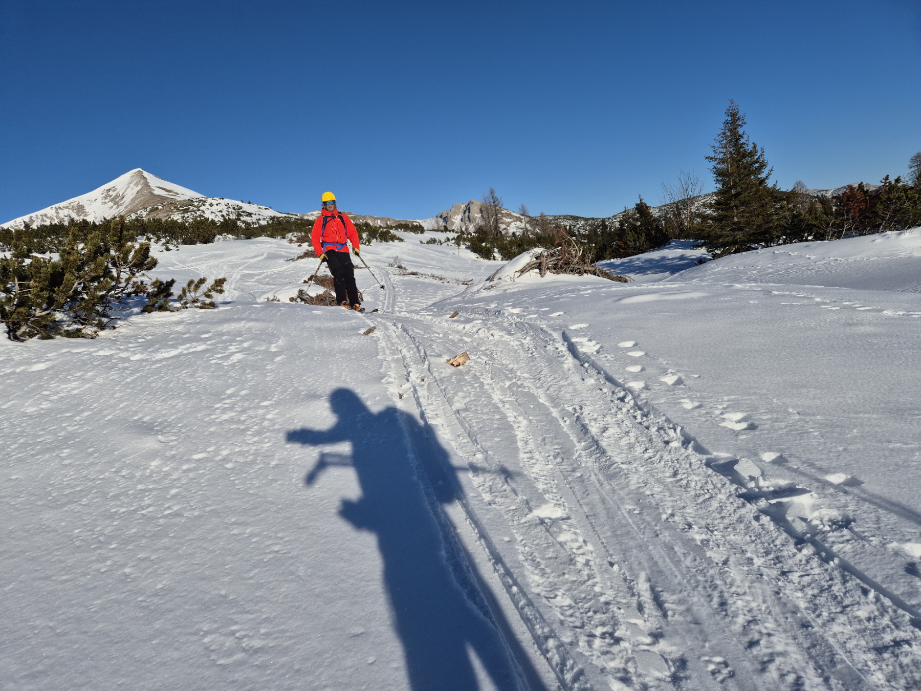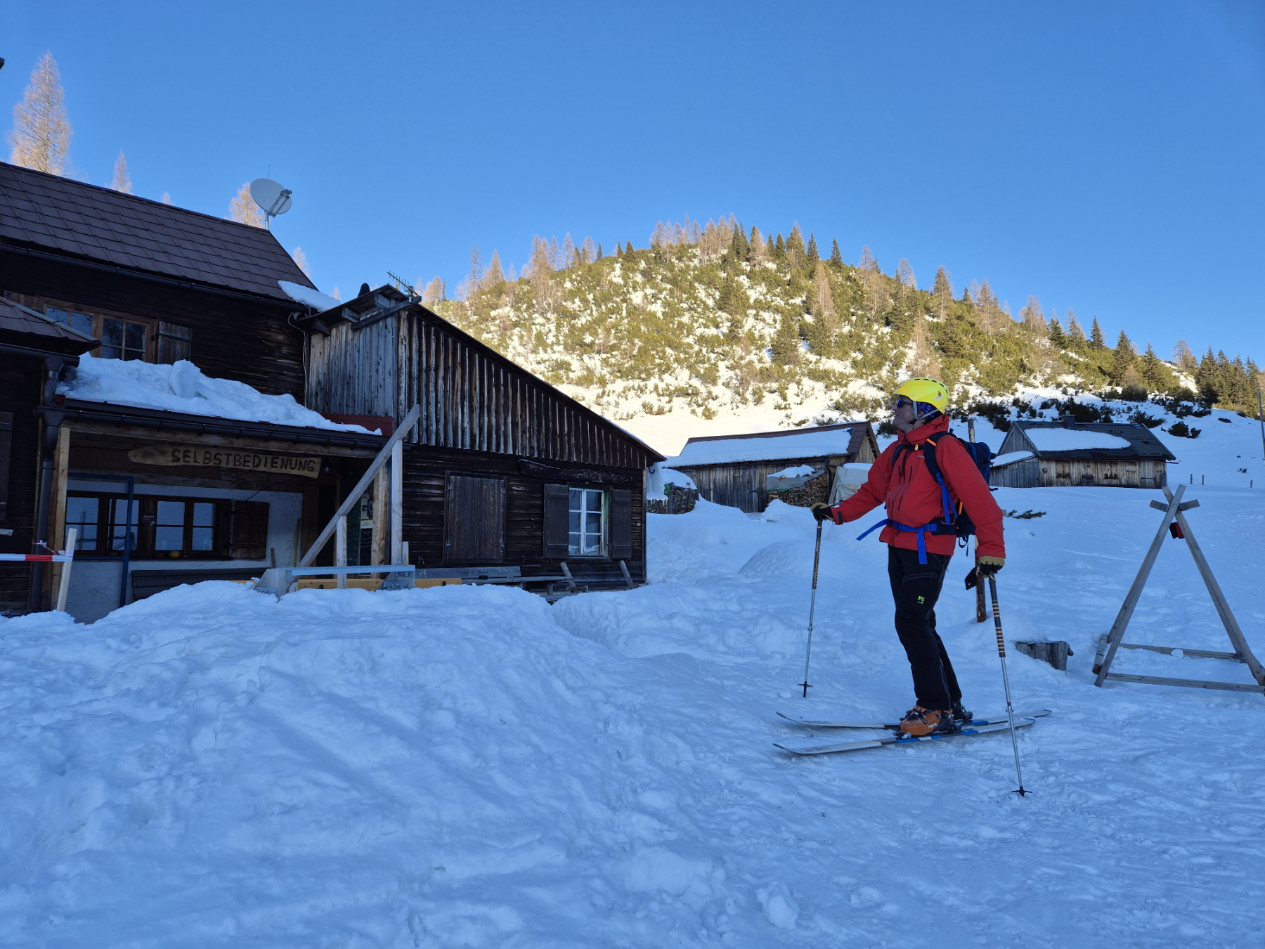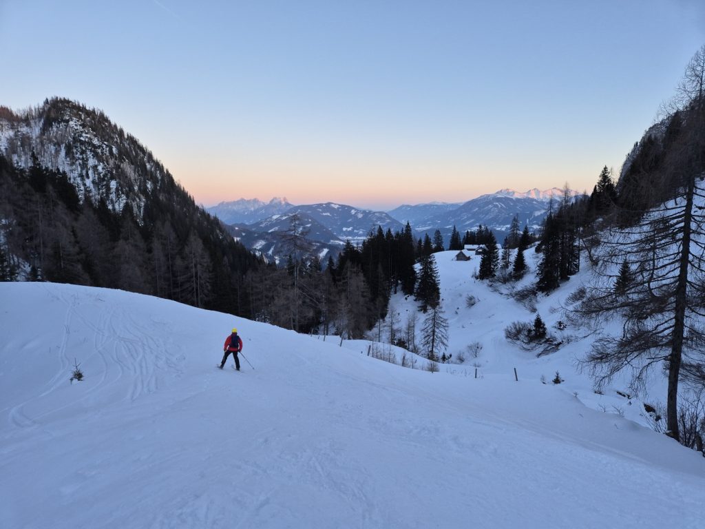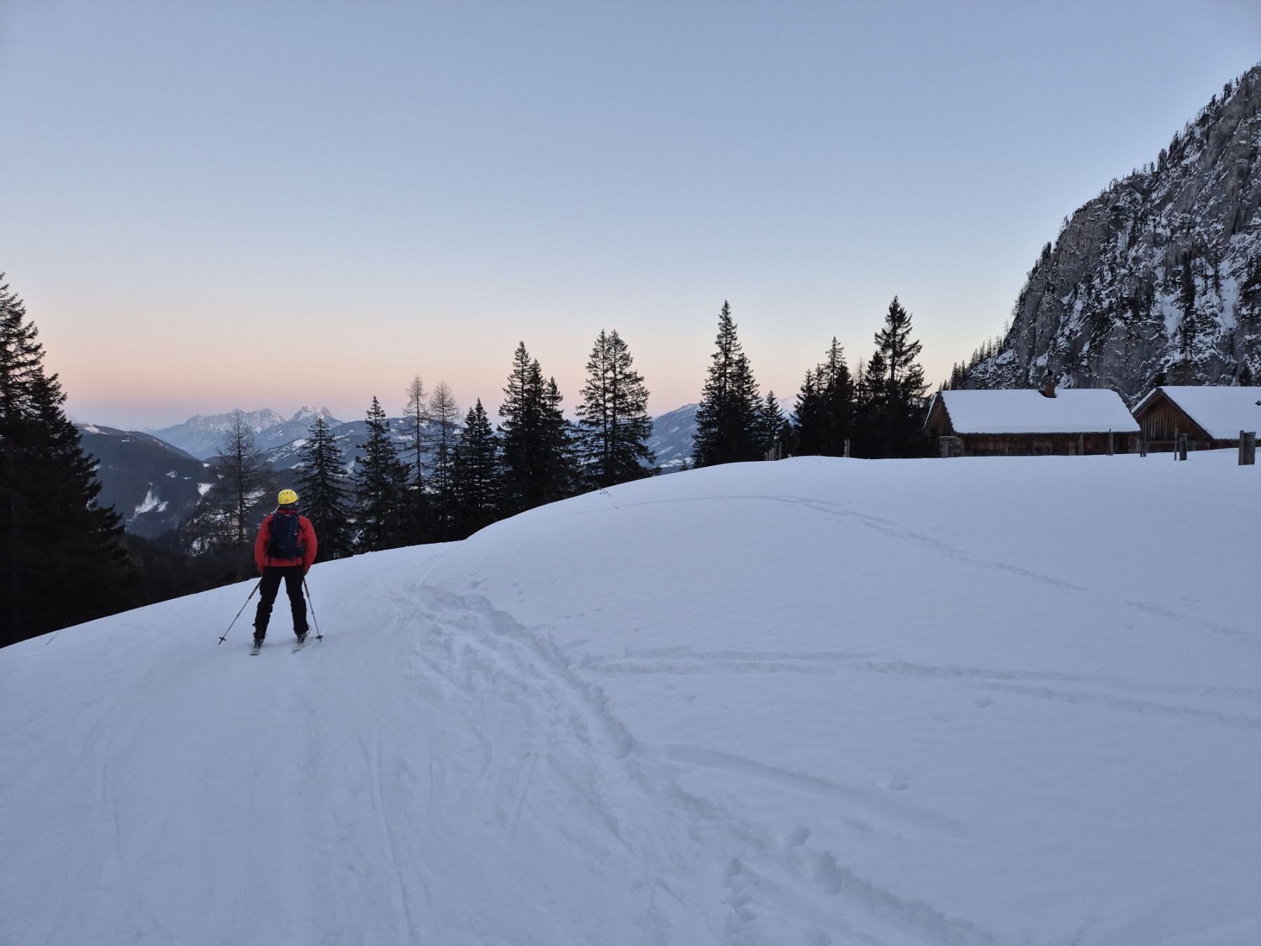 Dass die folgende Abfahrt zur Langpoltenalm entlang des Grazersteigs durchwegs sehr schmal sein würde, war uns bewusst. Dass sie aber größtenteils auch sehr eisig war, war wohl dem Umstand geschuldet, dass am vergangenen Wochenende ca. 250 Gäste auf der Hochmölbinghütte gewesen waren, wie uns der Hüttenwirt erzählt hatte. Und die hatten bei ihrer Abfahrt diesen Bereich ordentlich glatt gehobelt. Die tagsüber einstrahlende Sonne hatte auch ihren Anteil beigetragen. Und mit der hereinbrechenden Dämmerung hatte es bereits wieder ordentlich angezogen.