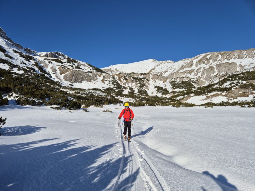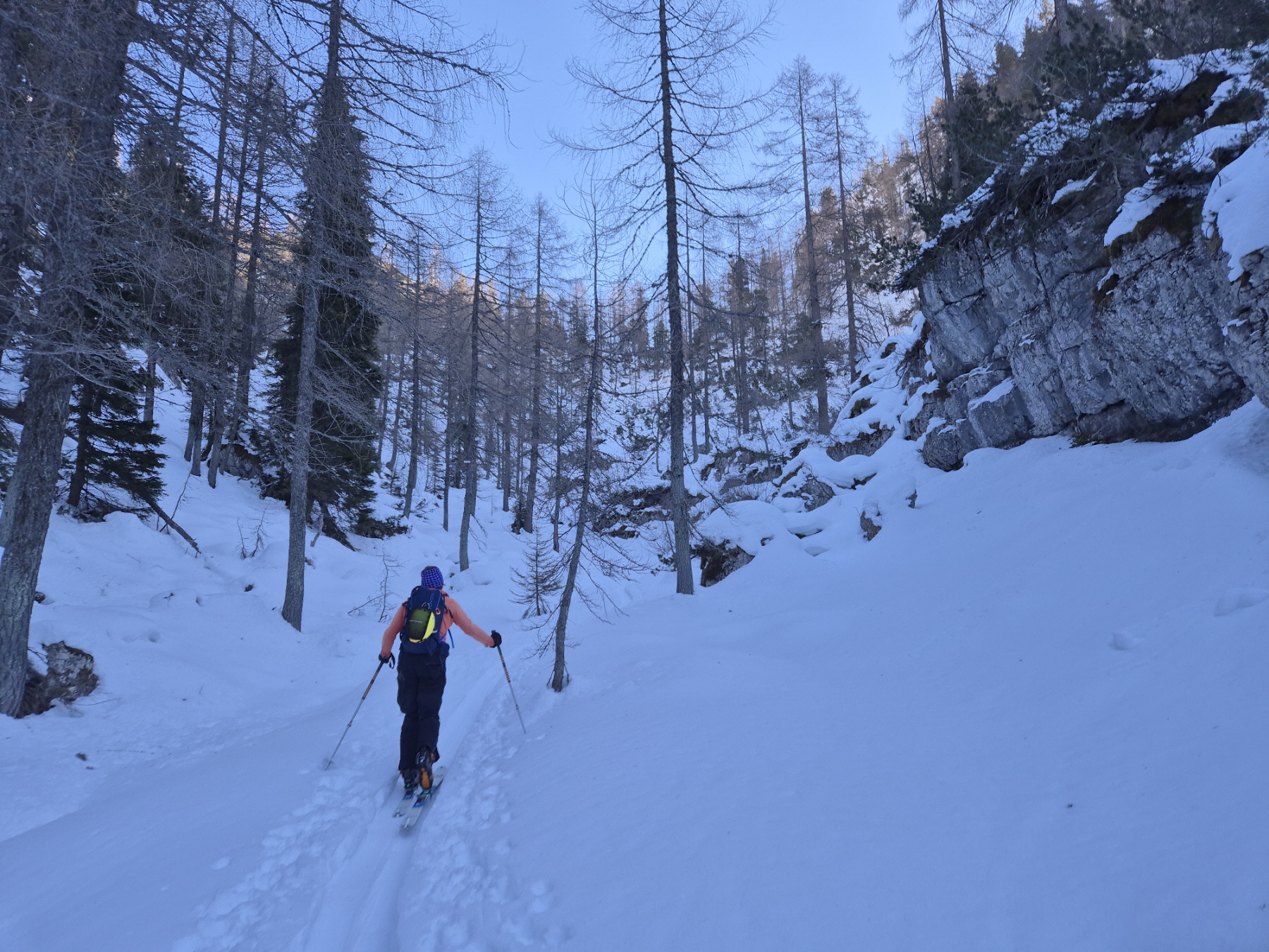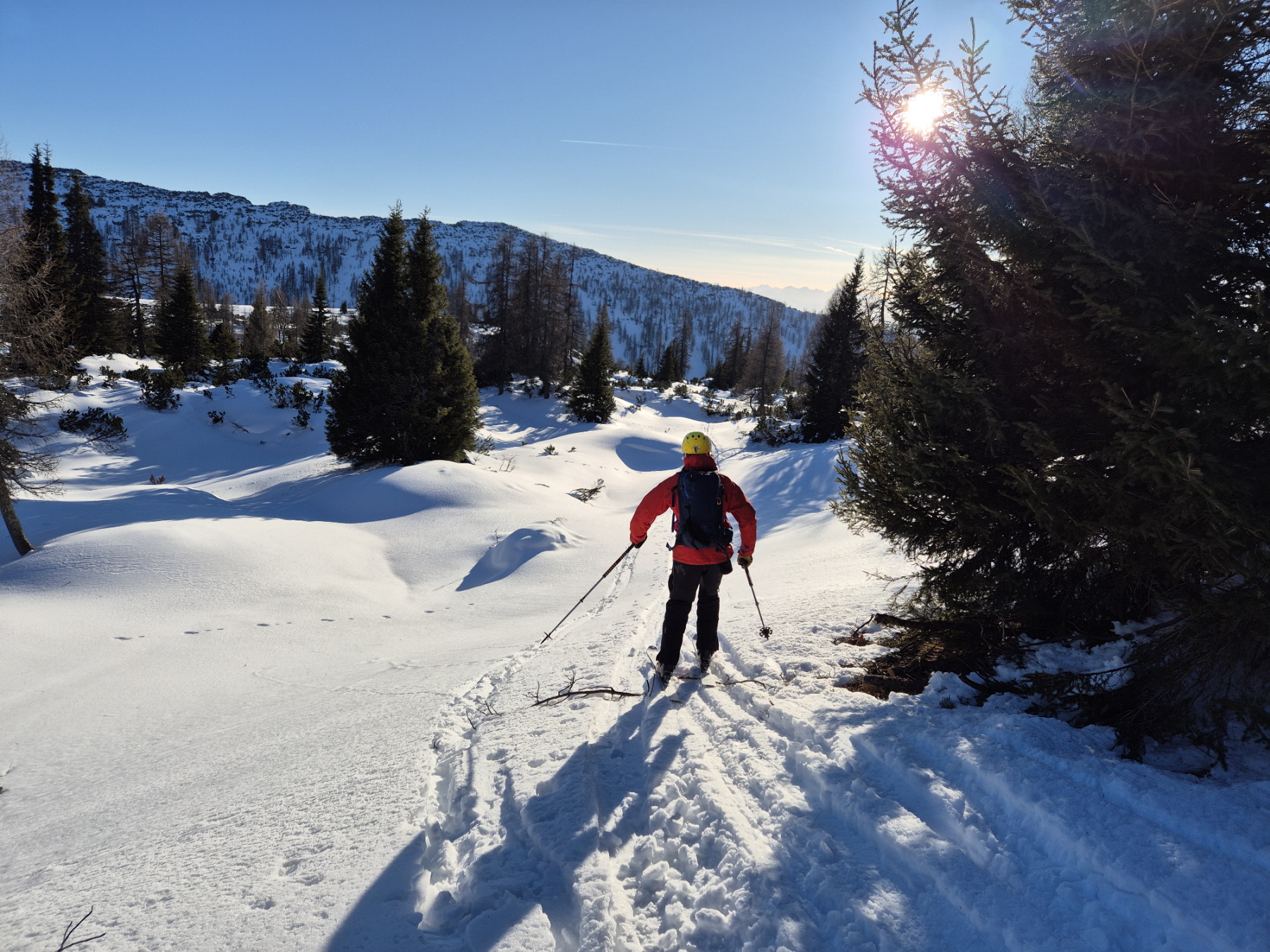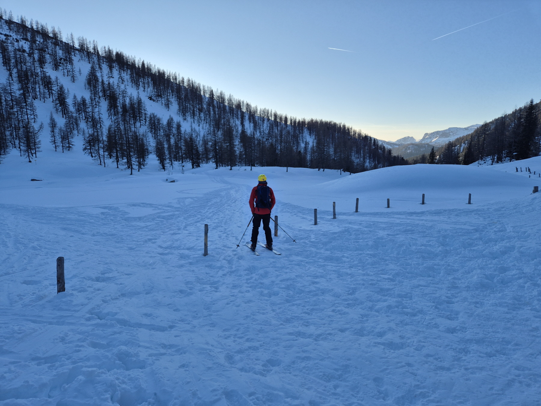 Dass die folgende Abfahrt zur Langpoltenalm entlang des Grazersteigs durchwegs sehr schmal sein würde, war uns bewusst. Dass sie aber größtenteils auch sehr eisig war, war wohl dem Umstand geschuldet, dass am vergangenen Wochenende ca. 250 Gäste auf der Hochmölbinghütte gewesen waren, wie uns der Hüttenwirt erzählt hatte. Und die hatten bei ihrer Abfahrt diesen Bereich ordentlich glatt gehobelt. Die tagsüber einstrahlende Sonne hatte auch ihren Anteil beigetragen. Und mit der hereinbrechenden Dämmerung hatte es bereits wieder ordentlich angezogen.