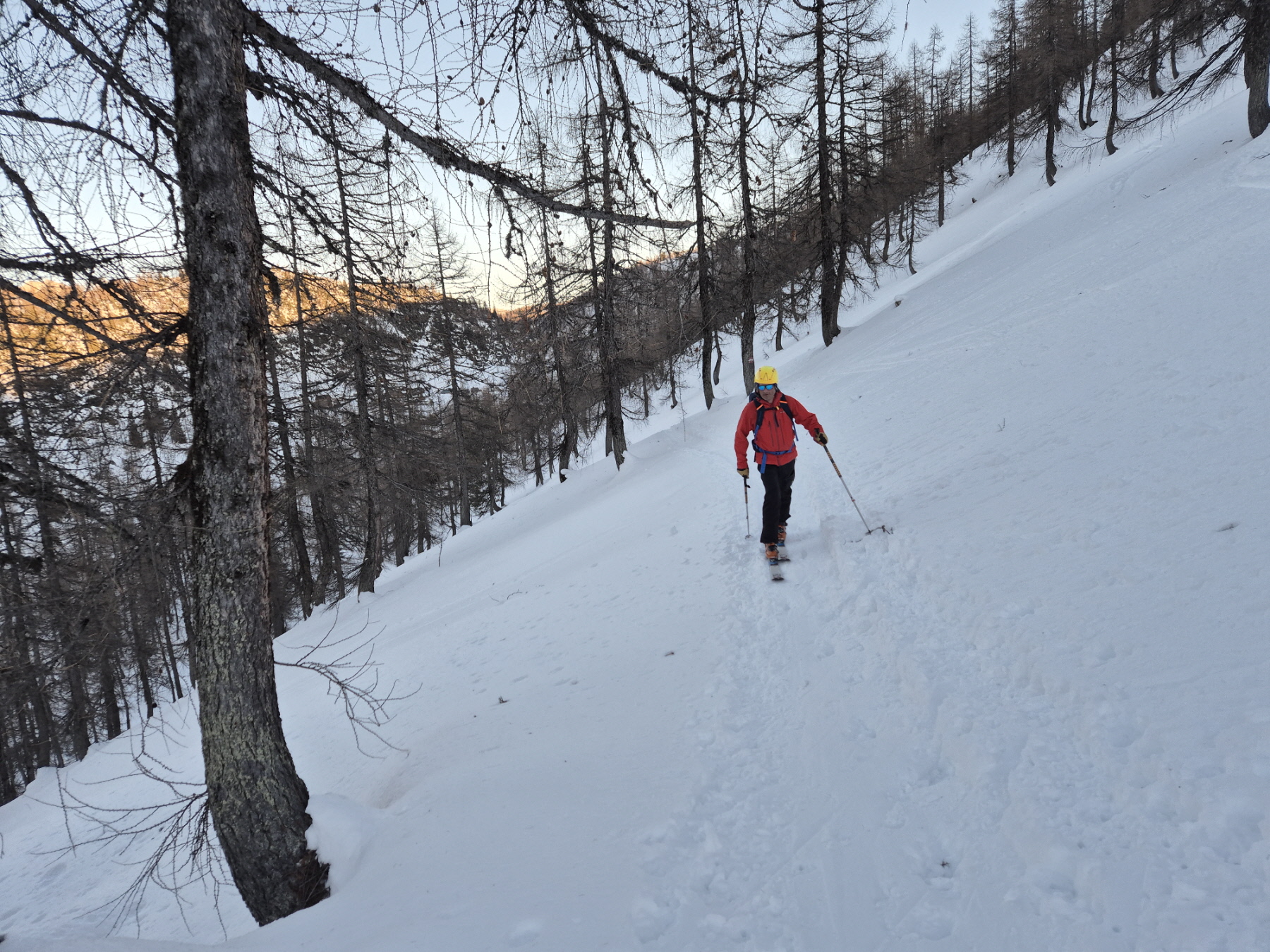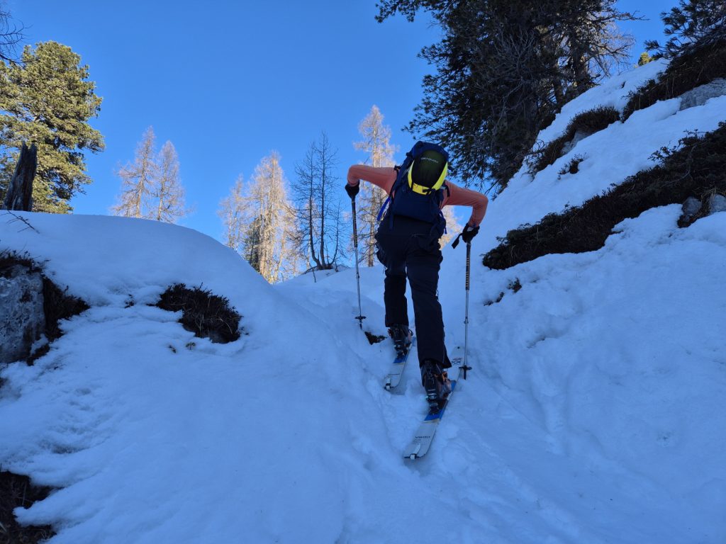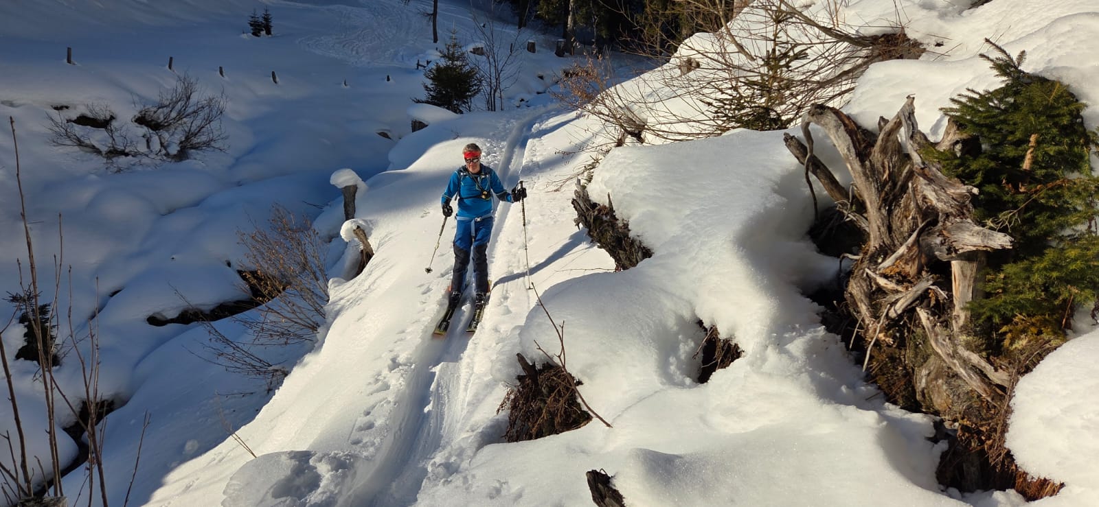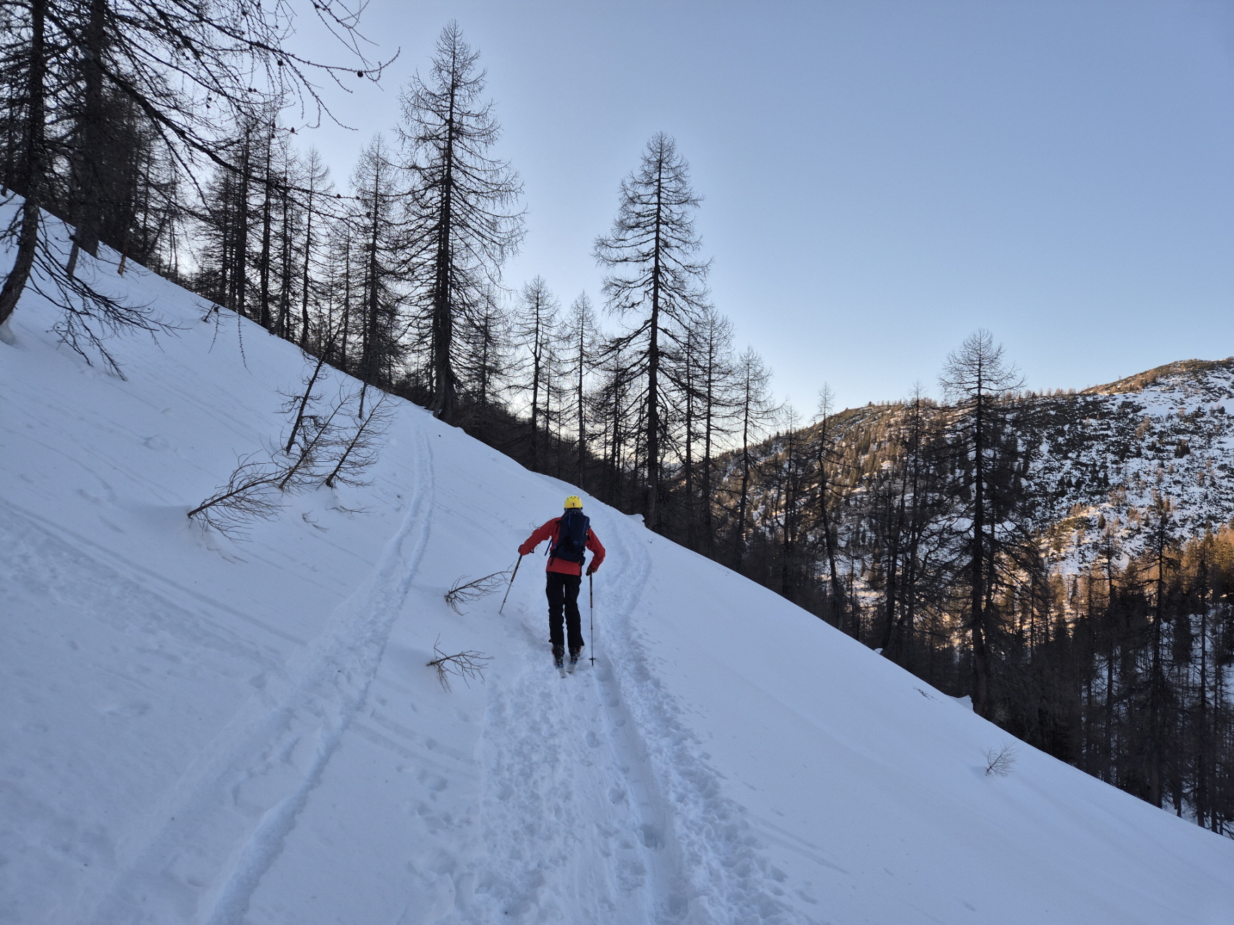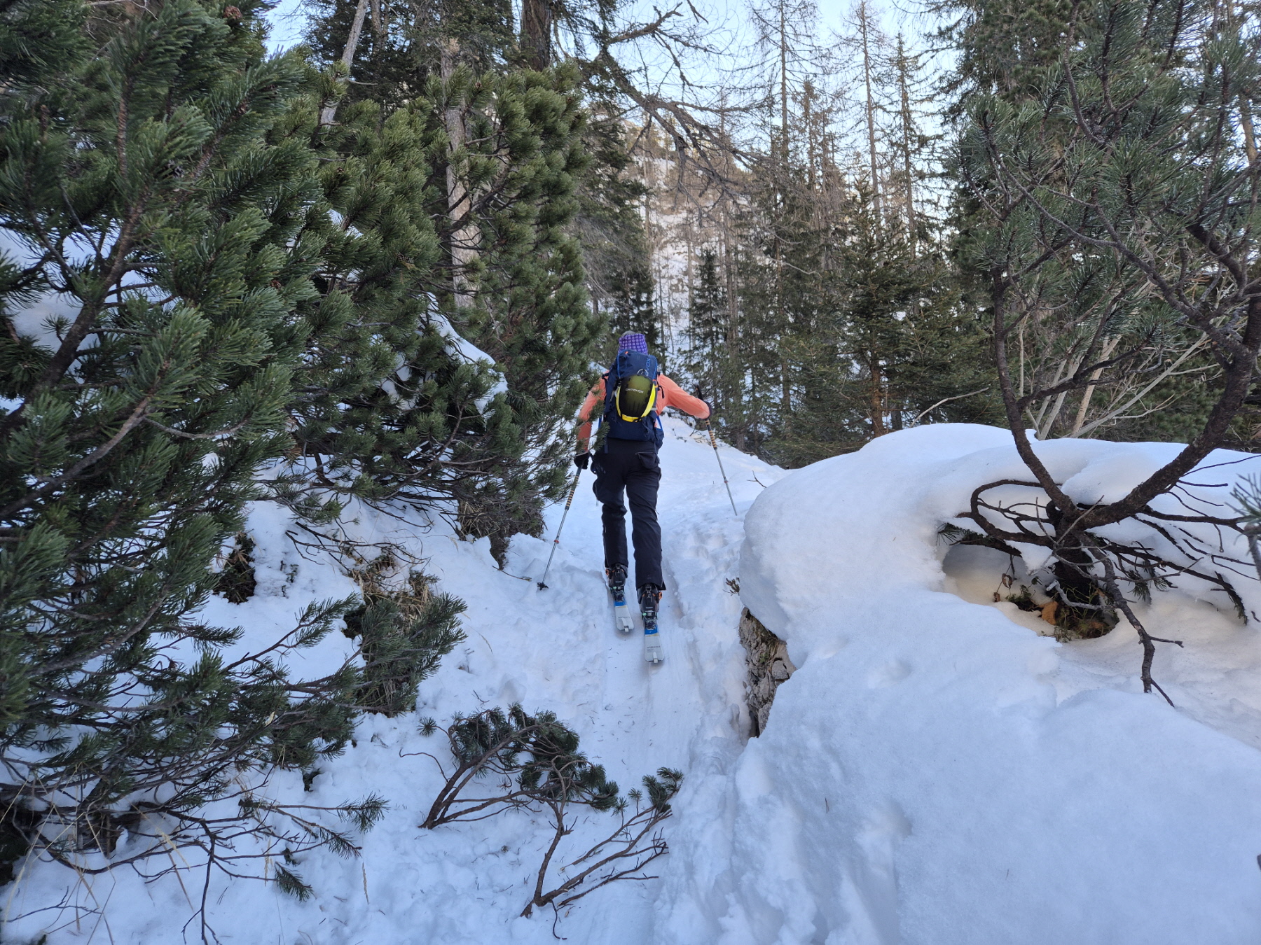 Dass die folgende Abfahrt zur Langpoltenalm entlang des Grazersteigs durchwegs sehr schmal sein würde, war uns bewusst. Dass sie aber größtenteils auch sehr eisig war, war wohl dem Umstand geschuldet, dass am vergangenen Wochenende ca. 250 Gäste auf der Hochmölbinghütte gewesen waren, wie uns der Hüttenwirt erzählt hatte. Und die hatten bei ihrer Abfahrt diesen Bereich ordentlich glatt gehobelt. Die tagsüber einstrahlende Sonne hatte auch ihren Anteil beigetragen. Und mit der hereinbrechenden Dämmerung hatte es bereits wieder ordentlich angezogen.