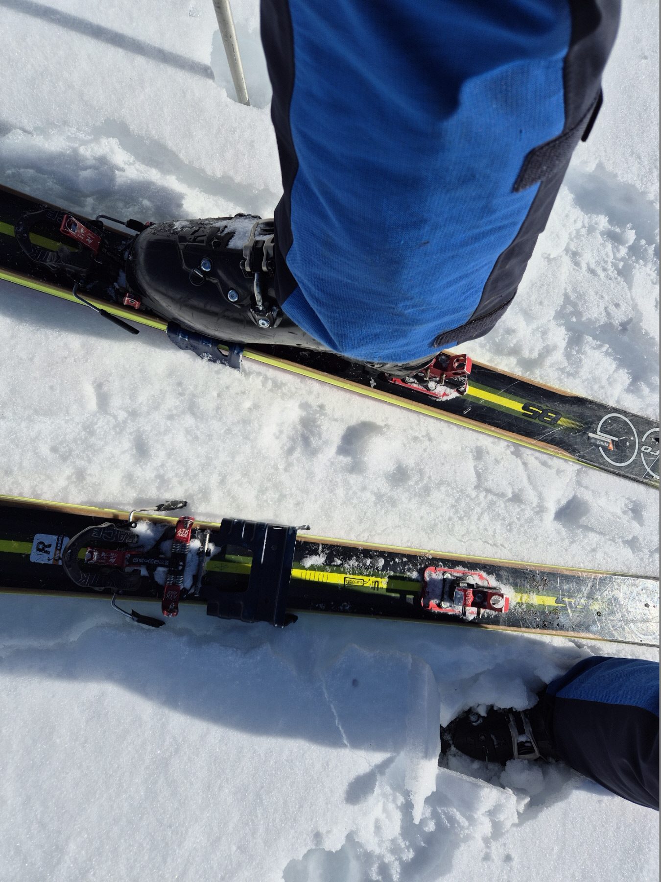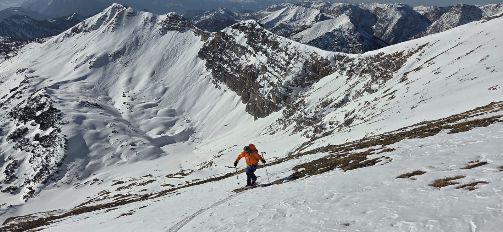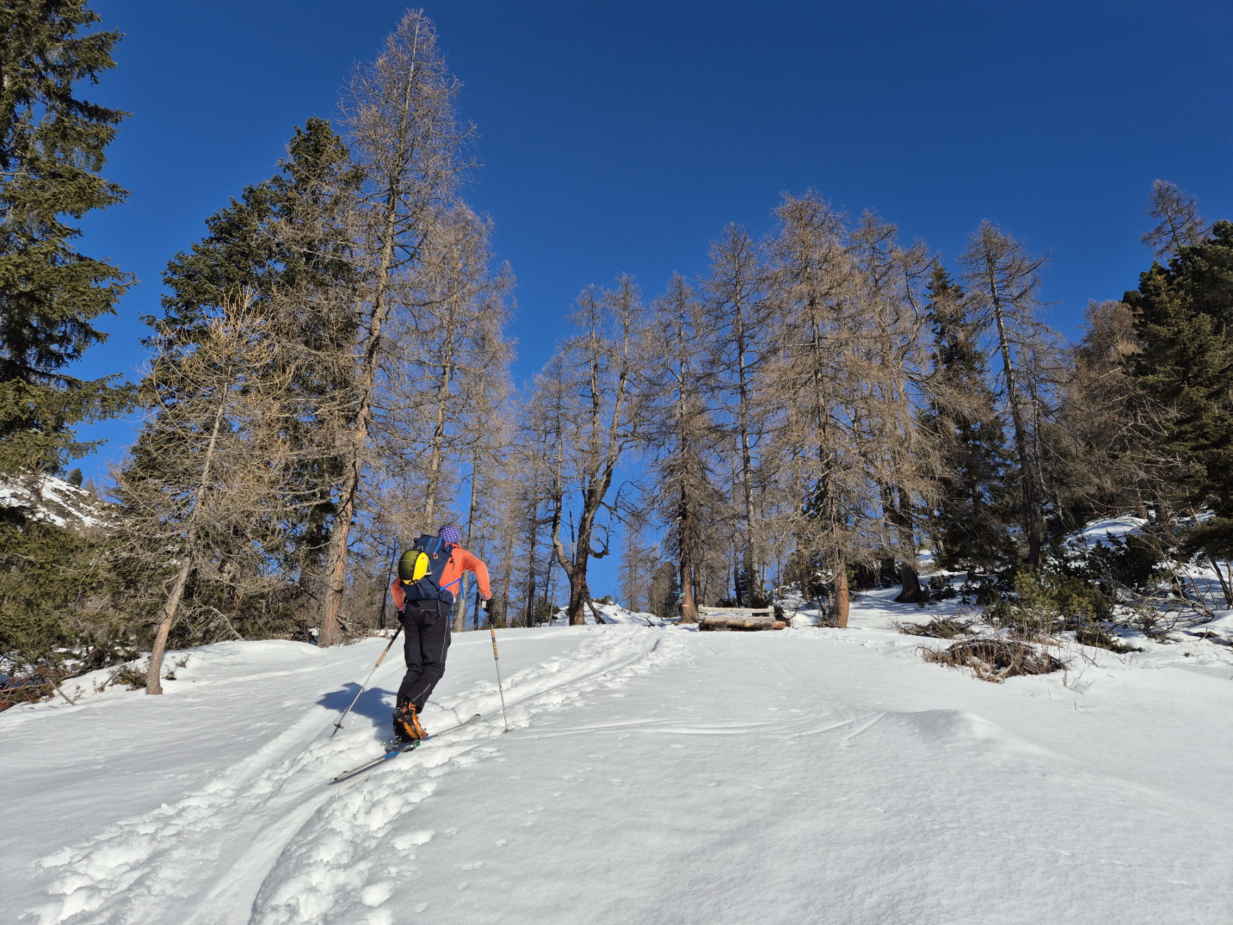 Mit dem Beginn des Kehrengeländes waren die Harscheisen in der glasigen Spur abermals gefordert. Mit zunehmender Höhe und dem Wechsel der Exposition auf Ost hat der kalte Wind stark zugelegt. Der war zwar auch prognostiziert, aber wir hatten uns eher auf den auch angesagten Südföhn verlassen. Der hatte aber gegen den kalten Kontinentalwind keine Chance. Erst einmal haben wir uns mit dem Ergänzen der Oberbekleidung am Speikboden dagegen gewappnet.