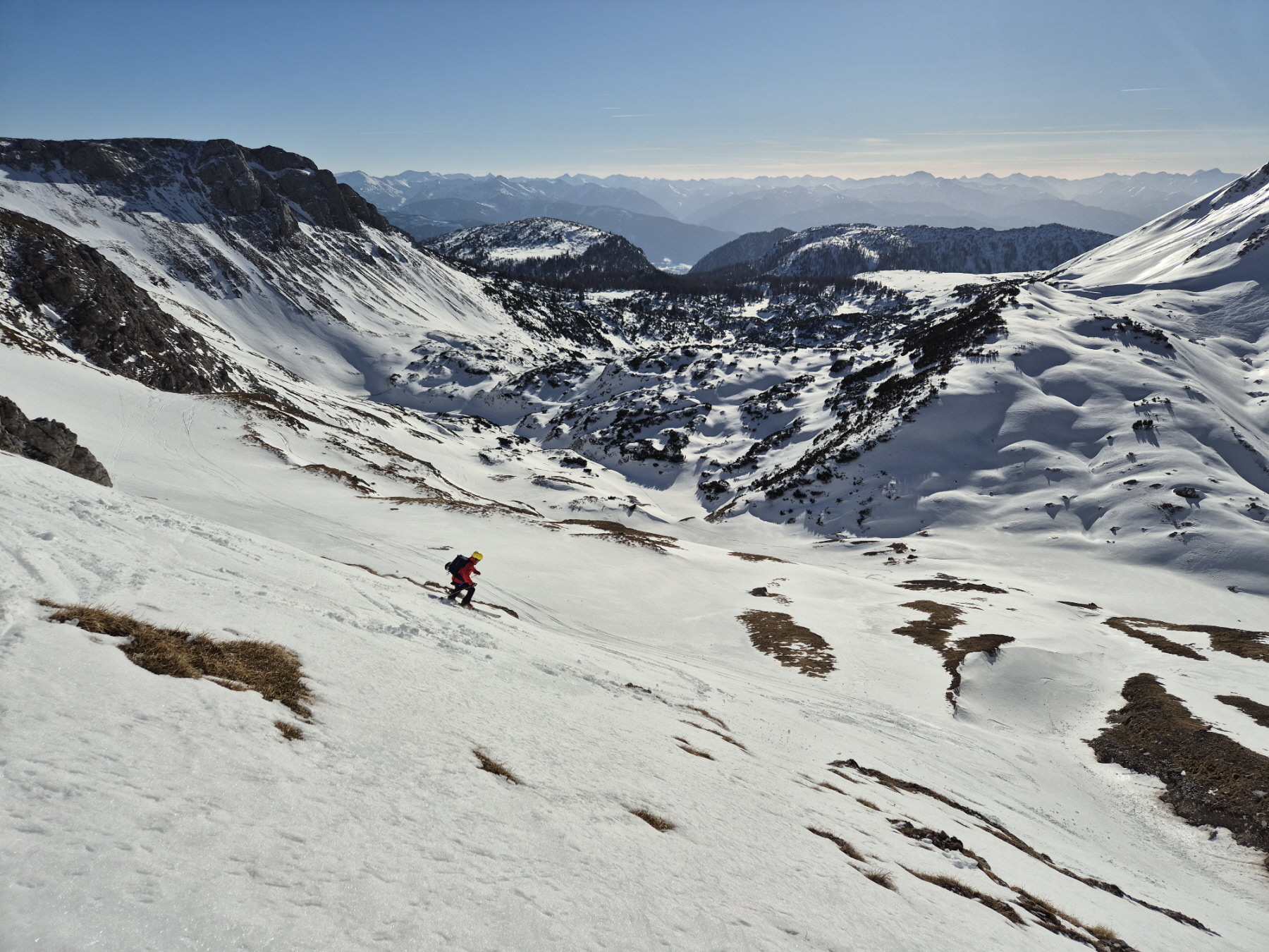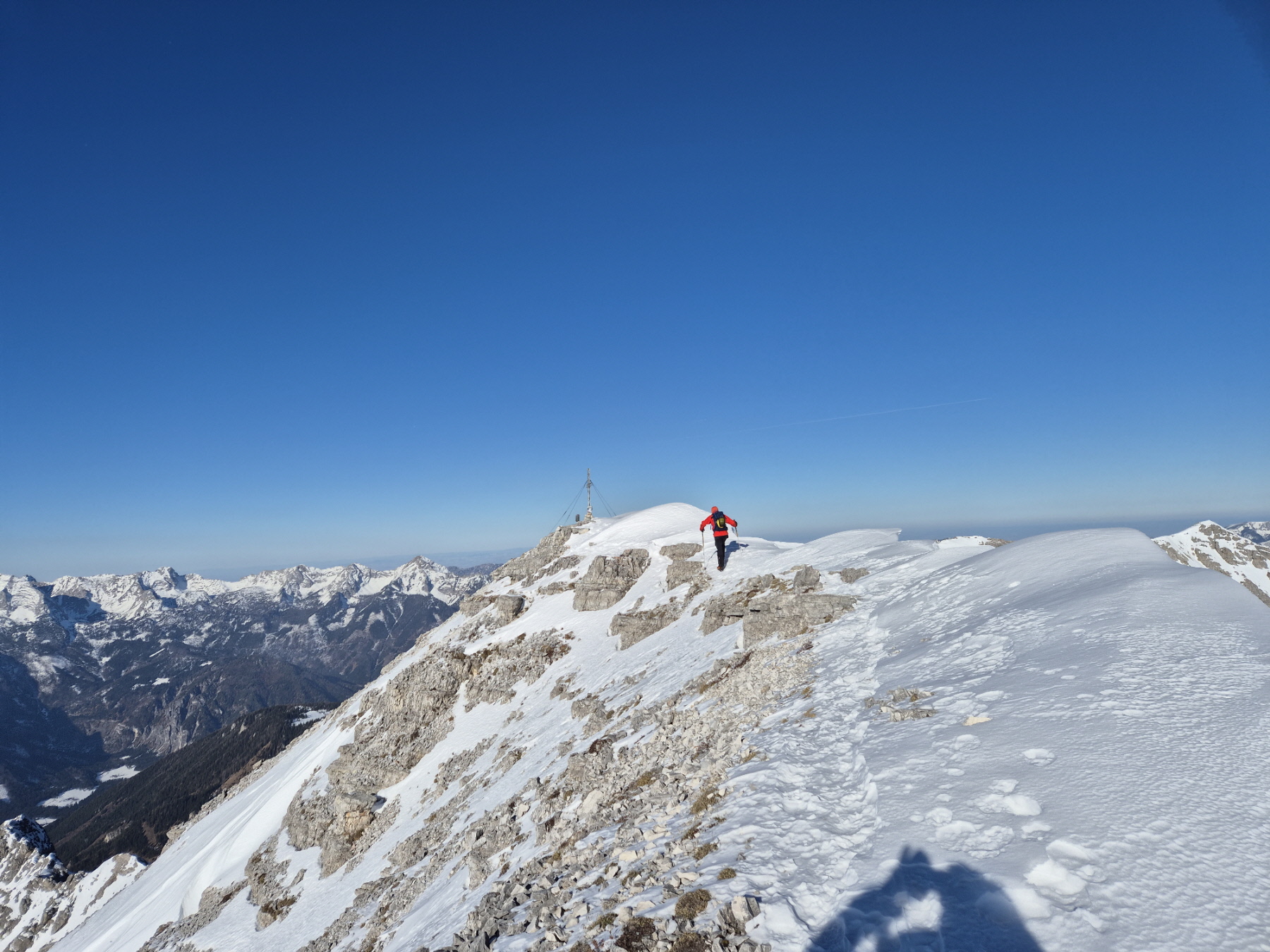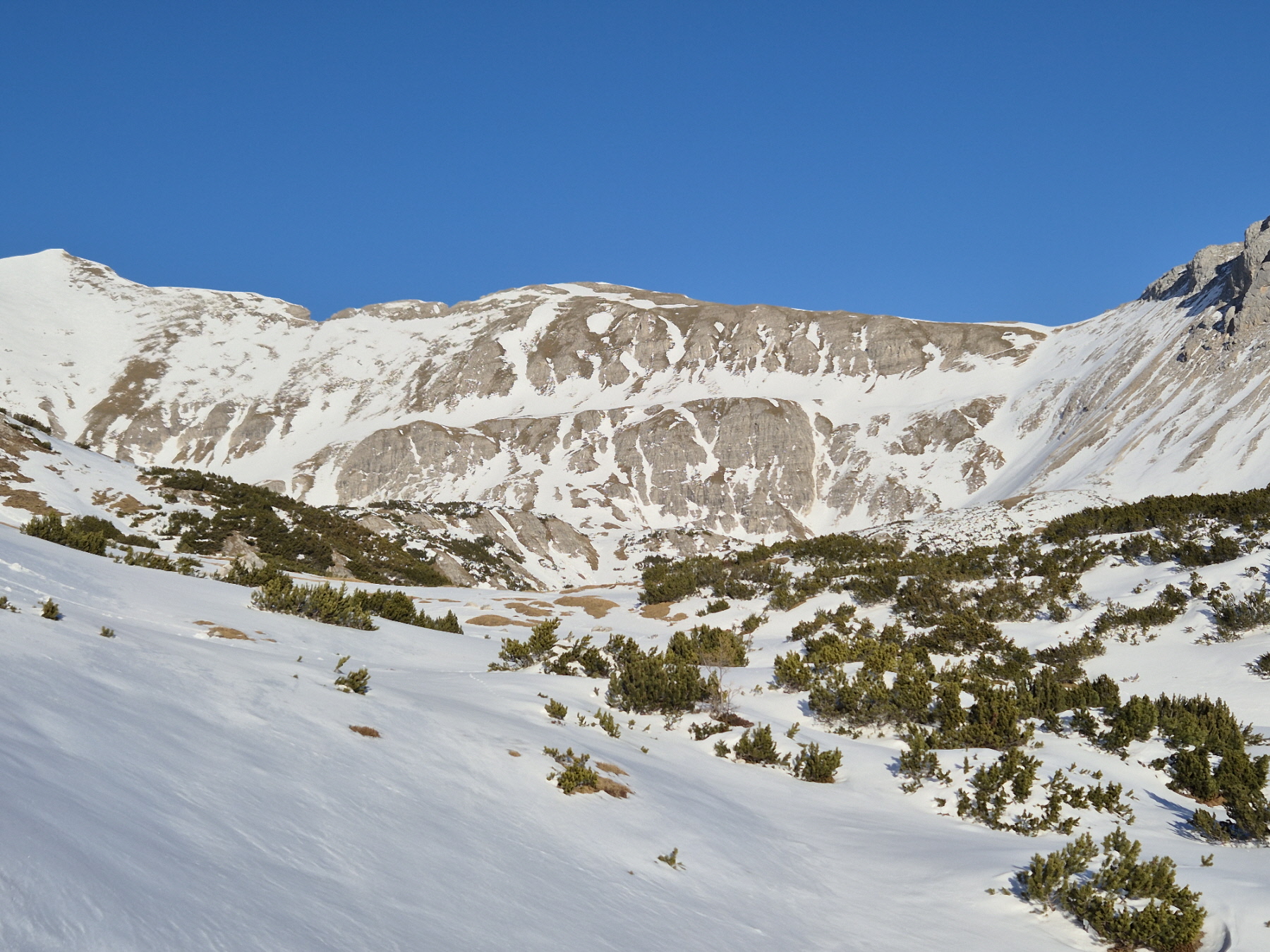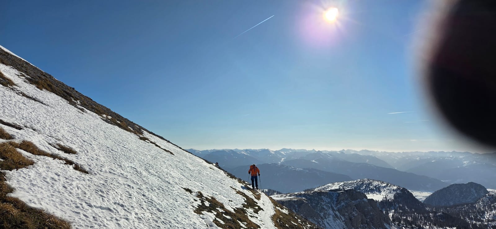 Dann haben wir uns entlang des Steiges, auf dem stellenweise die Schneeauflage komplett gefehlt hat, in die lange, ansteigende Querung hin zum Mittermölbing begeben. Dort wo es eine Schneeauflage gab, war diese hart bis eisig. Mit dem Wissen um das Absturzgelände unter uns war daher jeder Schritt mit Bedacht zu setzen. Im steiler werdenden Schlussanstieg habe ich zur Sicherheit die Steighilfe daher komplett ausgeschalten.