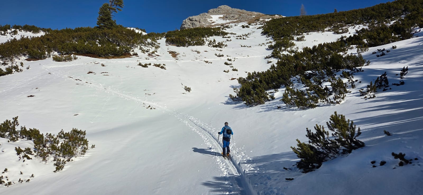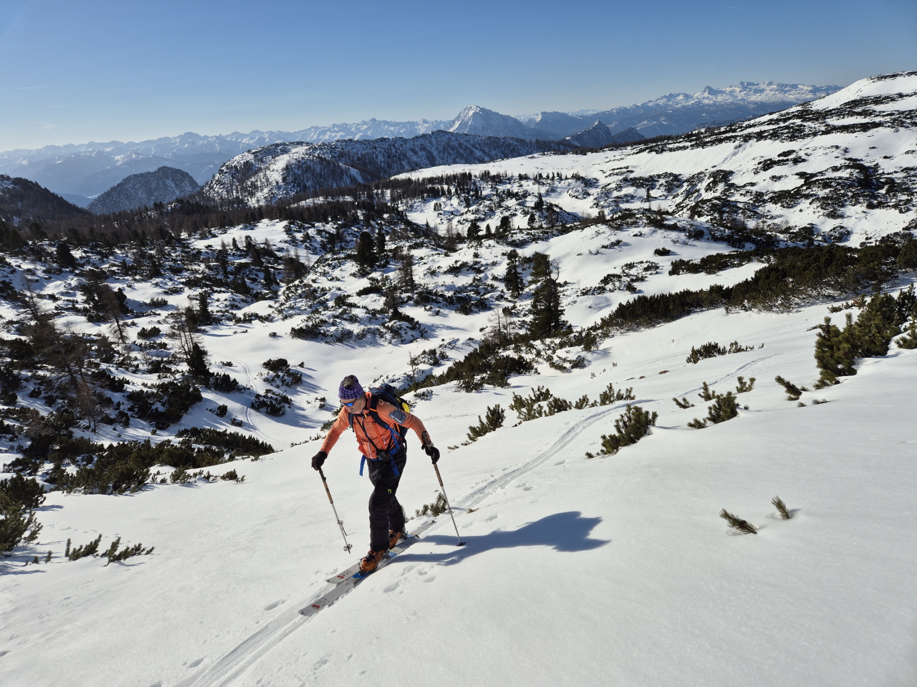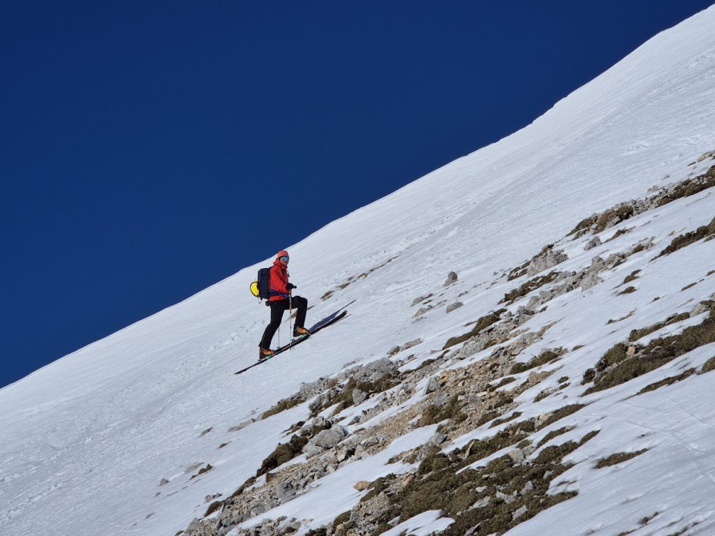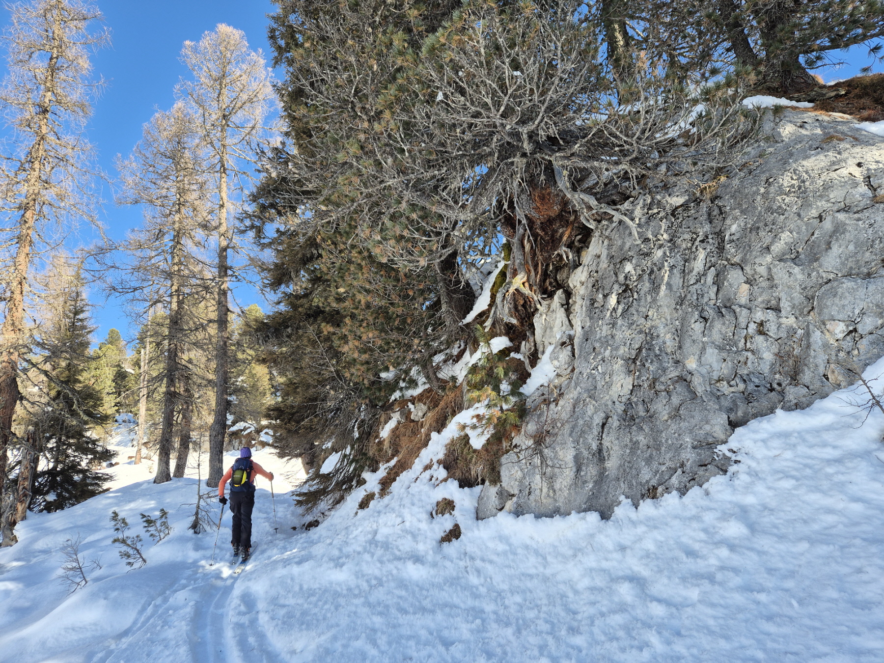 Dann haben wir uns entlang des Steiges, auf dem stellenweise die Schneeauflage komplett gefehlt hat, in die lange, ansteigende Querung hin zum Mittermölbing begeben. Dort wo es eine Schneeauflage gab, war diese hart bis eisig. Mit dem Wissen um das Absturzgelände unter uns war daher jeder Schritt mit Bedacht zu setzen. Im steiler werdenden Schlussanstieg habe ich zur Sicherheit die Steighilfe daher komplett ausgeschalten.