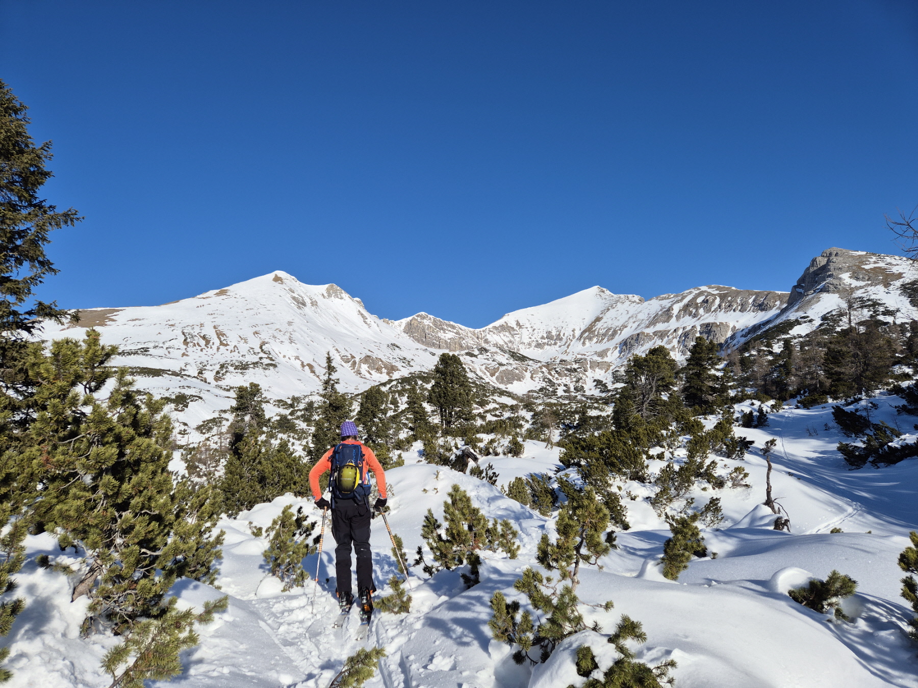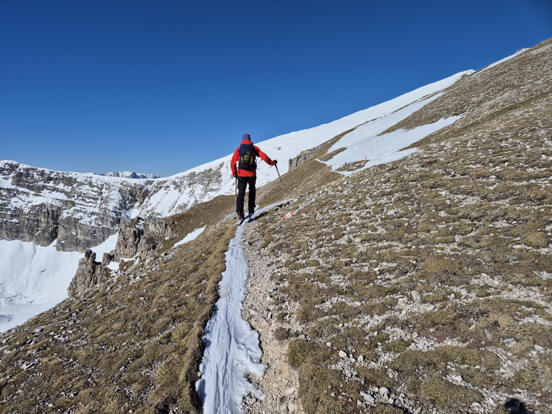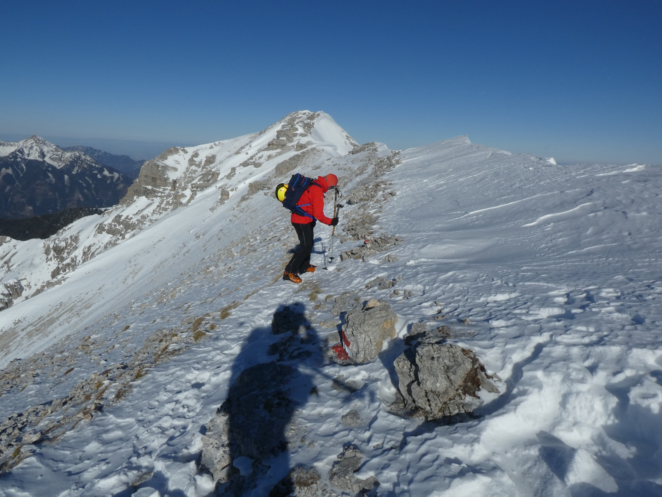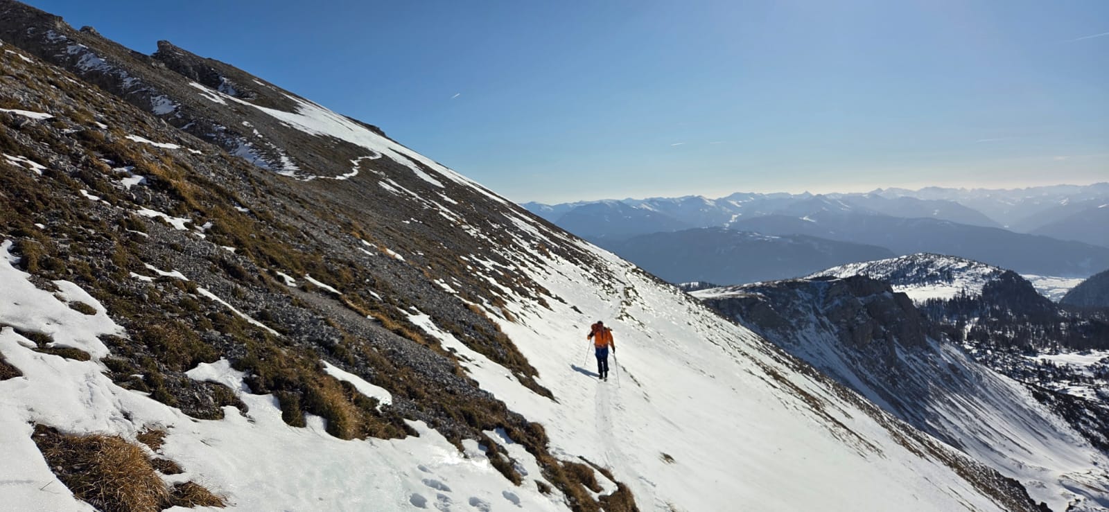 Dann haben wir uns entlang des Steiges, auf dem stellenweise die Schneeauflage komplett gefehlt hat, in die lange, ansteigende Querung hin zum Mittermölbing begeben. Dort wo es eine Schneeauflage gab, war diese hart bis eisig. Mit dem Wissen um das Absturzgelände unter uns war daher jeder Schritt mit Bedacht zu setzen. Im steiler werdenden Schlussanstieg habe ich zur Sicherheit die Steighilfe daher komplett ausgeschalten.