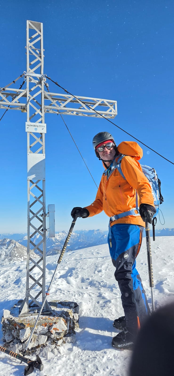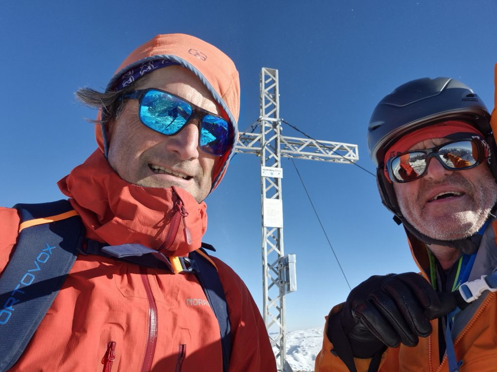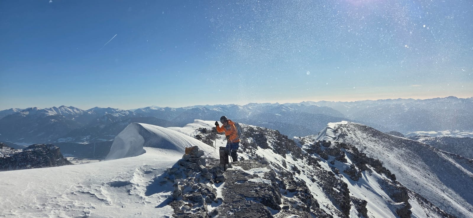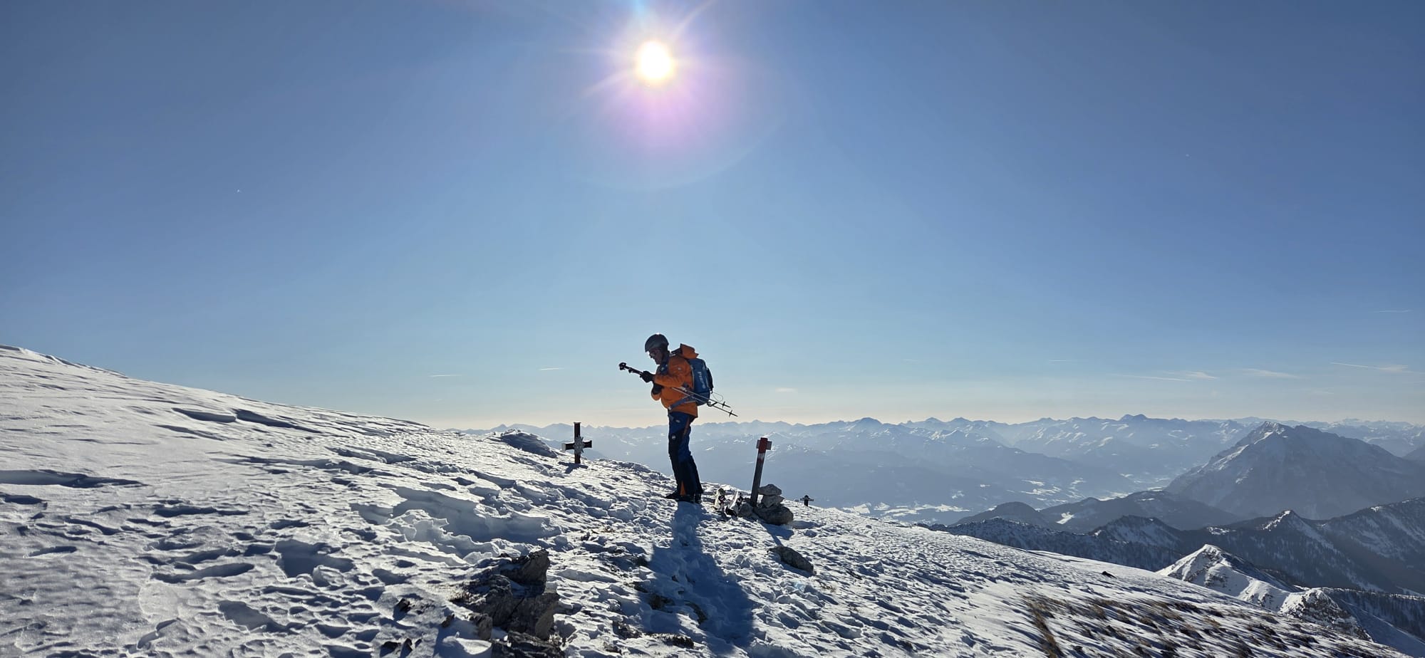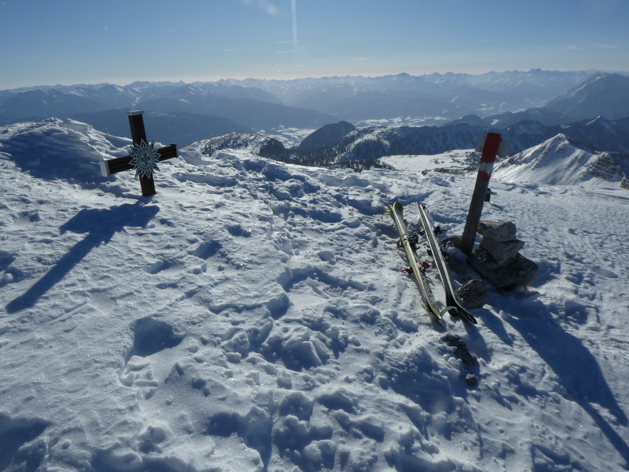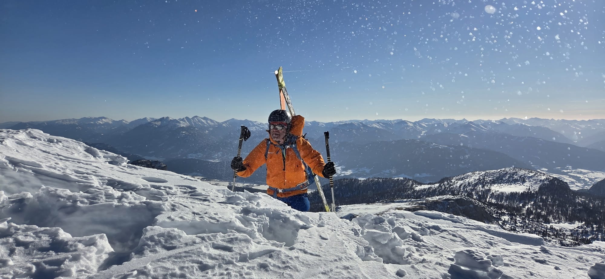 Die letzten Kehren in der Steilflanke unter dem Mittermölbing, dem Gampenkaster, haben uns gezeigt, dass das erhoffte Auffirnen auch hier durch den kalten Wind vereitelt wurde. Im abgeblasenen Steilgelände neben der Flanke haben wir auf den letzten Metern den Anstieg mit aufgepackten Skiern beendet. Neben dem keinen Gipfelkreuz haben wir die Skier deponiert.