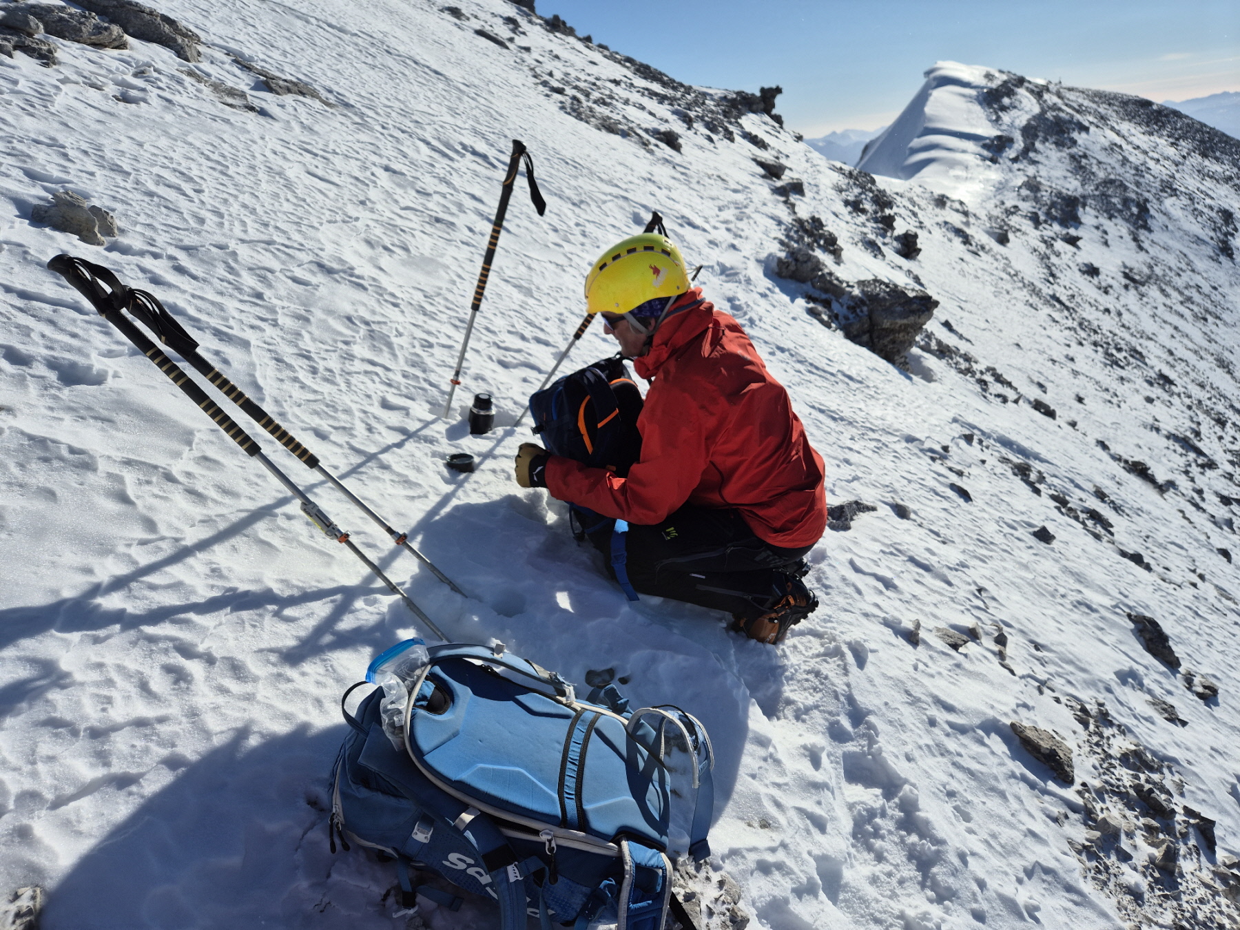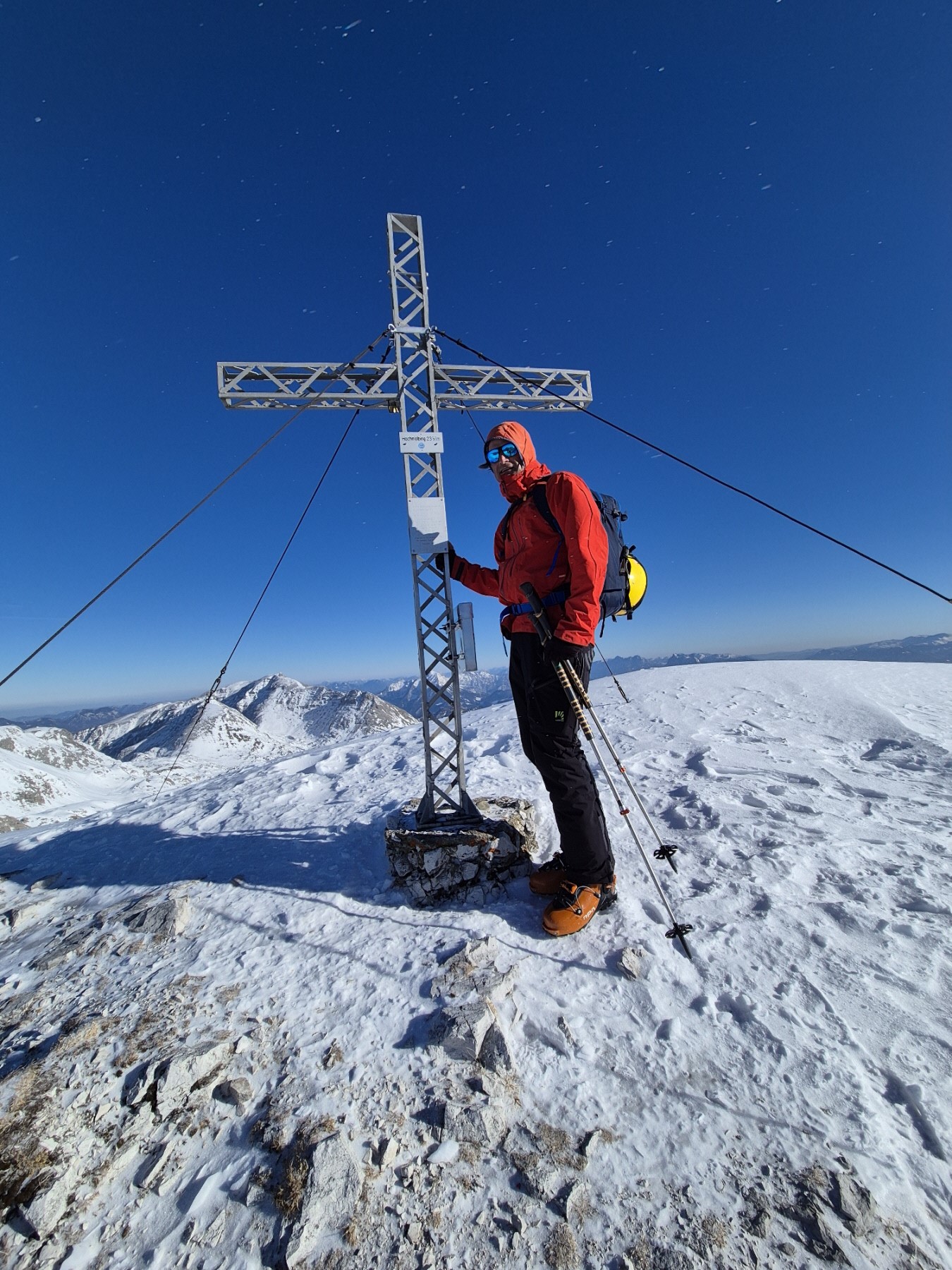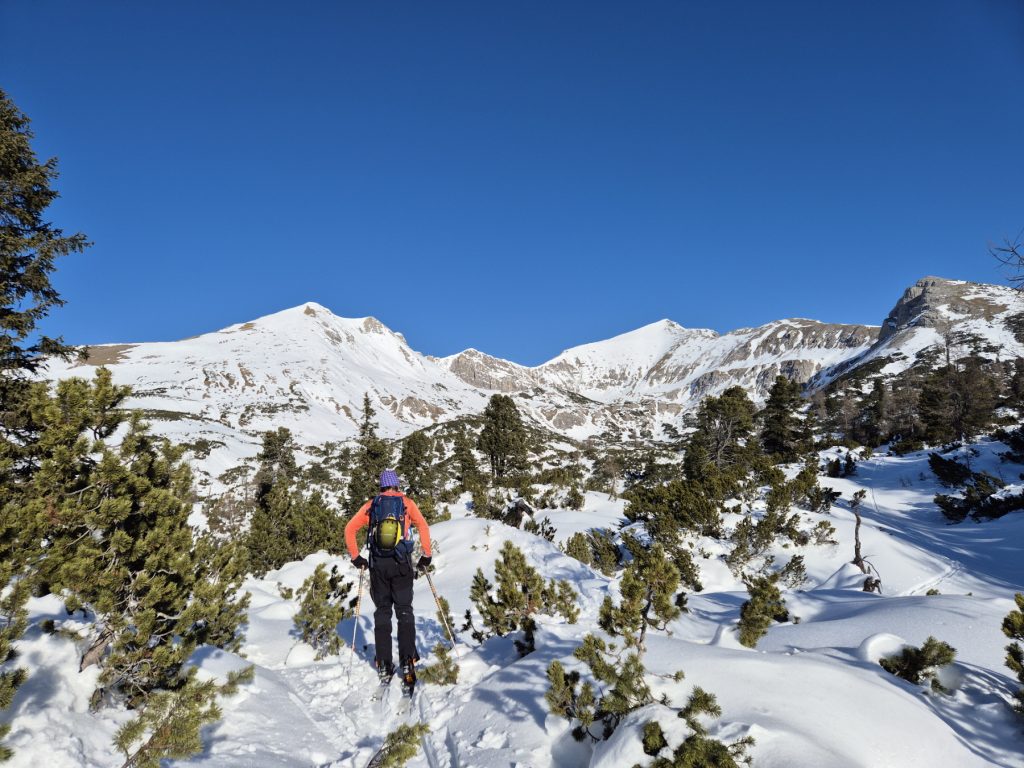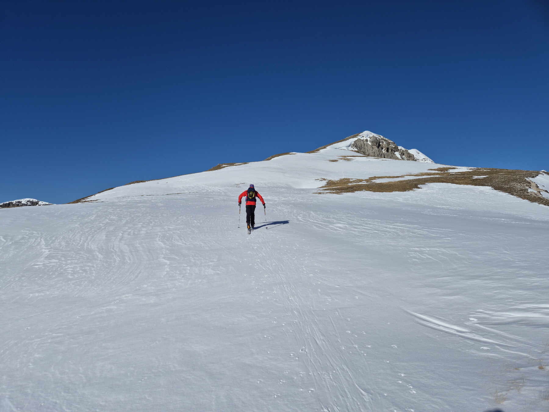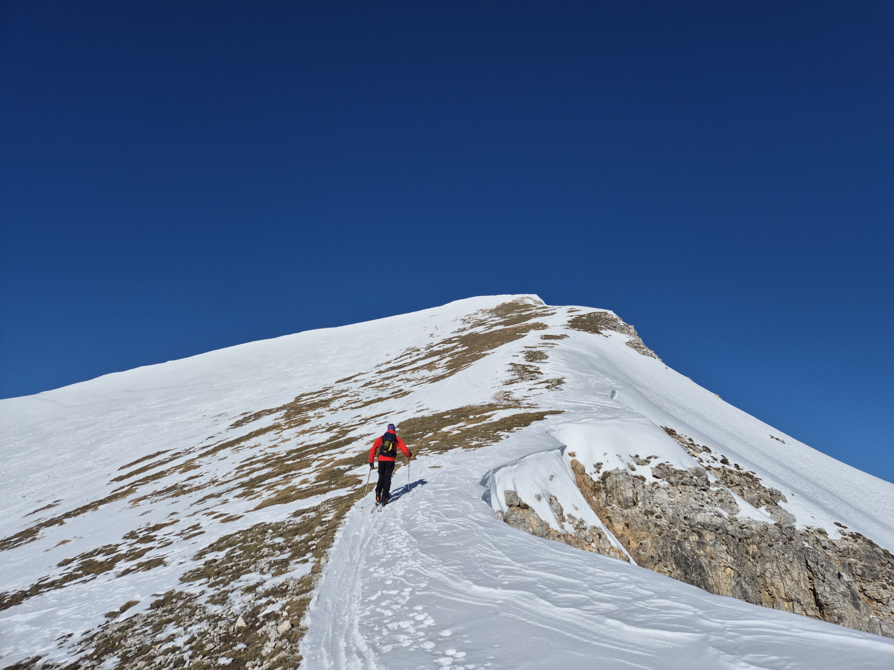 Die letzten Kehren in der Steilflanke unter dem Mittermölbing, dem Gampenkaster, haben uns gezeigt, dass das erhoffte Auffirnen auch hier durch den kalten Wind vereitelt wurde. Im abgeblasenen Steilgelände neben der Flanke haben wir auf den letzten Metern den Anstieg mit aufgepackten Skiern beendet. Neben dem keinen Gipfelkreuz haben wir die Skier deponiert.