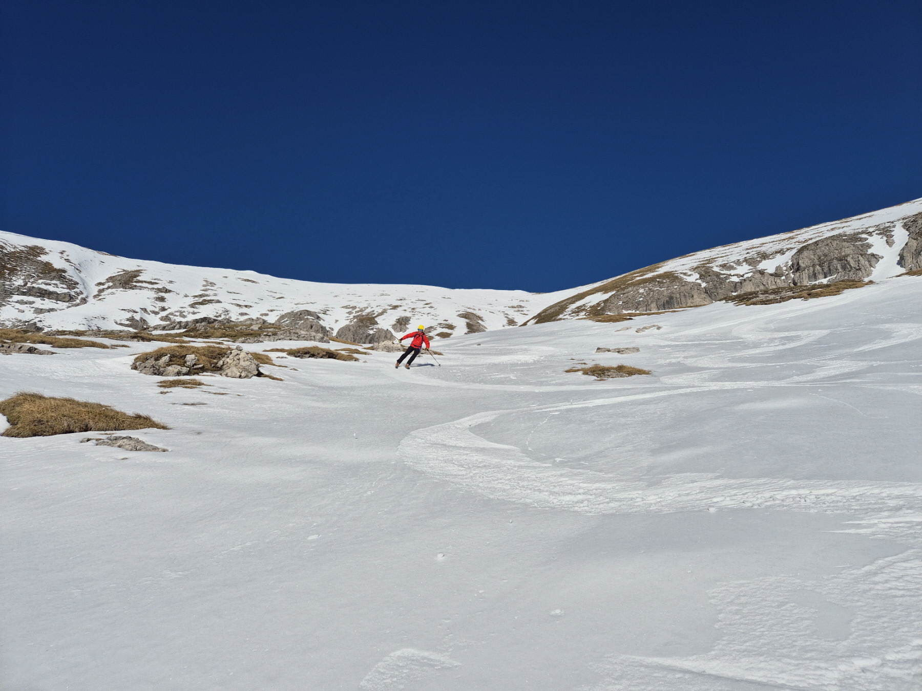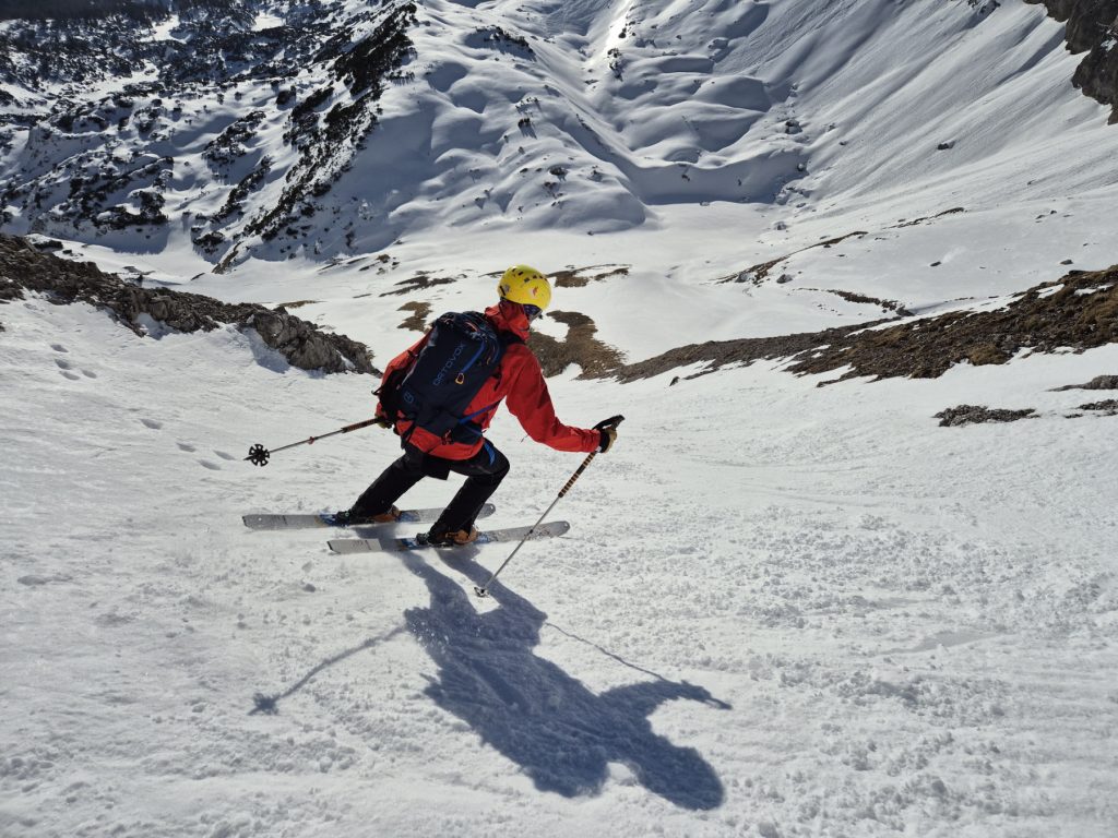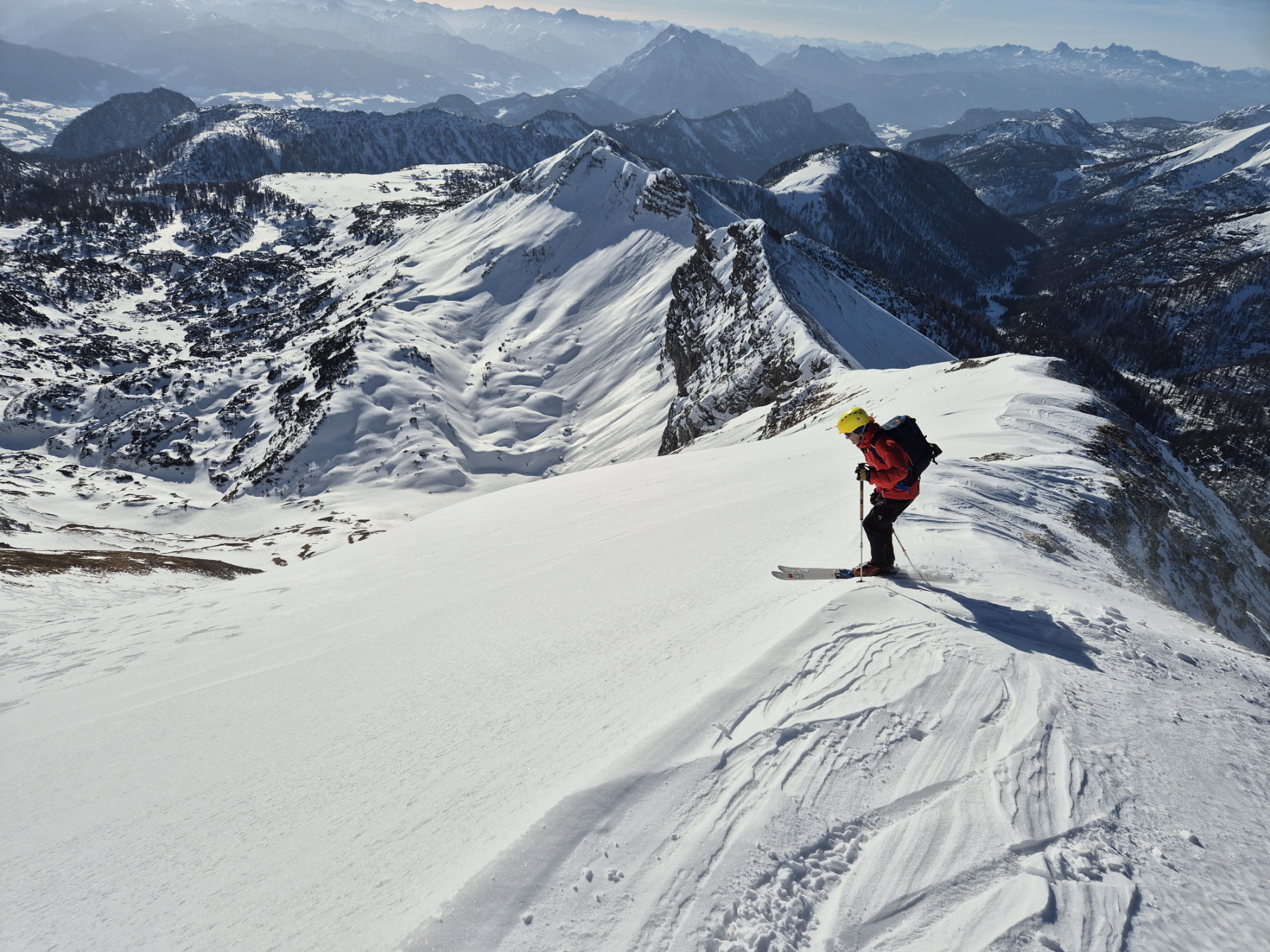 Wie auf Eiern sind wir daher in die Flanke eingefahren. Mit Abnahme der Höhe ist der Schnee, wenn schon nicht weicher, so zumindest etwas griffiger geworden. In der enger werdenden Rinne war er wieder pickelhart, an deren Rand noch etwas besser fahrbar. Erst im Auslauf der Rinne und auf den etwas weiteren Flächen daneben und darunter war dann von (Bruch)harsch bis zu (meist verblasenem) Pulver alles dabei.