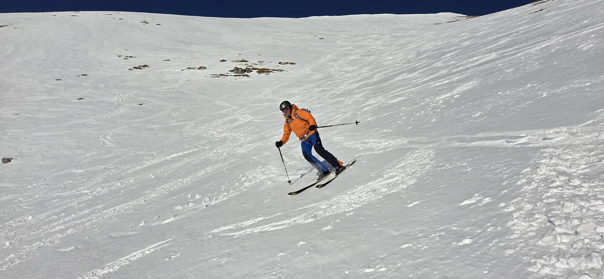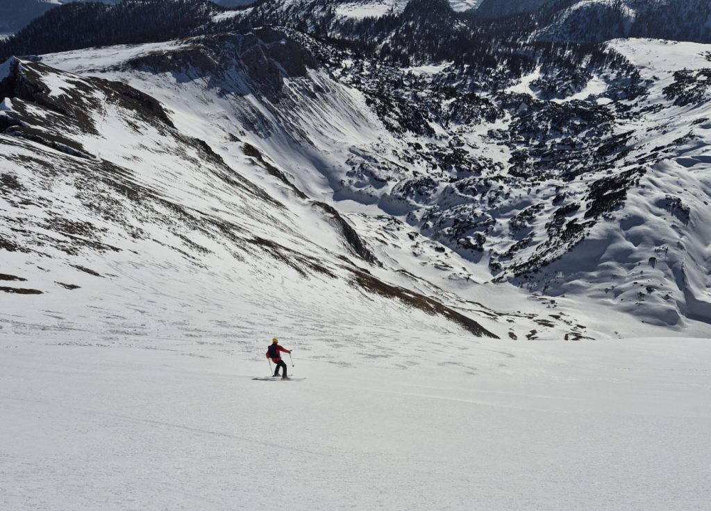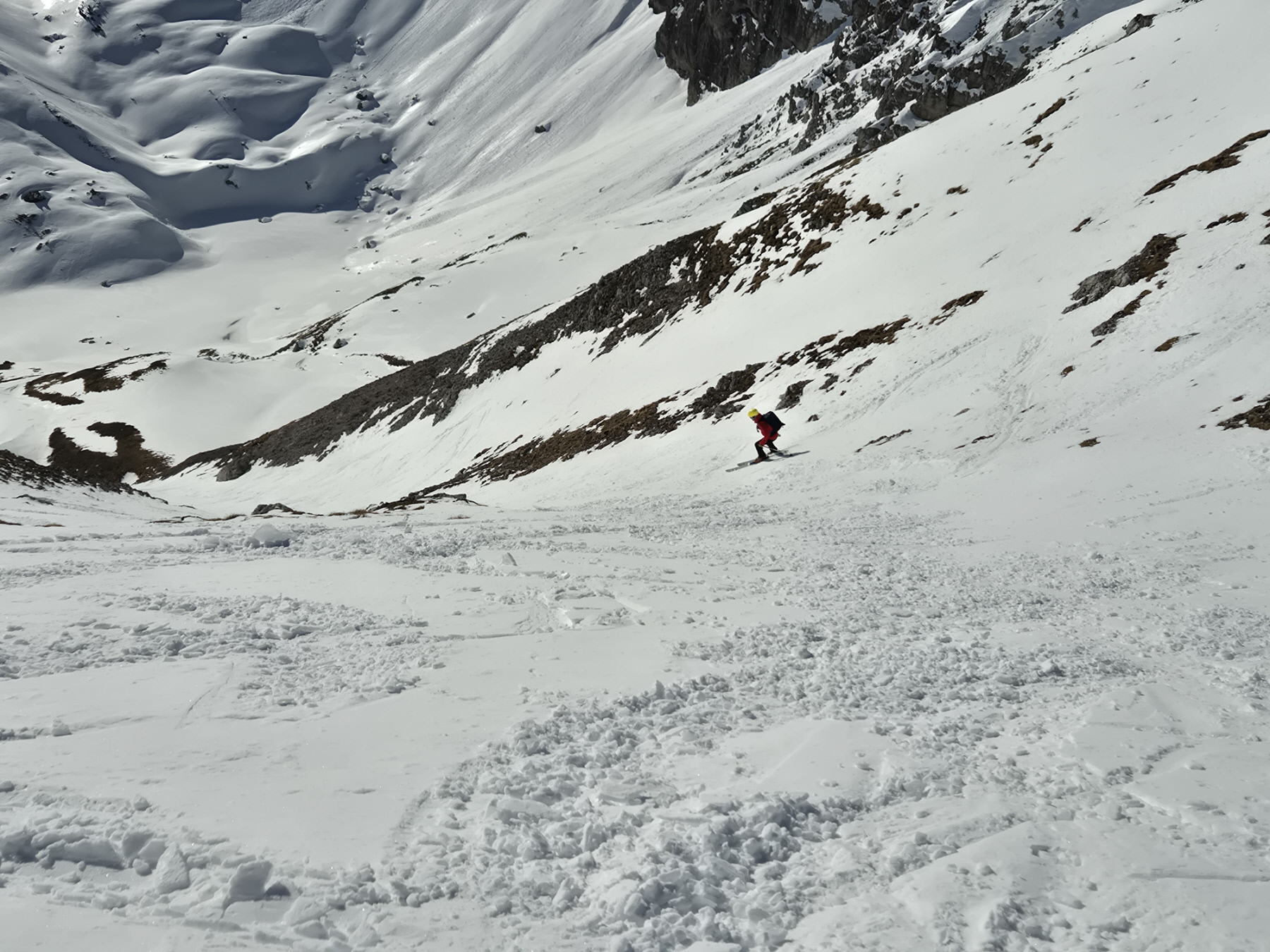 Wie auf Eiern sind wir daher in die Flanke eingefahren. Mit Abnahme der Höhe ist der Schnee, wenn schon nicht weicher, so zumindest etwas griffiger geworden. In der enger werdenden Rinne war er wieder pickelhart, an deren Rand noch etwas besser fahrbar. Erst im Auslauf der Rinne und auf den etwas weiteren Flächen daneben und darunter war dann von (Bruch)harsch bis zu (meist verblasenem) Pulver alles dabei.