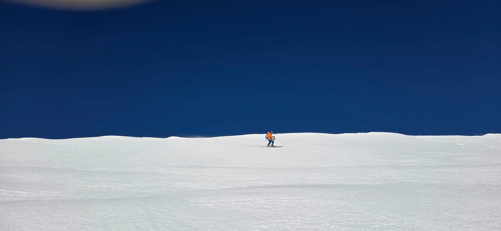 Anschließend sind wir zum Skidepot am Mittermölbing zurück und haben beim Umrüsten für die Abfahrt peinlichst darauf geachtet, keinen Ausrüstungsgegenstand dem Wind zu opfern. Als dies gelungen war, haben wir die Abfahrt begonnen. Was als erhoffter Firntraum geplant war, wurde anfangs zu einem Zirkeln auf dem pickelharten Harschdeckel – und das mit dem „Geröllski“, dessen Stahlkanten diese Bezeichnung sicher nicht mehr verdienen, sondern eher als Rundungen zum Zwecke des beidseitigen Abschlusses der Lauffläche bezeichnet werden können.